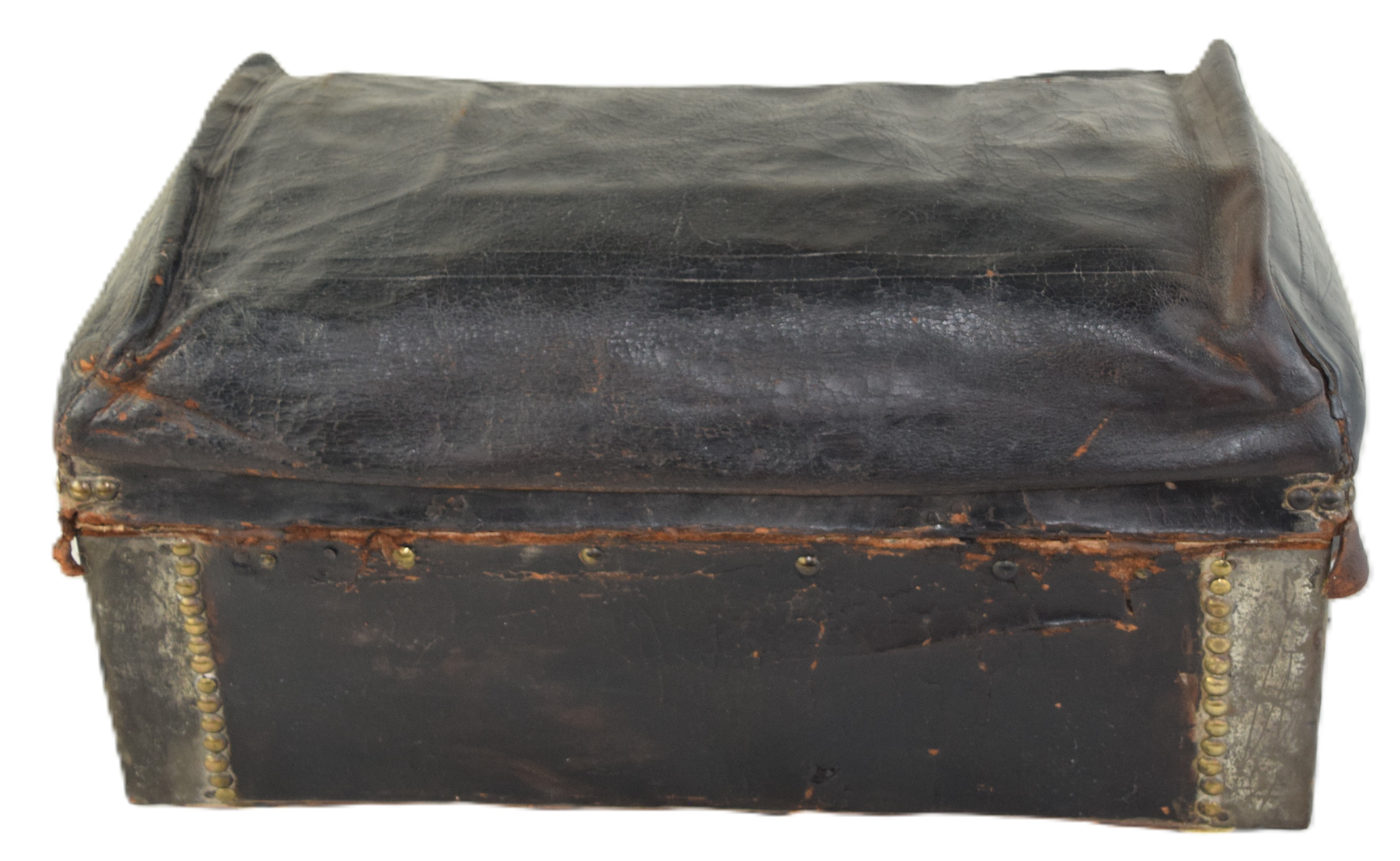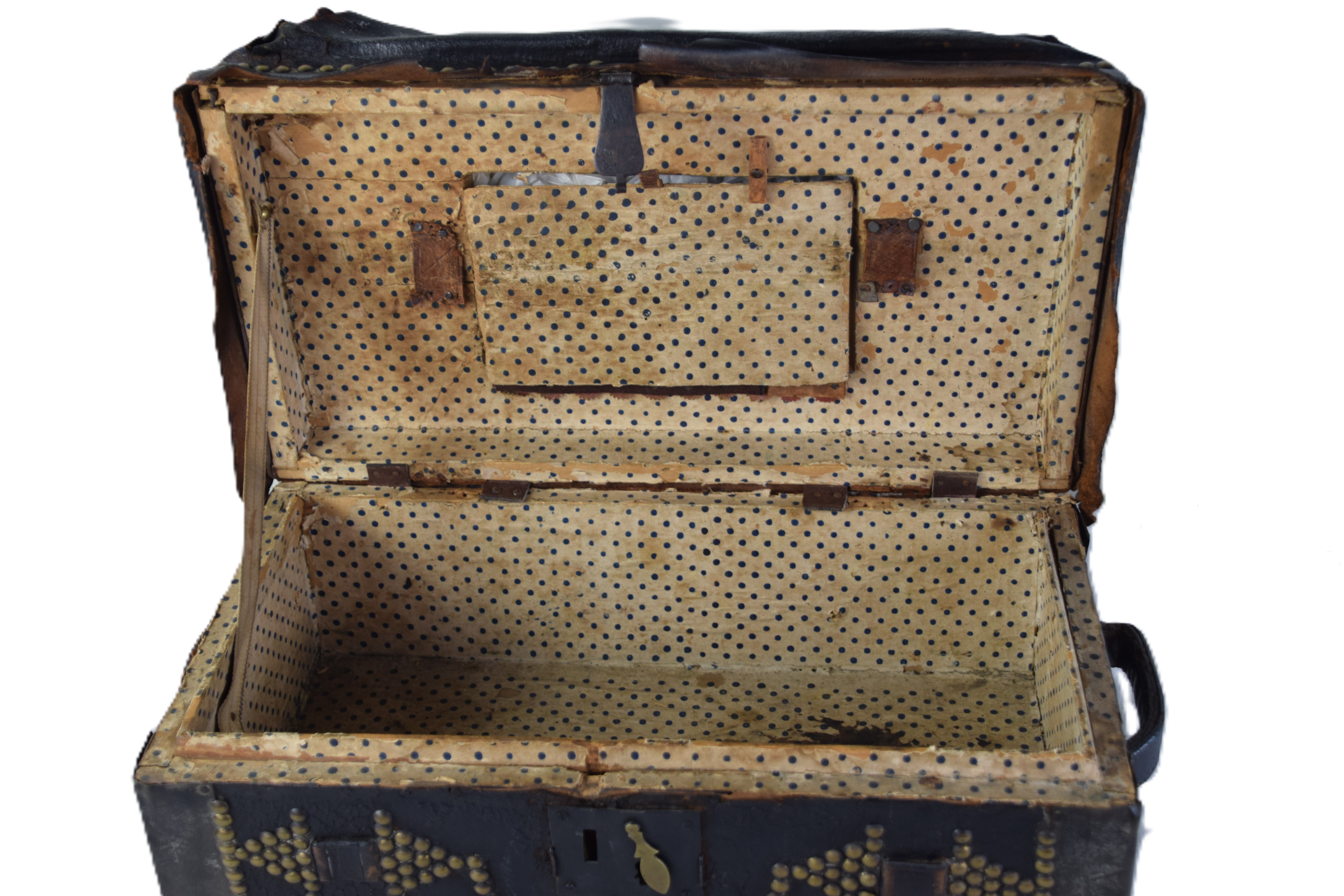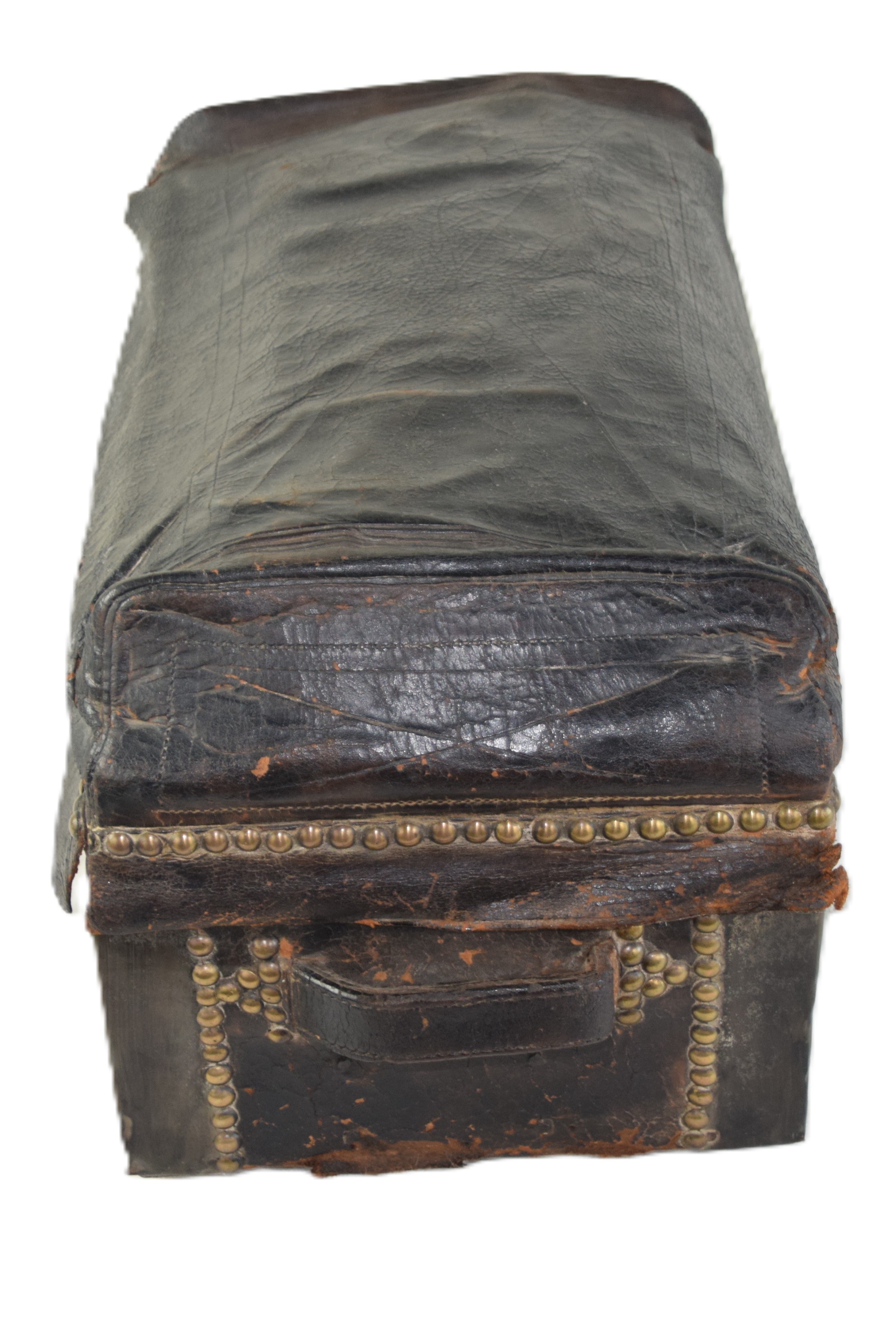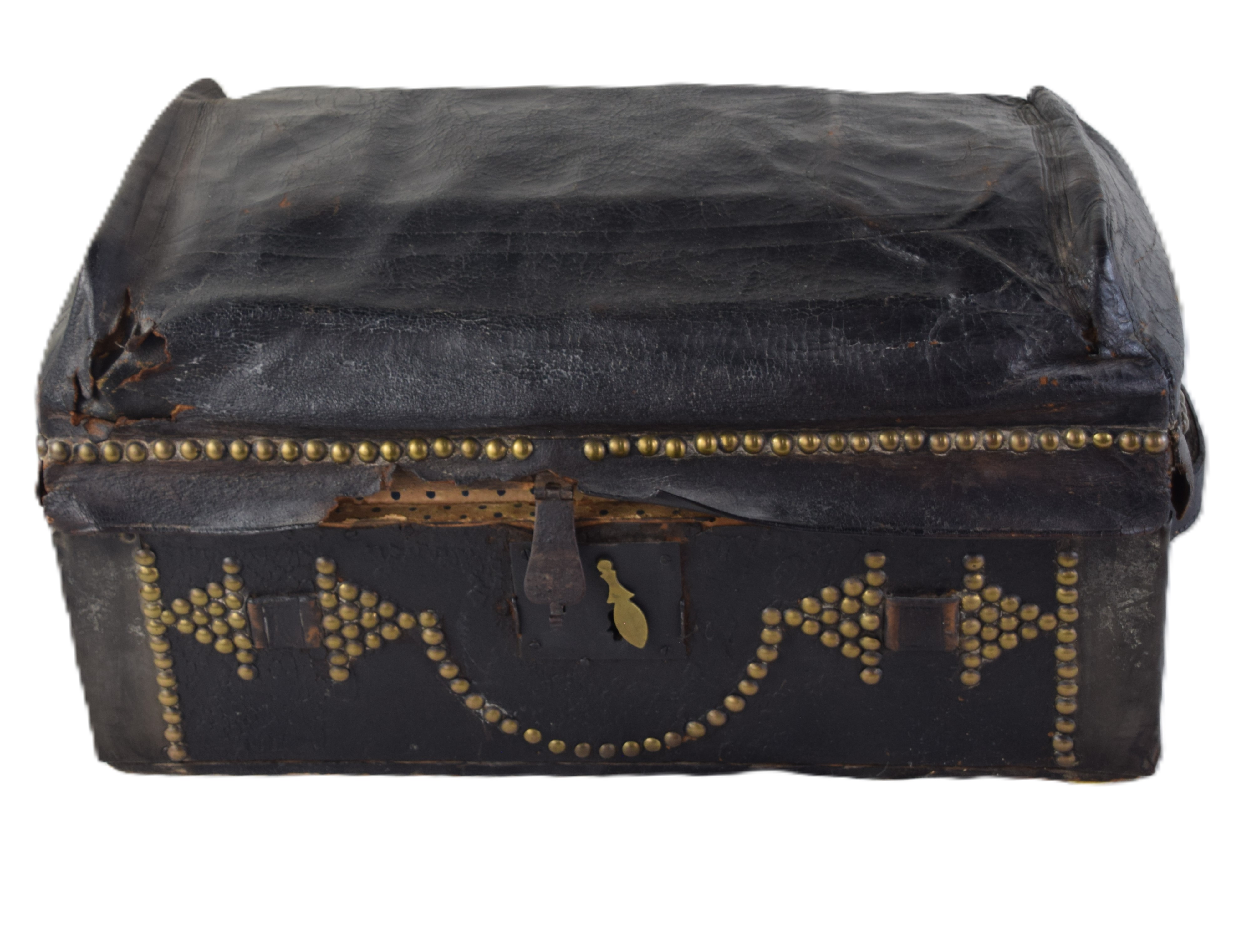 Child’s size stagecoach trunk in leather, brass studded with original iron lock with side handles. Dimensions: 10″ H x 18″L x 10″ D