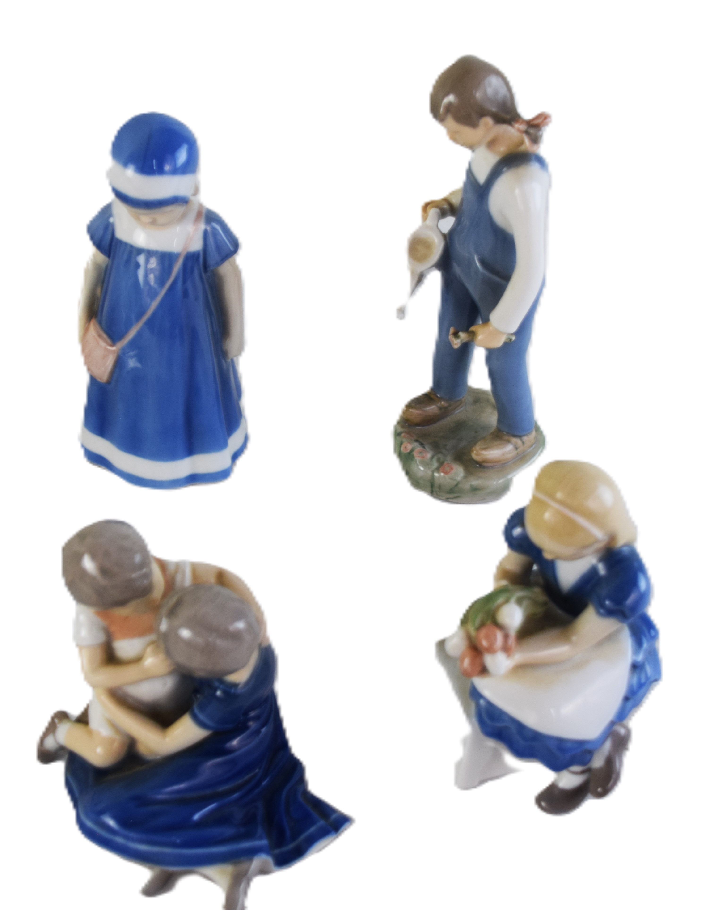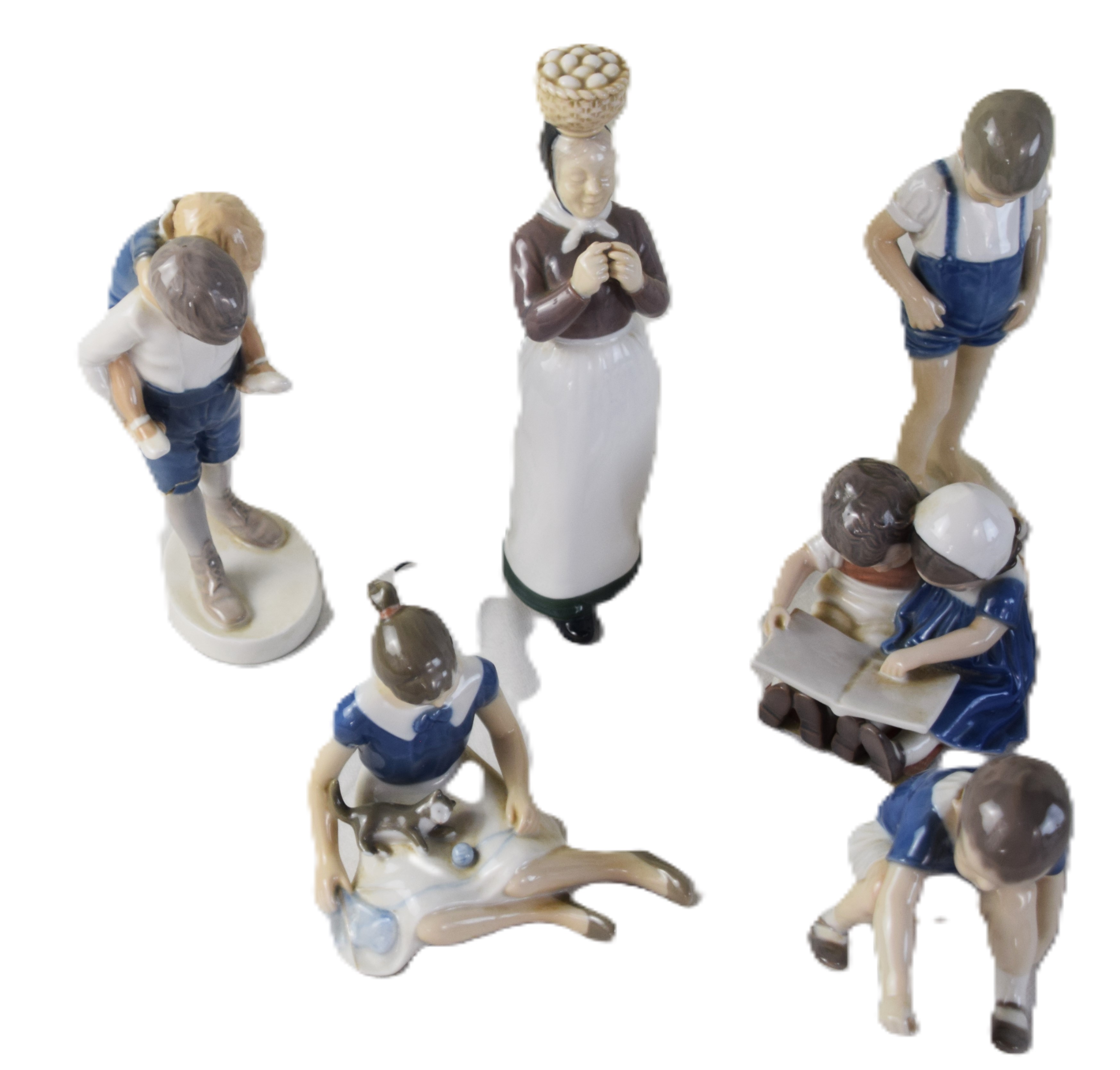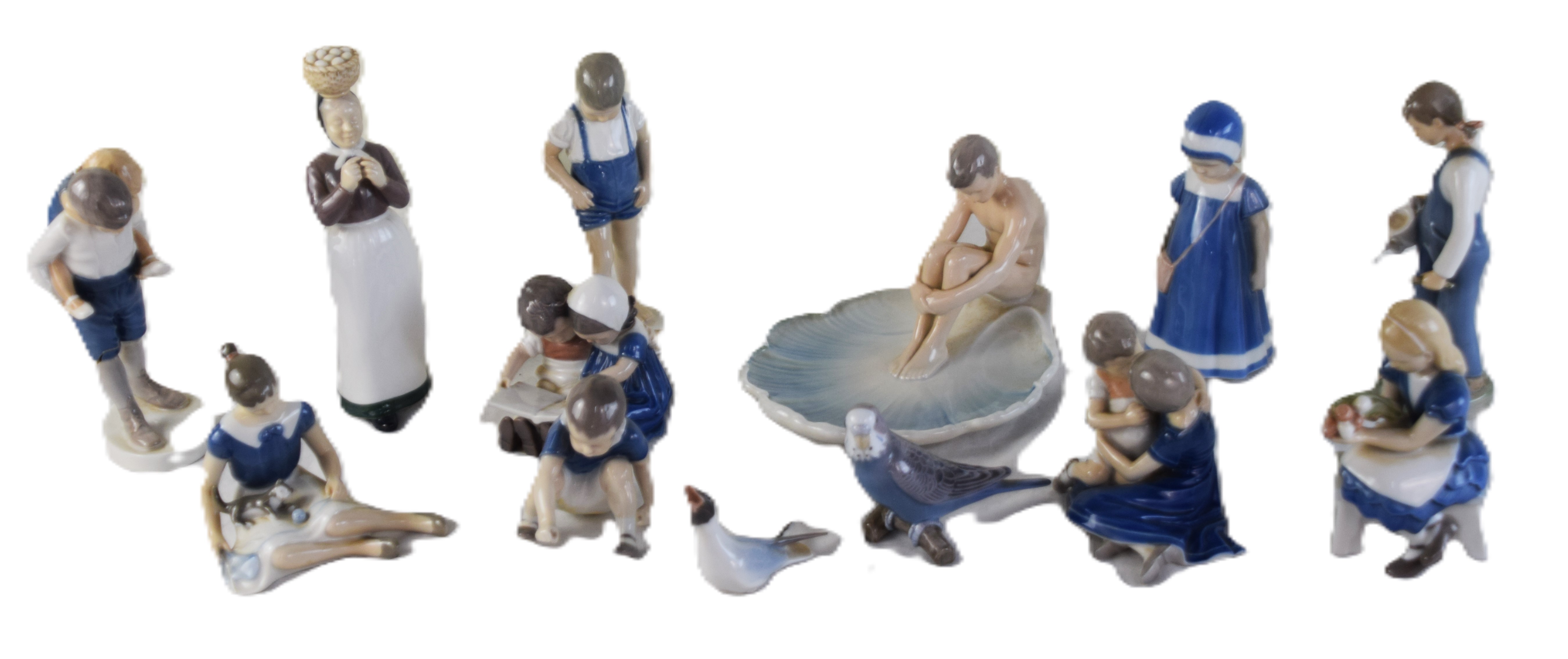 13 Piece Bing And Grondahl Figurines to include young boy seated on a lily pad (7″ H), young boy and girl reading (4″ H), young girl with cat in a seated position (5.5″ H), woman with a basket in hand (9″ H), young girl with a watering can (8″ H), young boy carrying a piglet (8.5″ H with age crack), young girl holding flowers 96.5′ H0, young girl and boy embracing (5″ H), Young boy standing with hands on hips (8″ H), 2 birds (4″ and 6″ L), Young boy in seated position (4″ H)