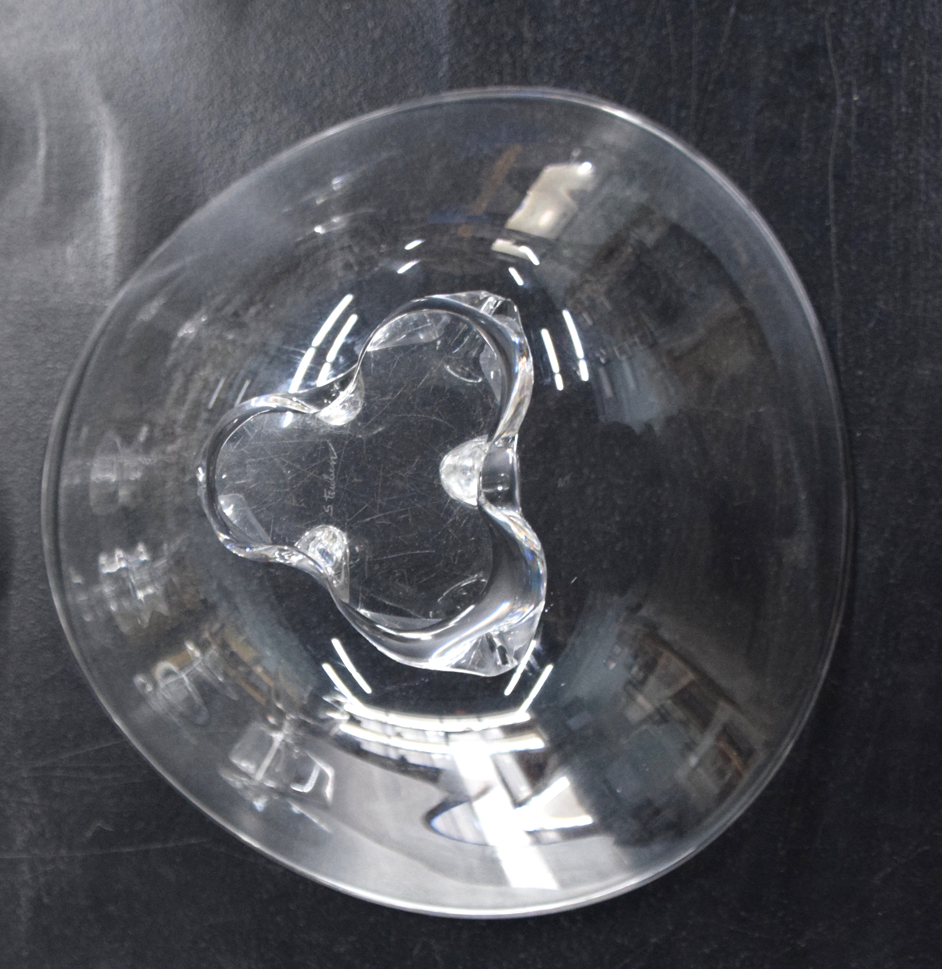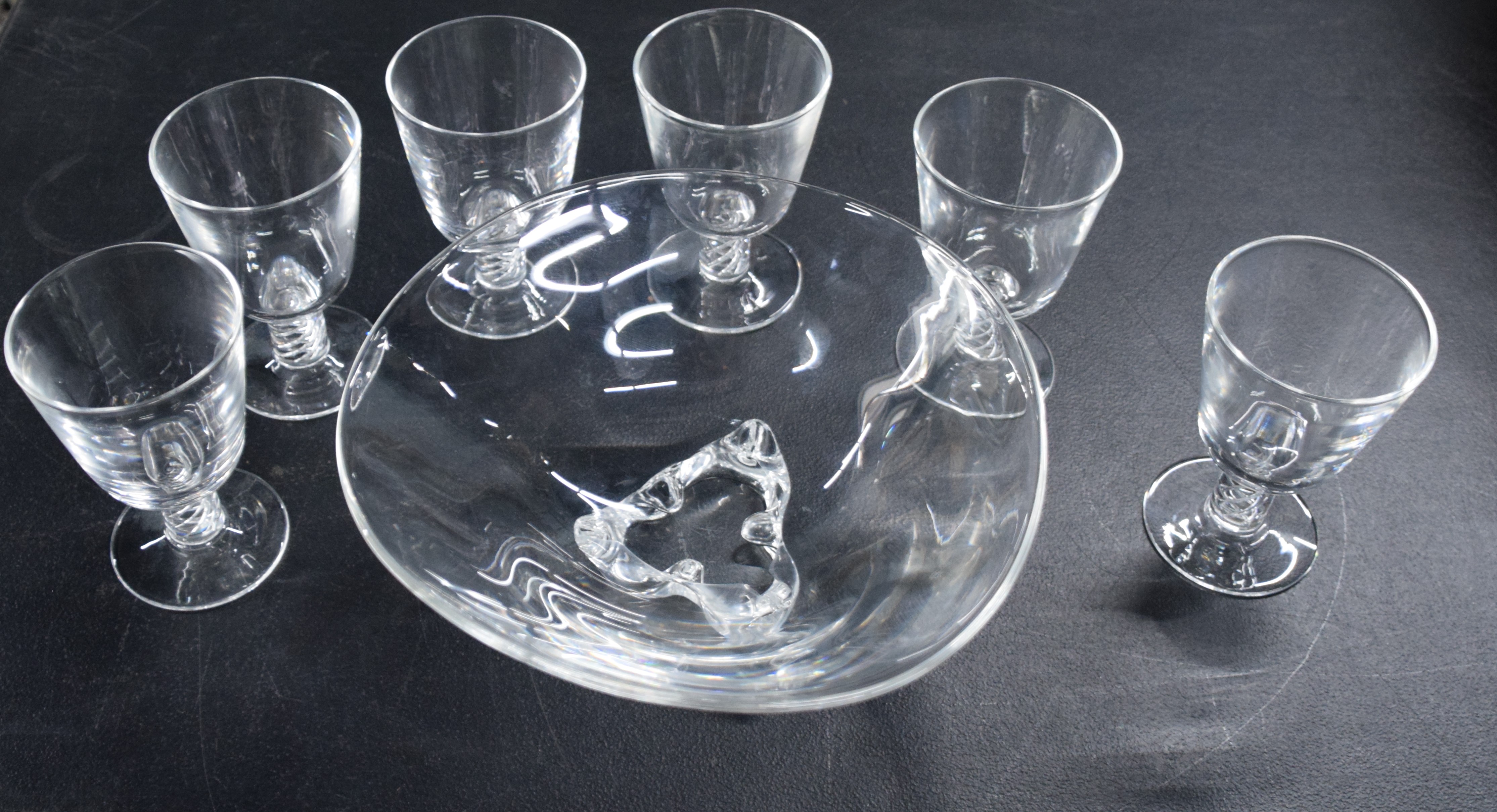 Stueben collection of a footed bowl (10″ Diameter) and six stem glasses (5 1’4″ H)