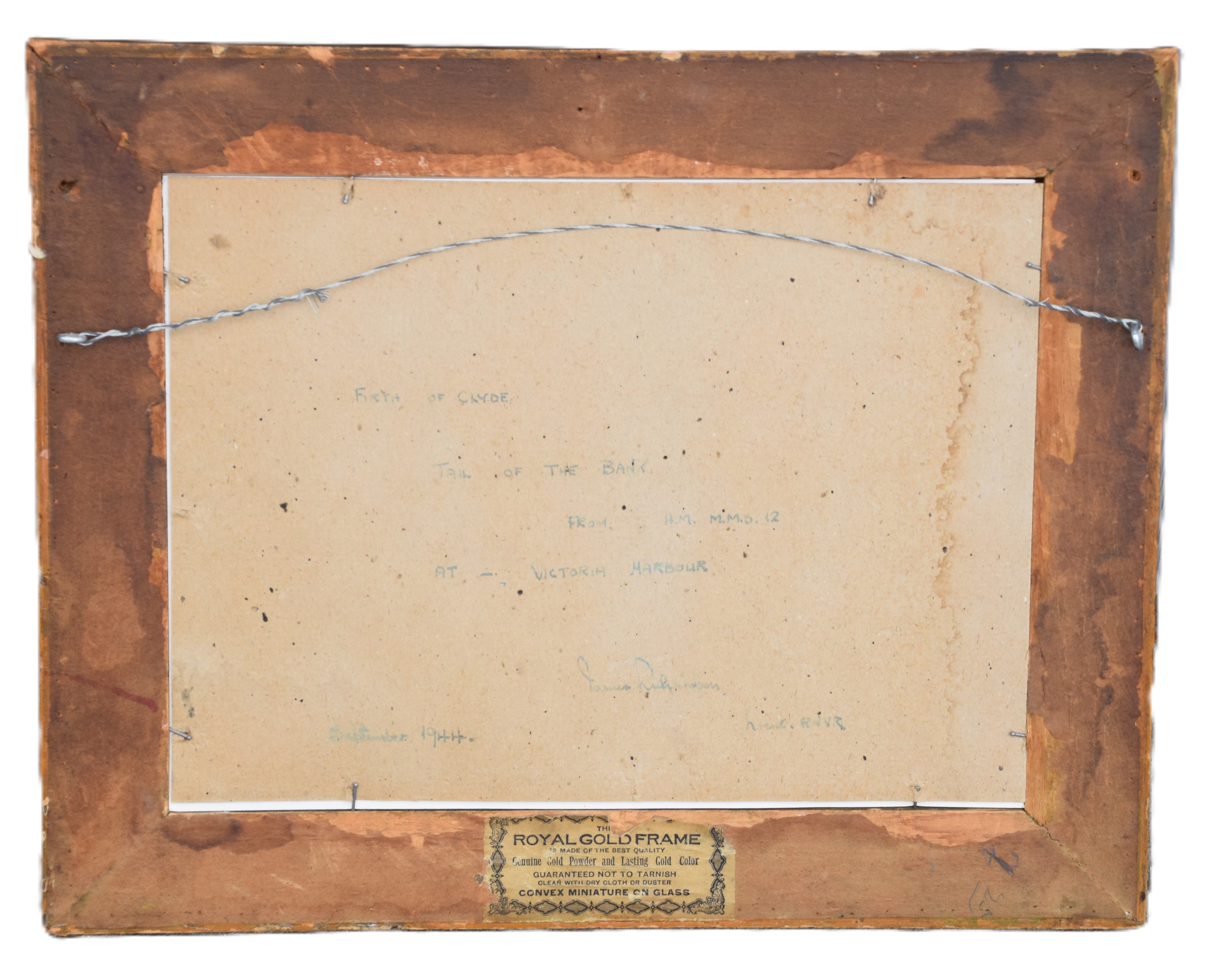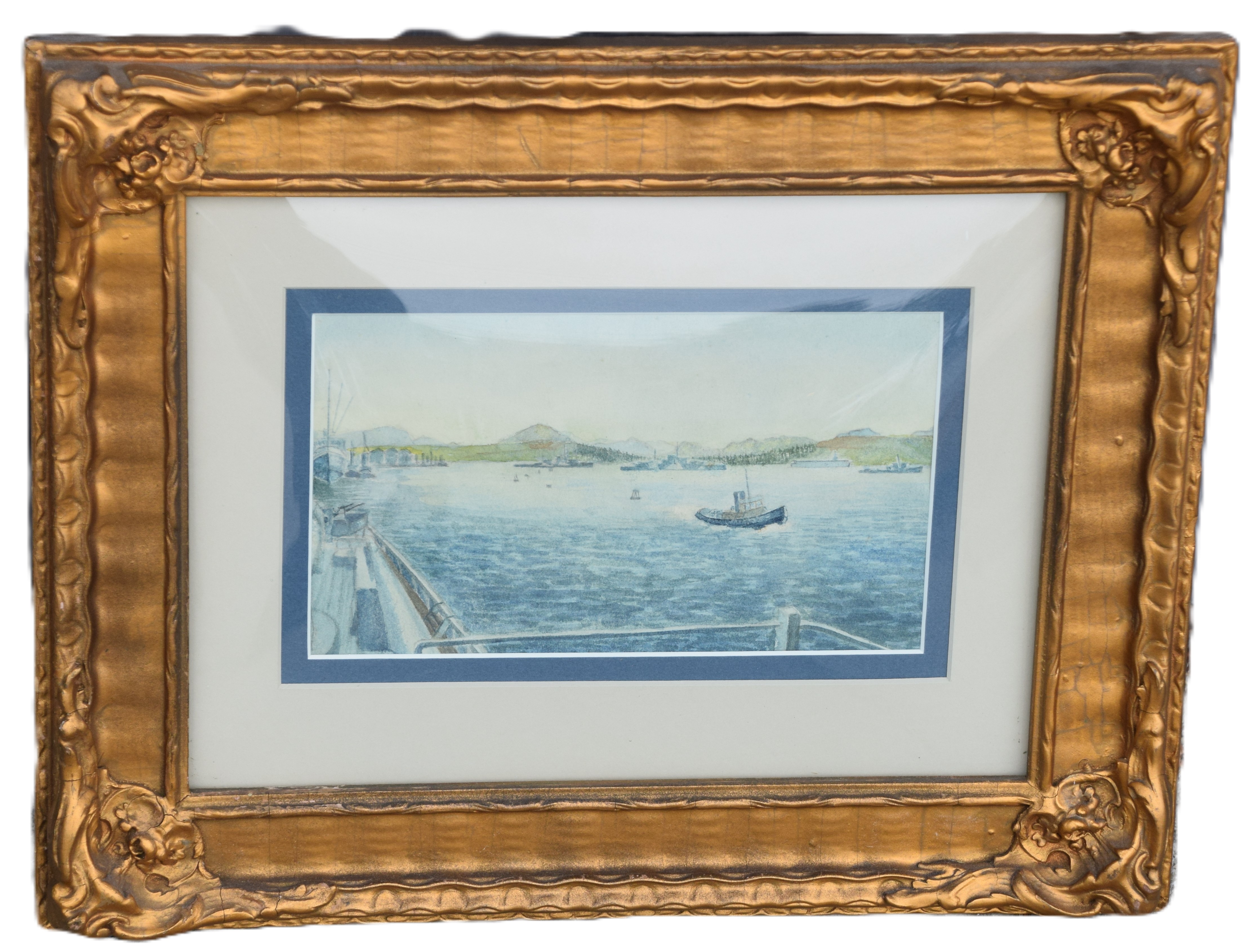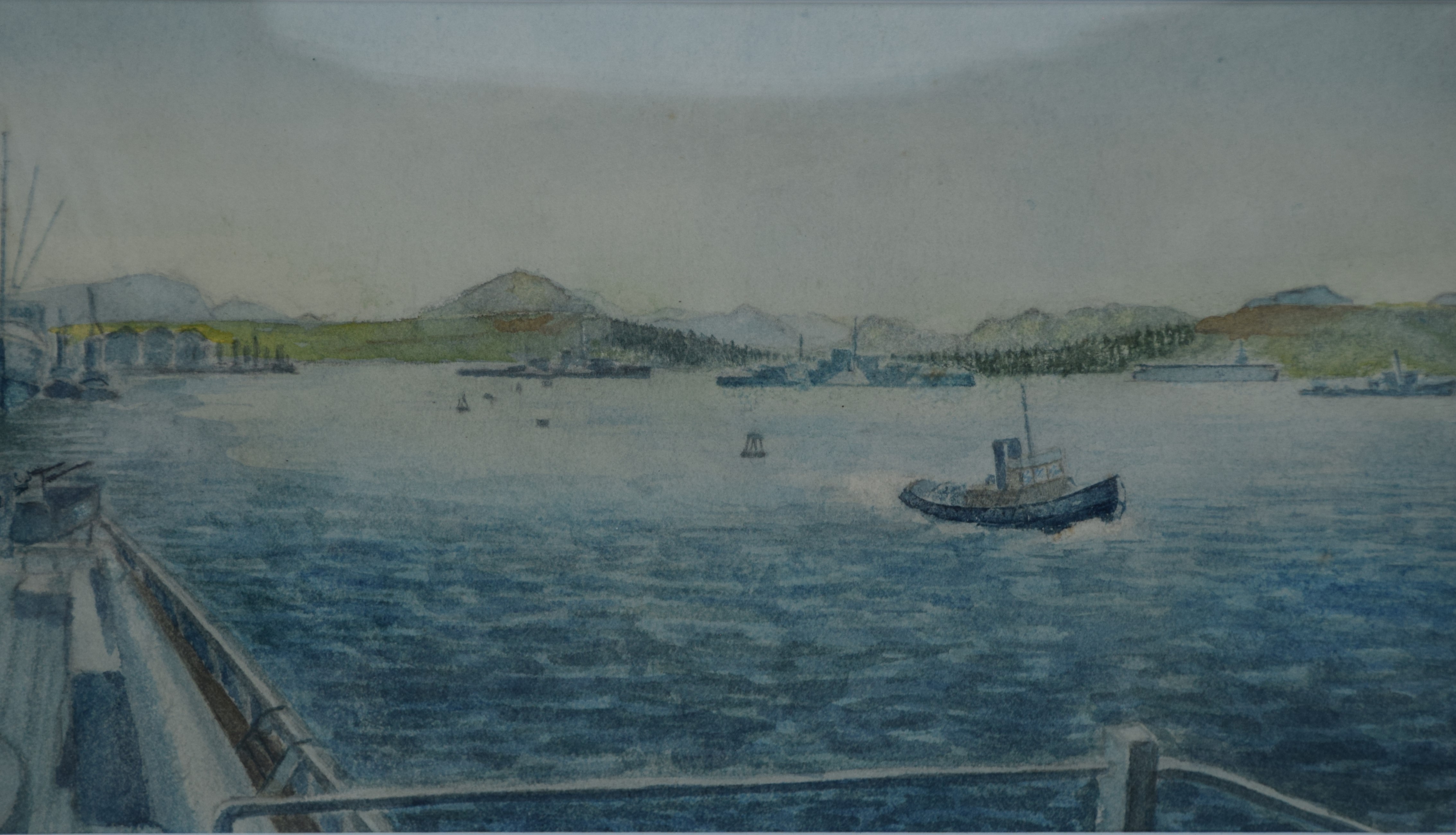 Framed watercolor of the Firth of Clyde, tail of the bank with warships in the background, drawn from the a ship in Victoria Harbor by a James Richardson in September 1944. Provenance on back. Dimensions: 5″ x8.5″ Image size