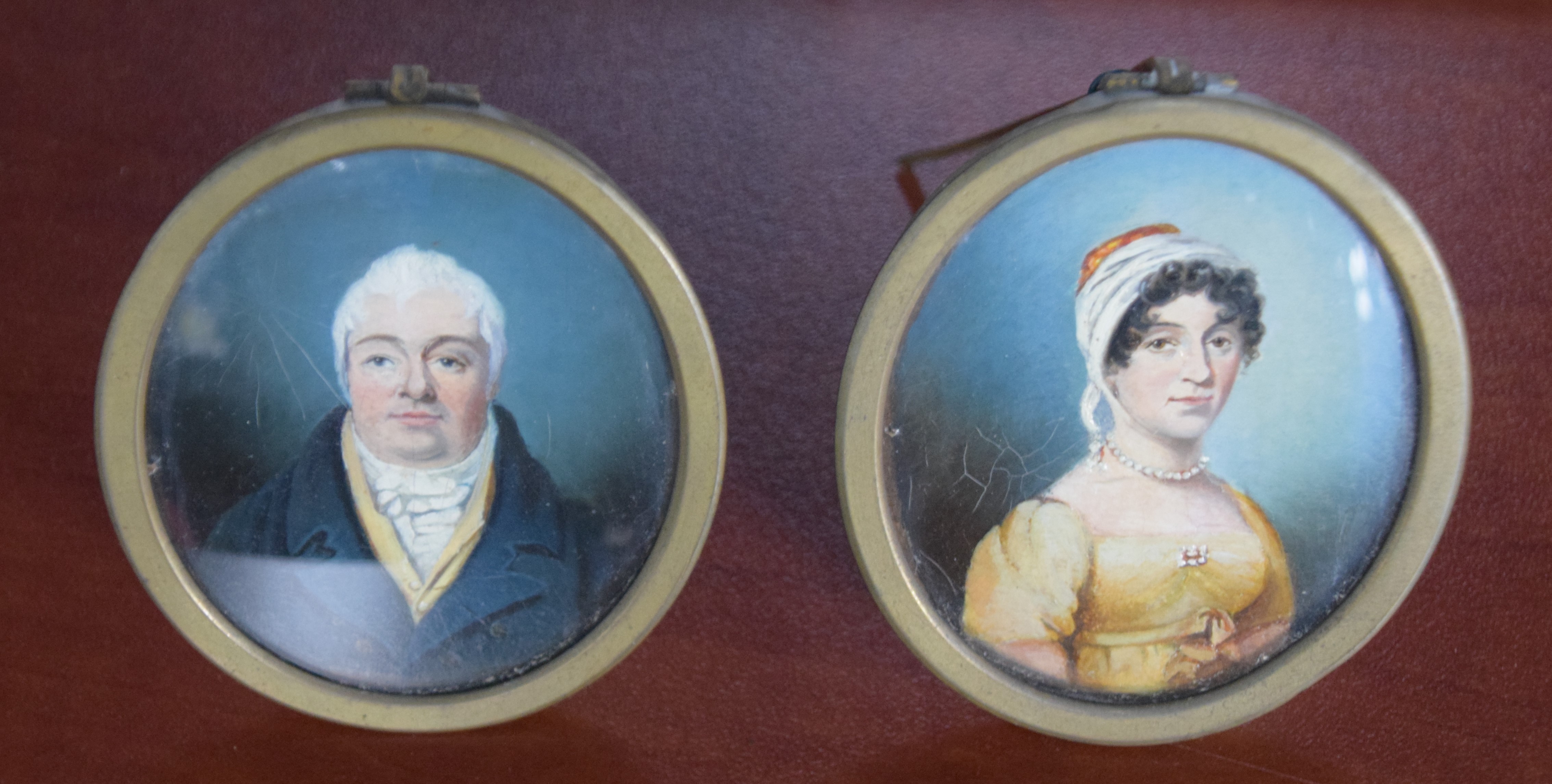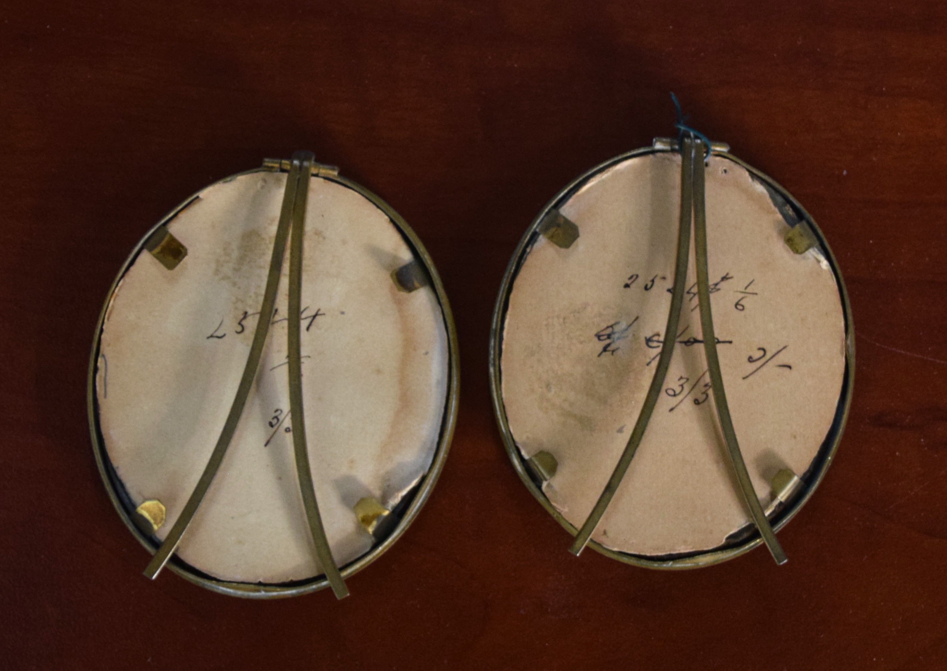 Two miniature portraits of a man and his wife in brass oval frames with stands, Dimensions: 3″ L