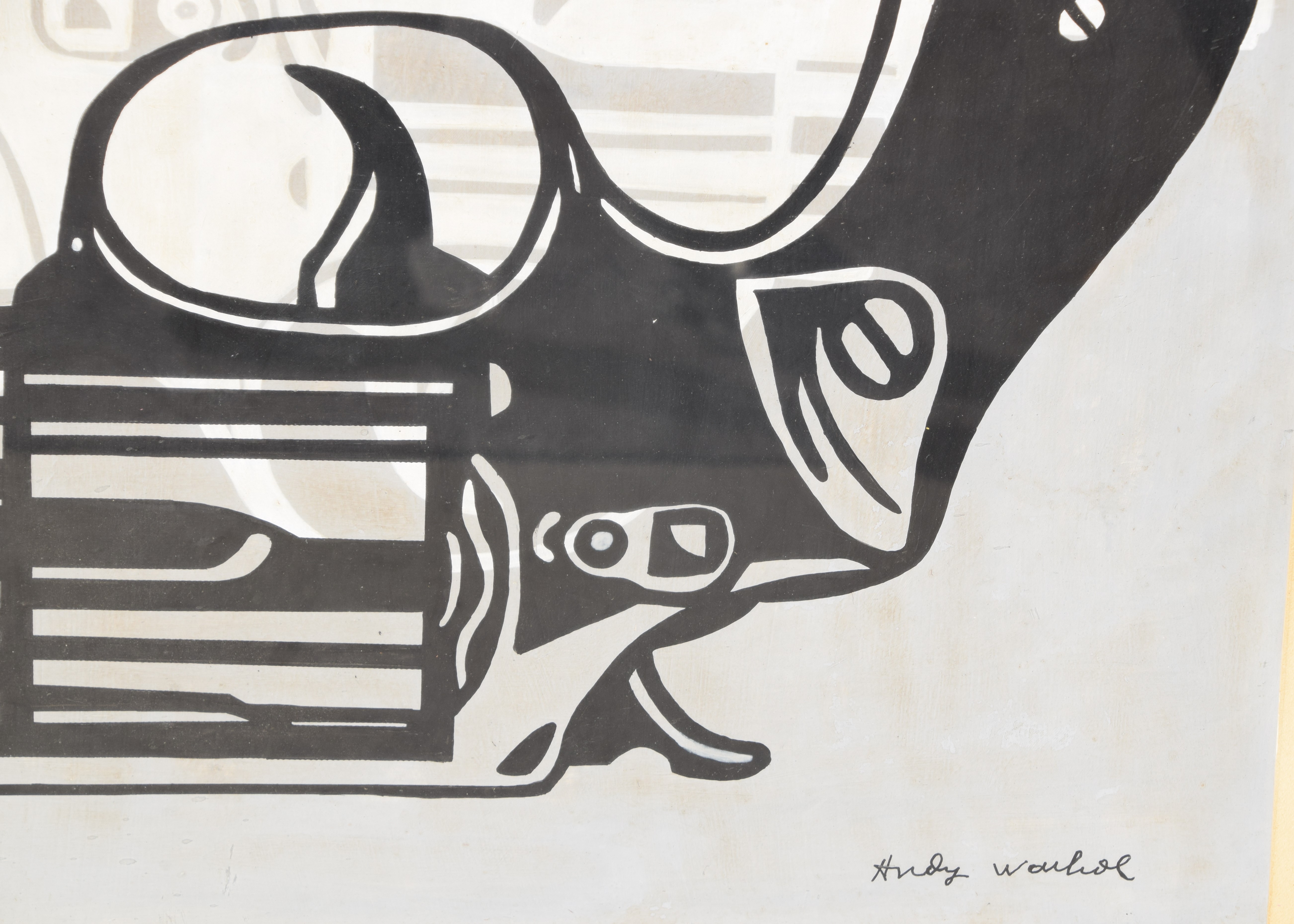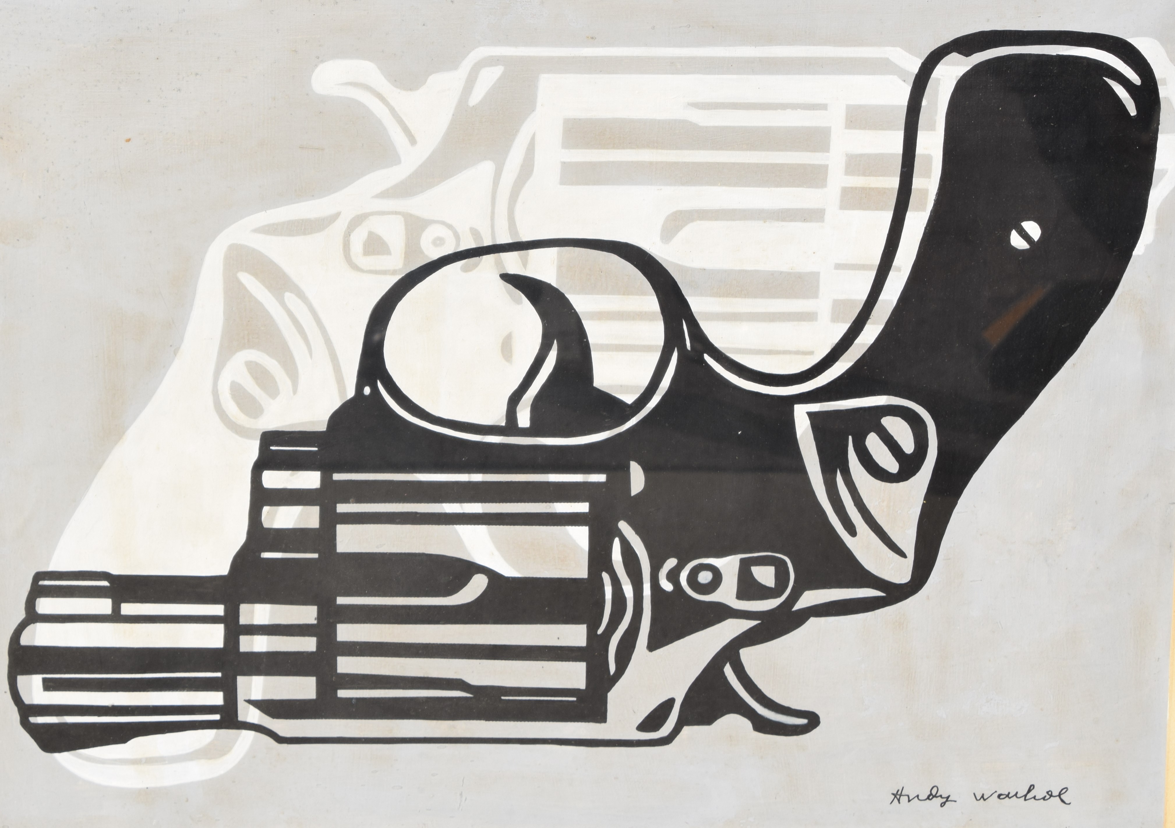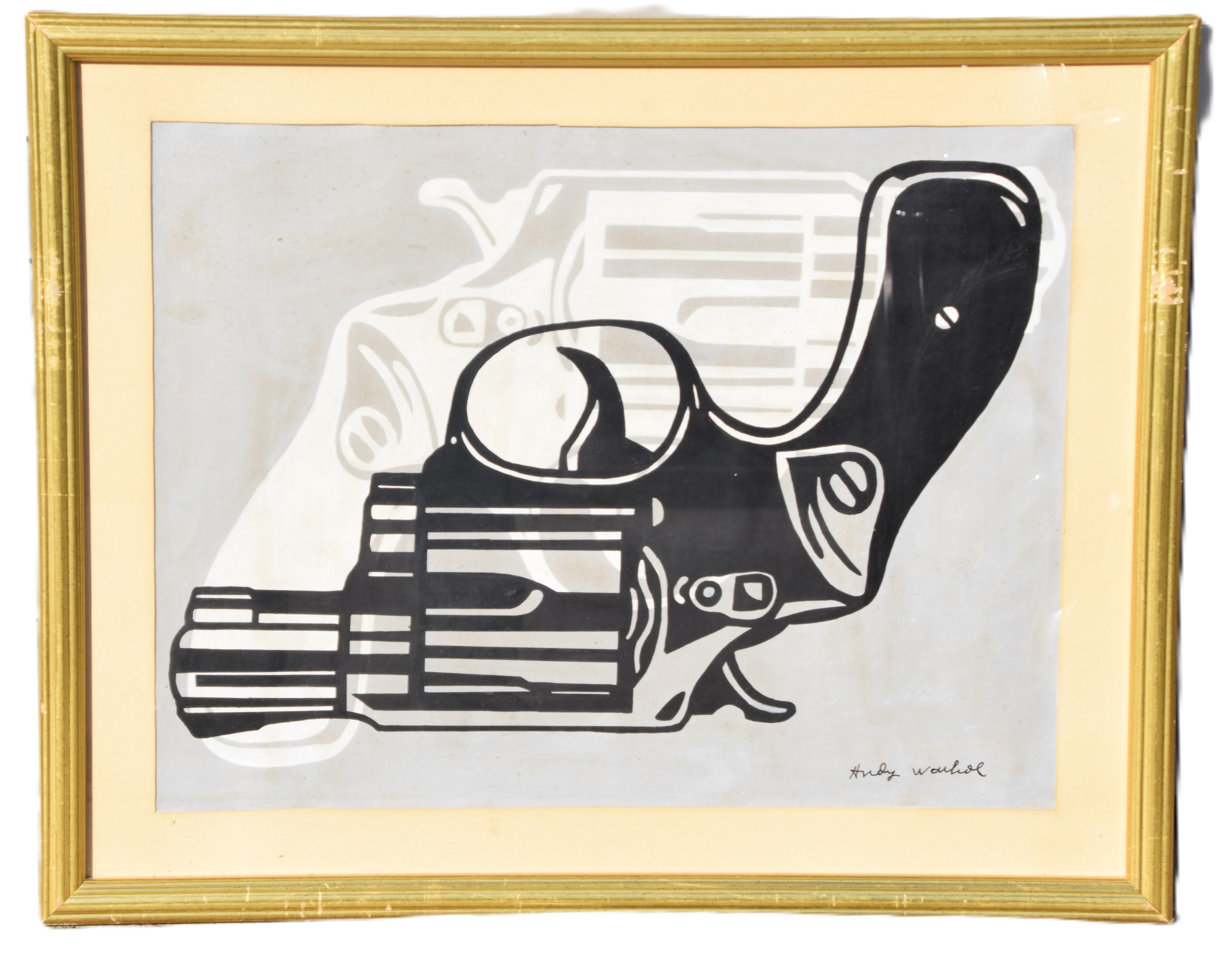 Screenprint of double revolvers-one white, one black. Andy Warhol (1928 – 1987) worked in New York and Pennsylvania, whose name is synonymous with Pop Art. No COA on file. Dimensions: 18″ 24″