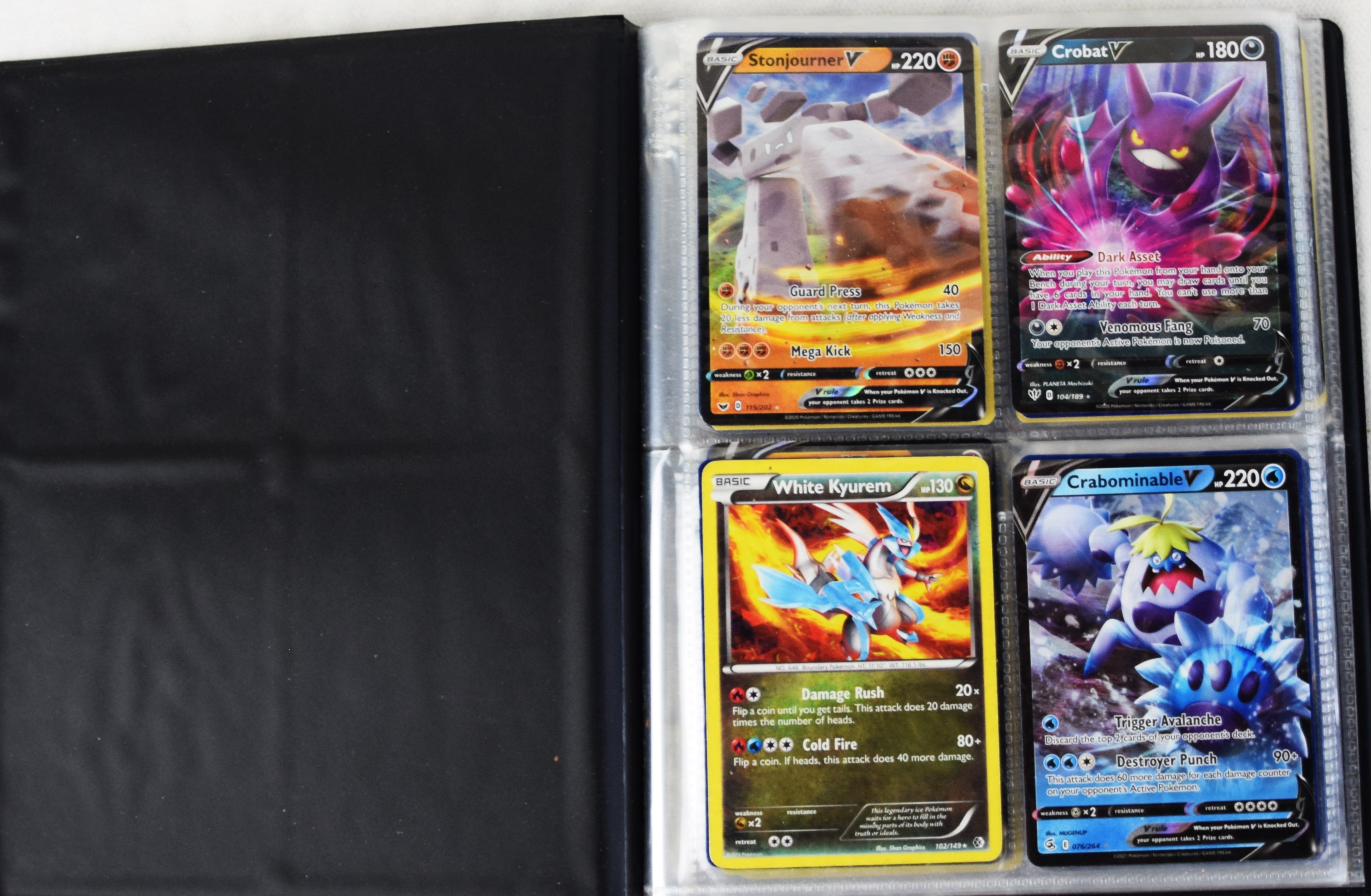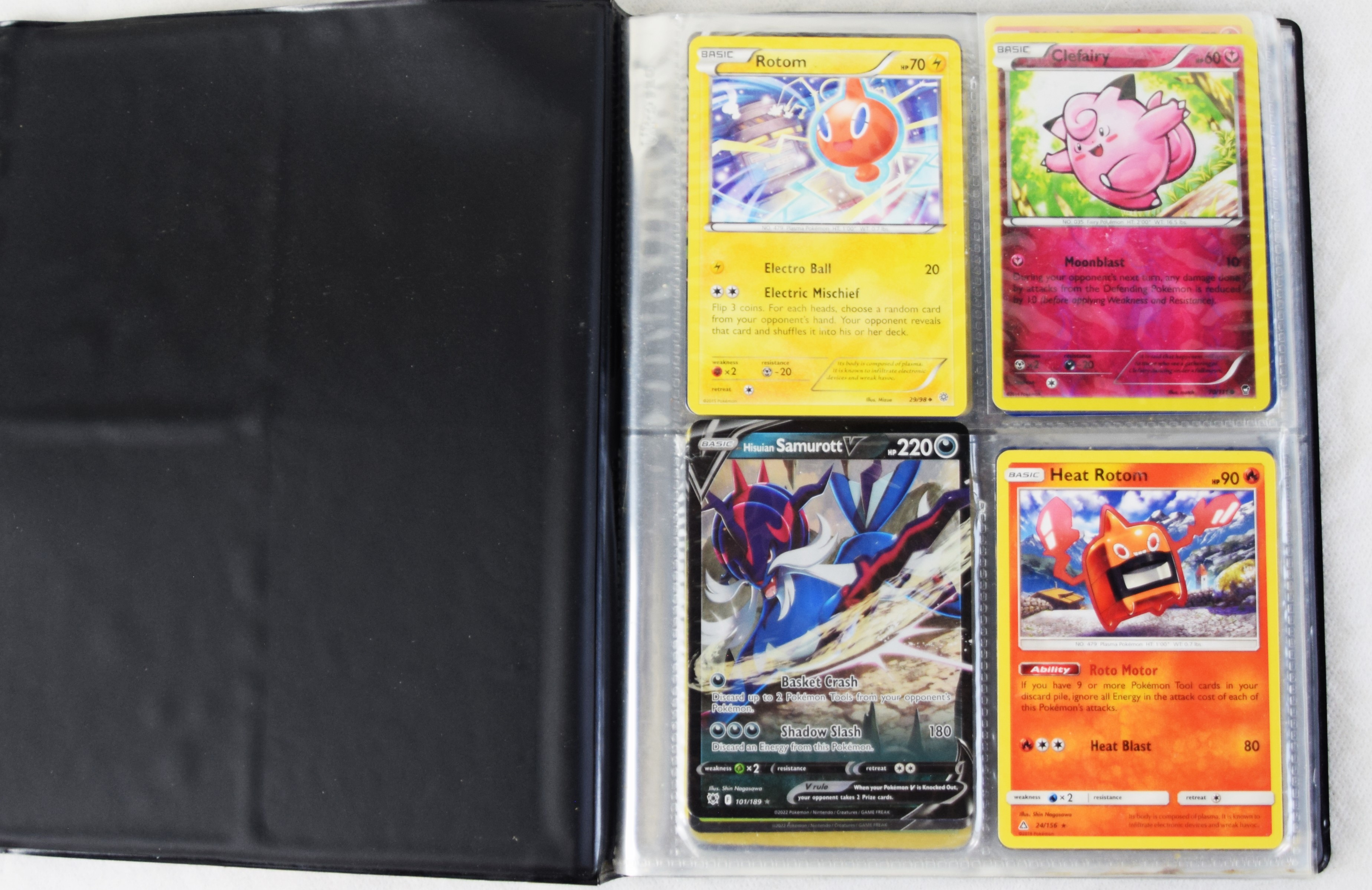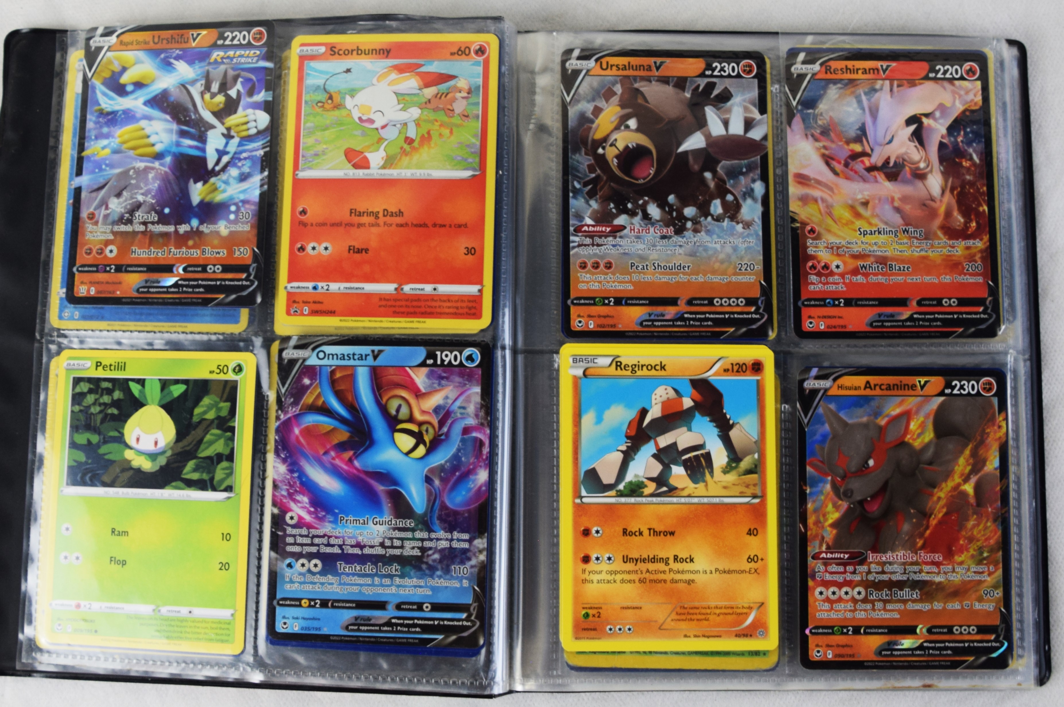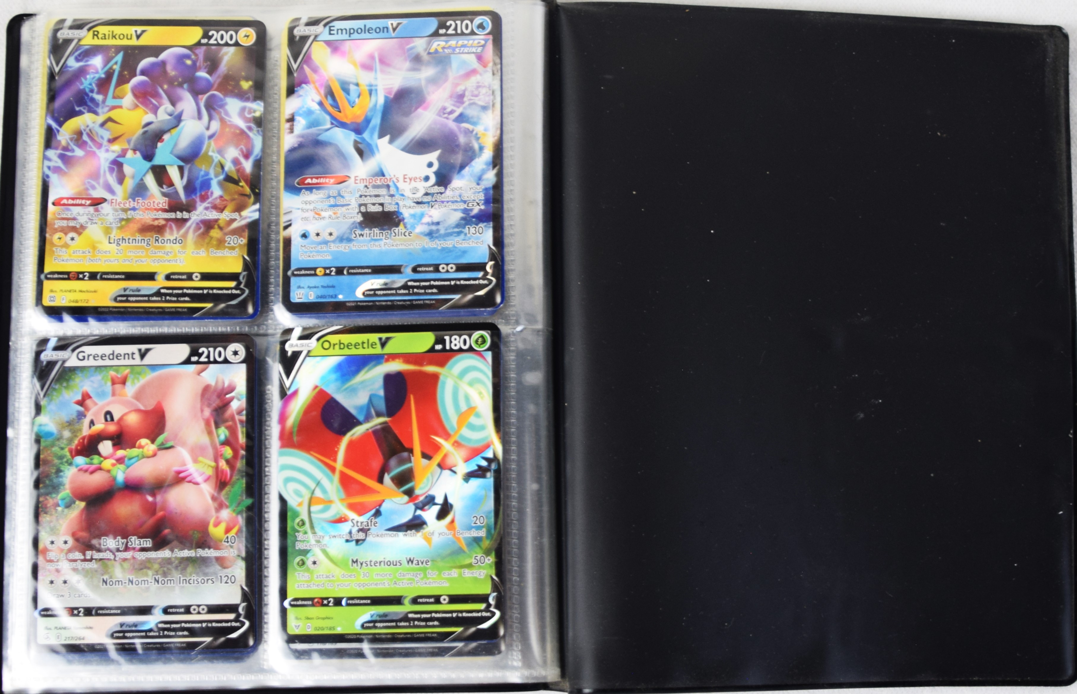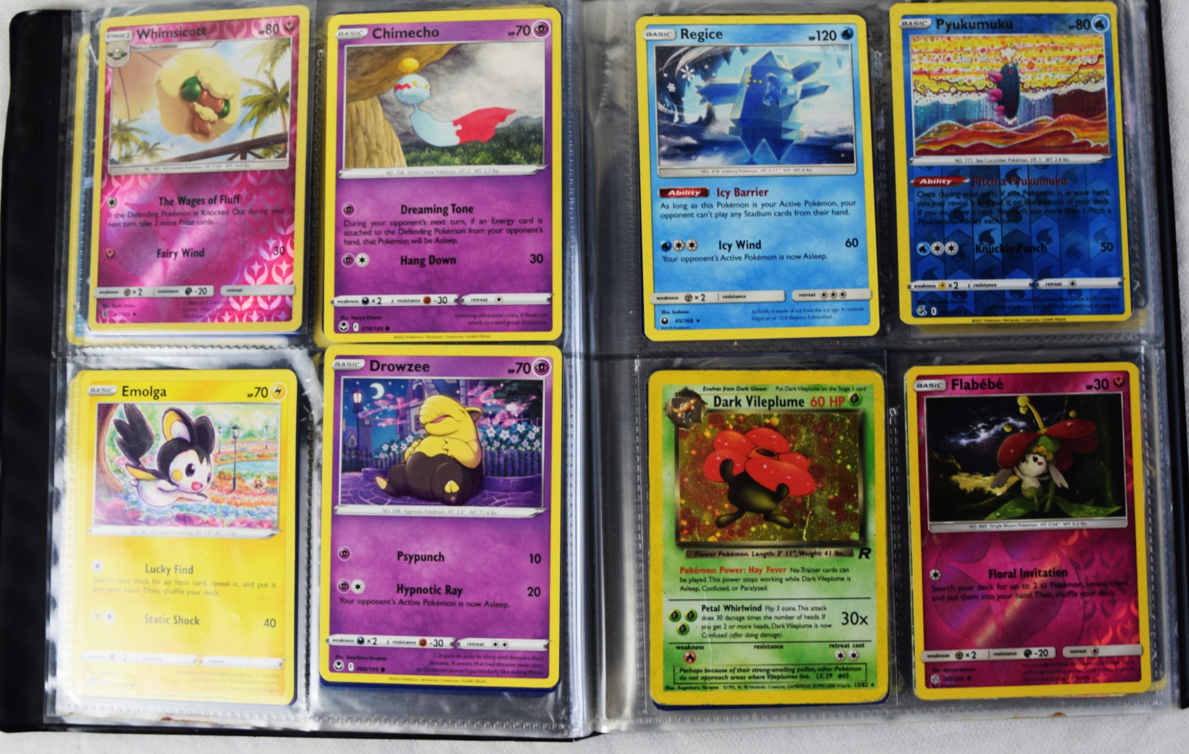 Approximately 60 pages of 4 cards each in three Pokémon binders, 2007-2022 vintage.
