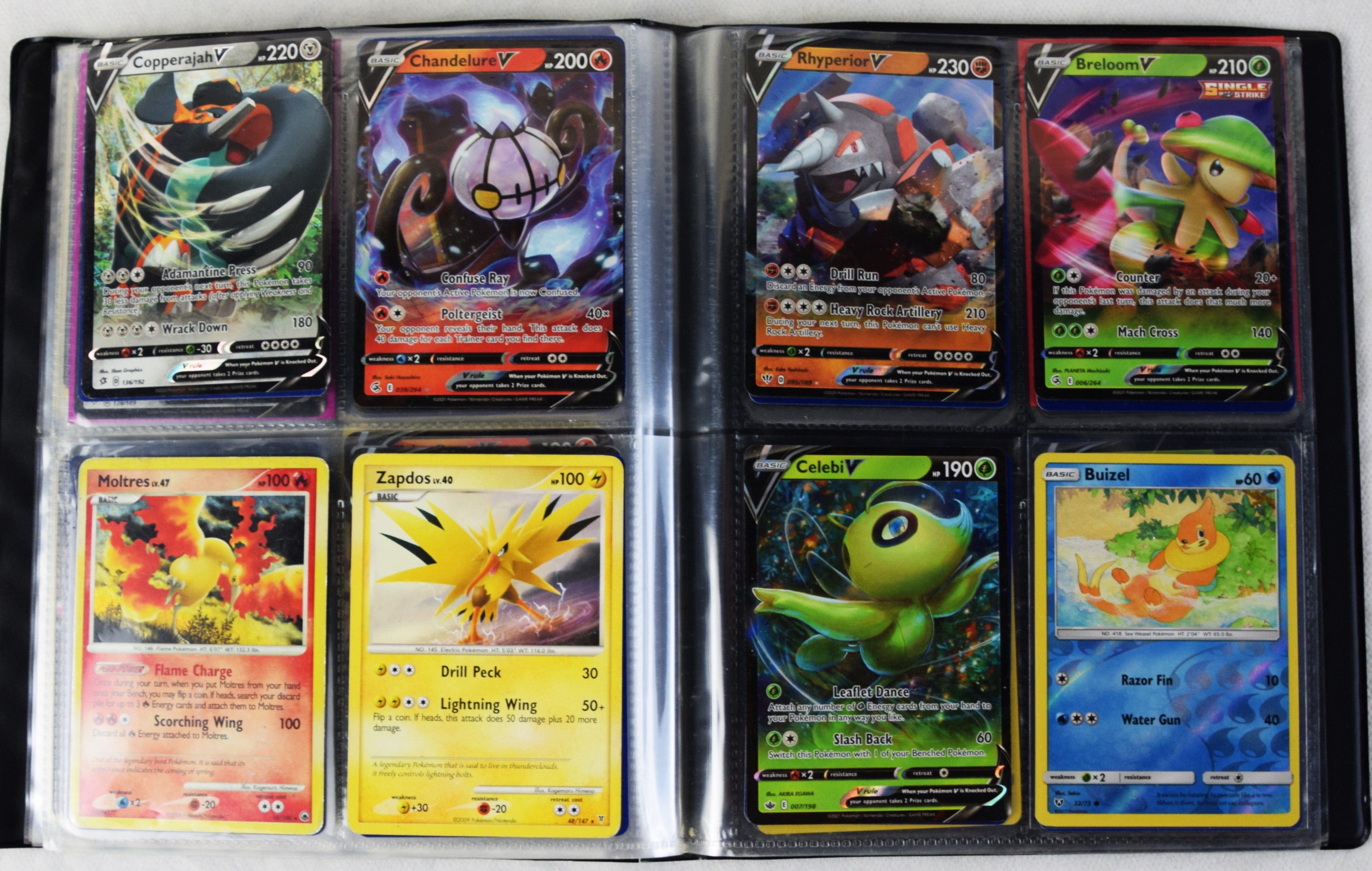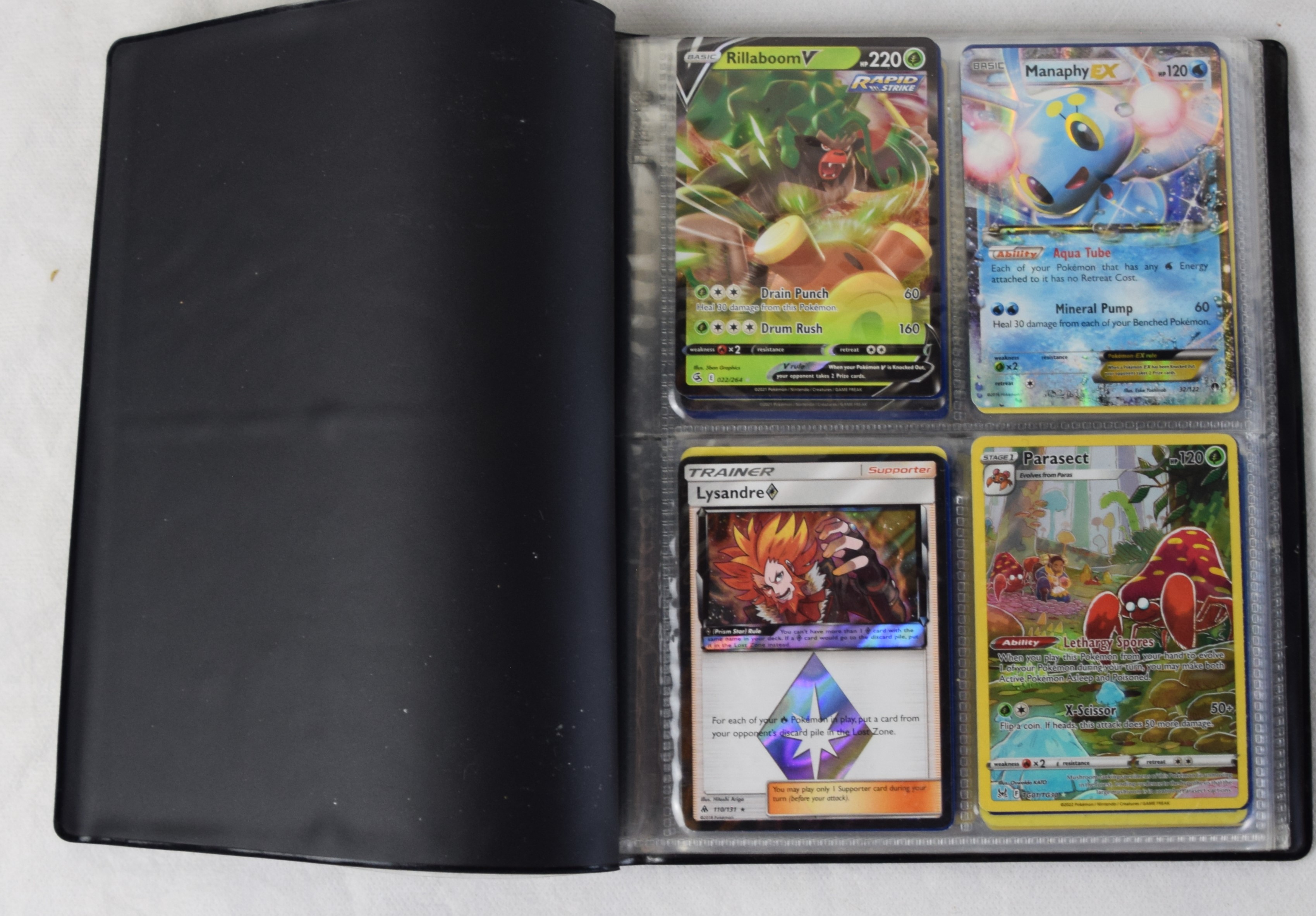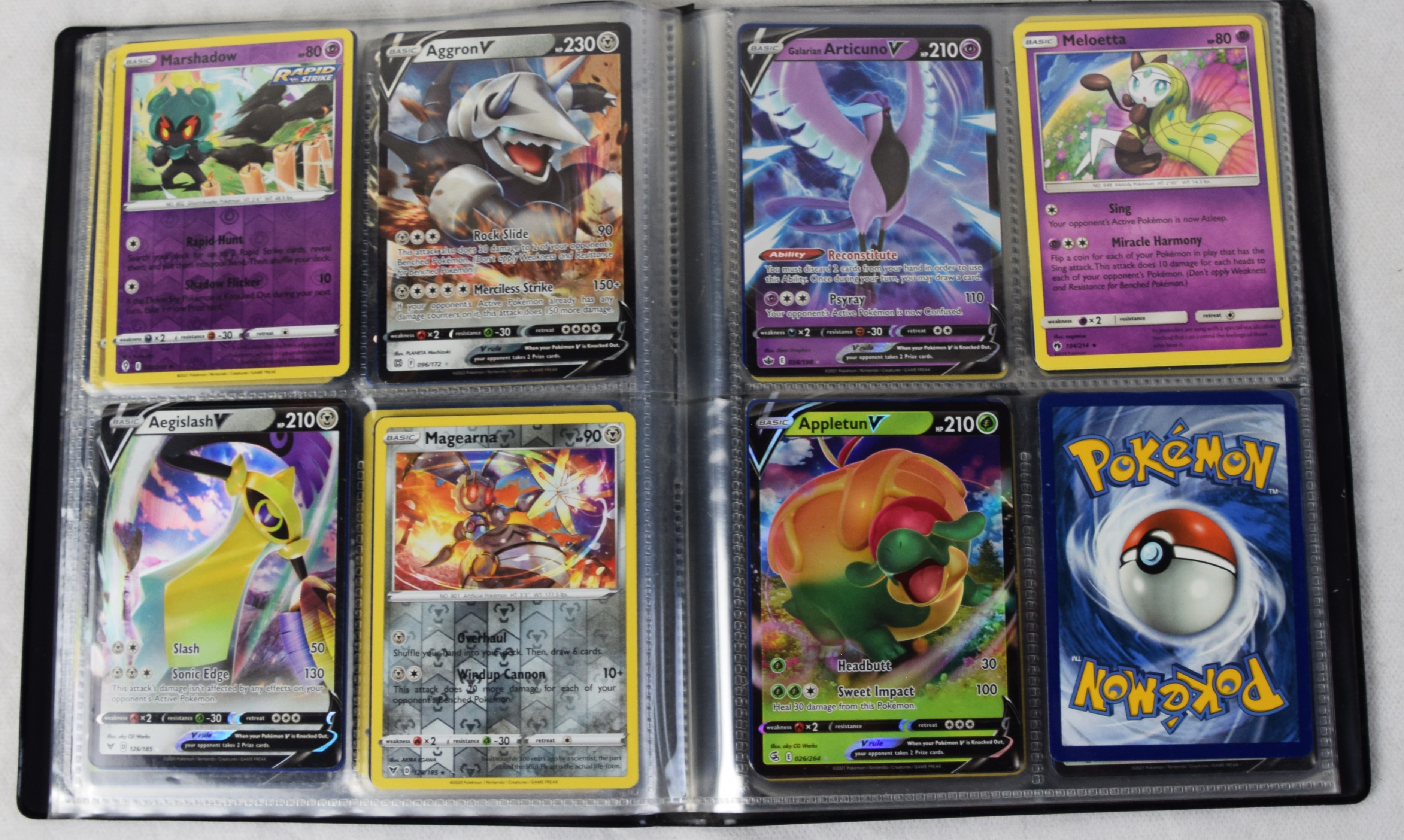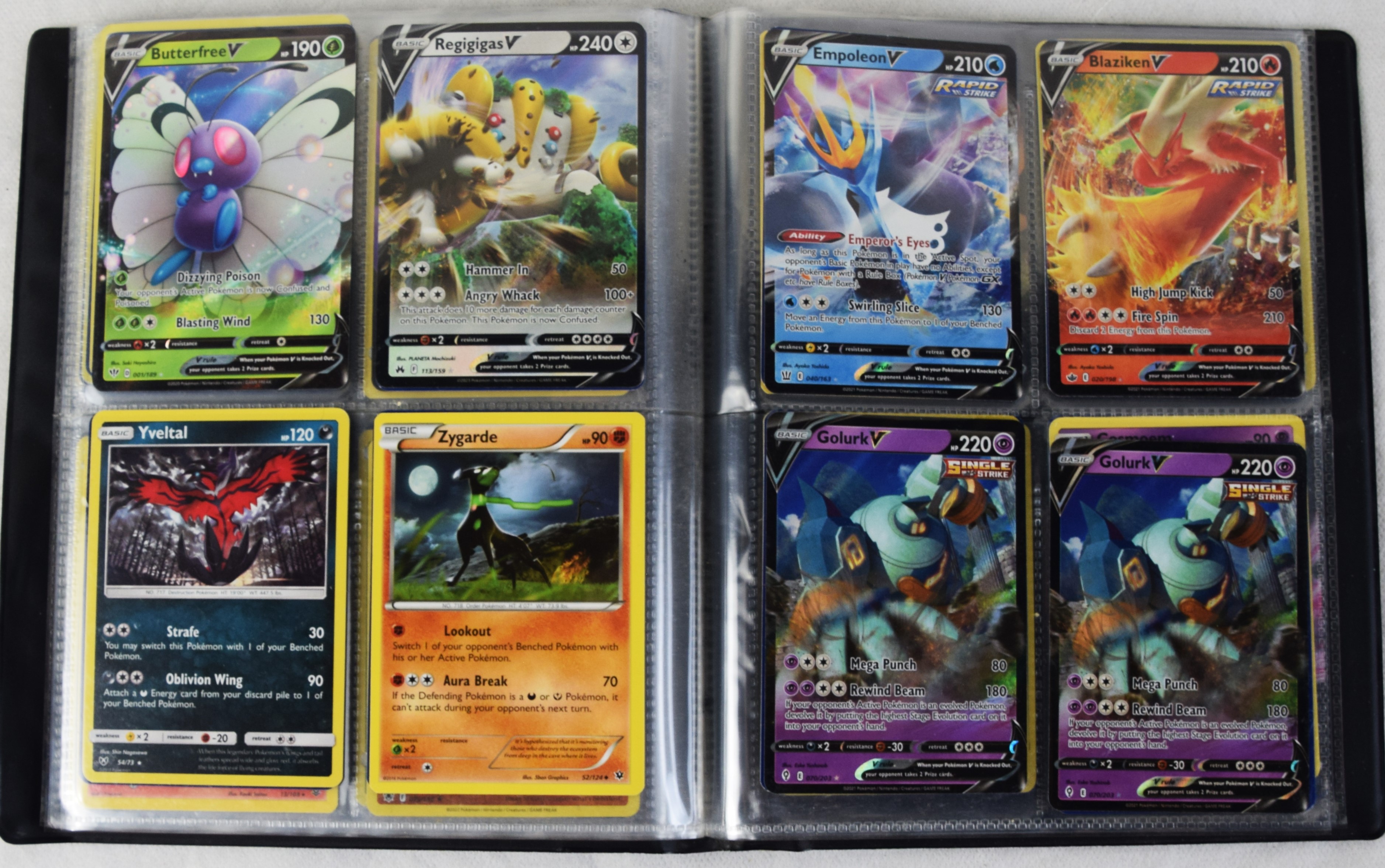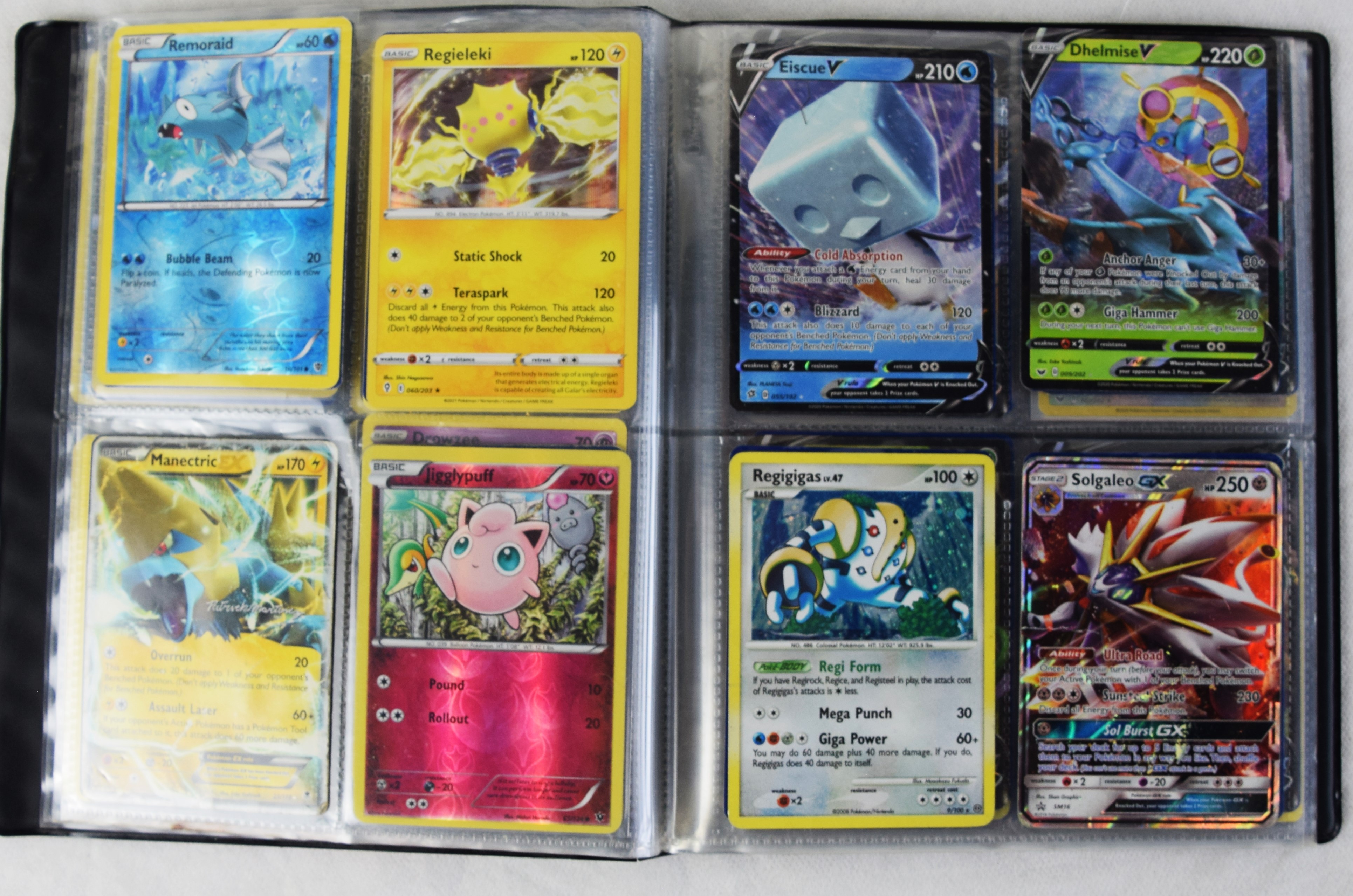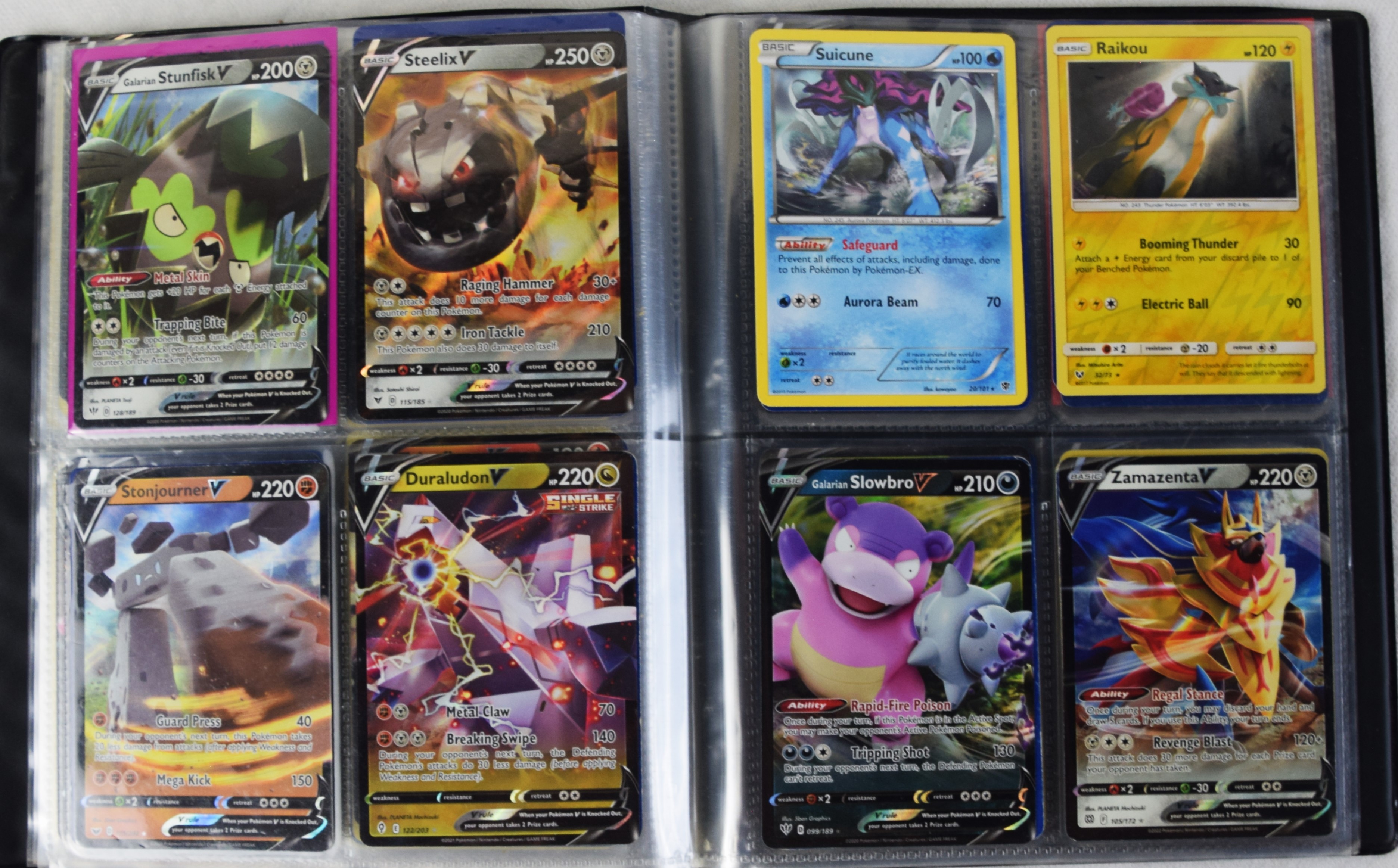 Approximately 60 pages of 4 cards each in three Pokémon binders, 2007-2022 vintage.