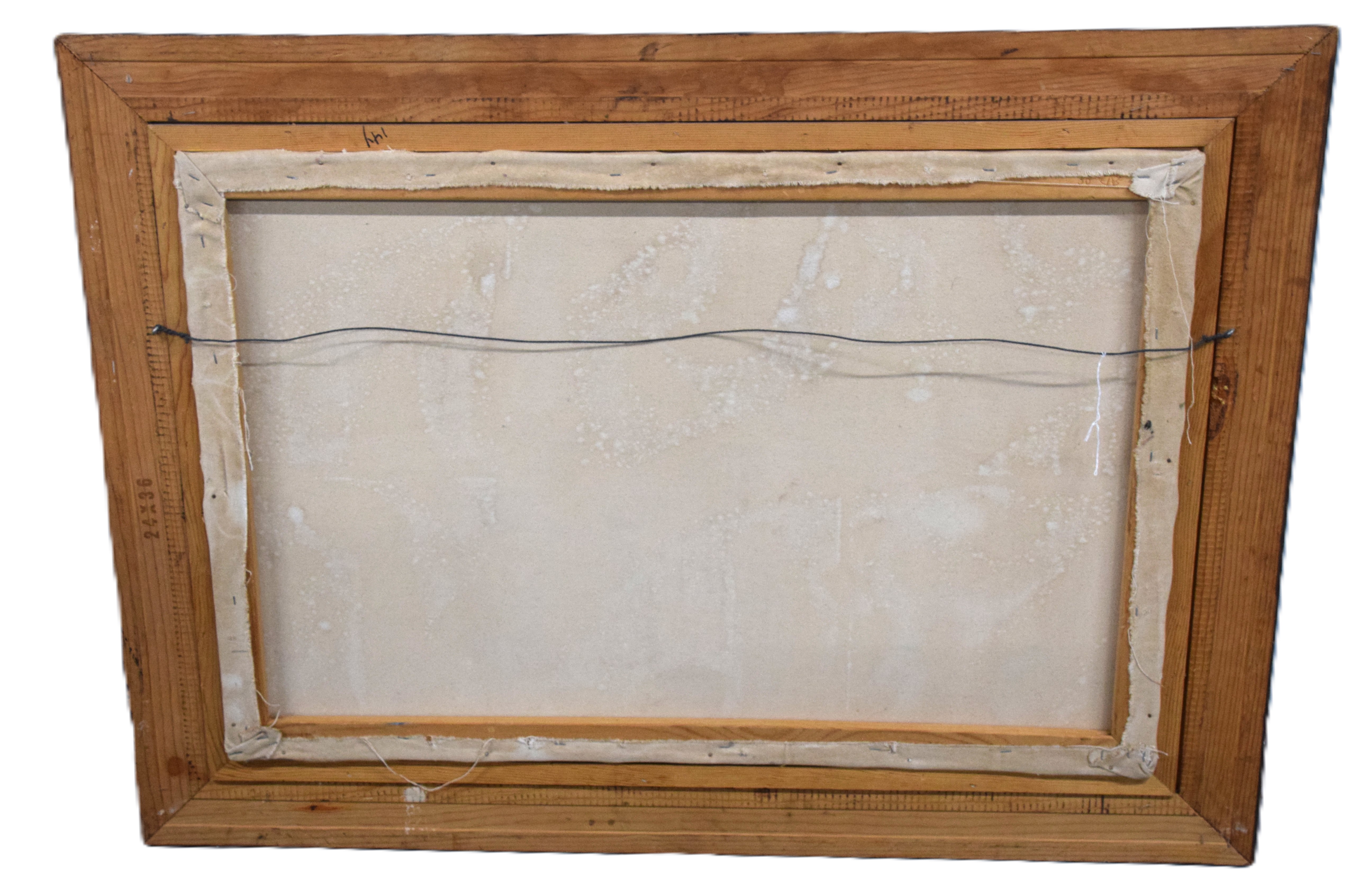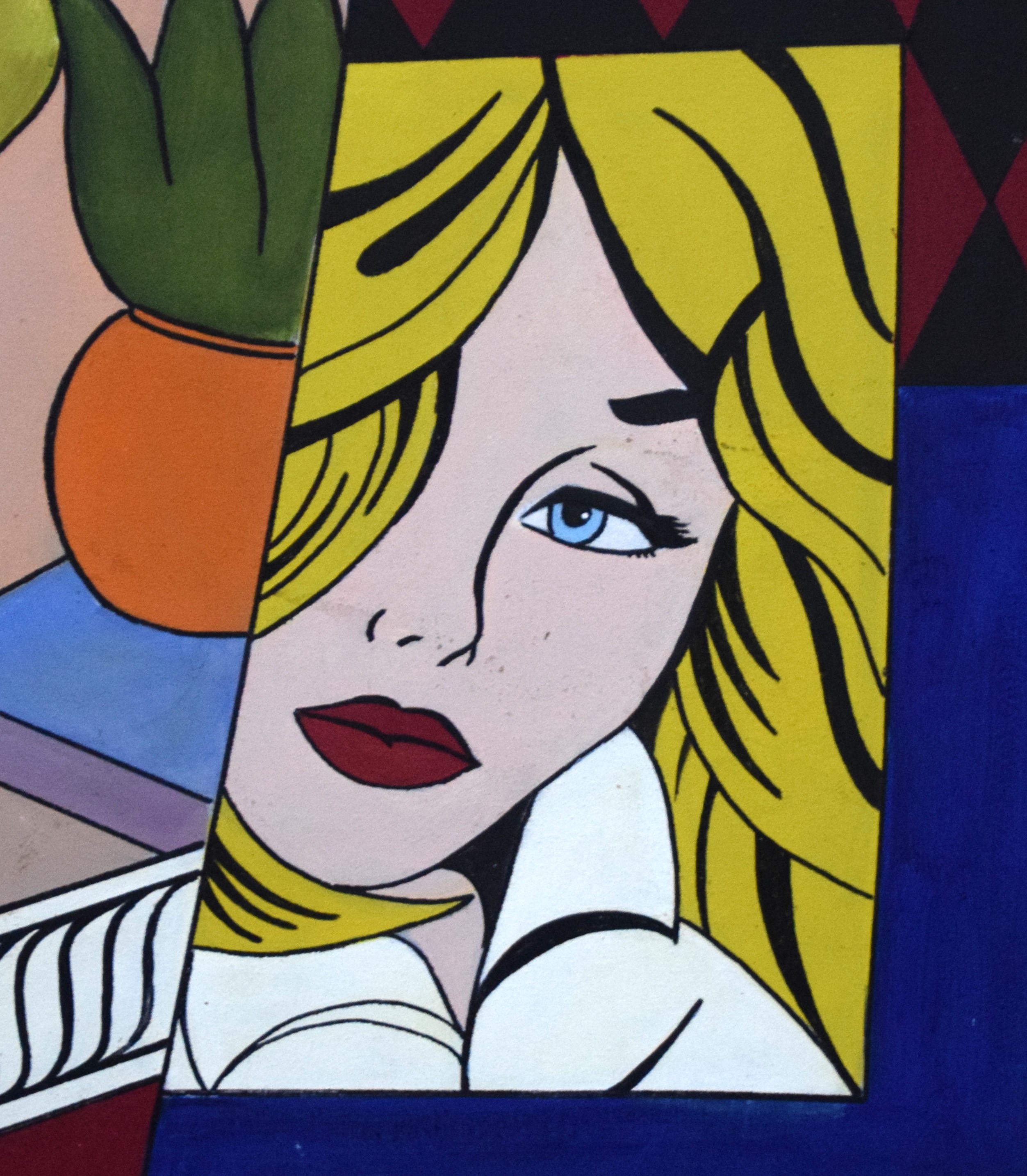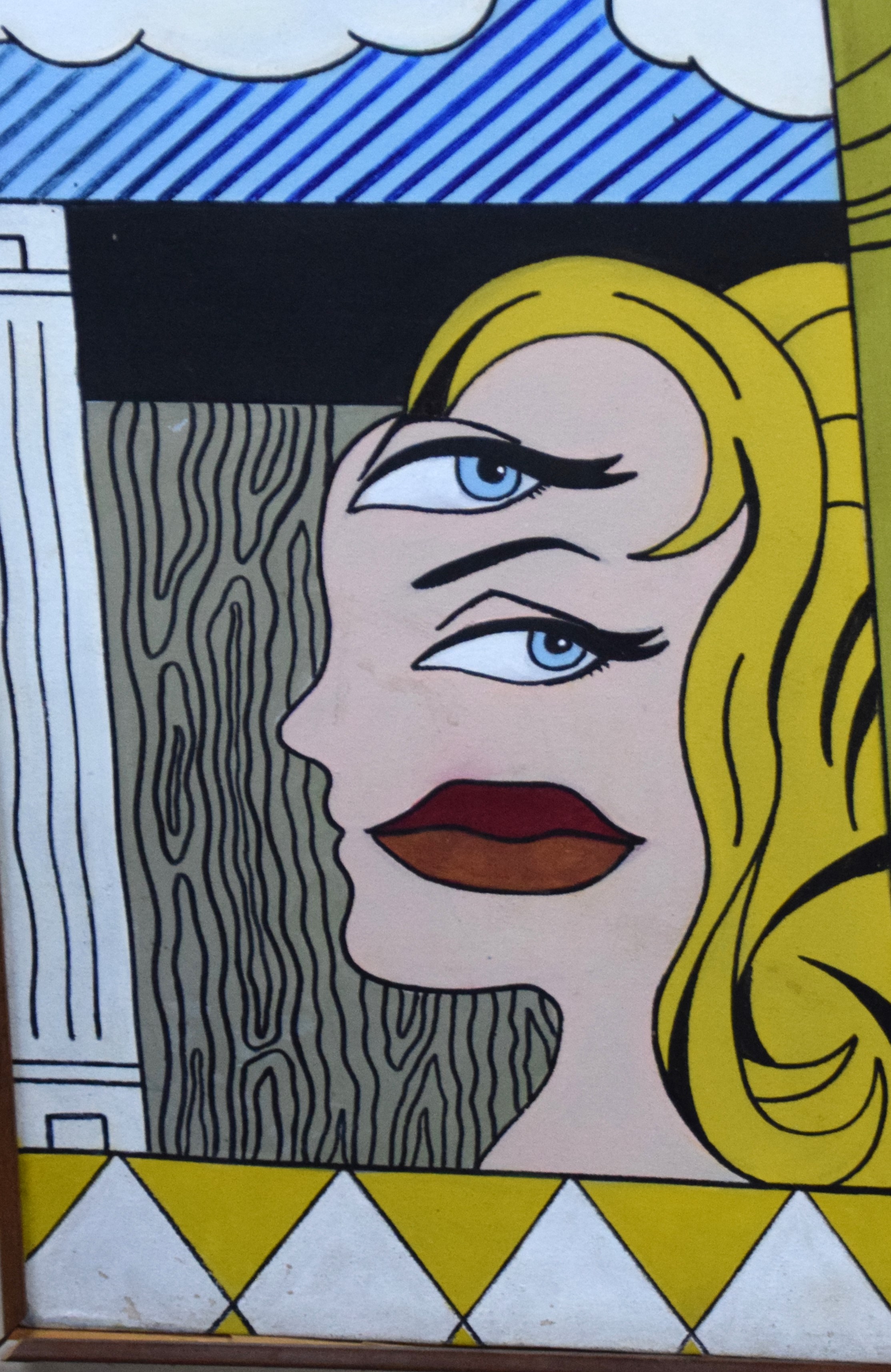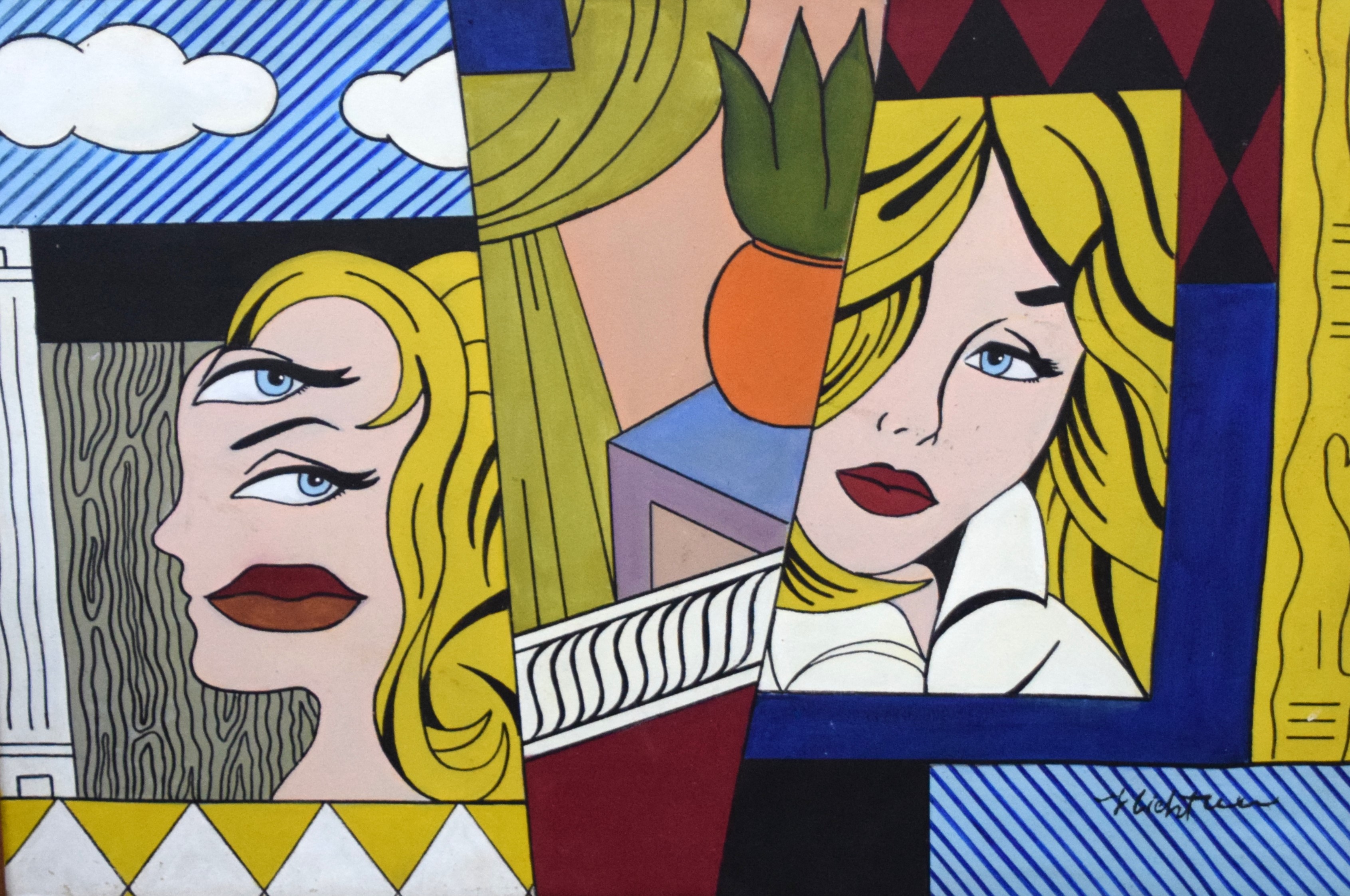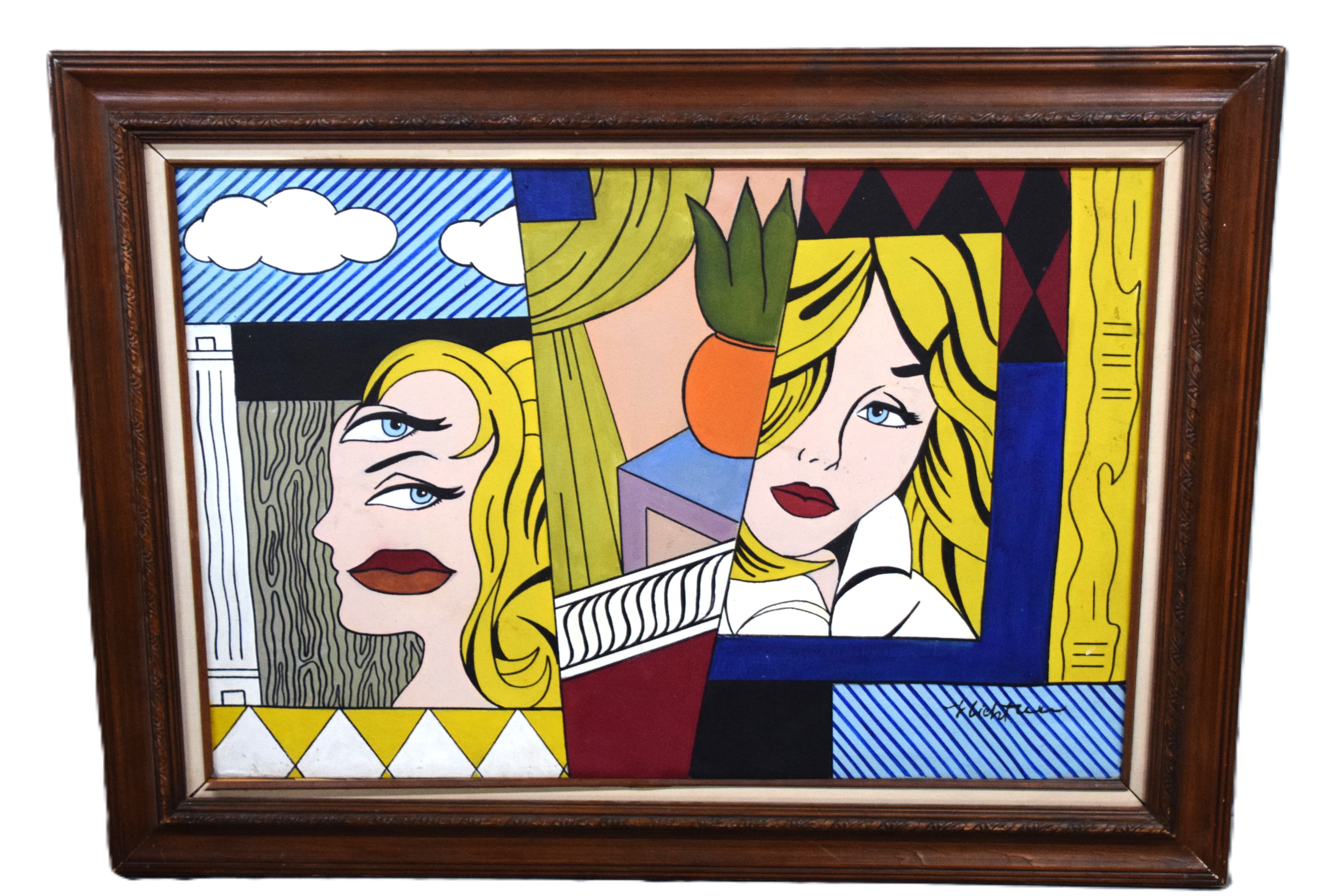 In the style of Roy Lichtenstein, an abstract painting on canvas of two ladies, signed lower right. Roy Lichtenstein (1923 – 1997) worked in New York and is known for Pop imagery cartoon and abstract paintings. Dimensions: 24″ x 36″ Image size