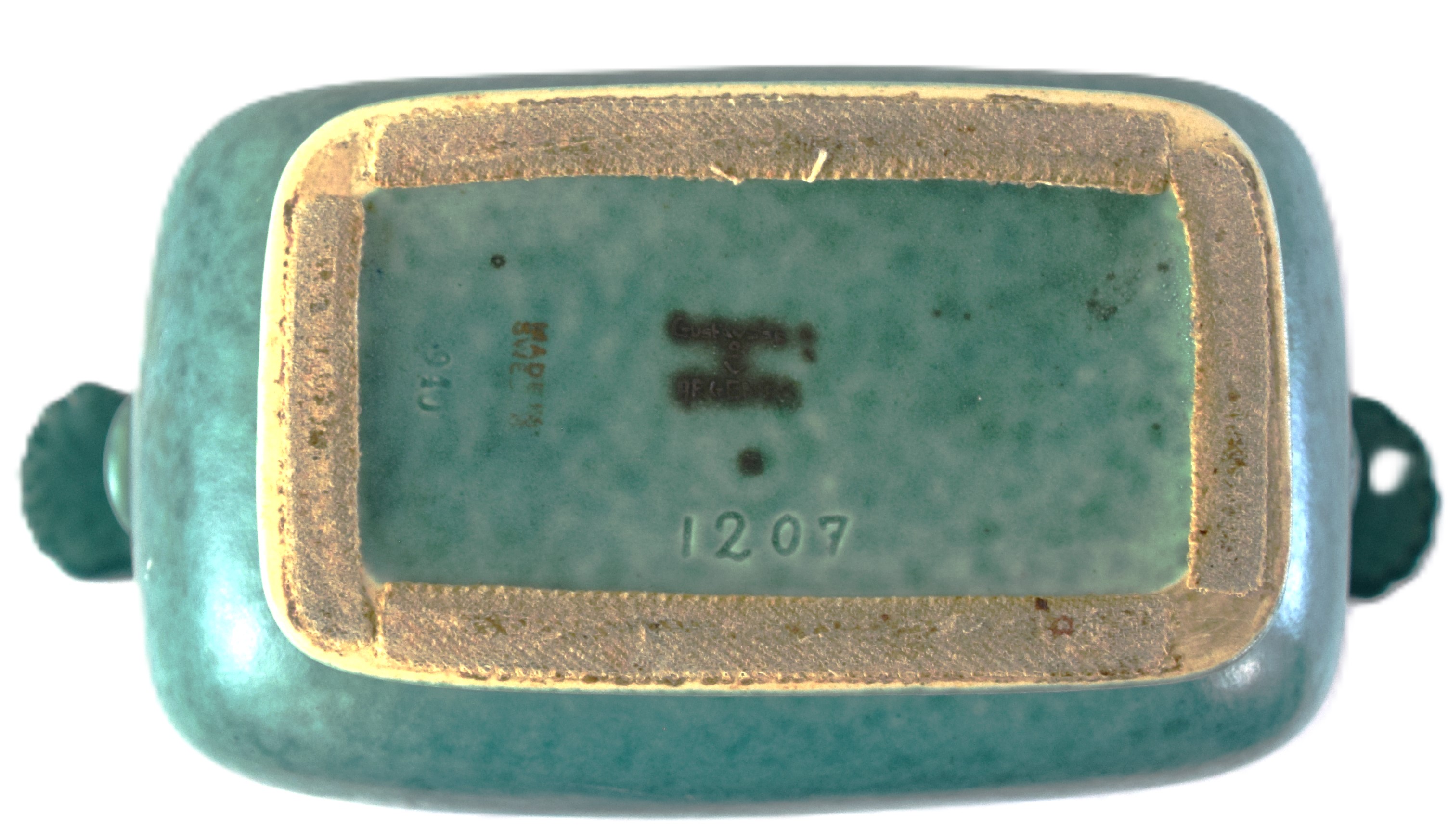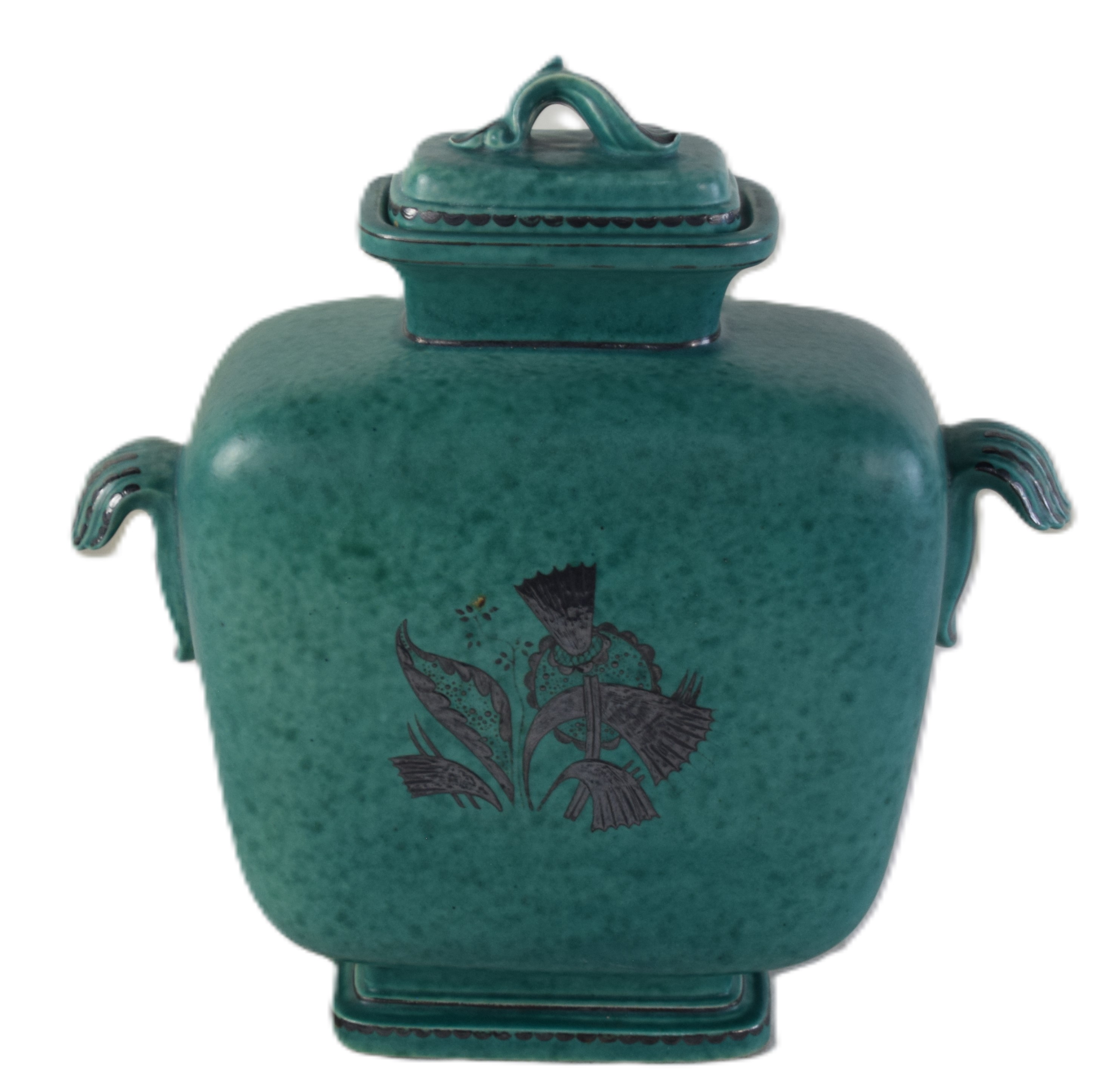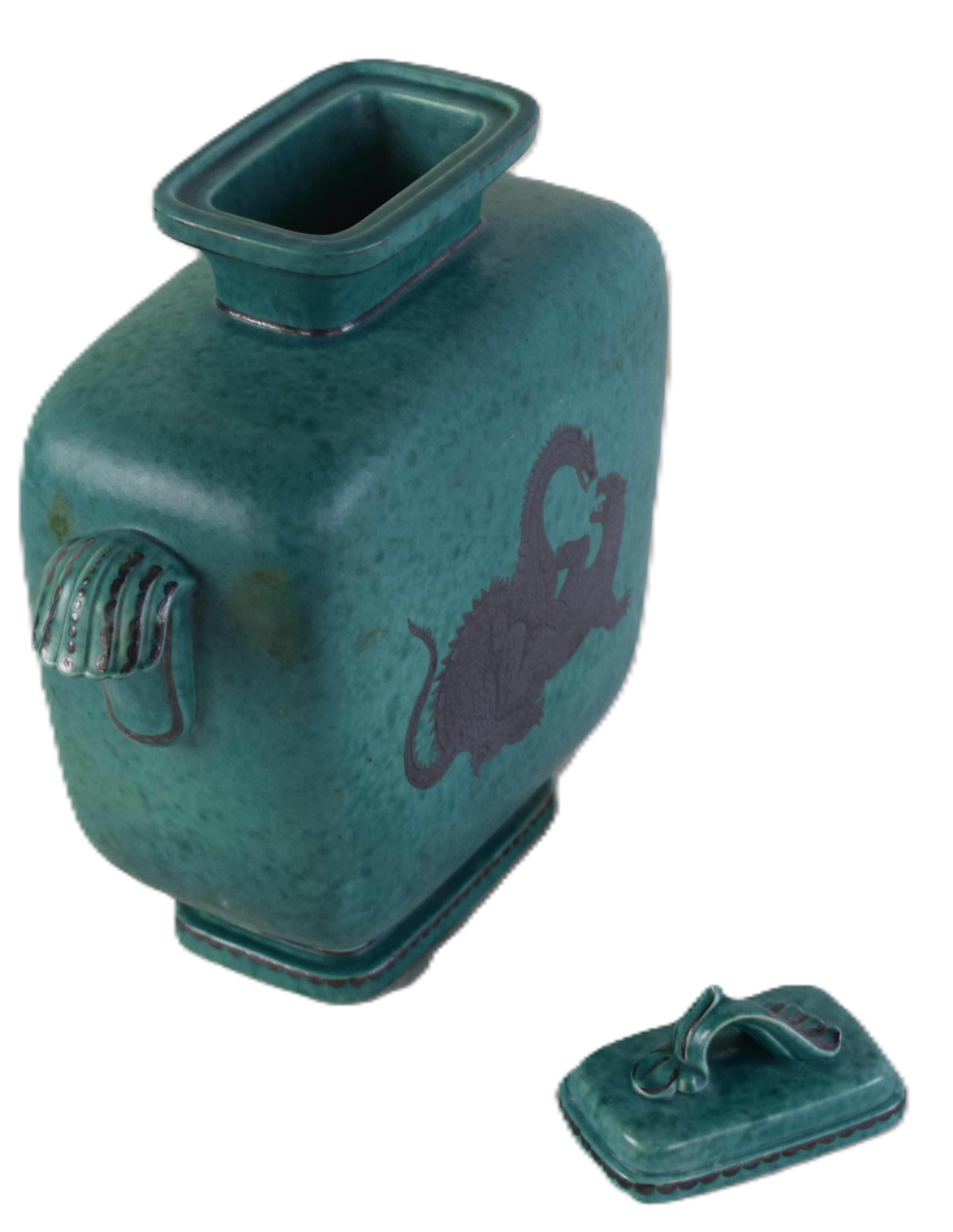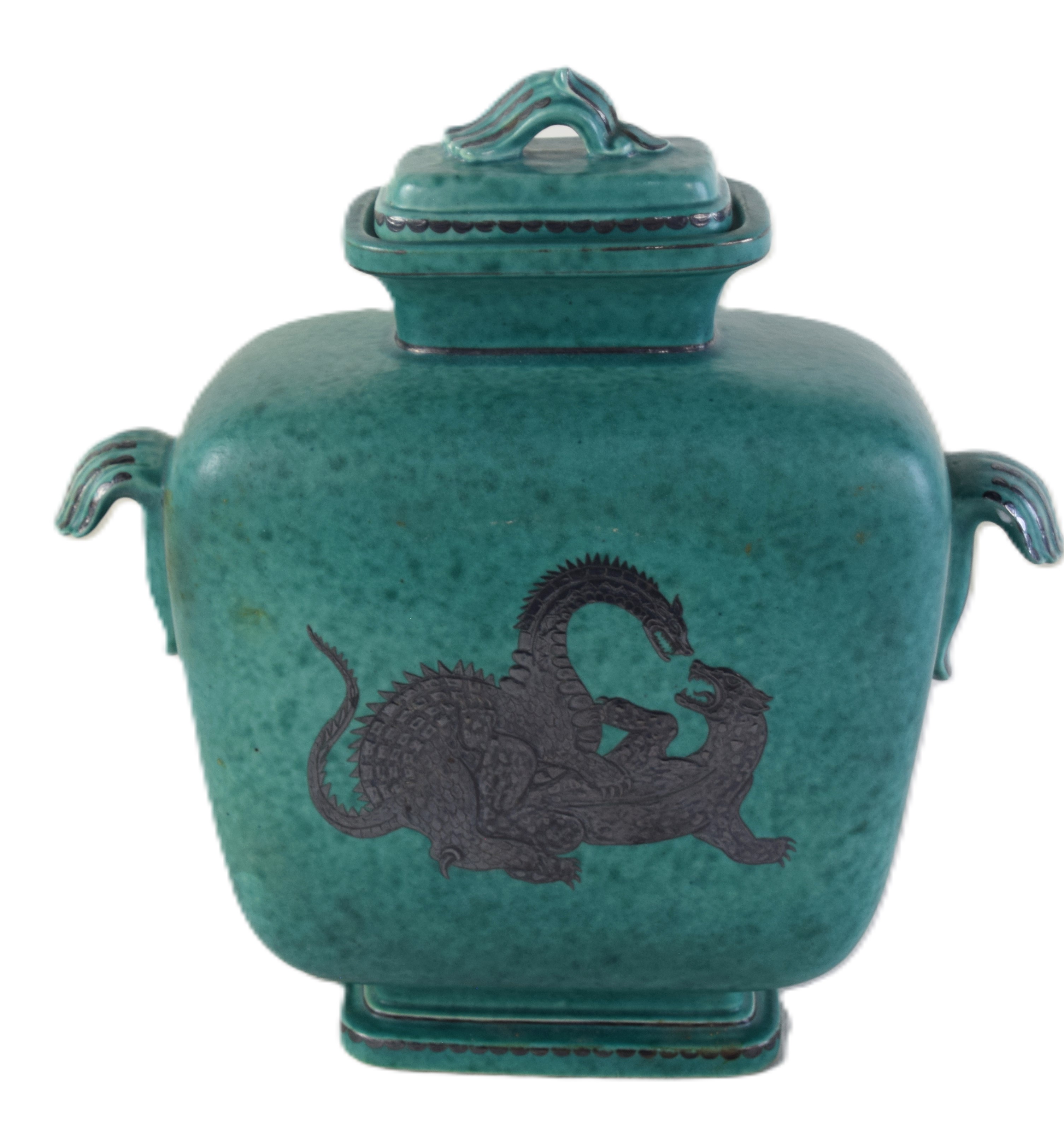 Mid century silver on pottery vase with a lid, side handles with inlaid silver dragons and other designs on body. Marks on bottom include the company Gustausburg Argenta. Dimensions: 11″H x 11″W