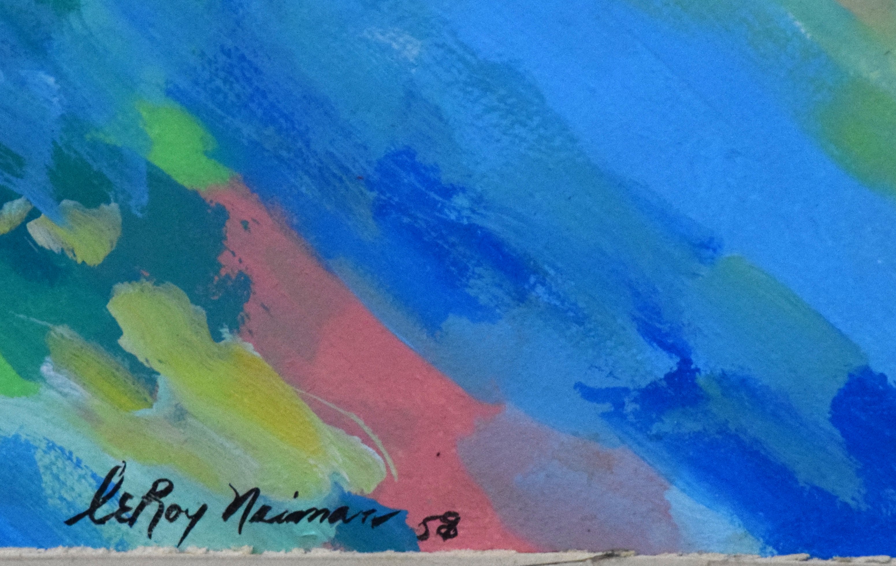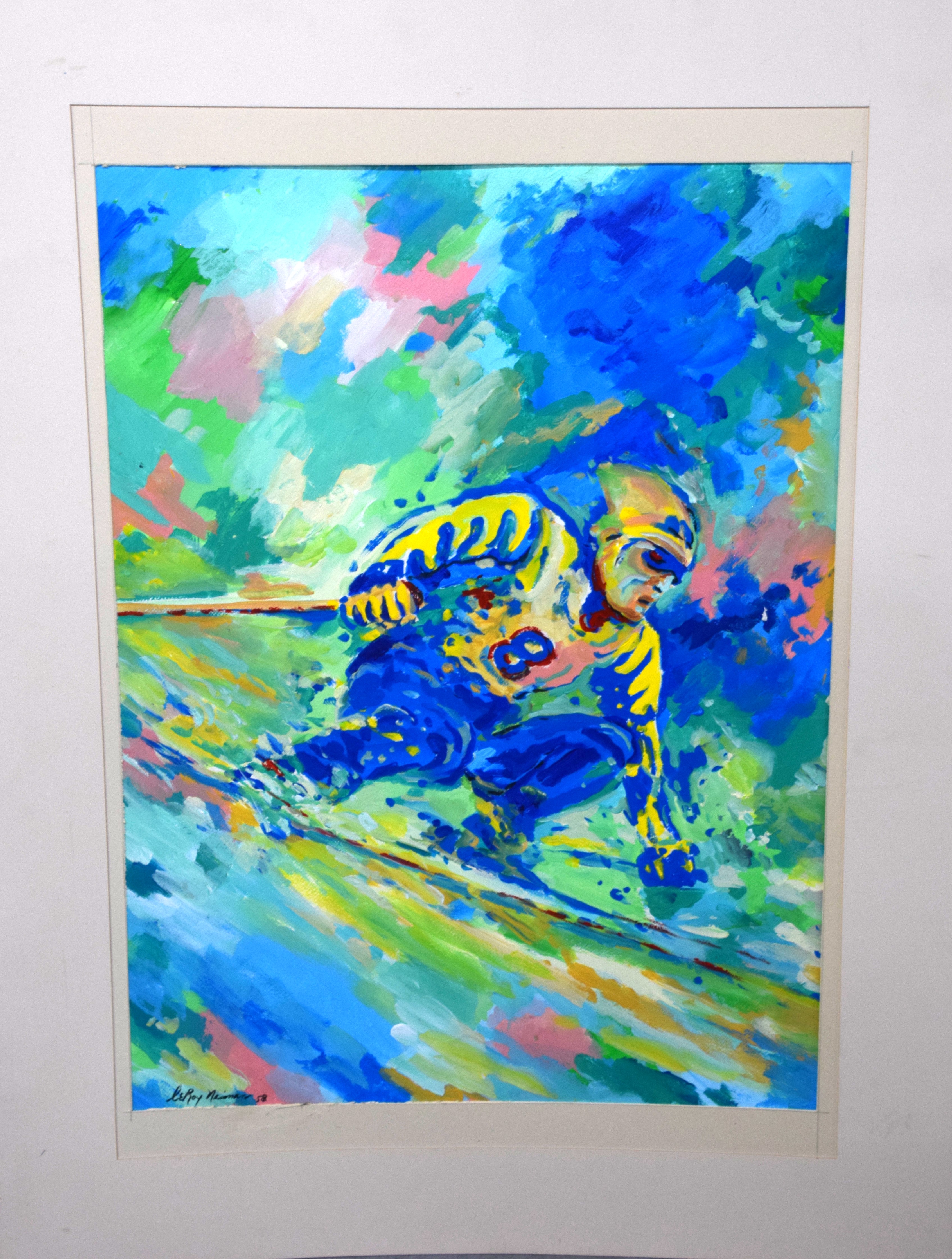 Signed lower right Leroy Neimen oil on canvas painting of a downhill skier. LeRoy Neiman (1921 – 2012) worked in New York and the Midwest and is known for Athletic genre and sports figures. Dimensions: 21″ x 28″