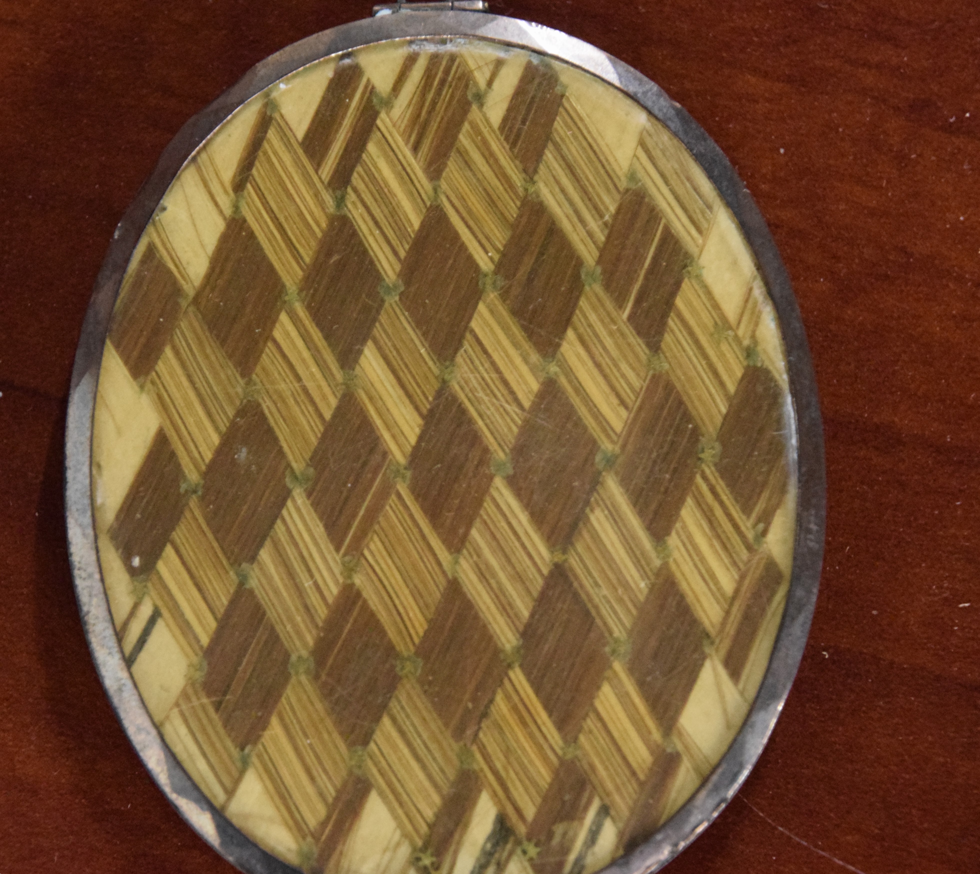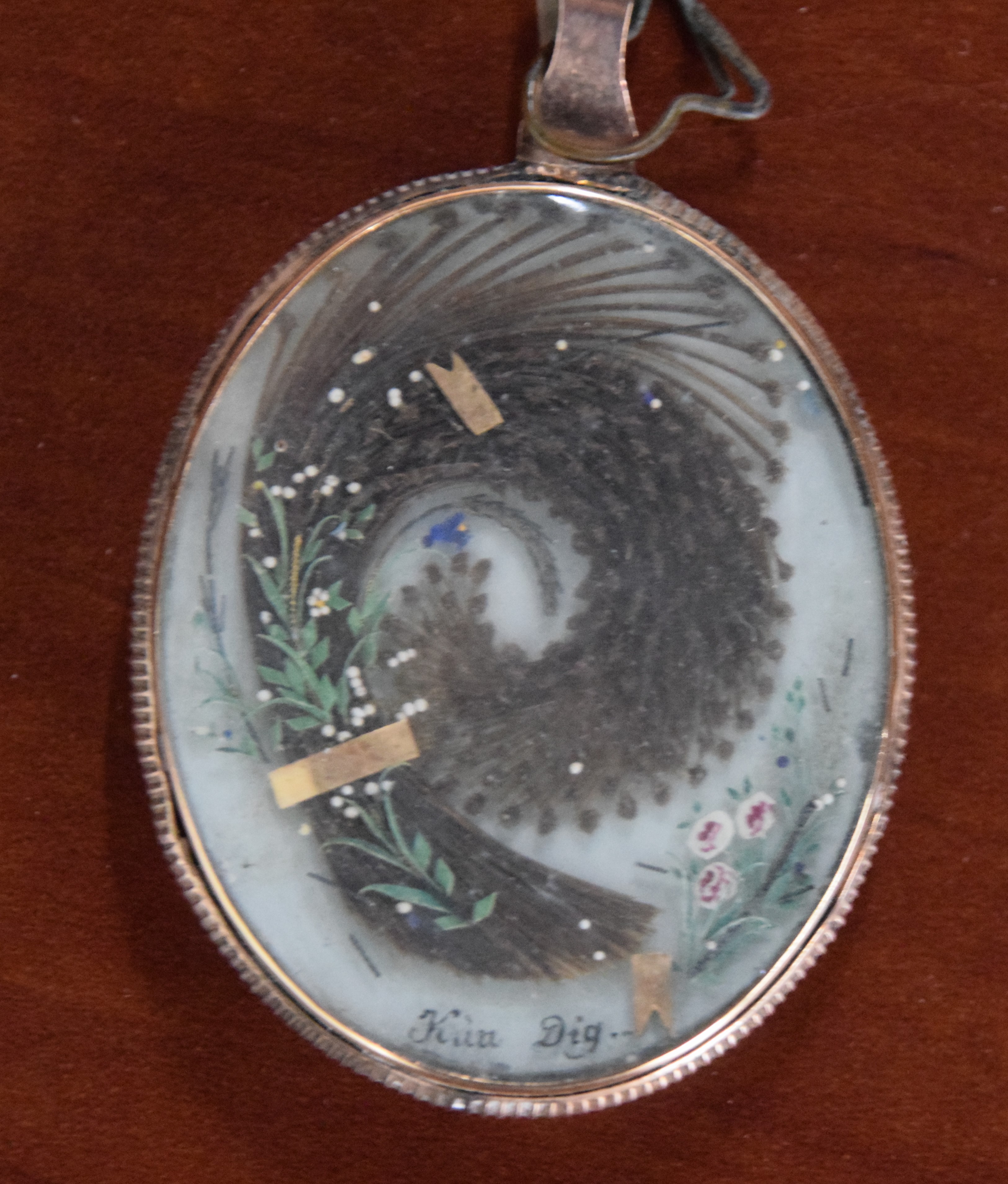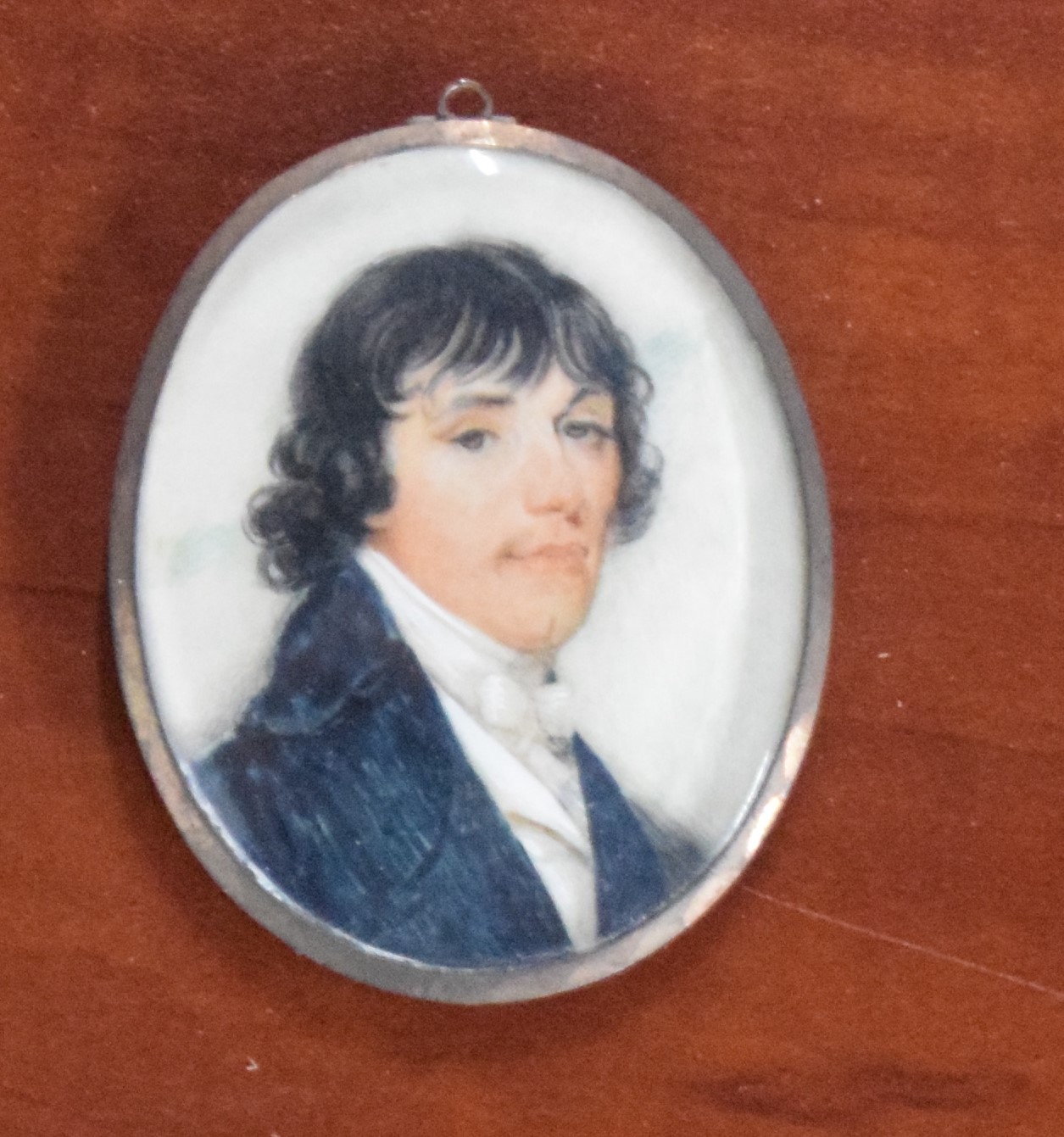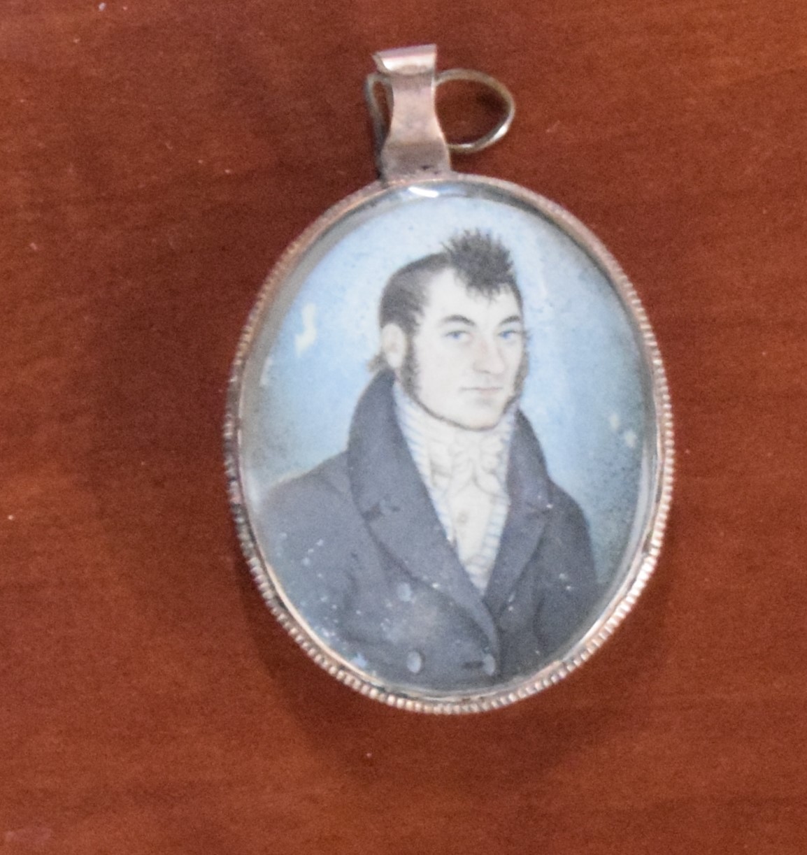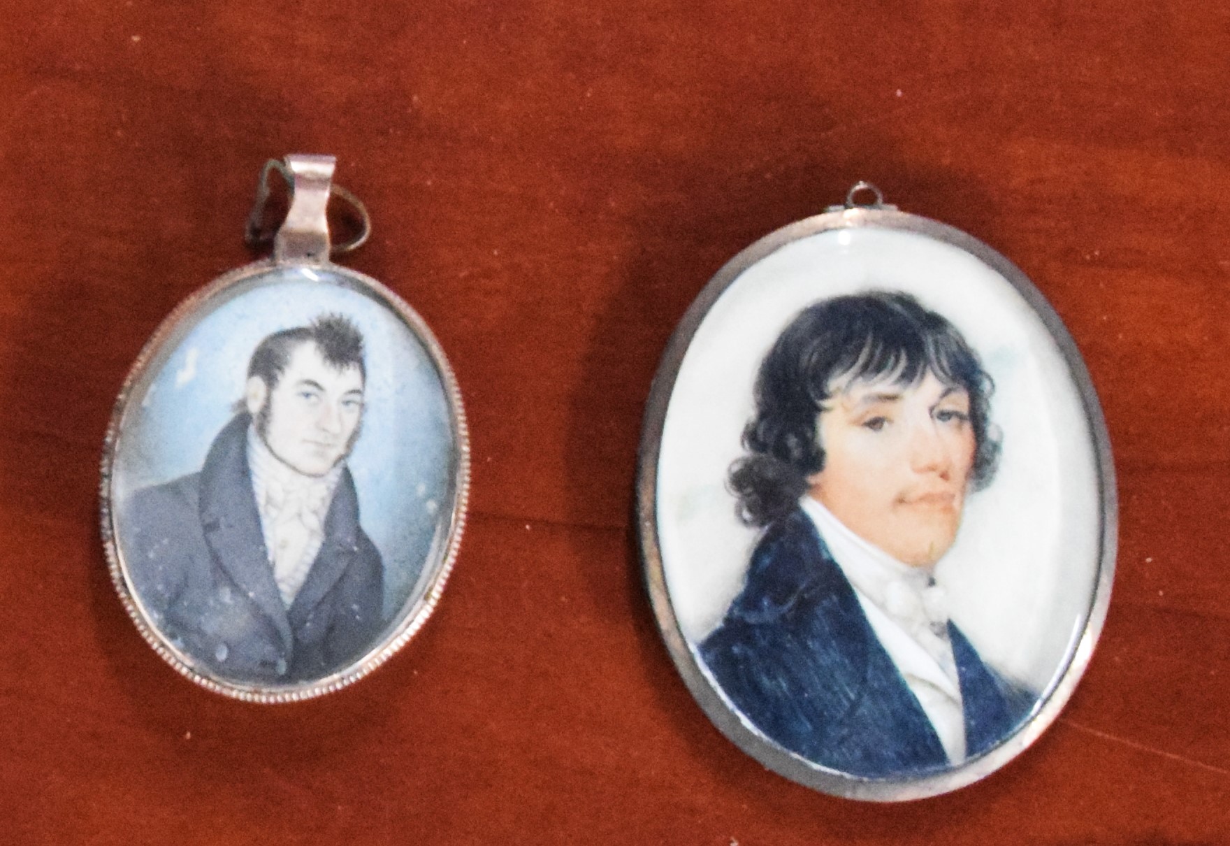 Two miniature portraits, oval brass frames, of two gentleman. The smaller portrait has designs on back with name of artist. Dimensions: 1 3/4″ and 2.5″” and 7″ Length with frame
