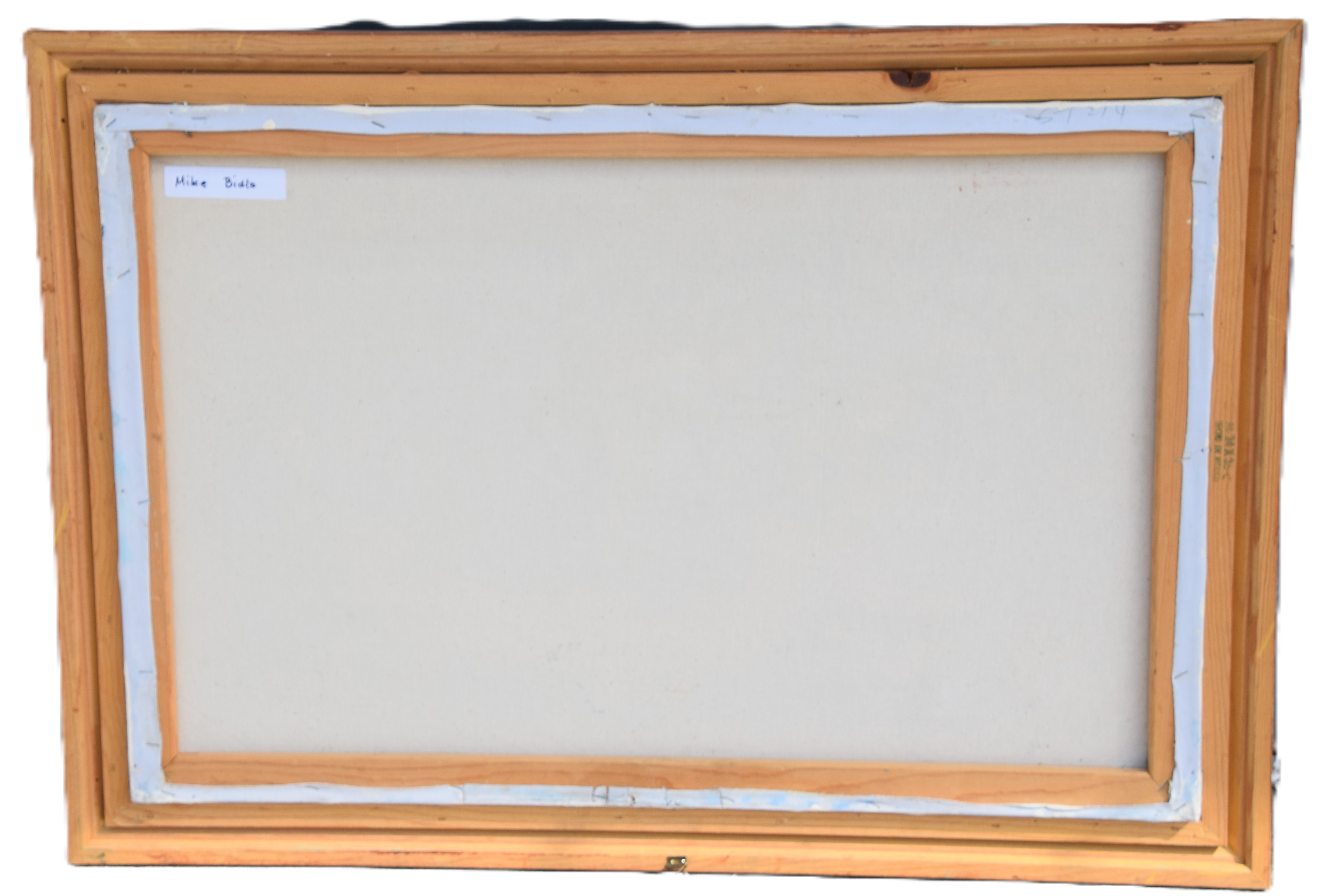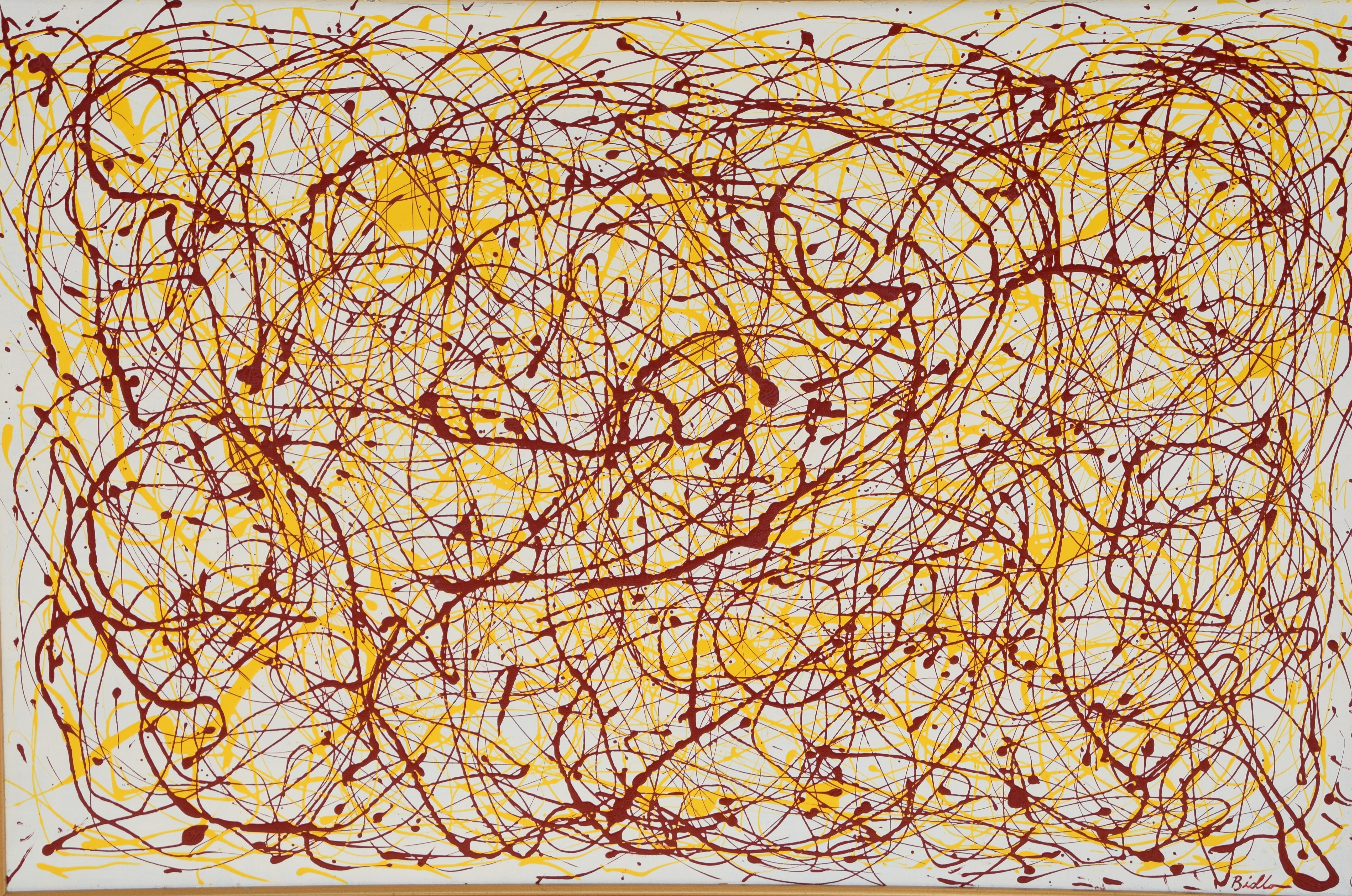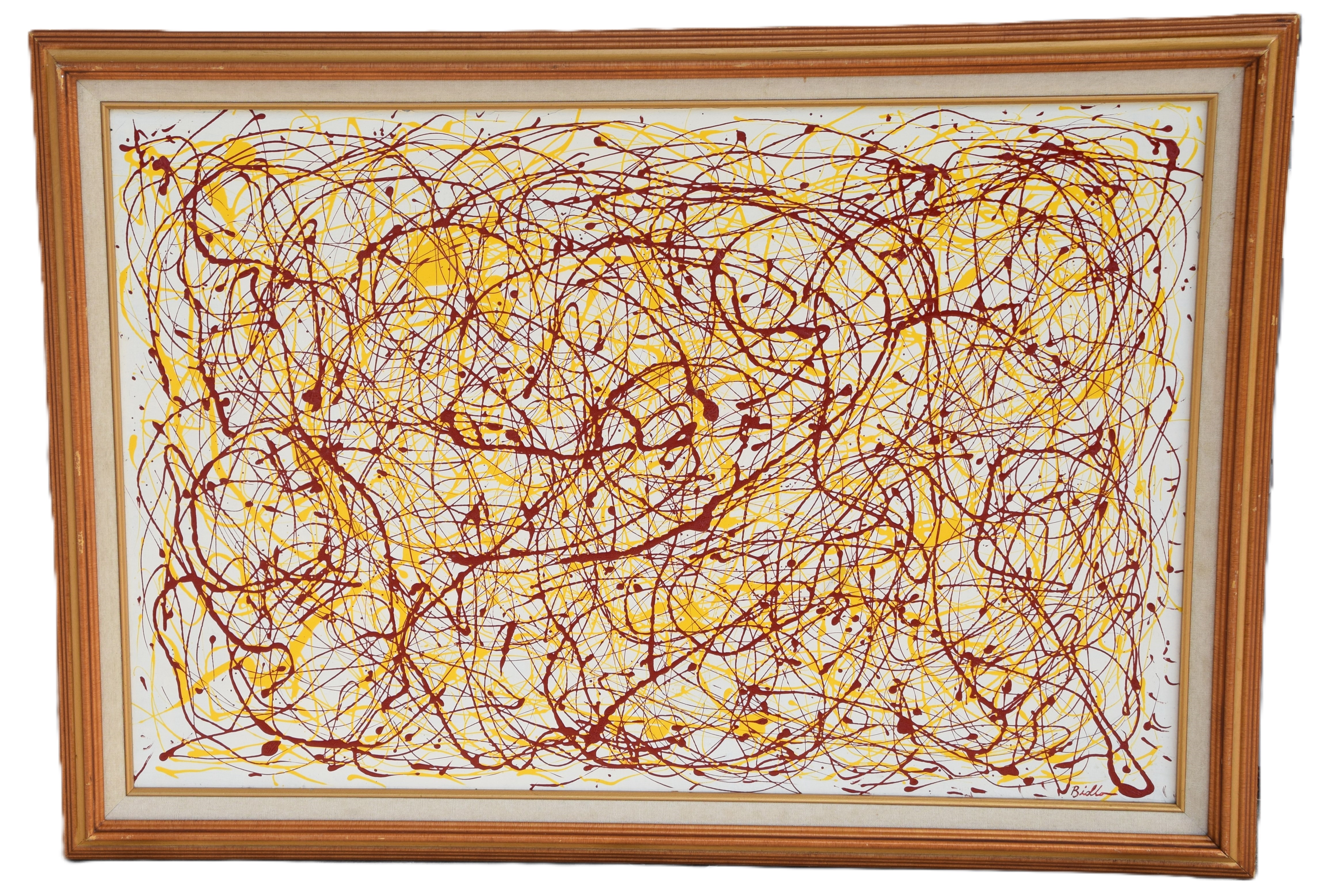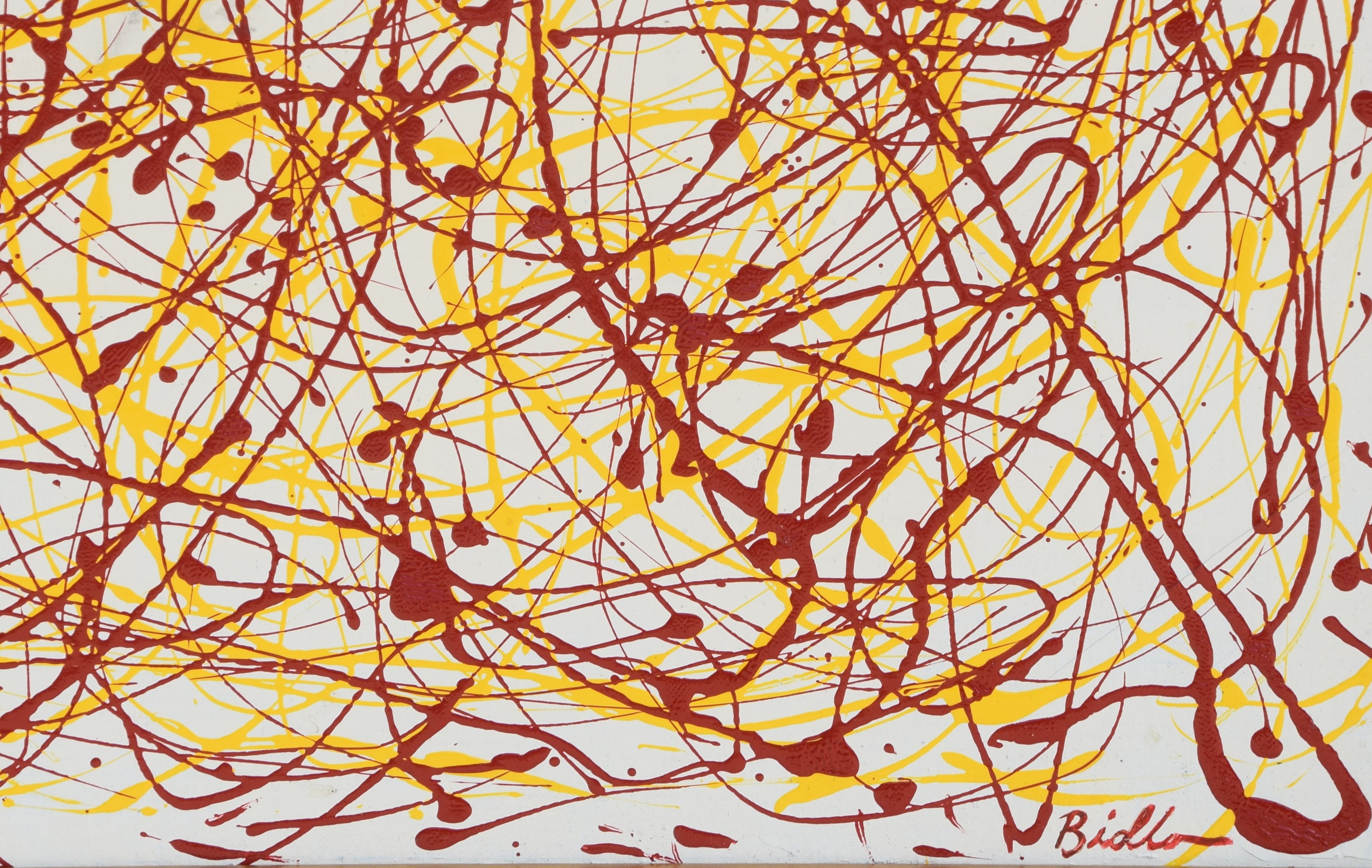 Framed and attributed/in the style of Mike Bidlo, acrylic on canvas abstract painting with maroon and yellow colors, “Not a Pollock”. Mike Bidlo (Born 1953) works in New York and Illinois and is known for creating replicas of work by well-known 20th modernists including Pollock, Picasso and Matisse. Dimensions: 24″ x 36″ Image size