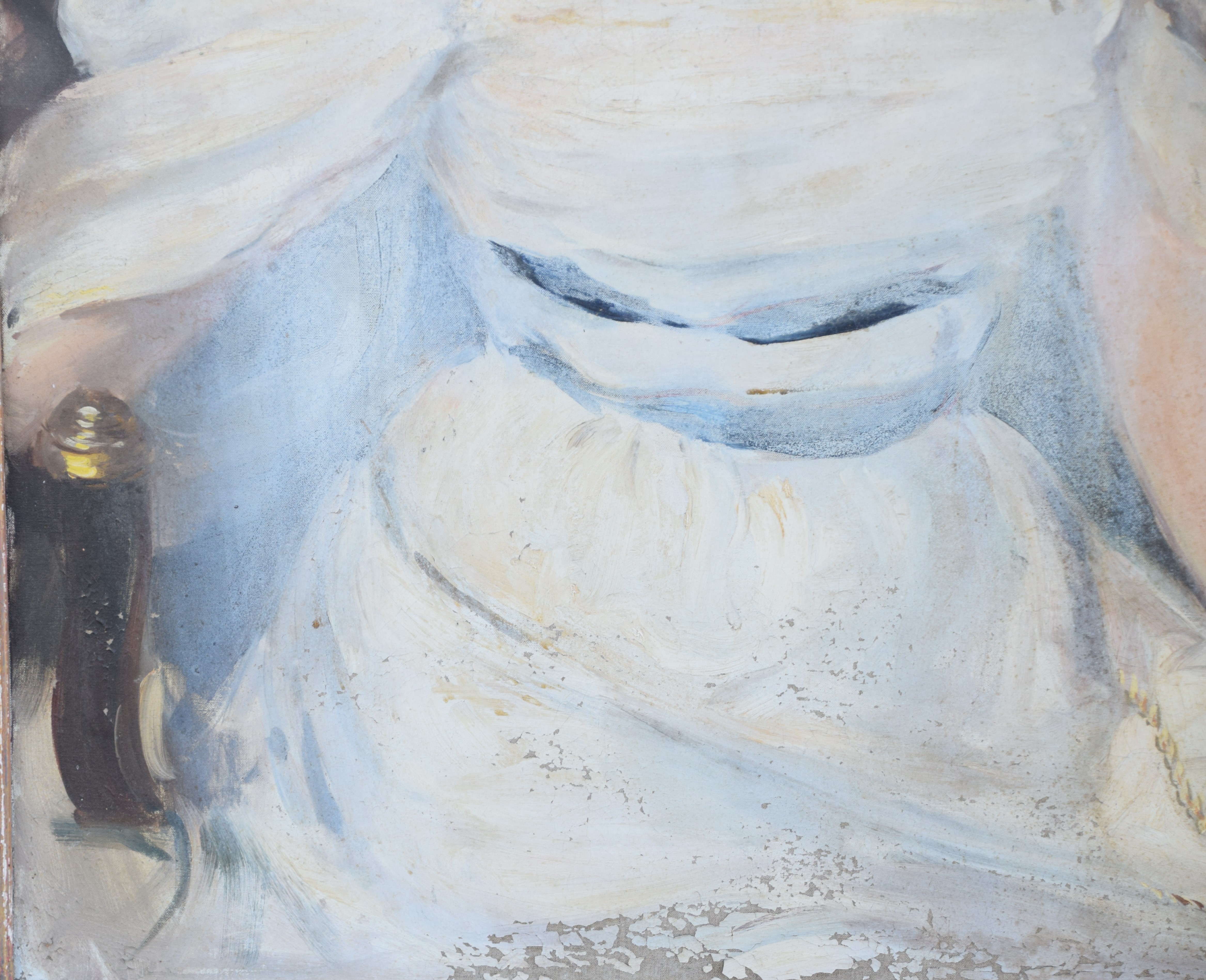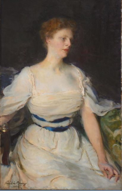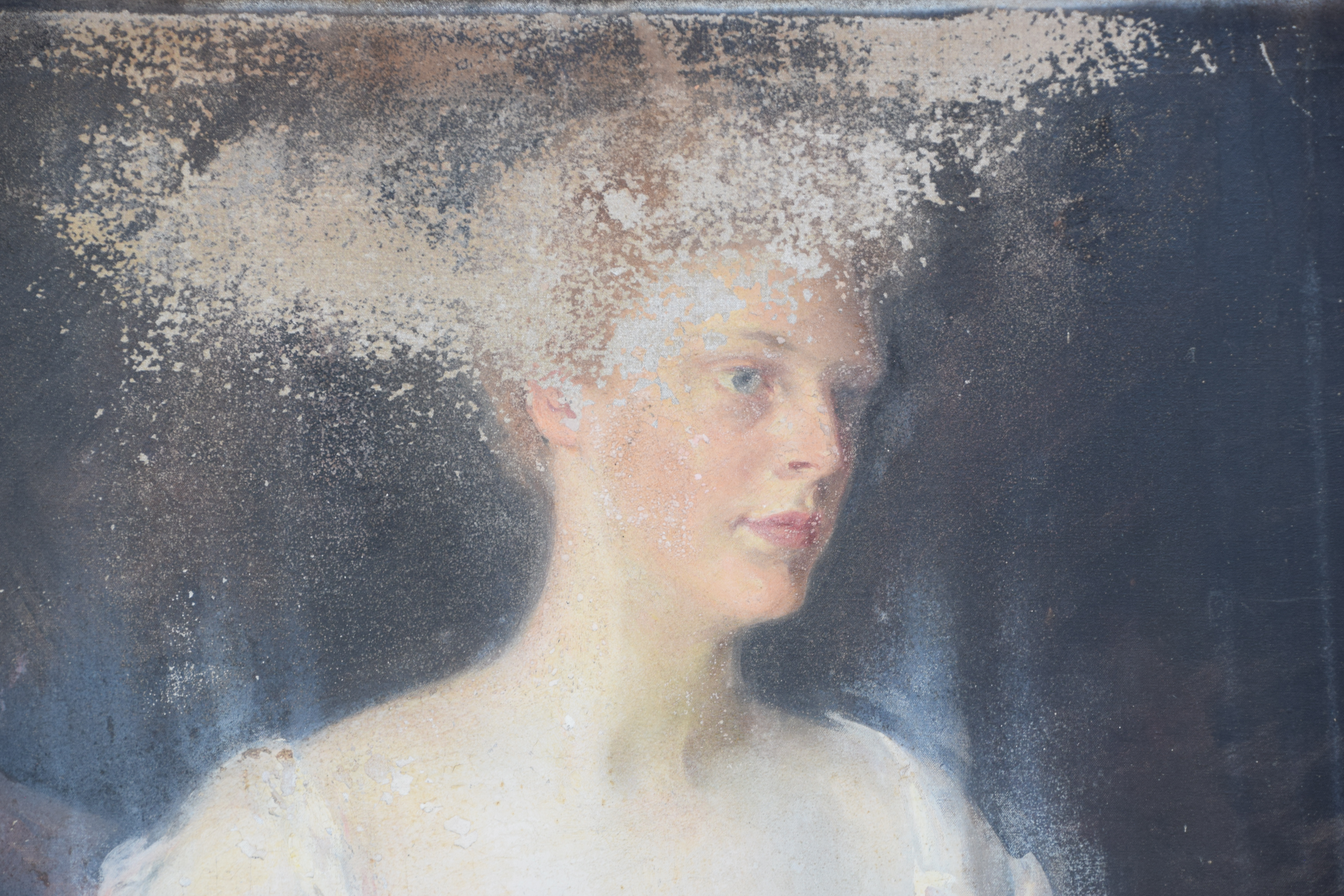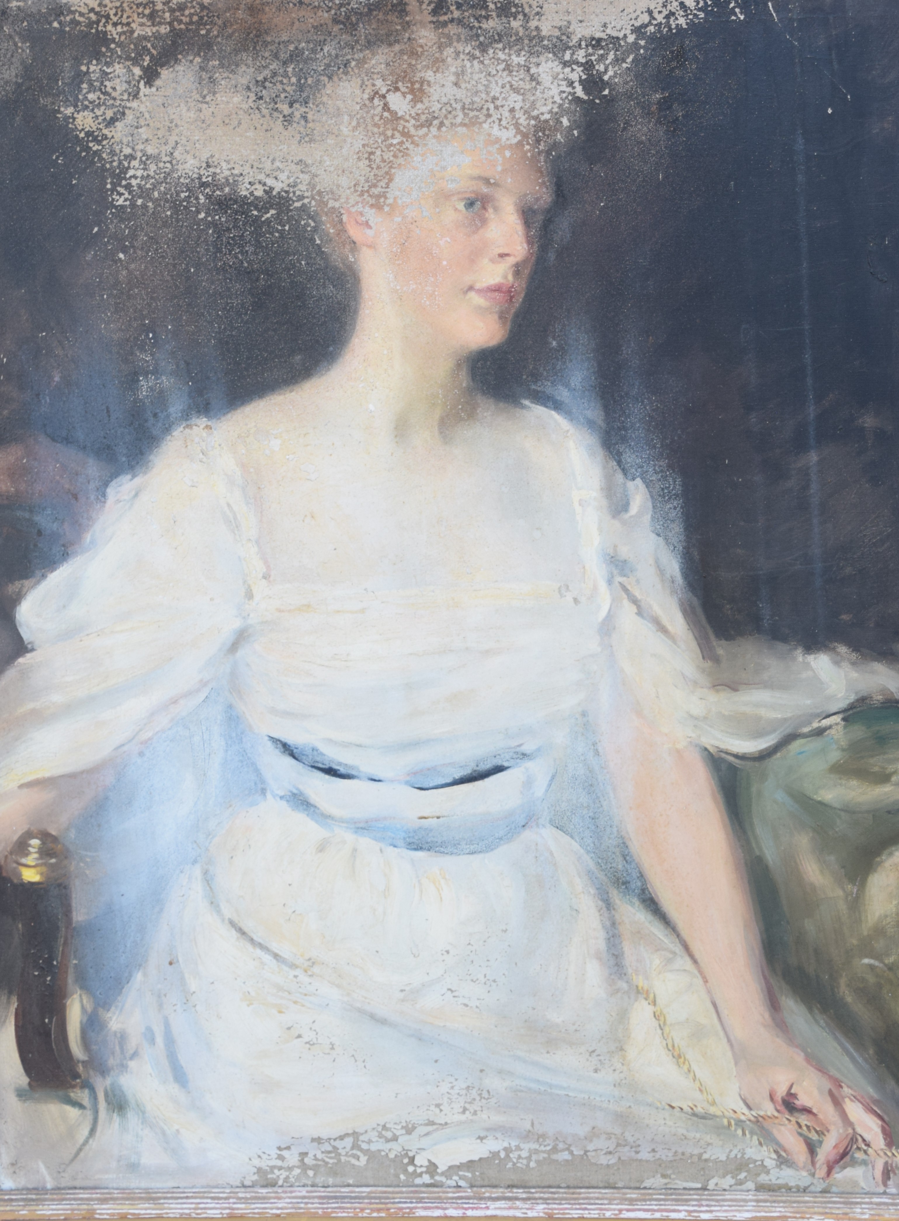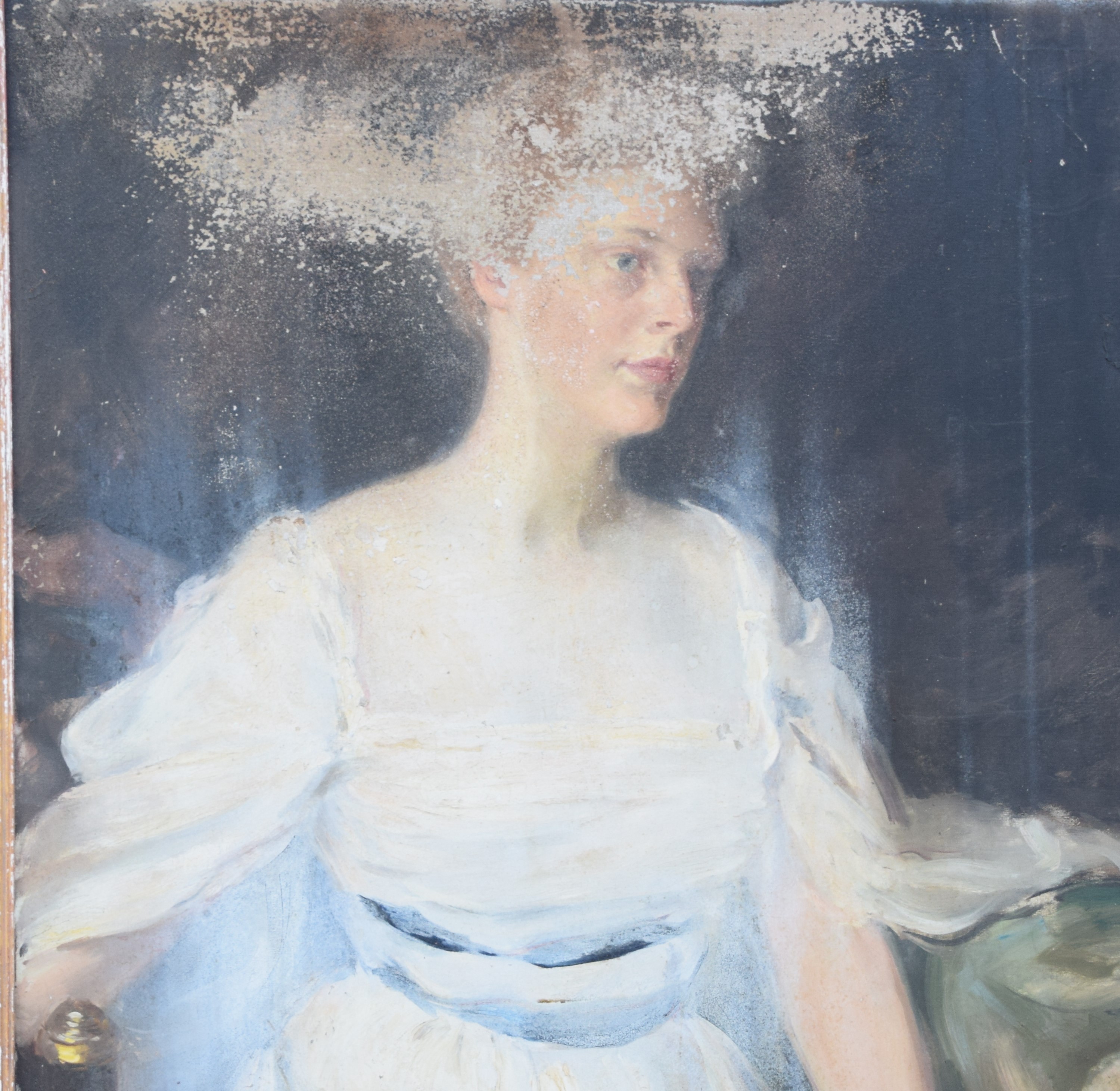 Framed oil on canvas portrait of Anna Scott Fisher ca. 1896-1898, prior to her wedding day by Eliza Cecilia Beaux (1855-1942). This is an investment opportunity as her works can begin at 6 figures. An almost identical portrait is at the Bowdoin College Museum which can be used as a reference (photo attached). This painting is not a copy but a version of the one in Bowdoin College commissioned by the family and likely given to another family member. Cecilia Beaux was an American artist and the first woman to teach art at the Pennsylvania Academy of the Fine Arts. Known for her elegant and sensitive portraits of friends, relatives, and Gilded Age patrons, Beaux painted many famous subjects including First Lady Edith Roosevelt, Admiral Sir David Beatty and Georges Clemenceau. Dimensions: 40″ x 32″ Image Size