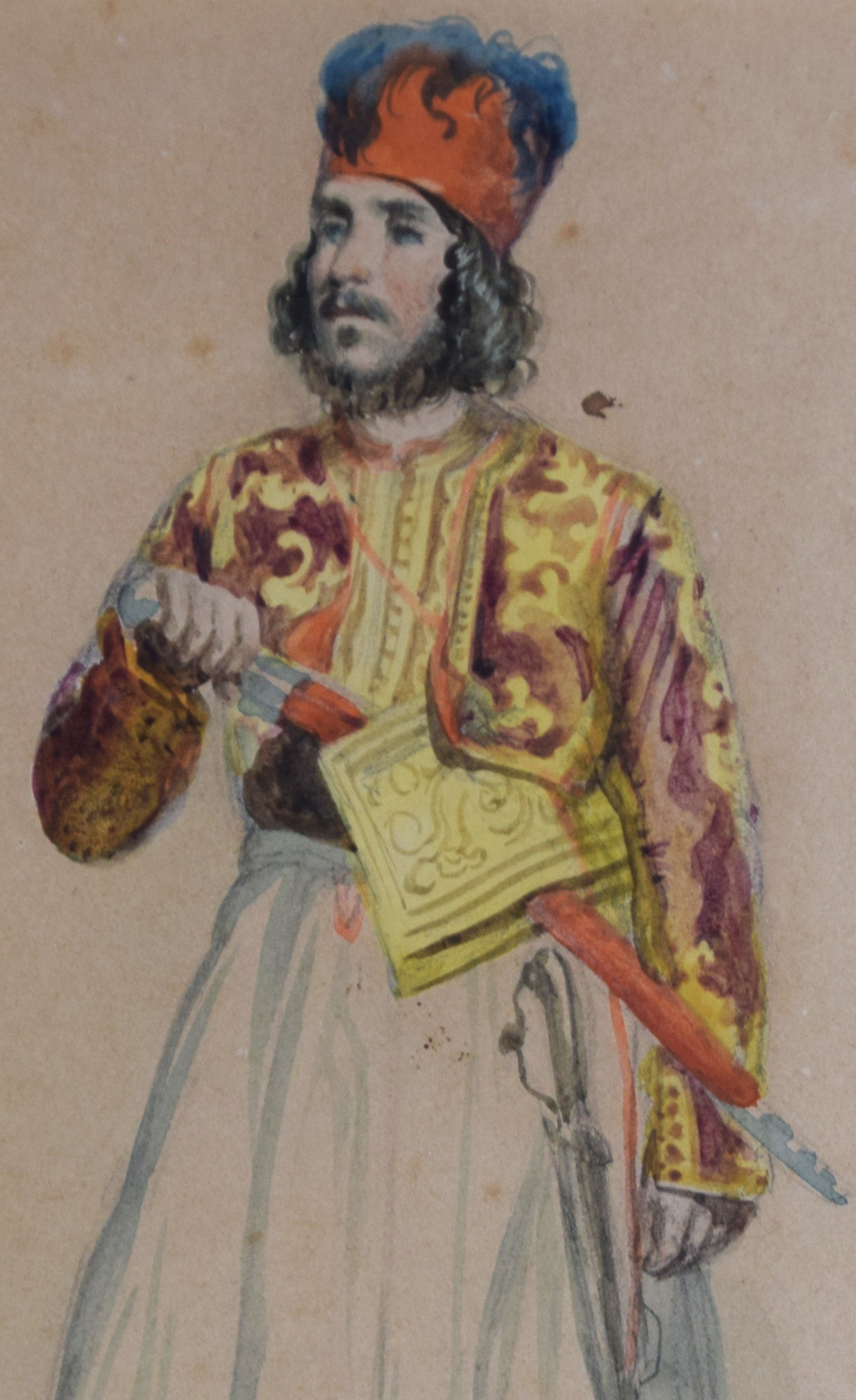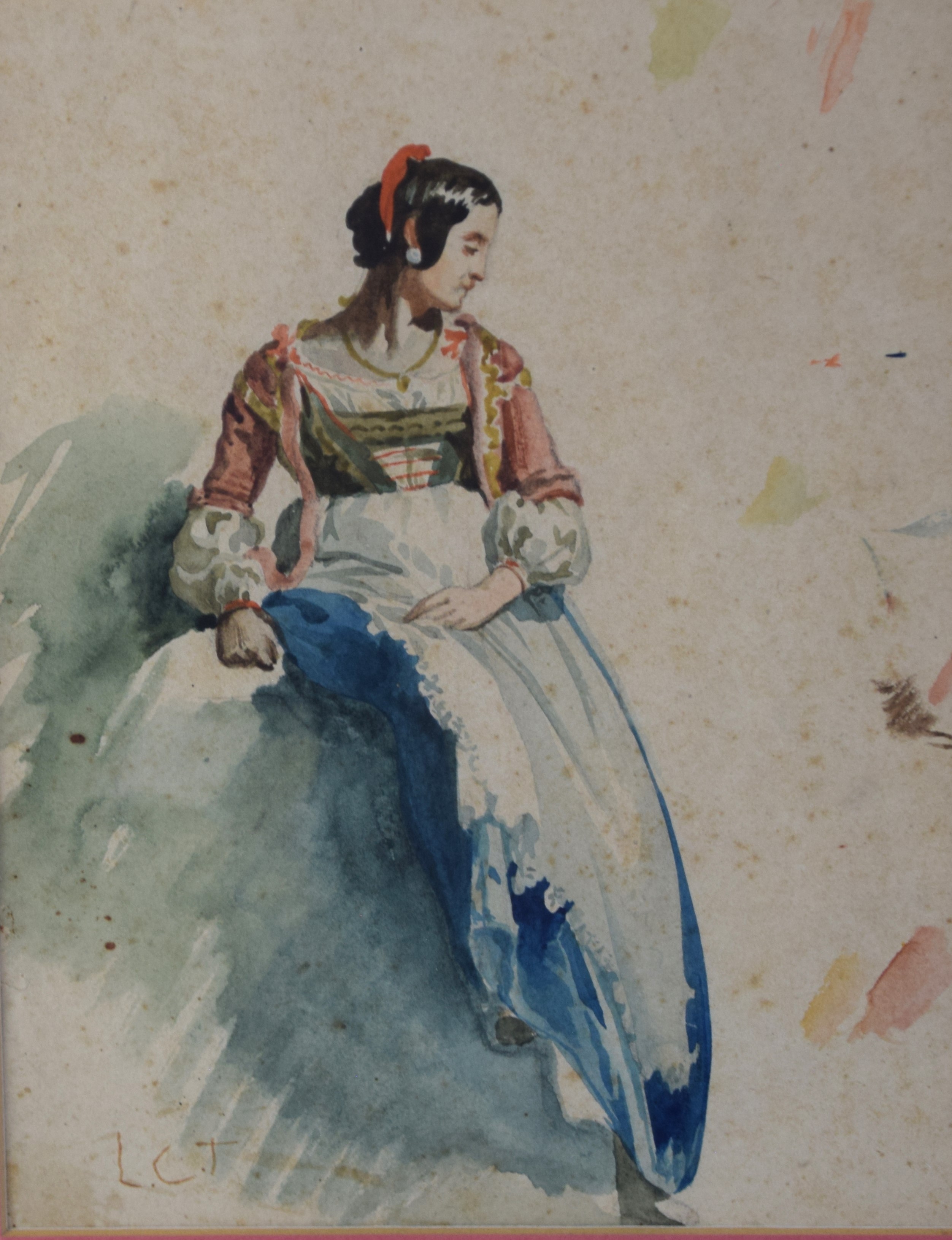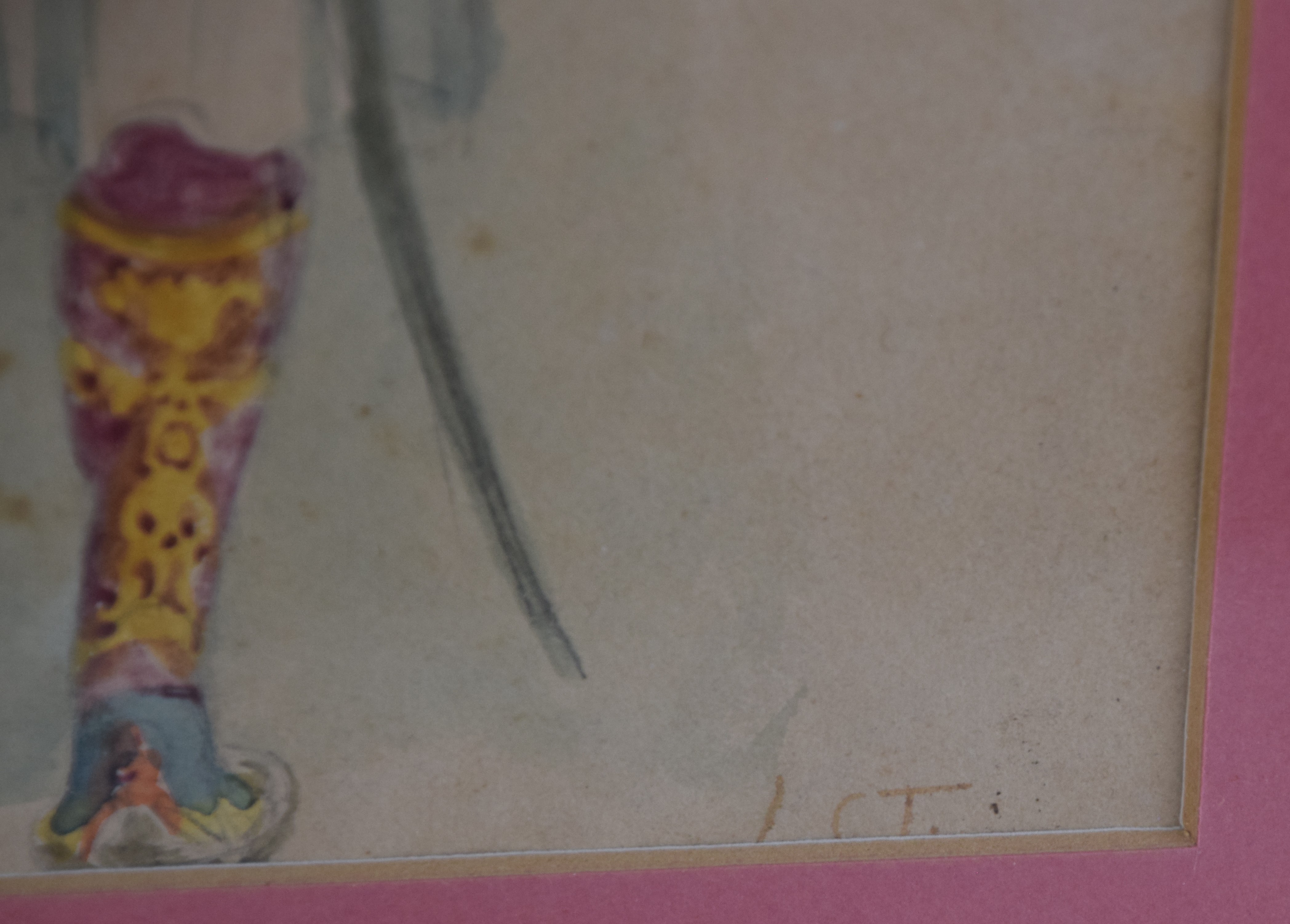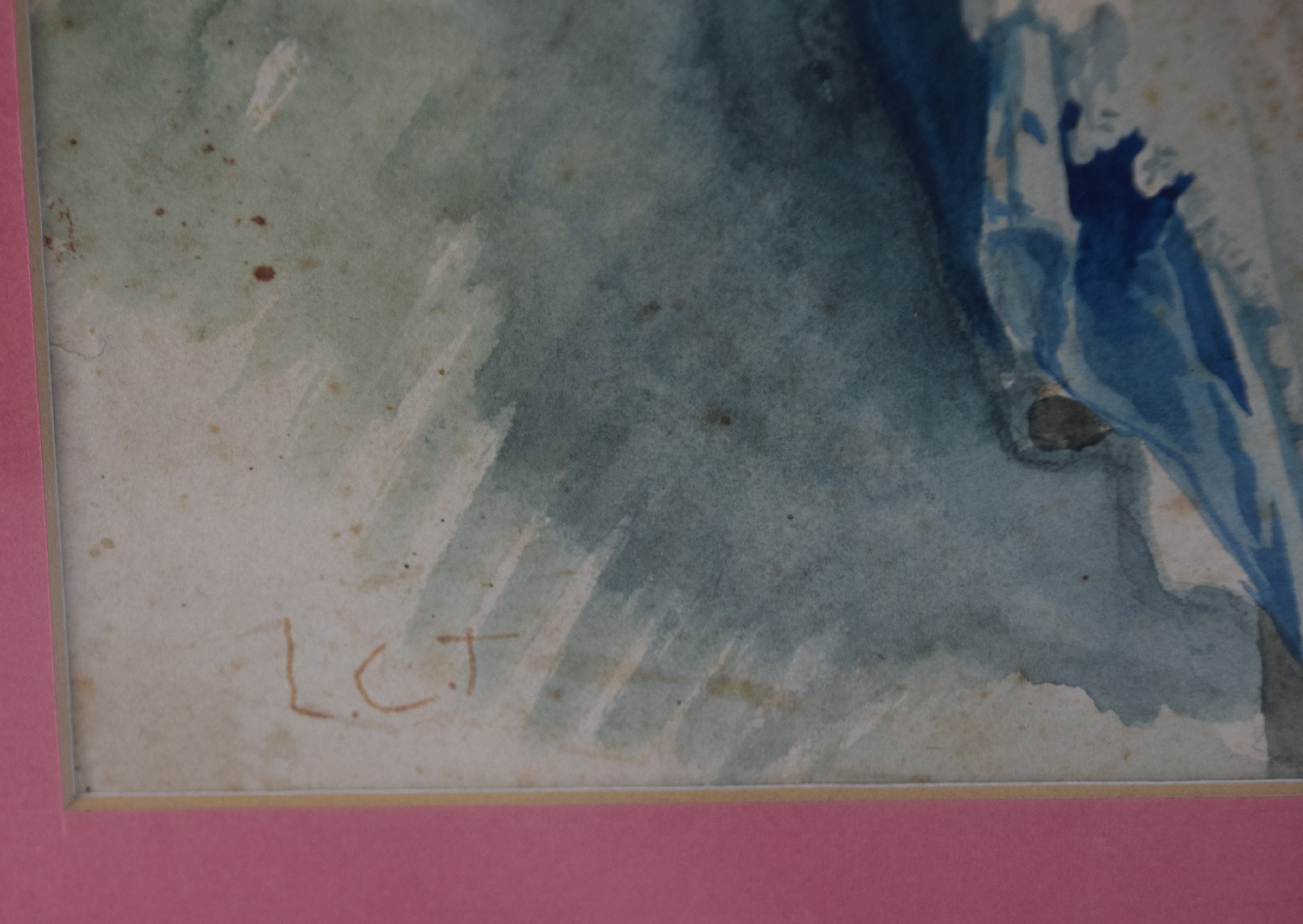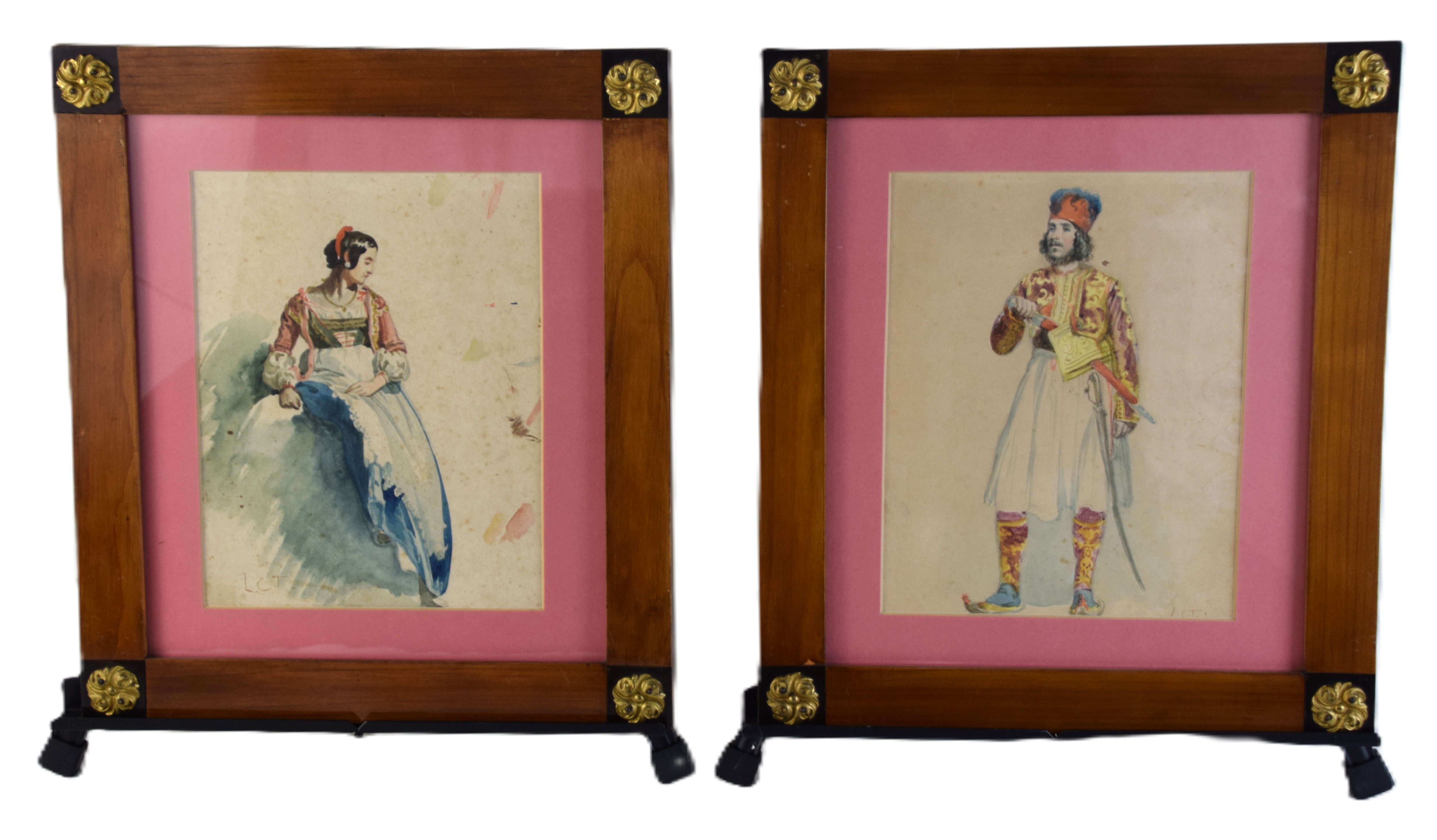 A pair of Louis Comfort Tiffany watercolors, a Middle Eastern warrior with two swords and one of a lady seated. Both signed L.C.T. and both in very good mahogany frames with brass corner rosettes. Provenance: James Julia Auctions. Dimensions: 10″ 11.5″ Image size