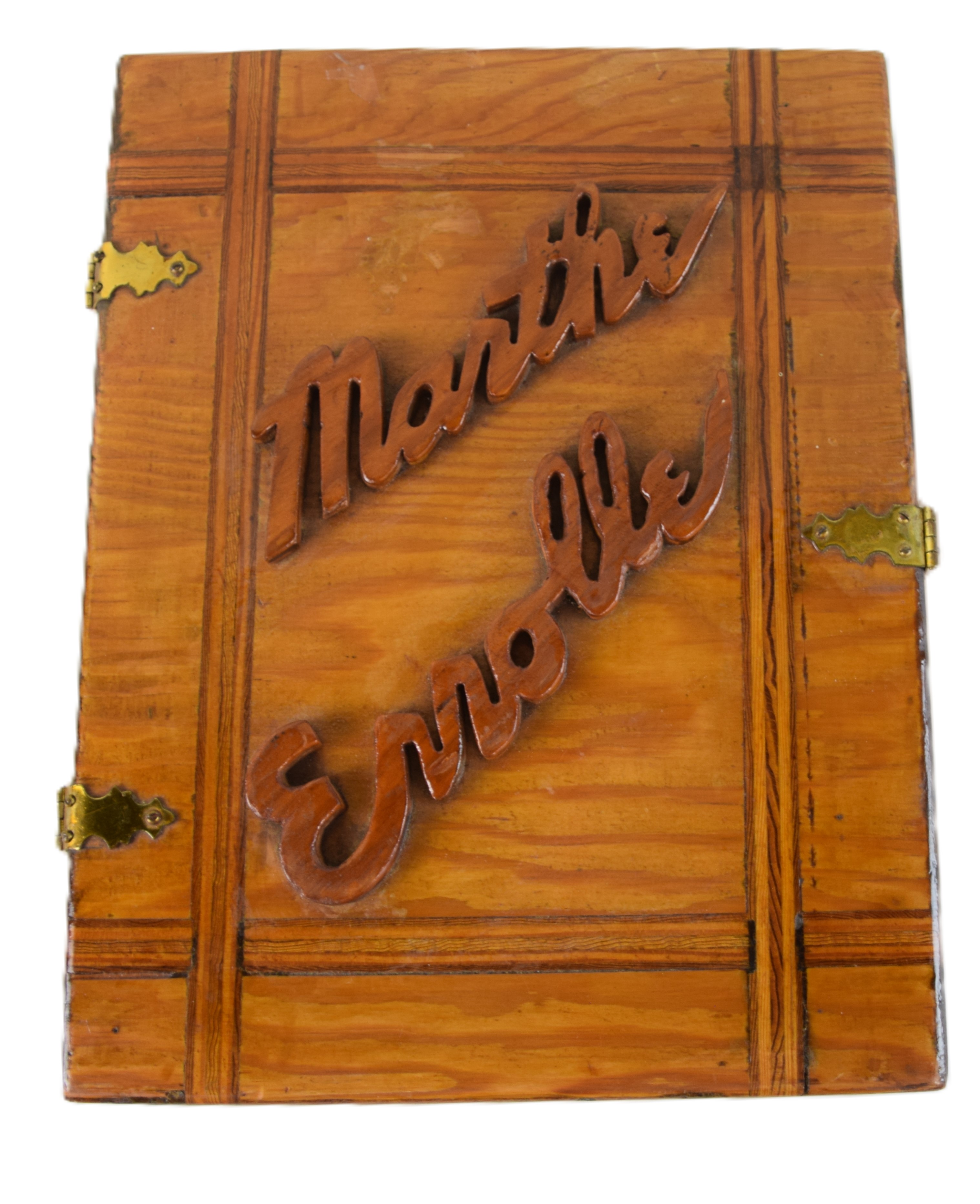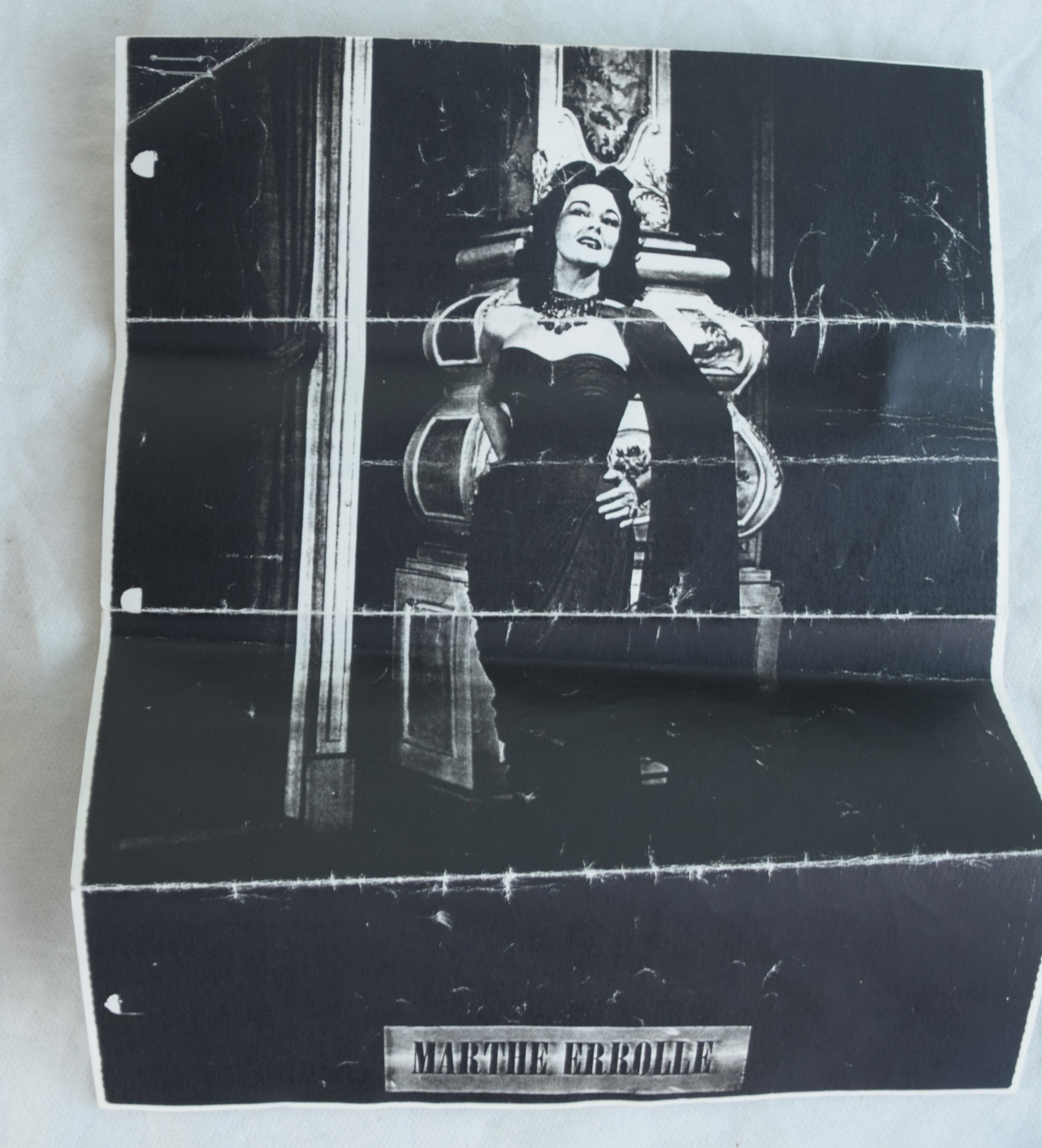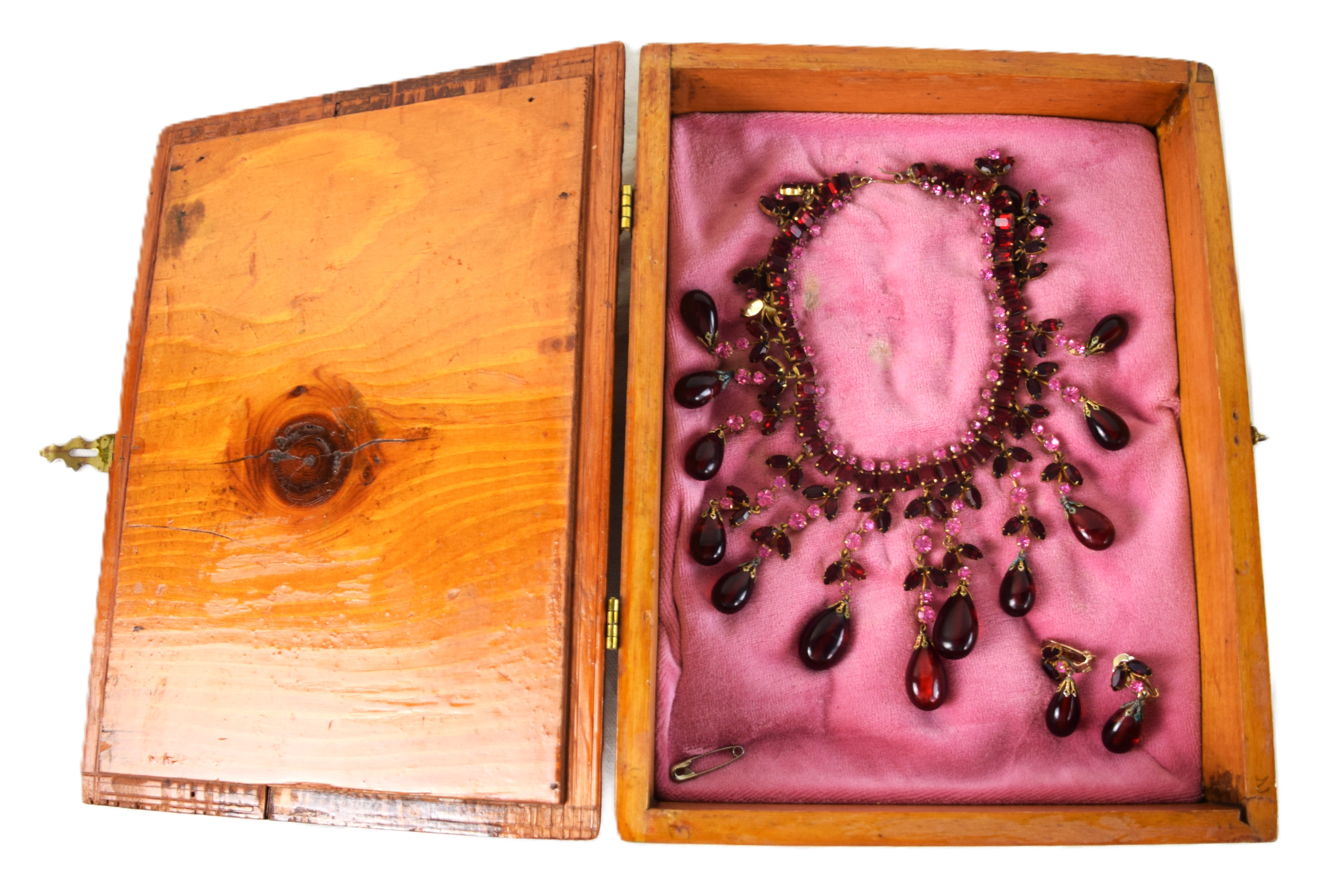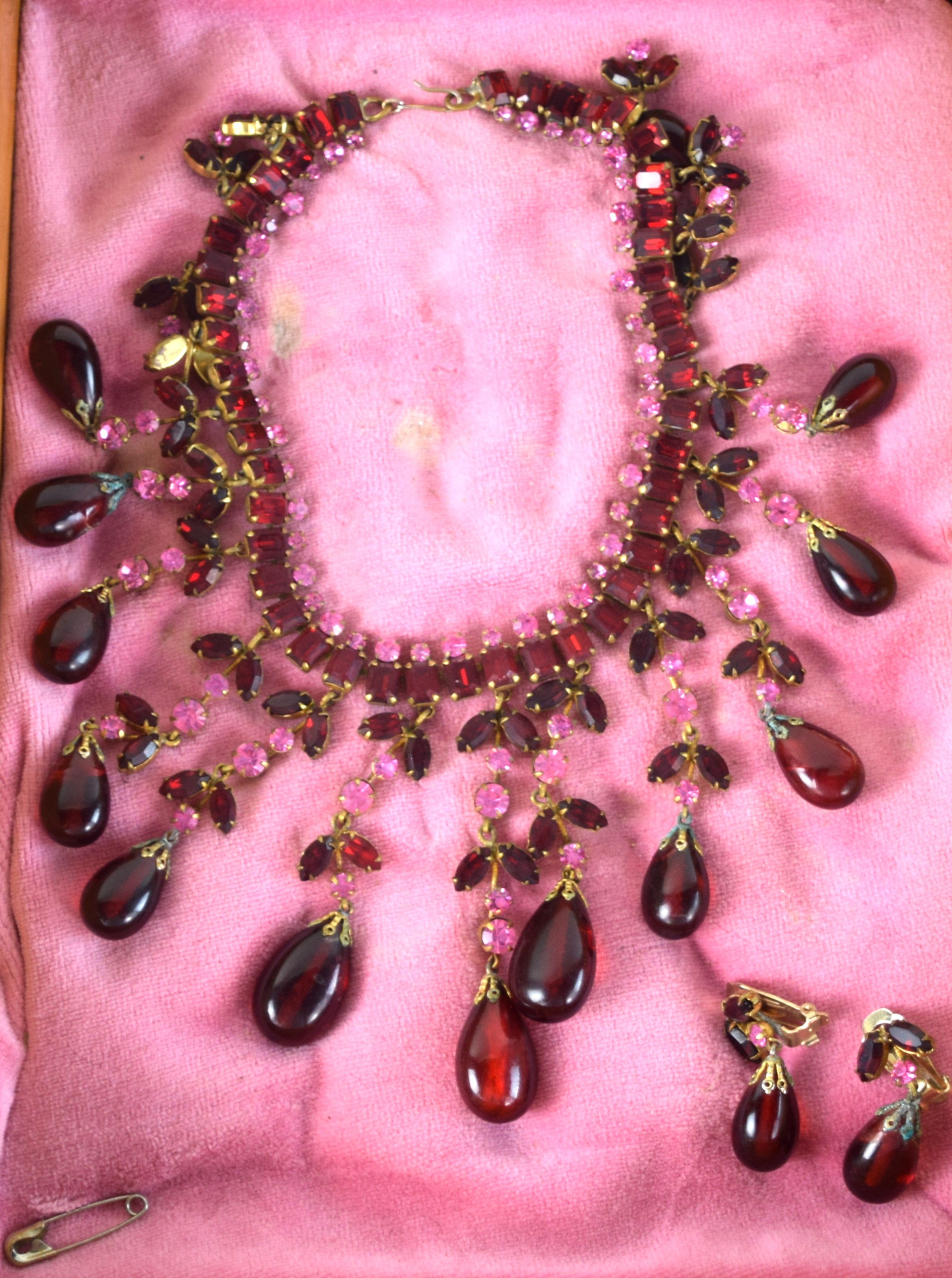 Necklace and earrings worn by actress Marthe Errolle In “The Sound Of Music”, an elegant design of Rubby Red glass. Necklace is stored in a custom wooden box with the actress name carved on top. The necklace was designed by Scaasi. Arnold Scaasi, was a Canadian fashion designer who created gowns and jewelry for First Ladies and actresses. Marthe Errolle, a Diva, performed in a number of films and Broadway to include “The Sound Of Music”, the queen in “Snow White and the Seven Dwarfs”, “Mame”, “Kismet” and “The Boyfriend”. Provenance includes a photos of the actress wearing the necklace and a letter signed by the actress to the consignor. Box Dimensions: 11″ x 8.5″ x 3.5″