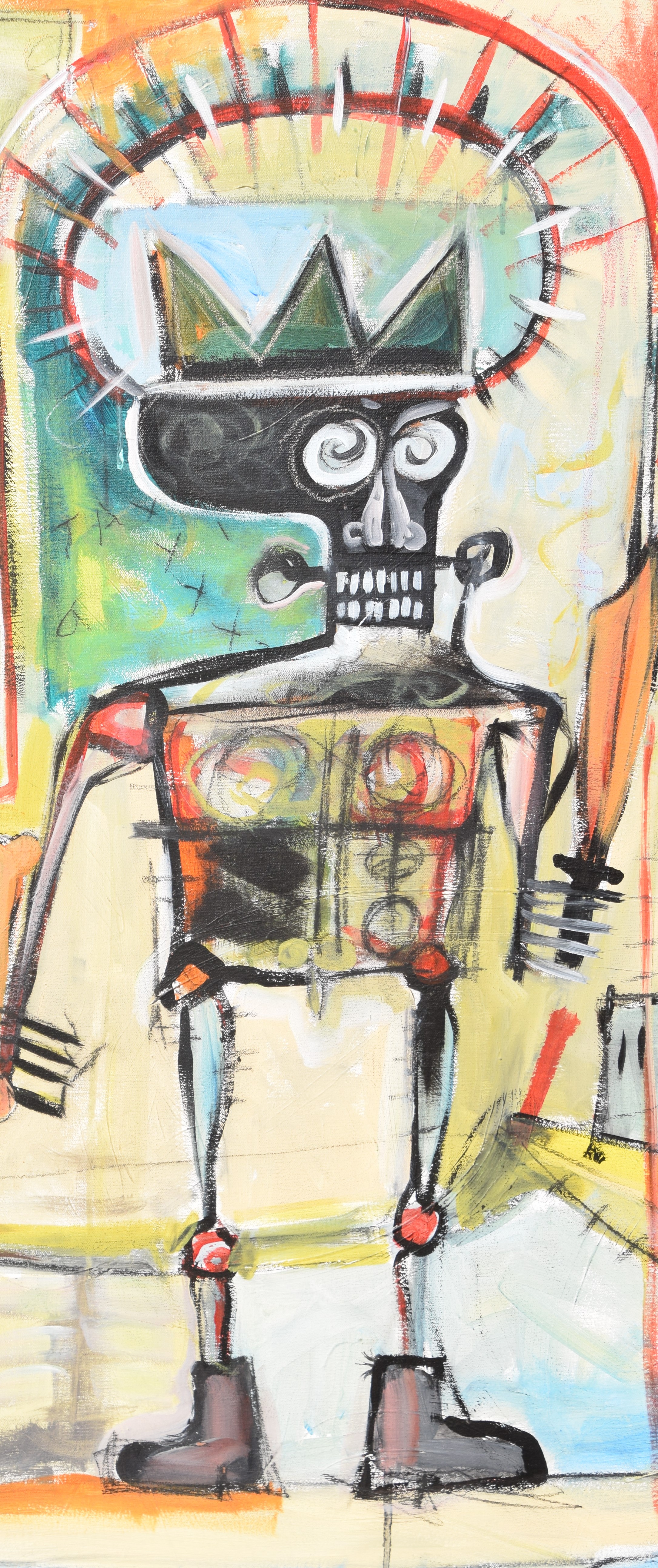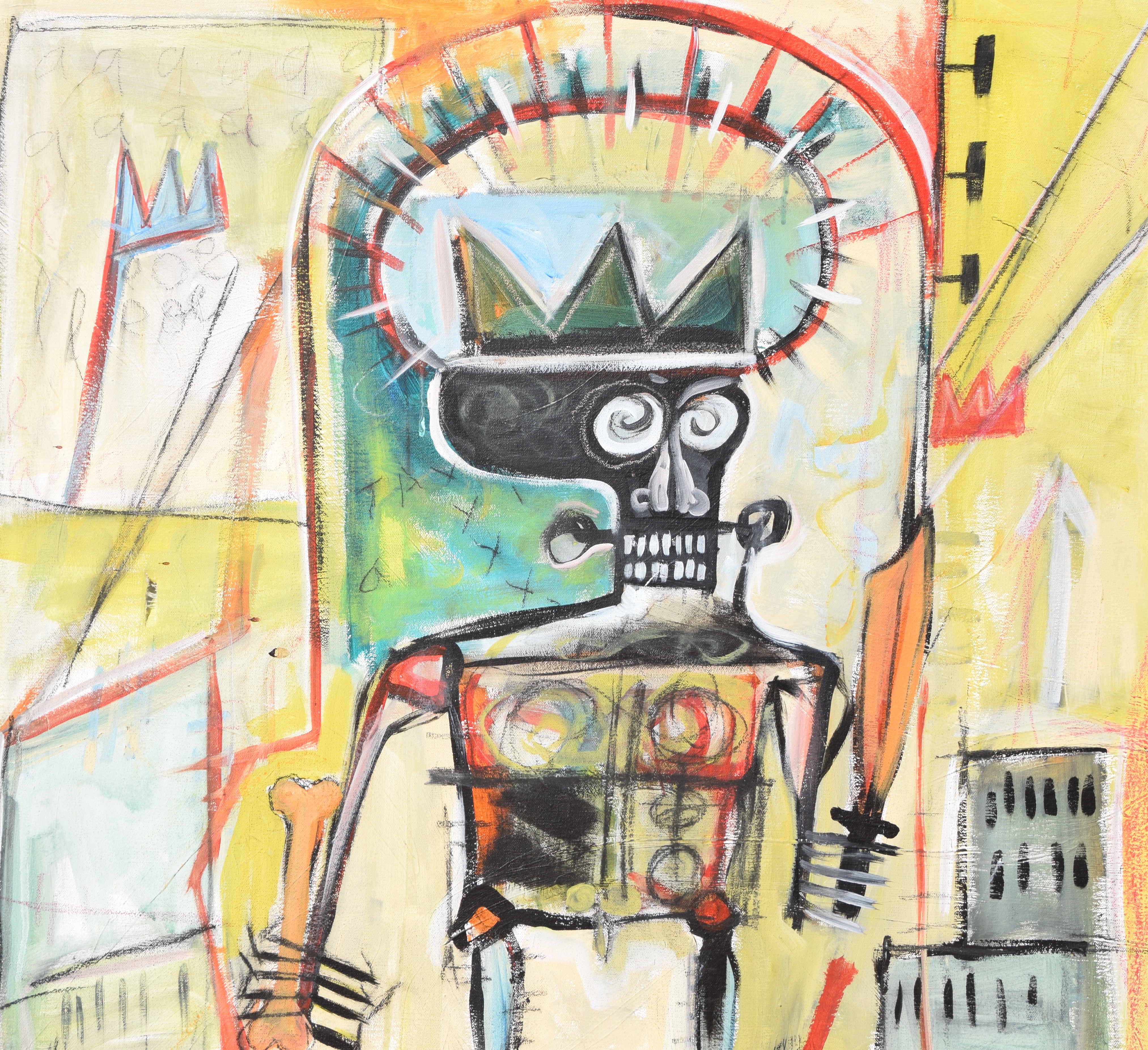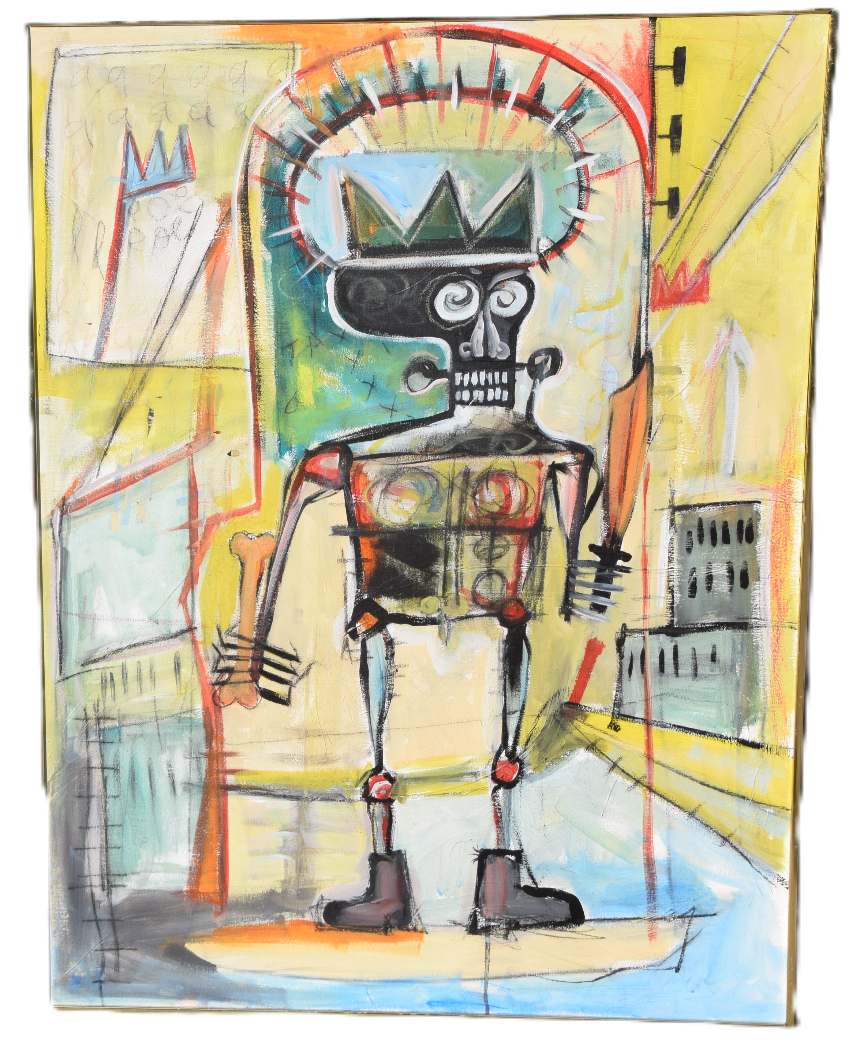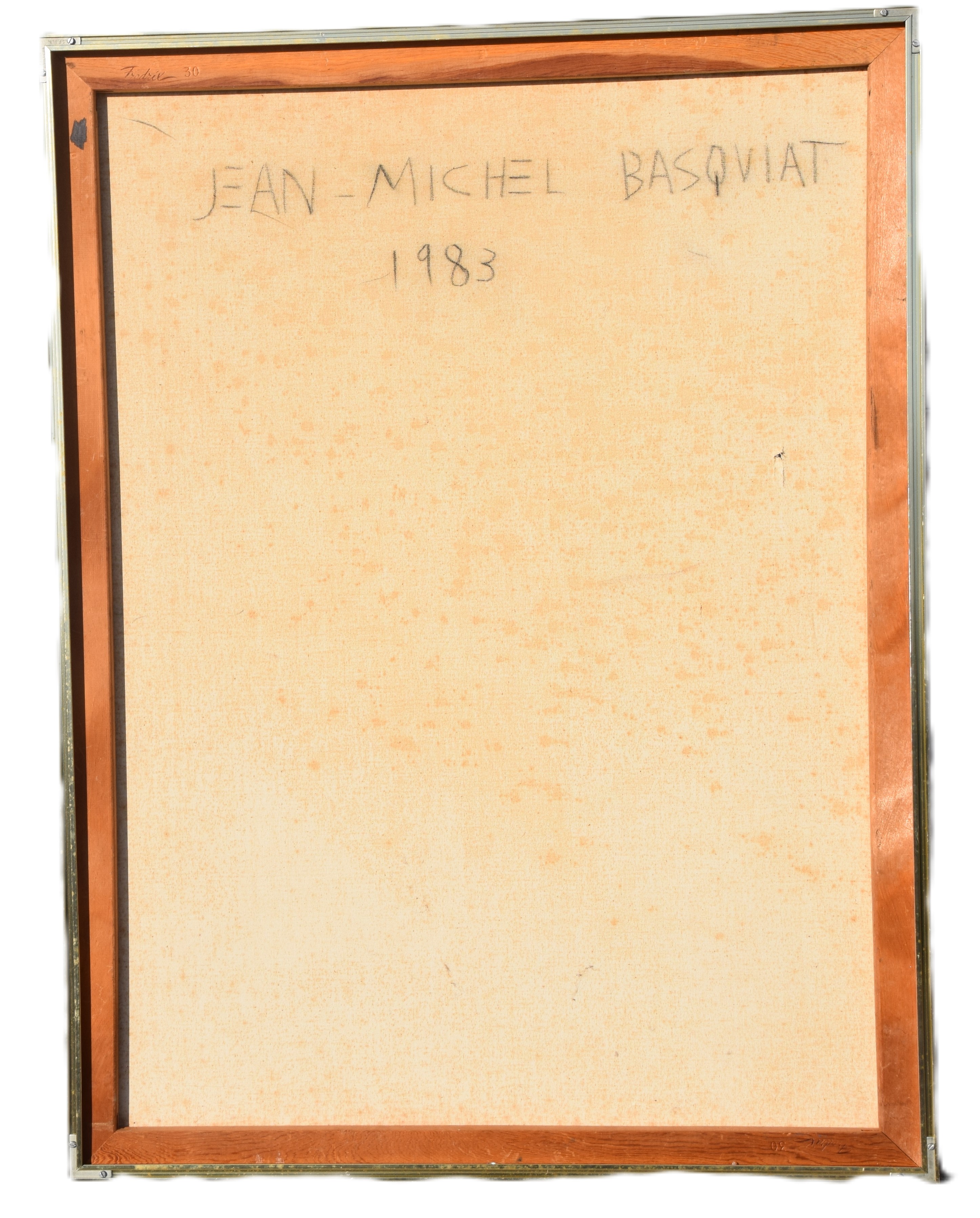 A Basquiat attributed pop art painting, oil on canvas with typical graffiti figure, labeled on back. Jean-Michel Basquiat (1960 – 1988) worked in New York and is known for graffiti street paintings under the name pseudonym ‘SAMO’. Provenance: From the collection of Todd Wagner of Tampa, Florida. Dimensions: 40″ 30″