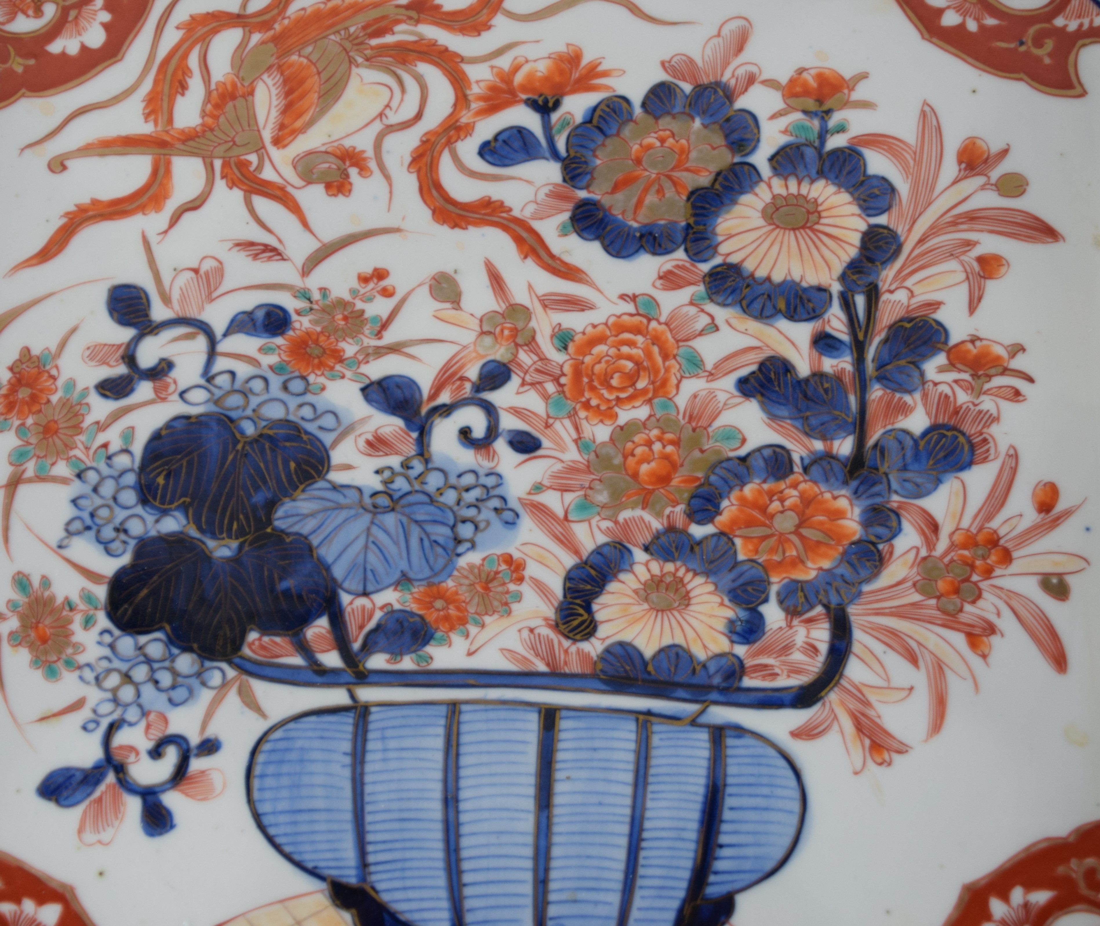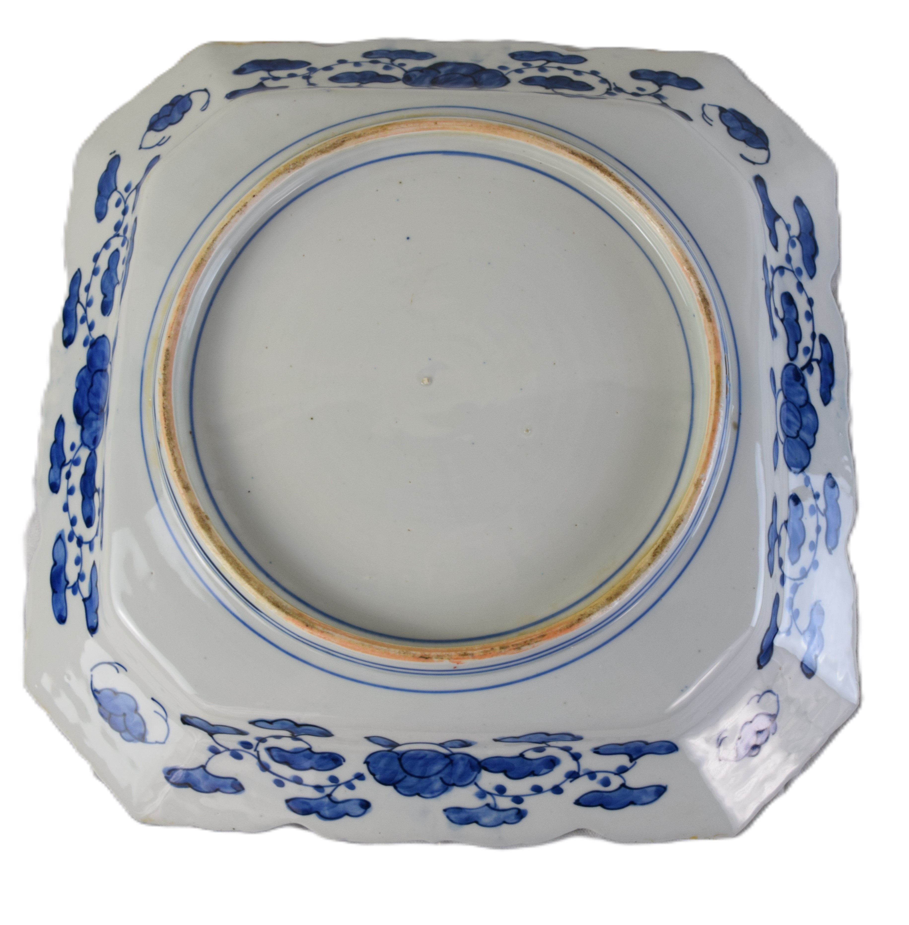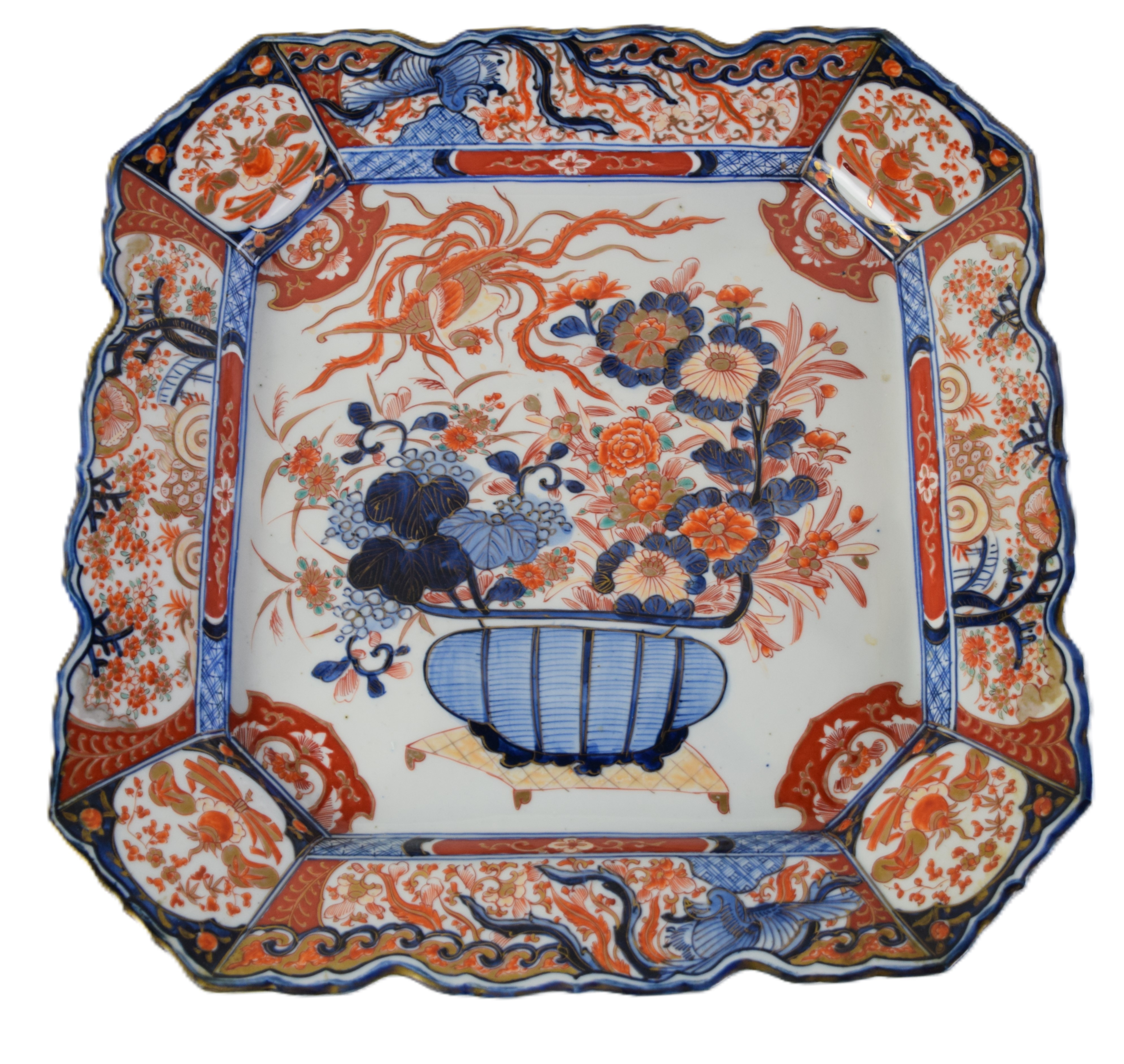 Large Imari rectangular charger with floral and other decorations with scalloped rim. Dimensions: 16″ Square