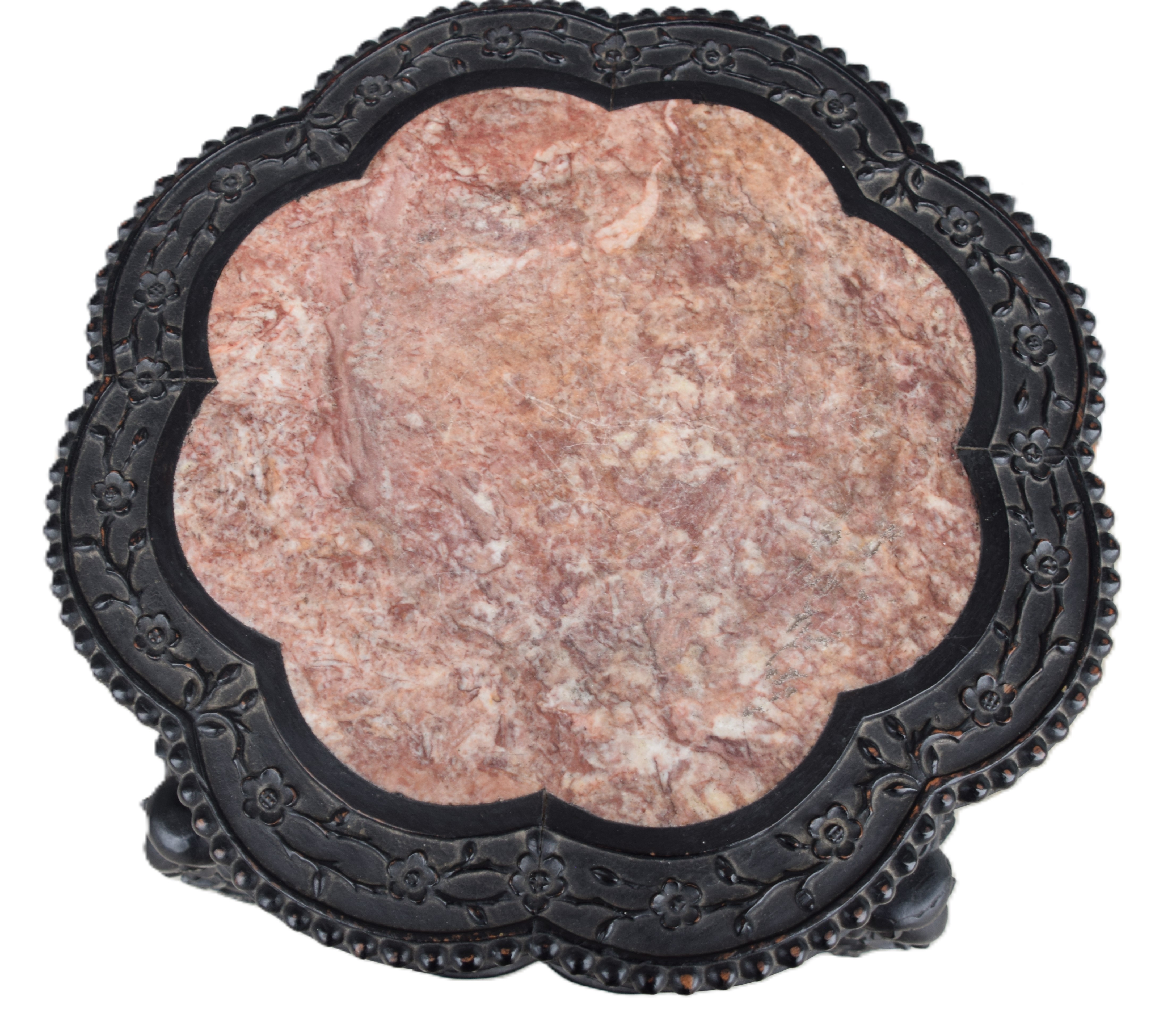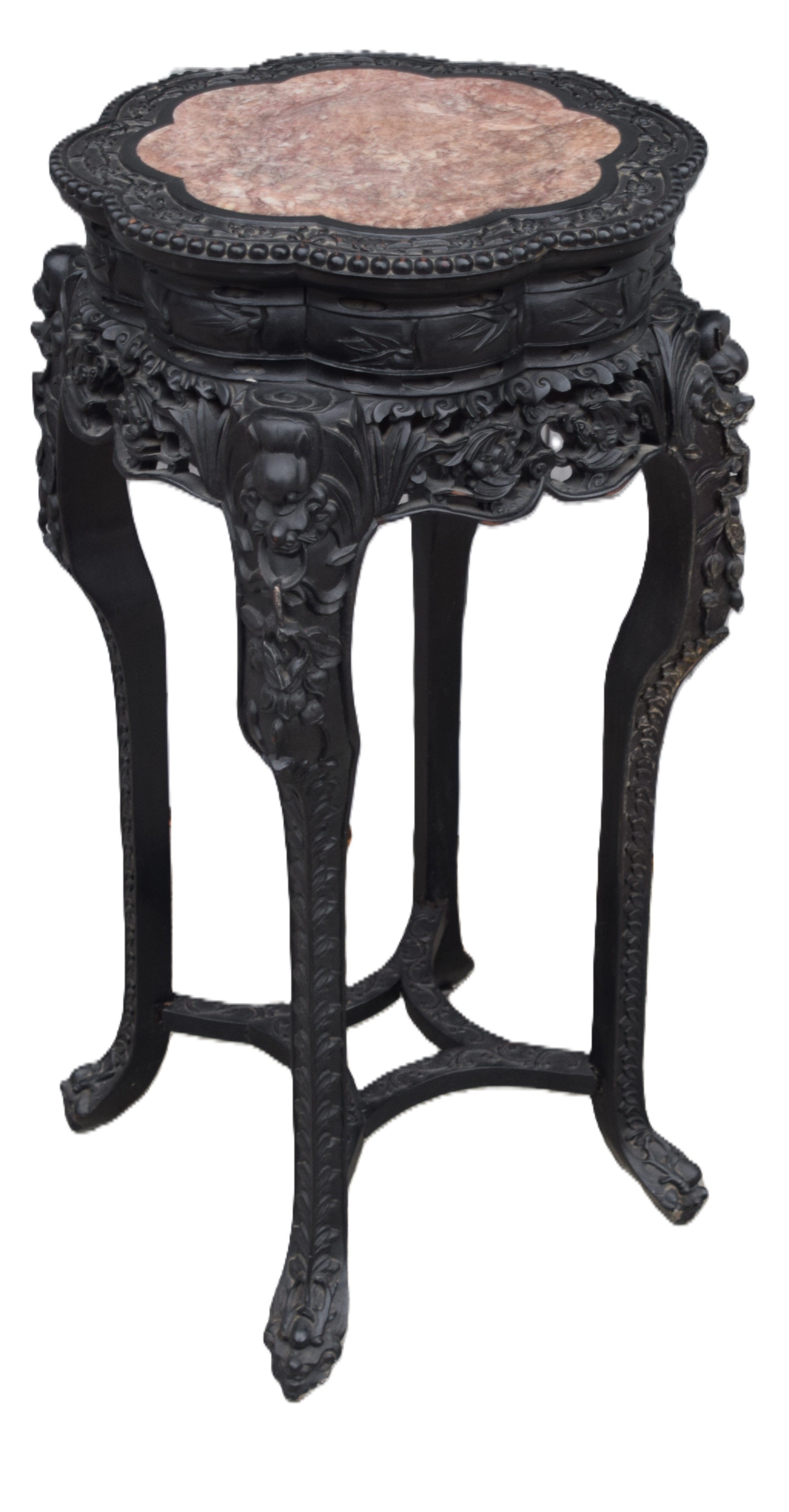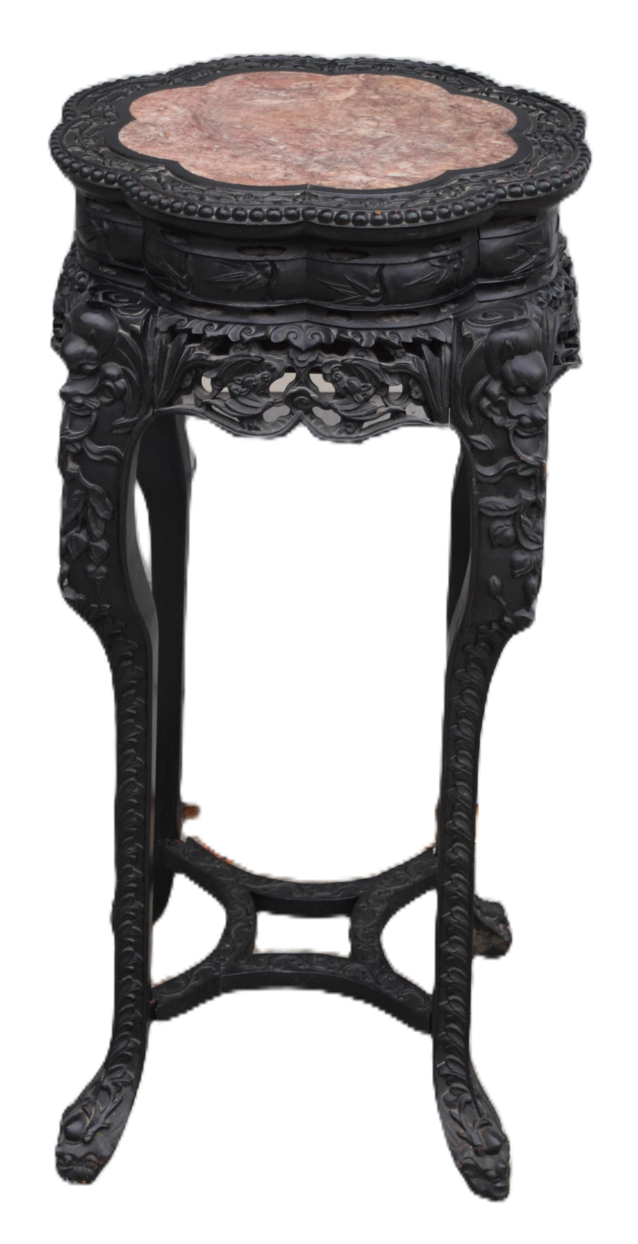 Fine intricately carved tabouret stand with inserted marble top and highly carved legs and skirt. Dimensions: 36″ H.