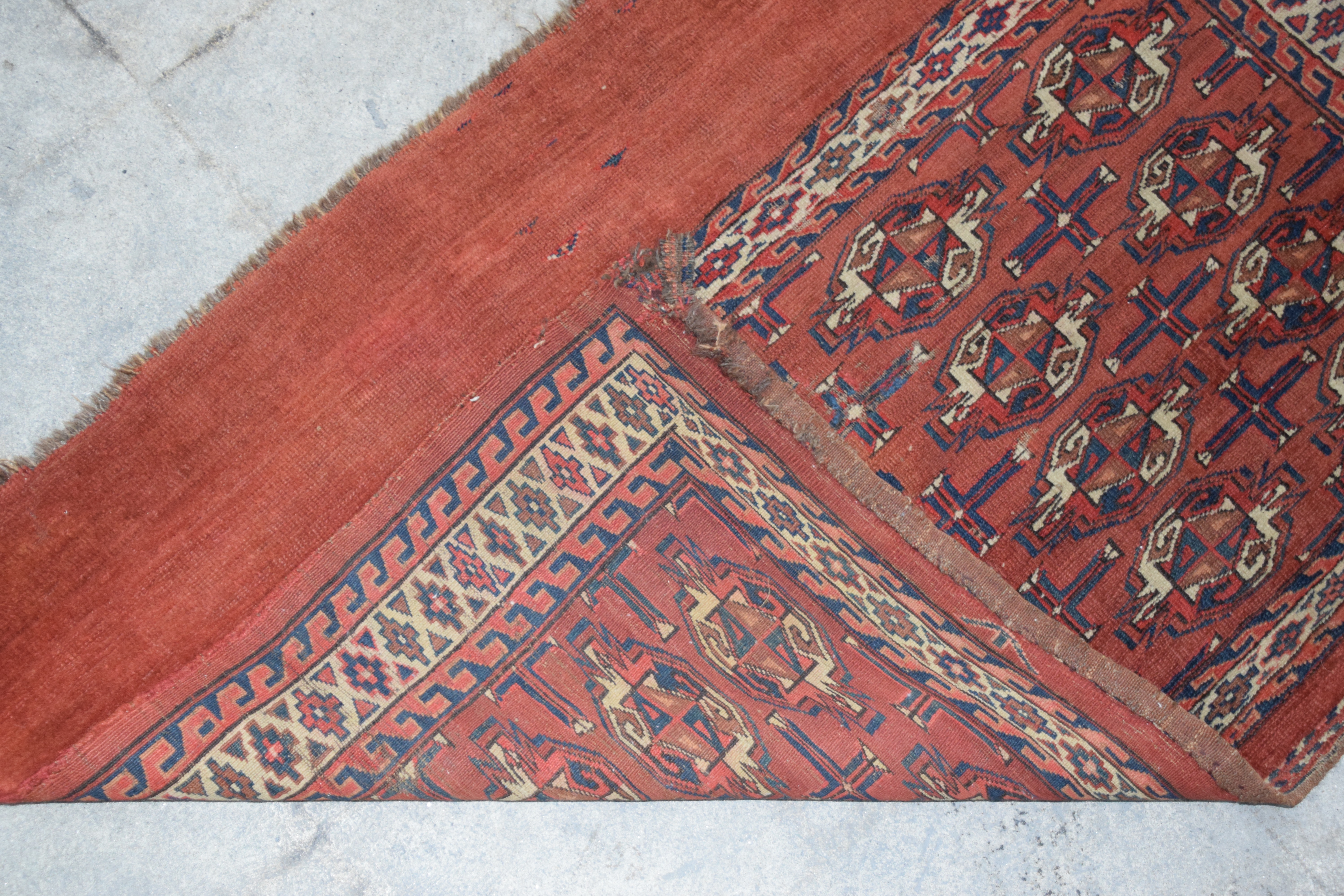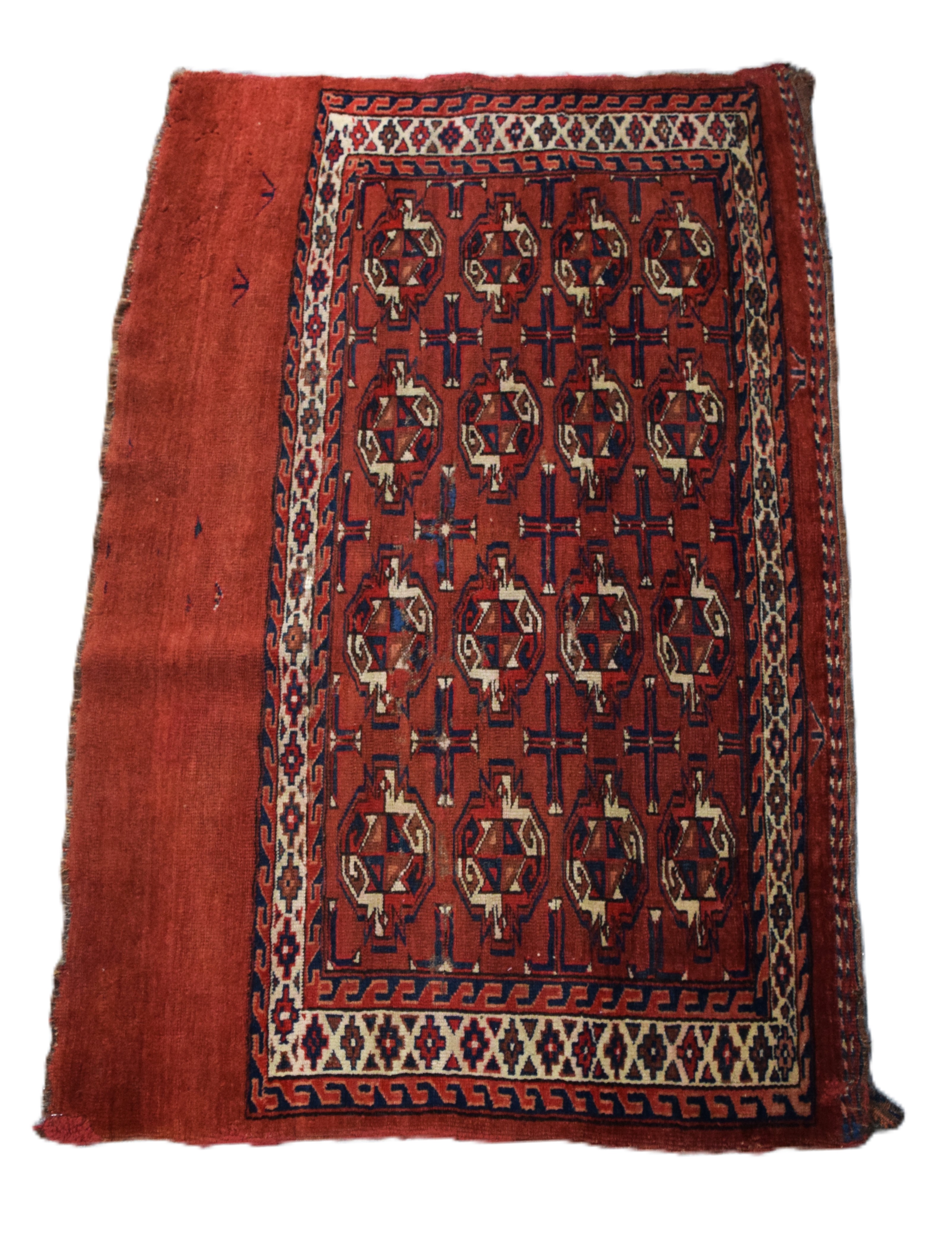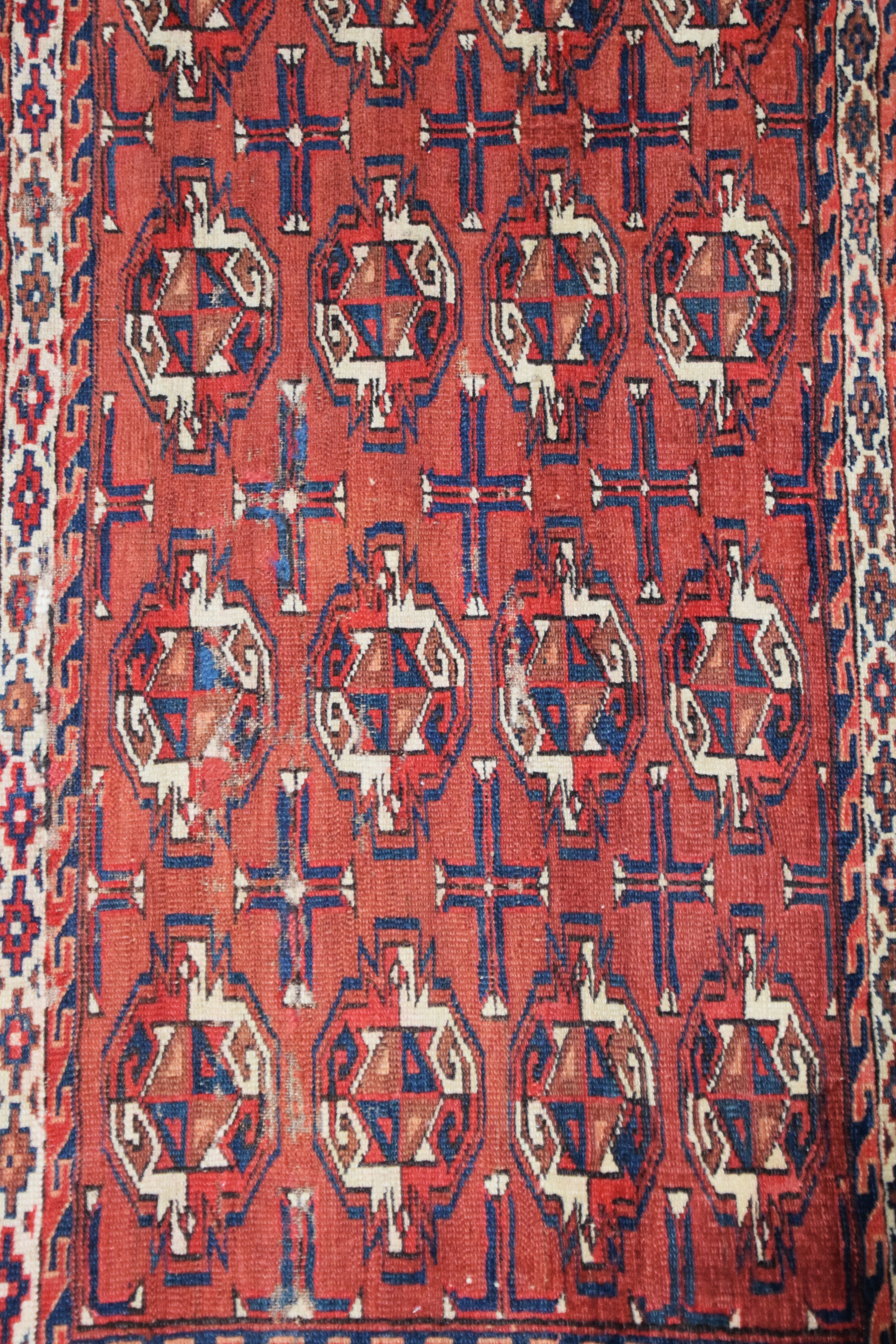 Oriental bag face rug with predominant red field with multiple designs. Dimensions: 2’5″ x 3′ 8″