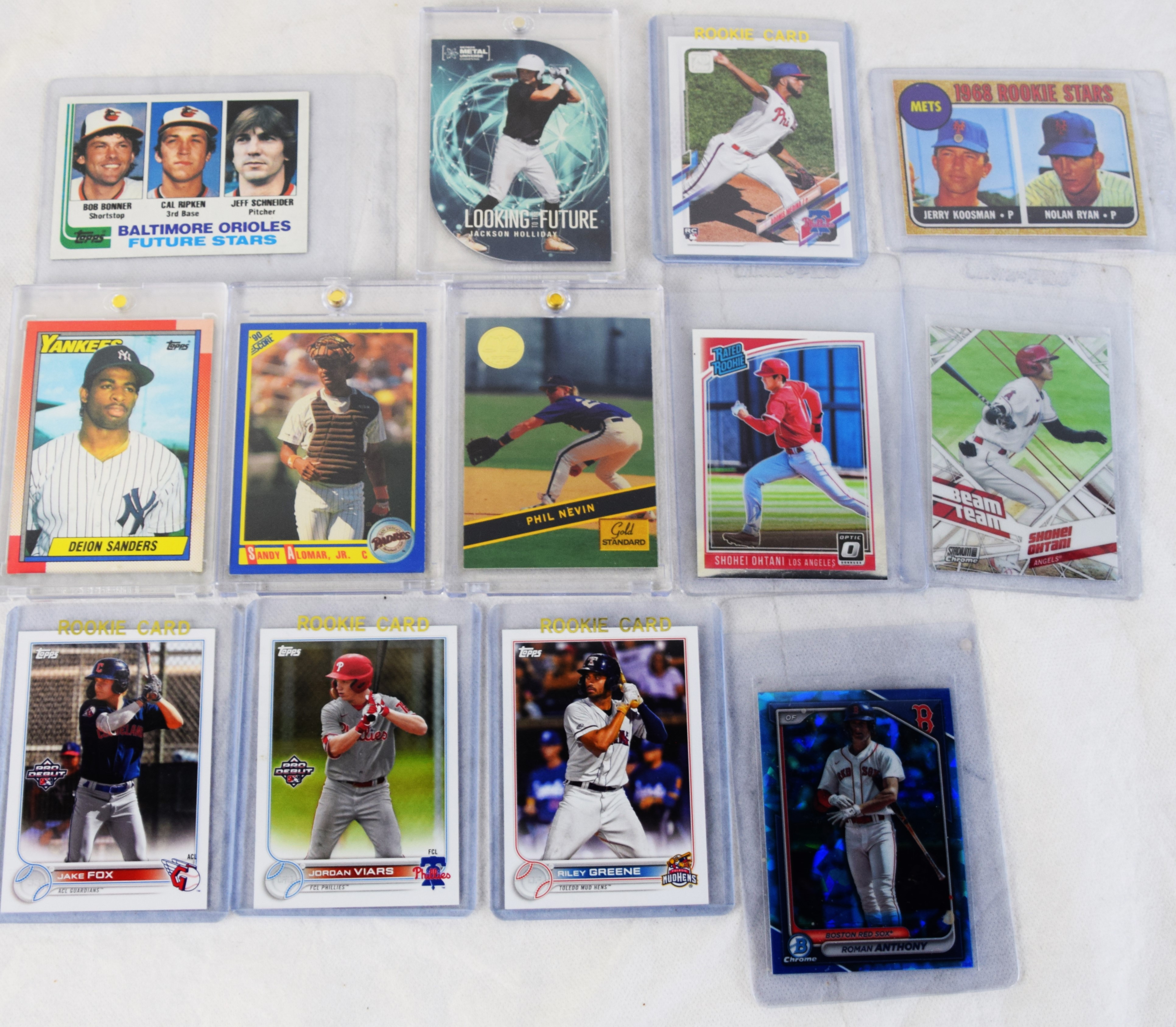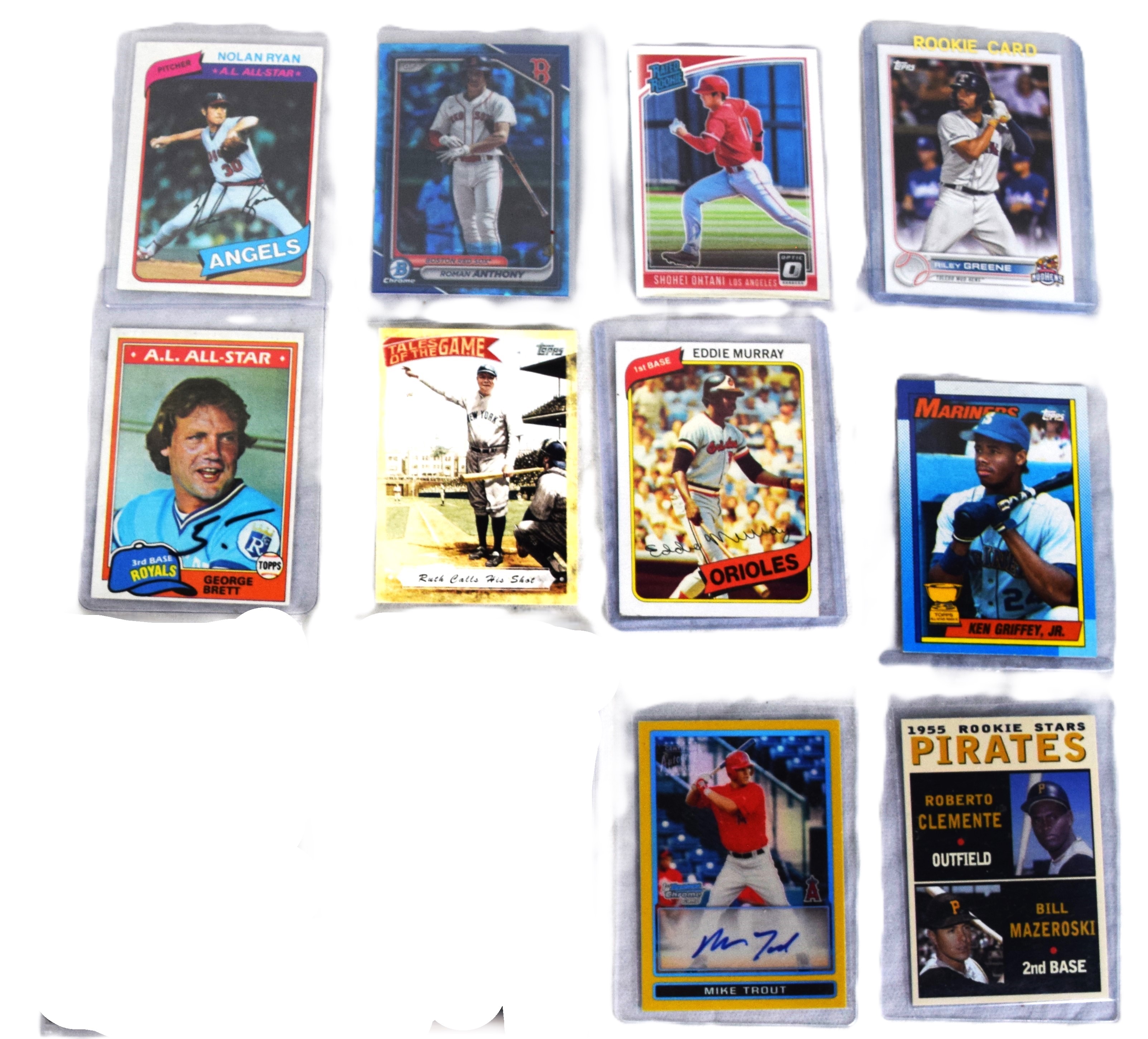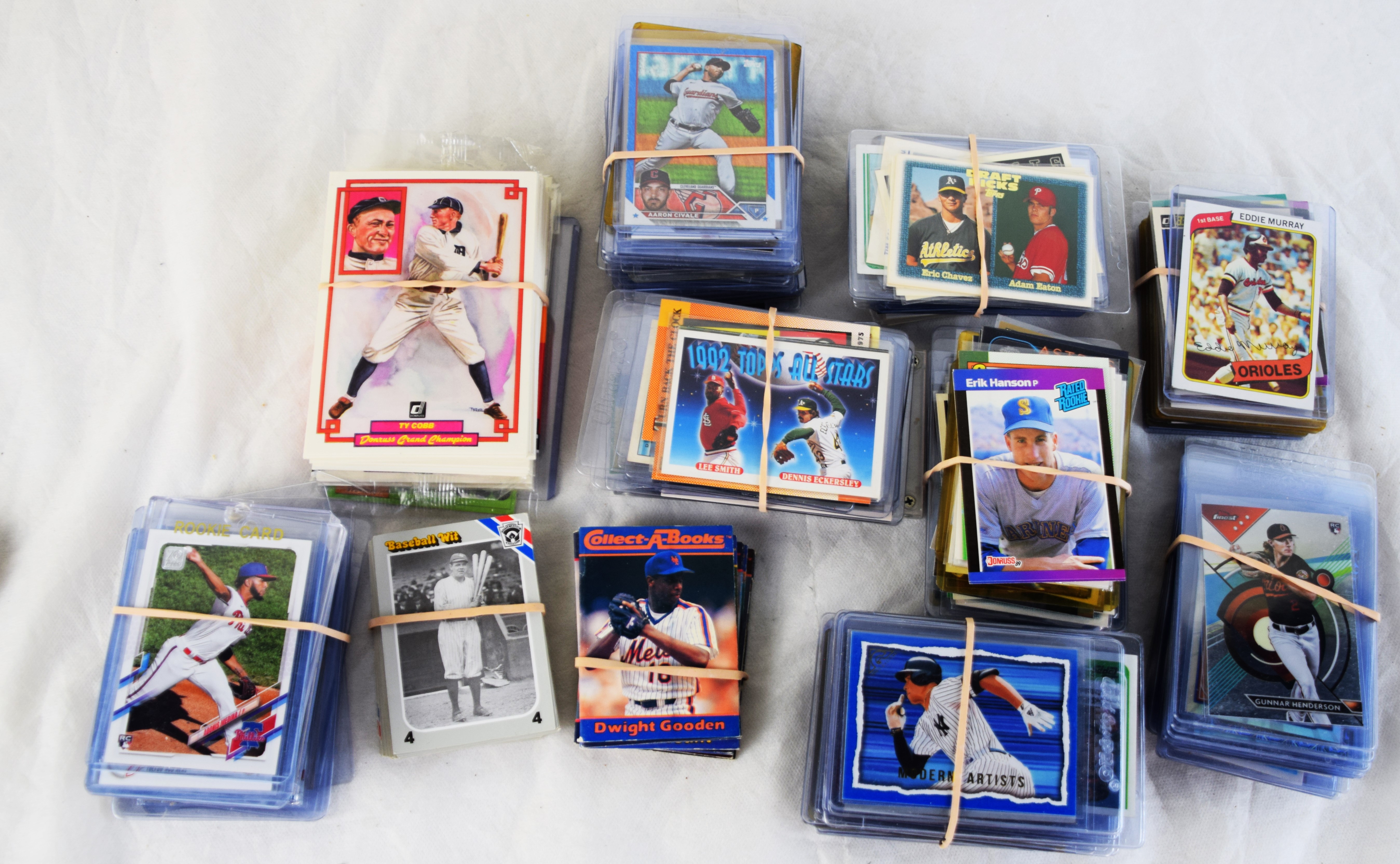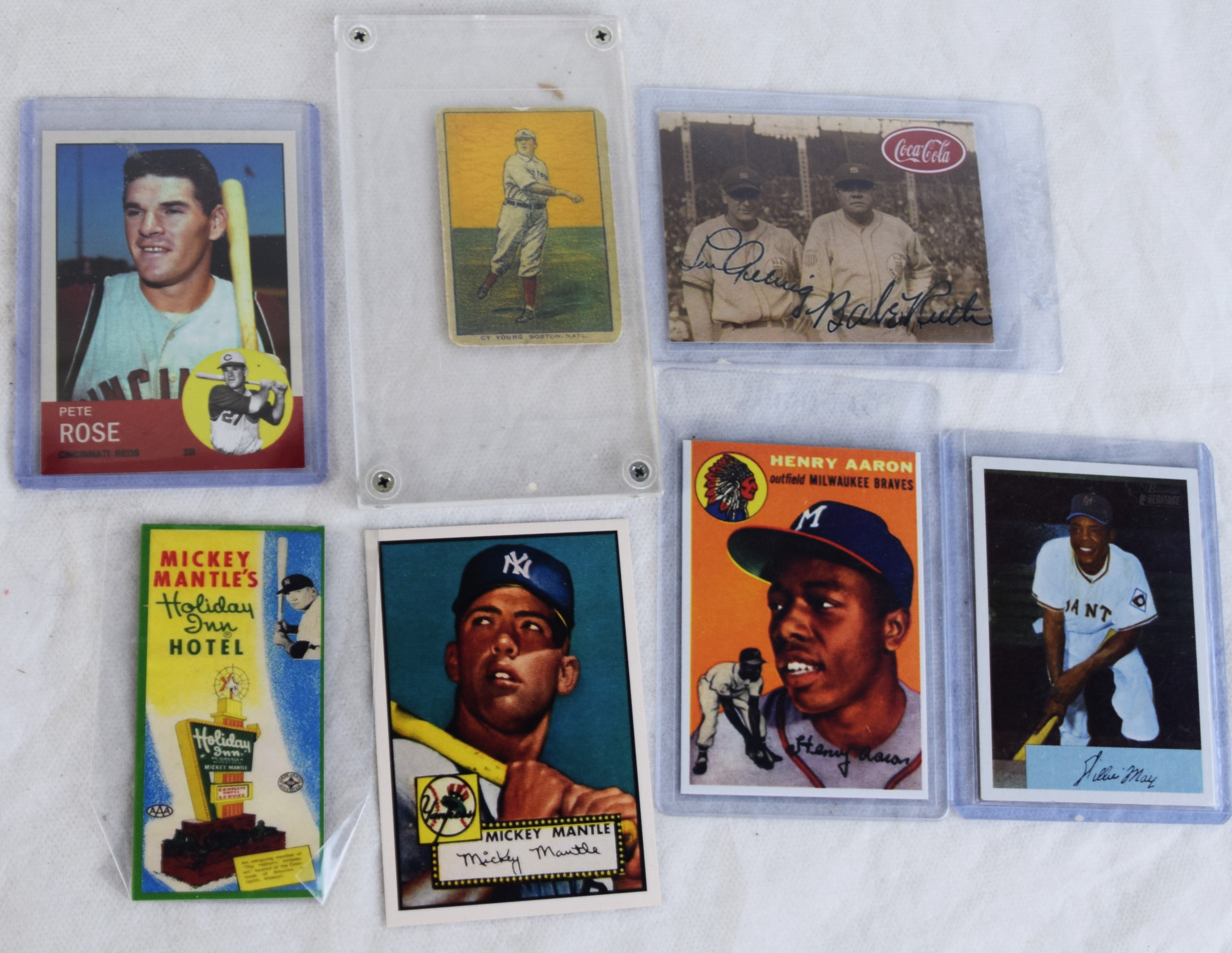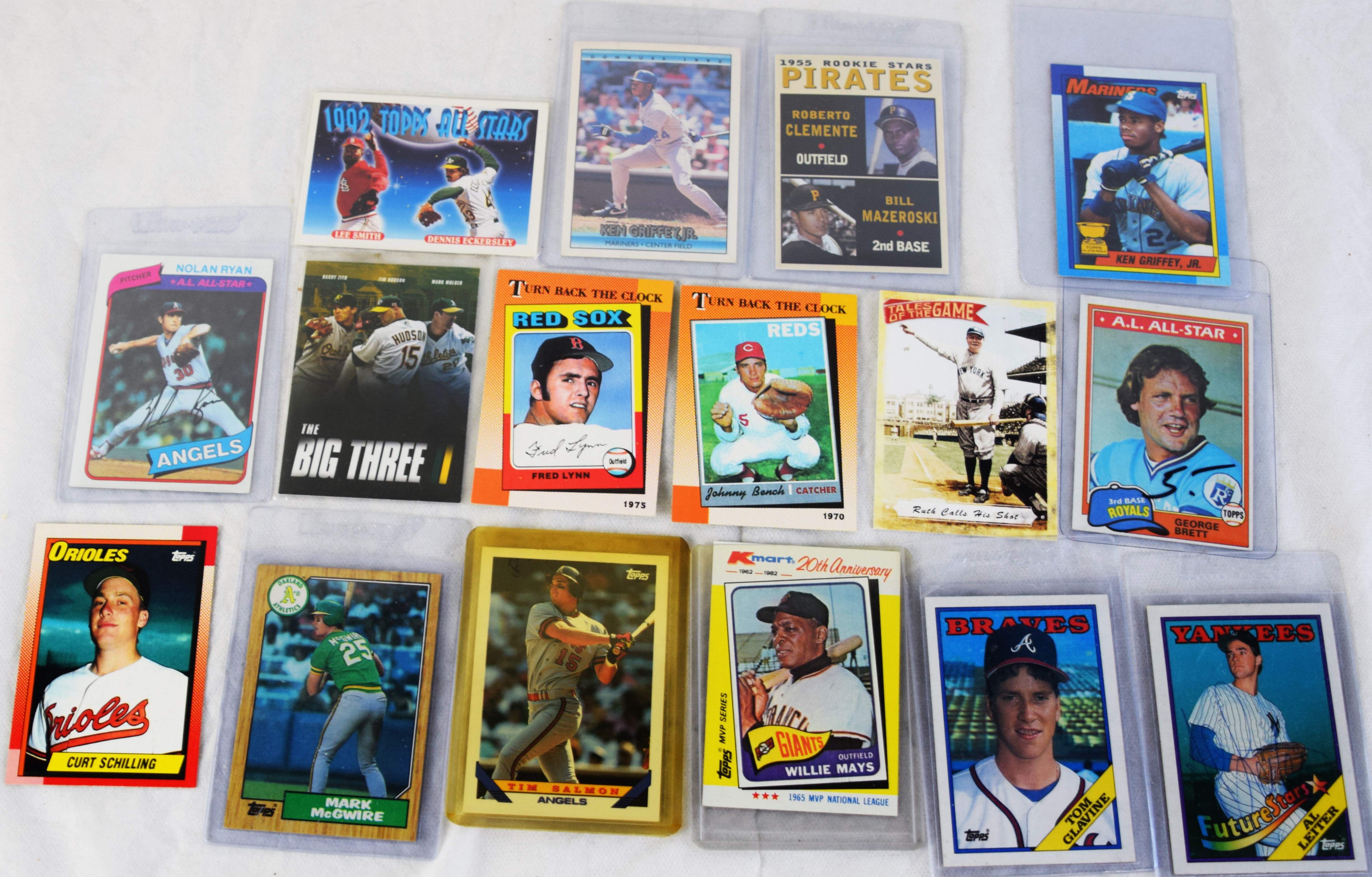 Large lot of baseball cards to include many rookie cards, prospect cards, and historical baseball cards to include Babe Ruth pointing to his homerun. Rookie and all-star cards include Mickey Mantle, Roberto Clemente, Bill Mazeroski, Willie Mays, Ken Brett, Junior Griffey, Tom Glavine and much more.