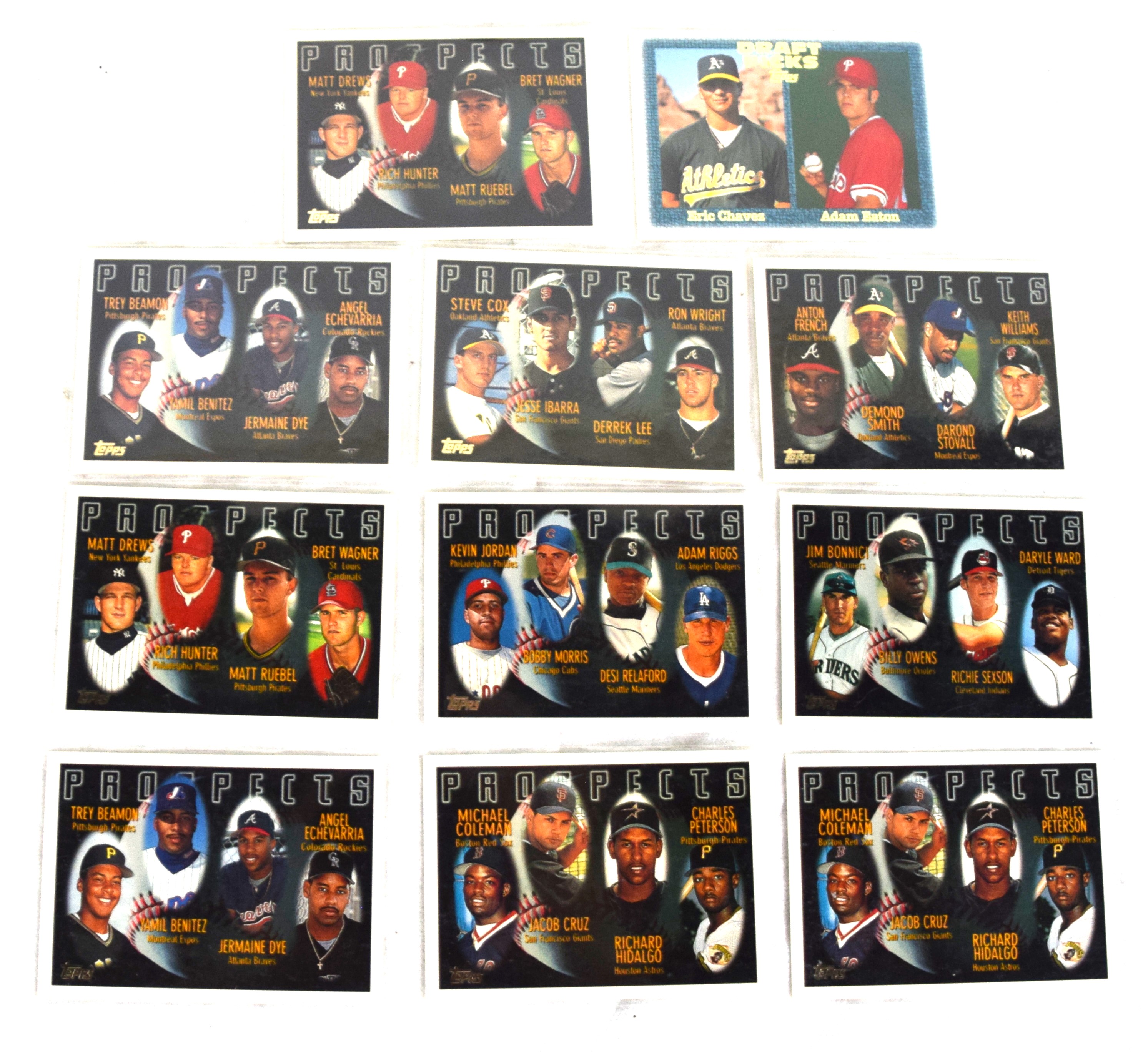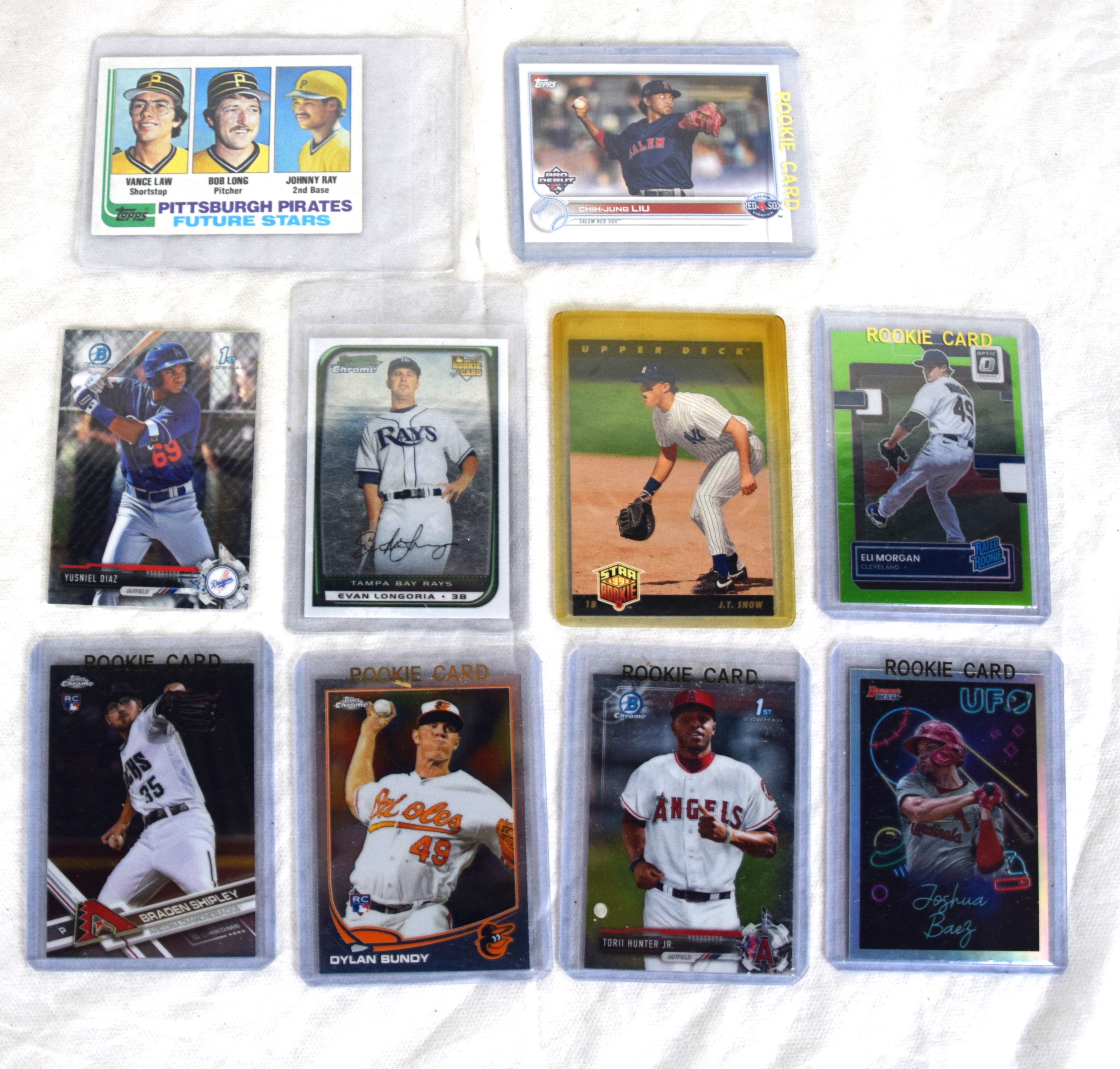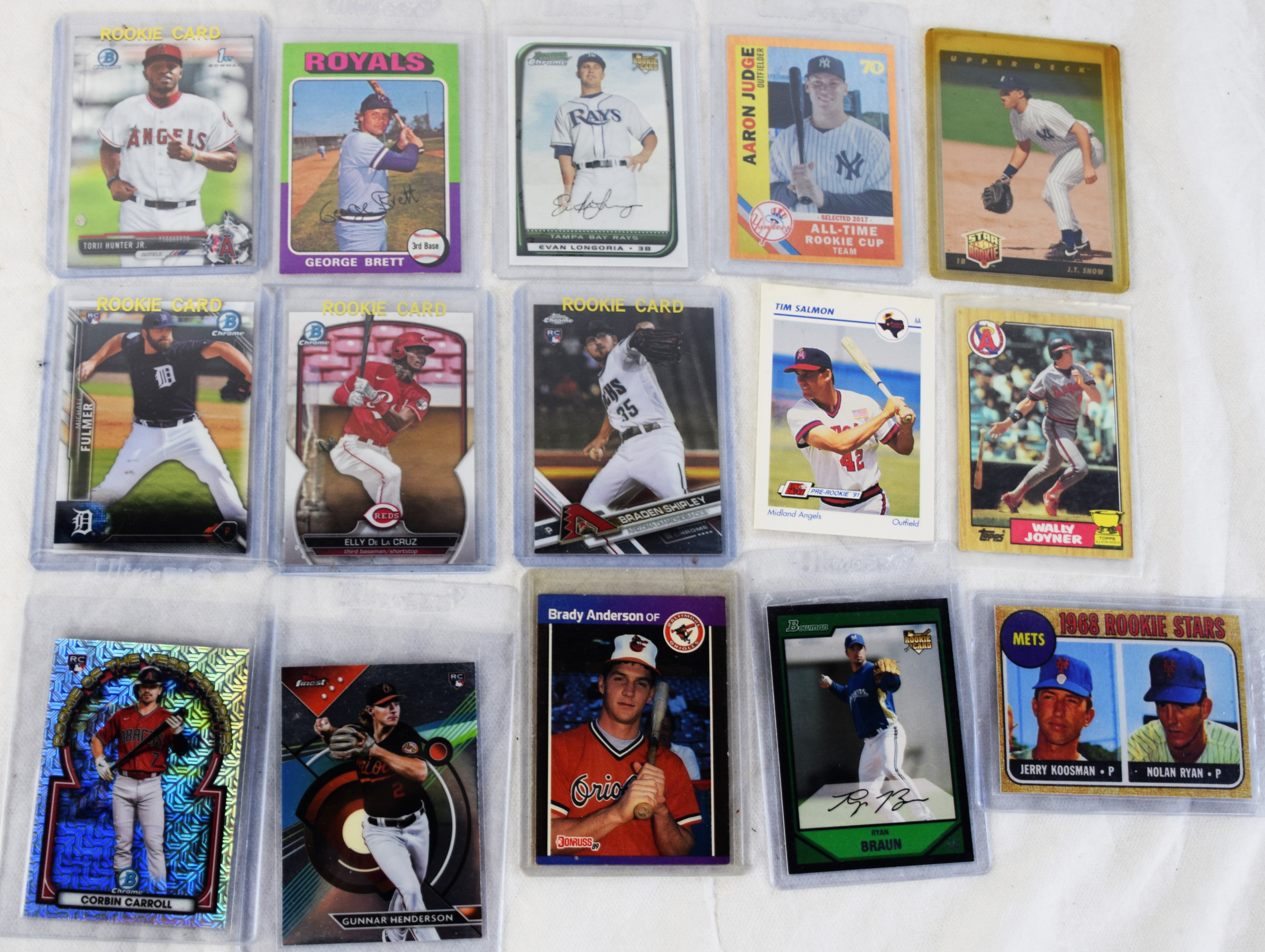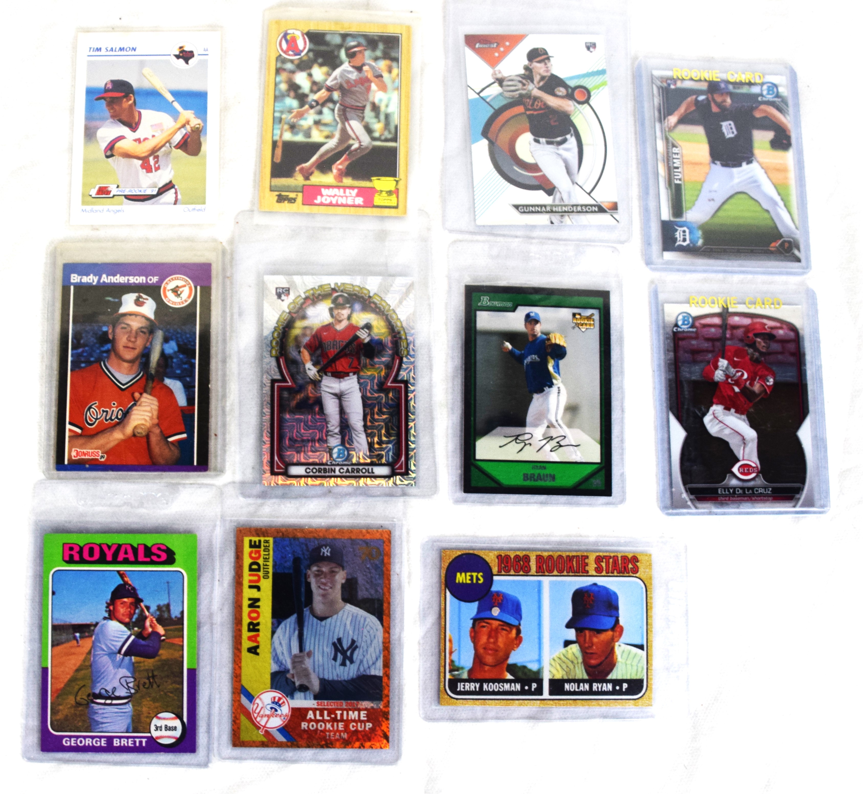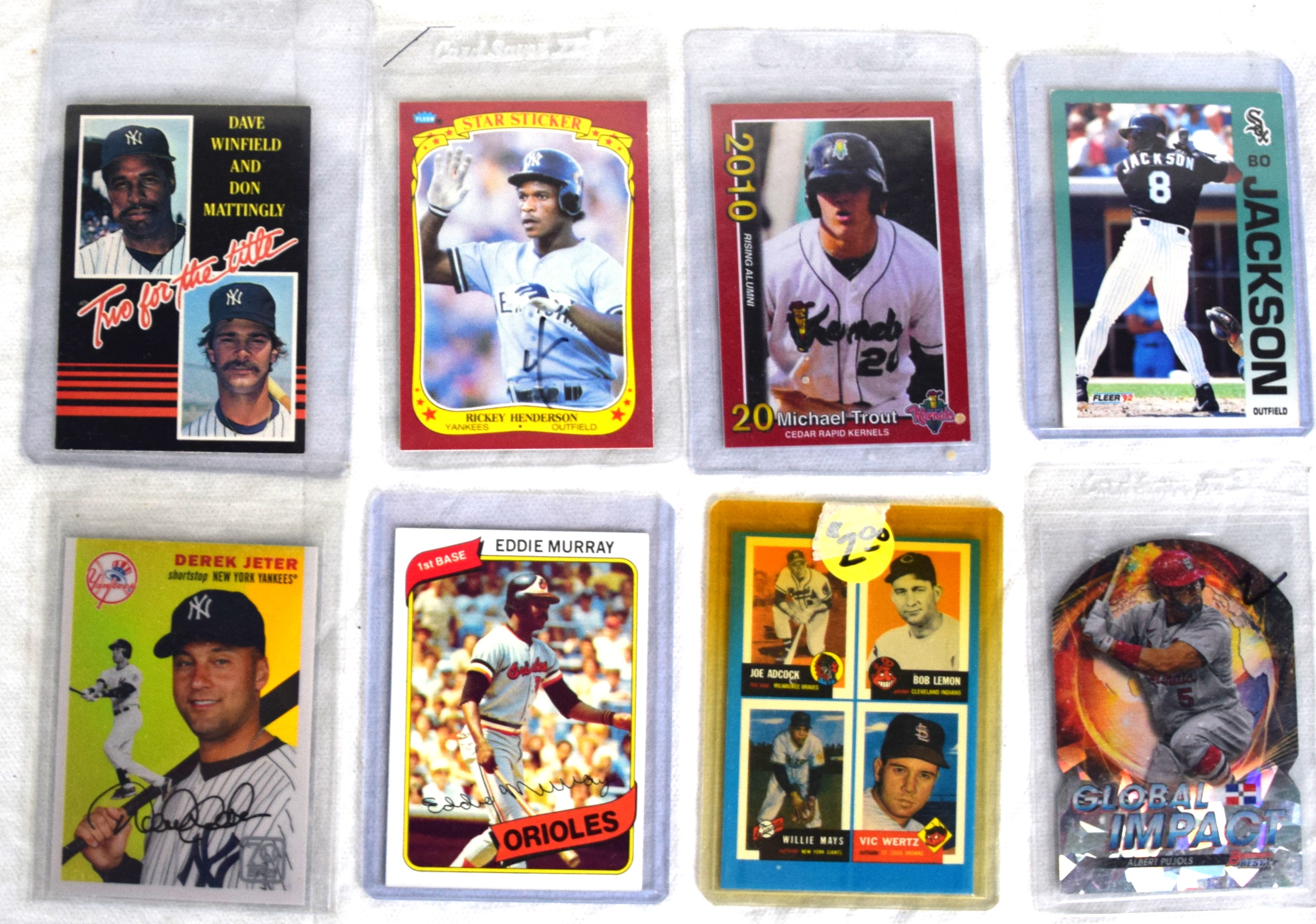 Large lot of baseball cards to include many rookie cards, prospect cards, and historical baseball cards to include Babe Ruth pointing to his homerun. Rookie and all-star cards include Mickey Mantle, Roberto Clemente, Bill Mazeroski, Willie Mays, Ken Brett, Junior Griffey, Tom Glavine and much more.