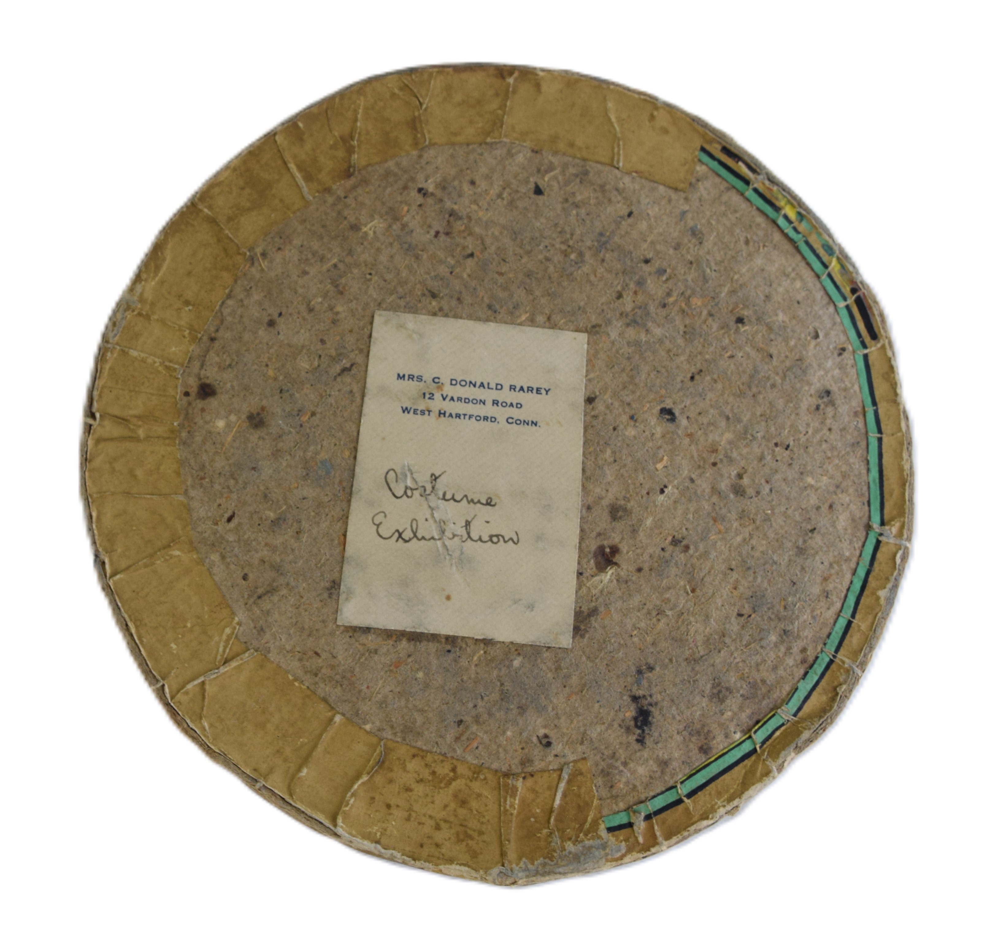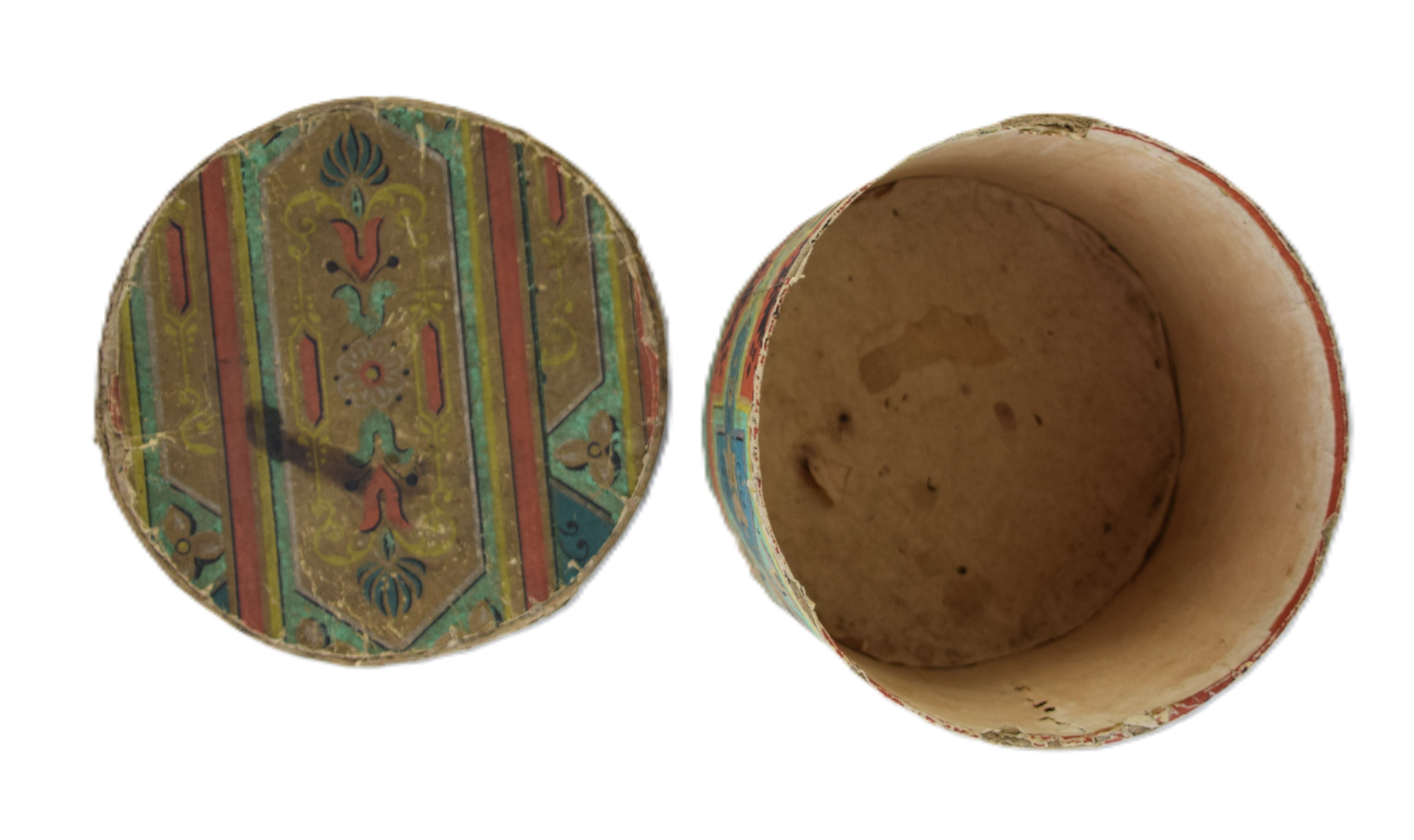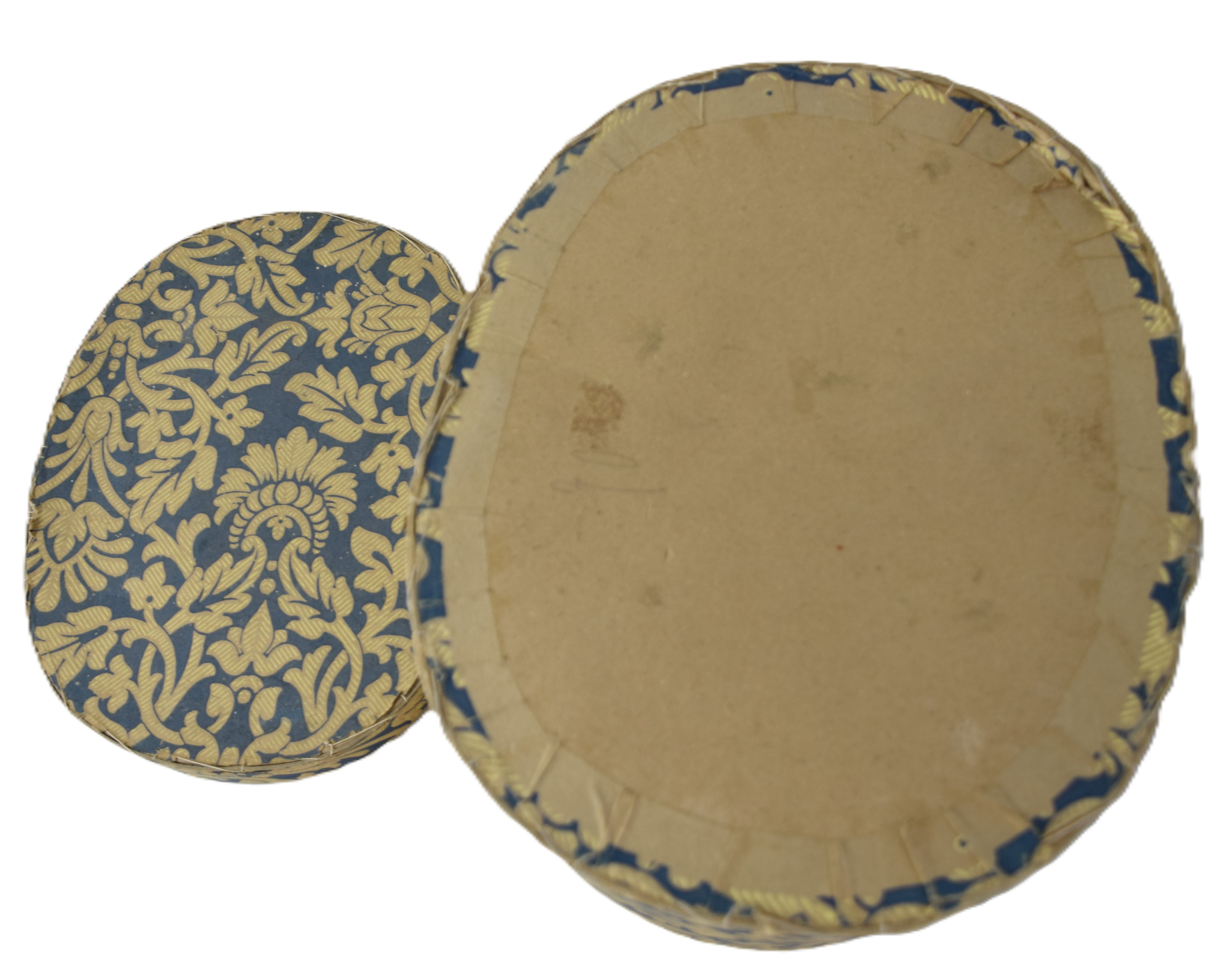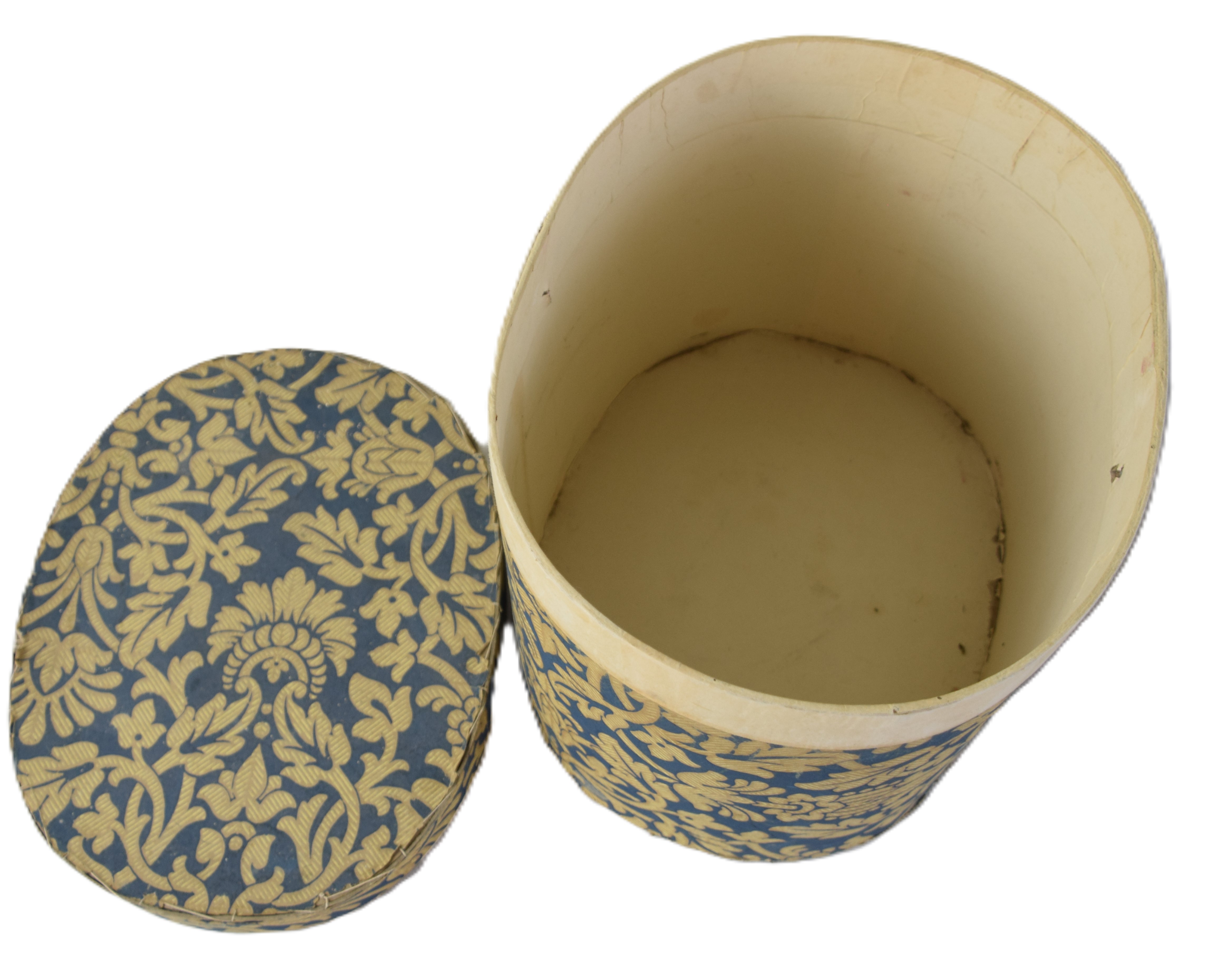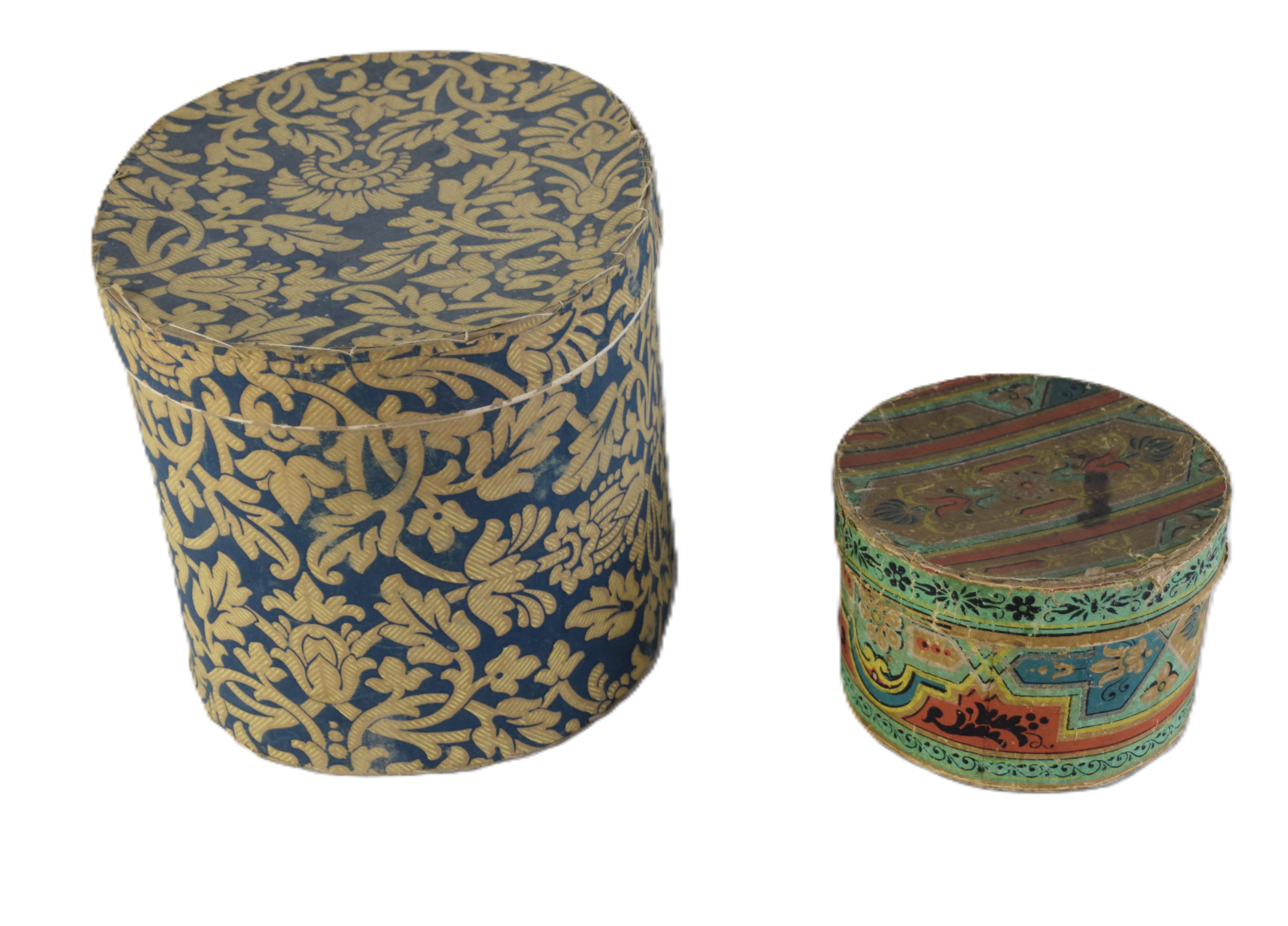 Two 19th century wallpaper hat boxes-one in round form and one in oval form, all with lids. Provance: Northeast Auctions. Dimensions: 5″H x 7.5 Dia and 9.5″ H x 13″L