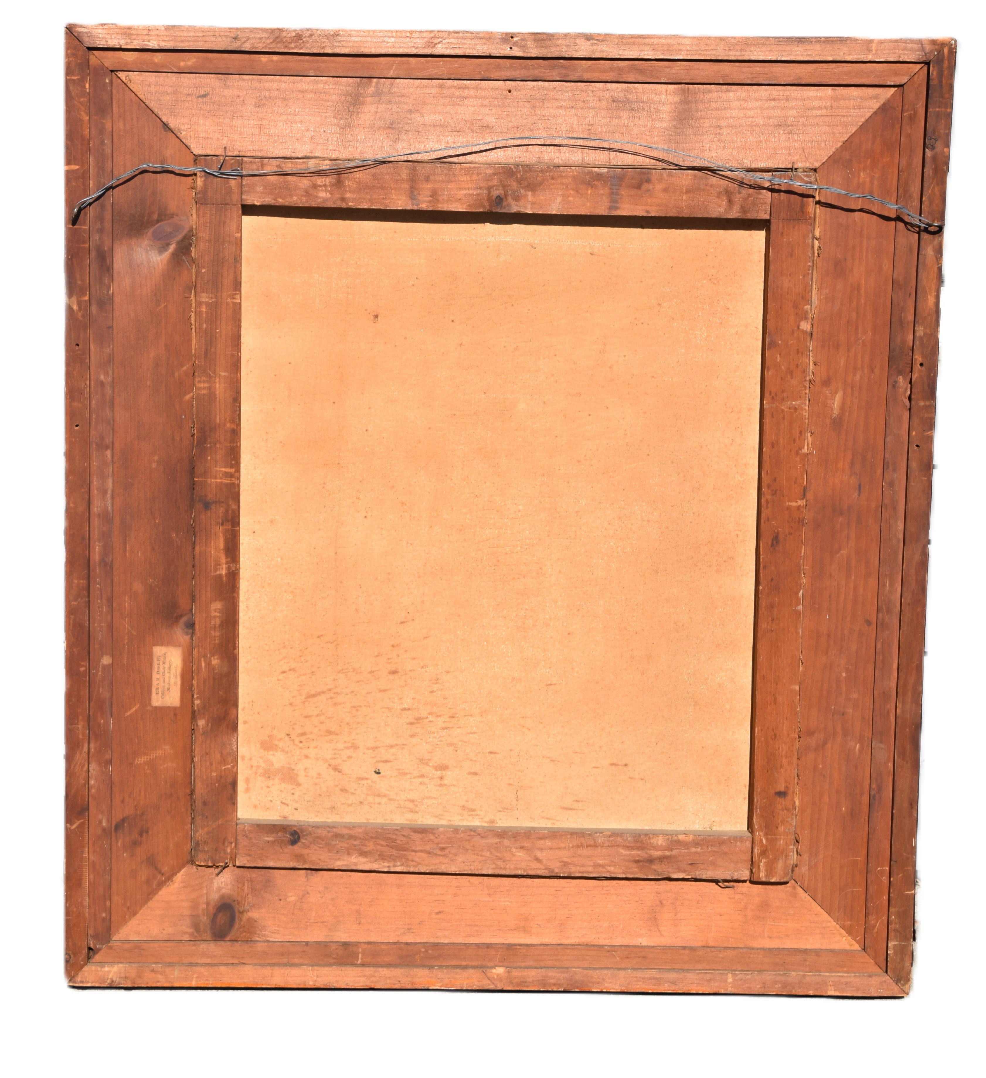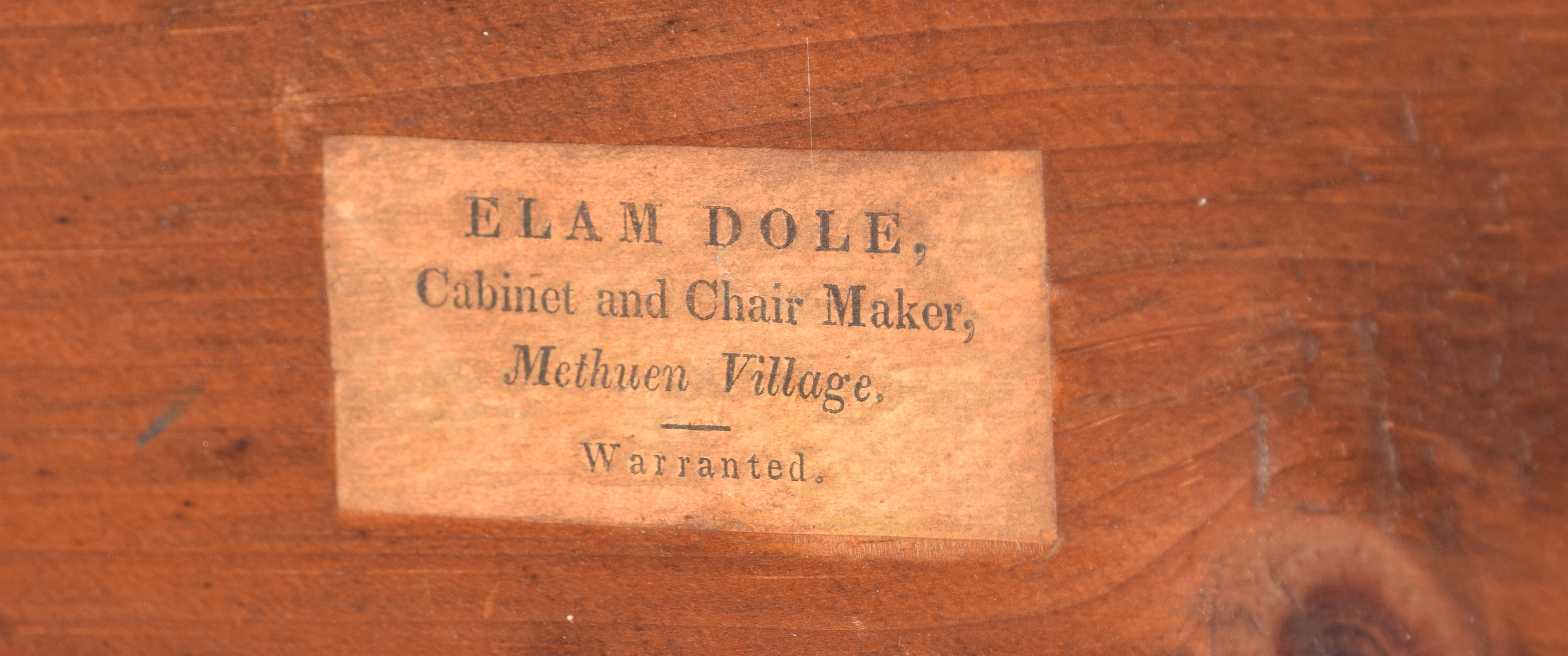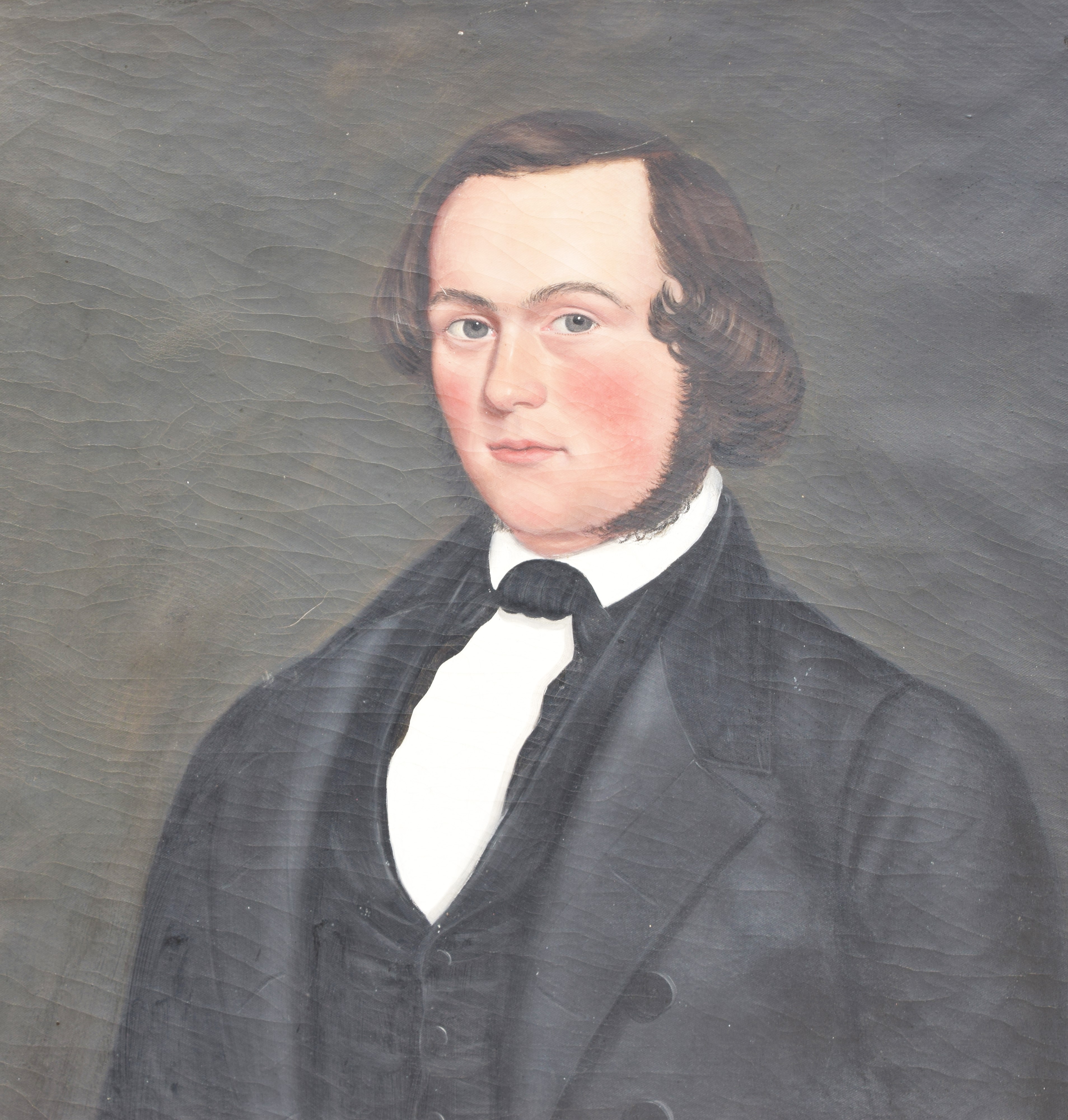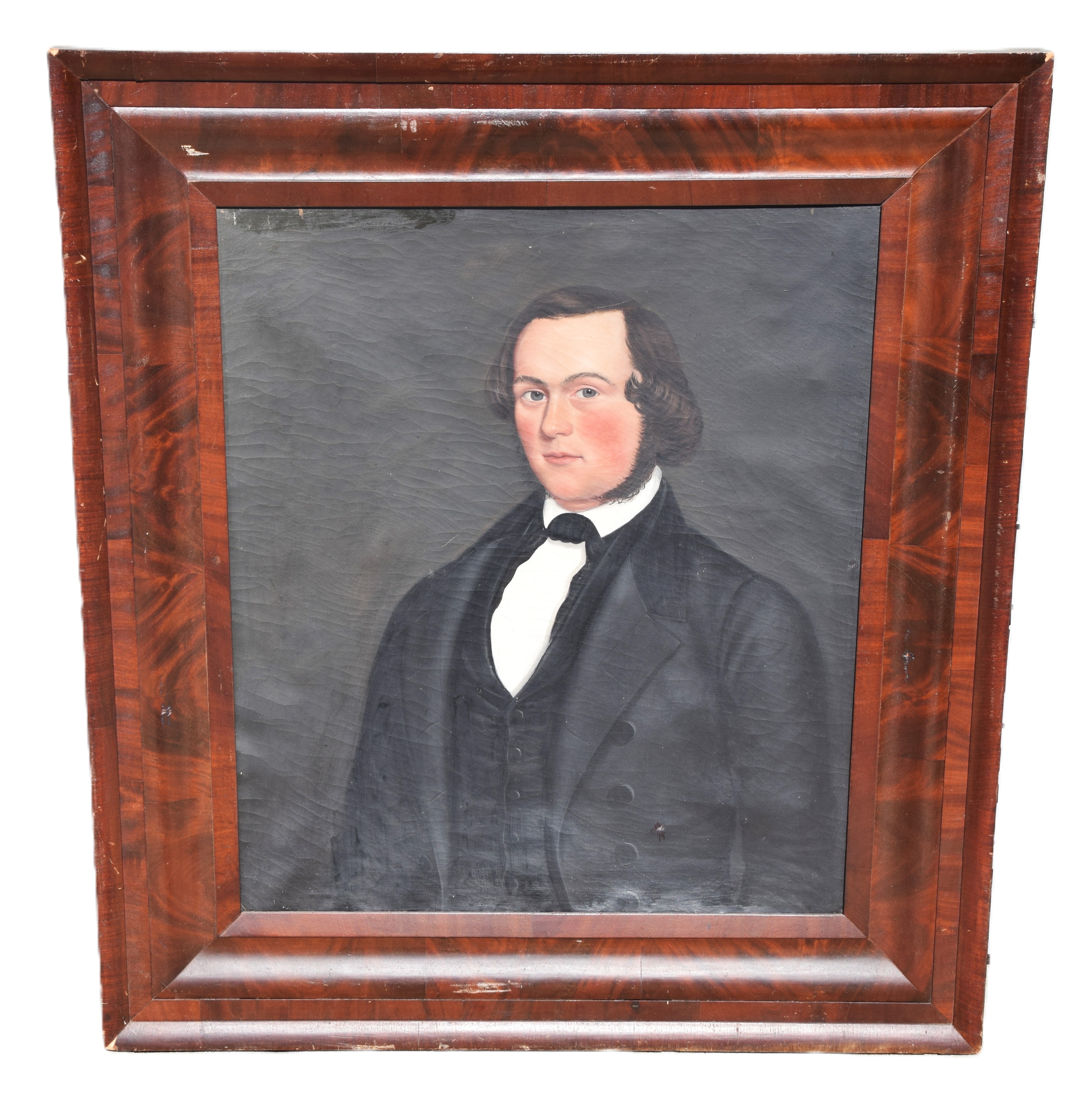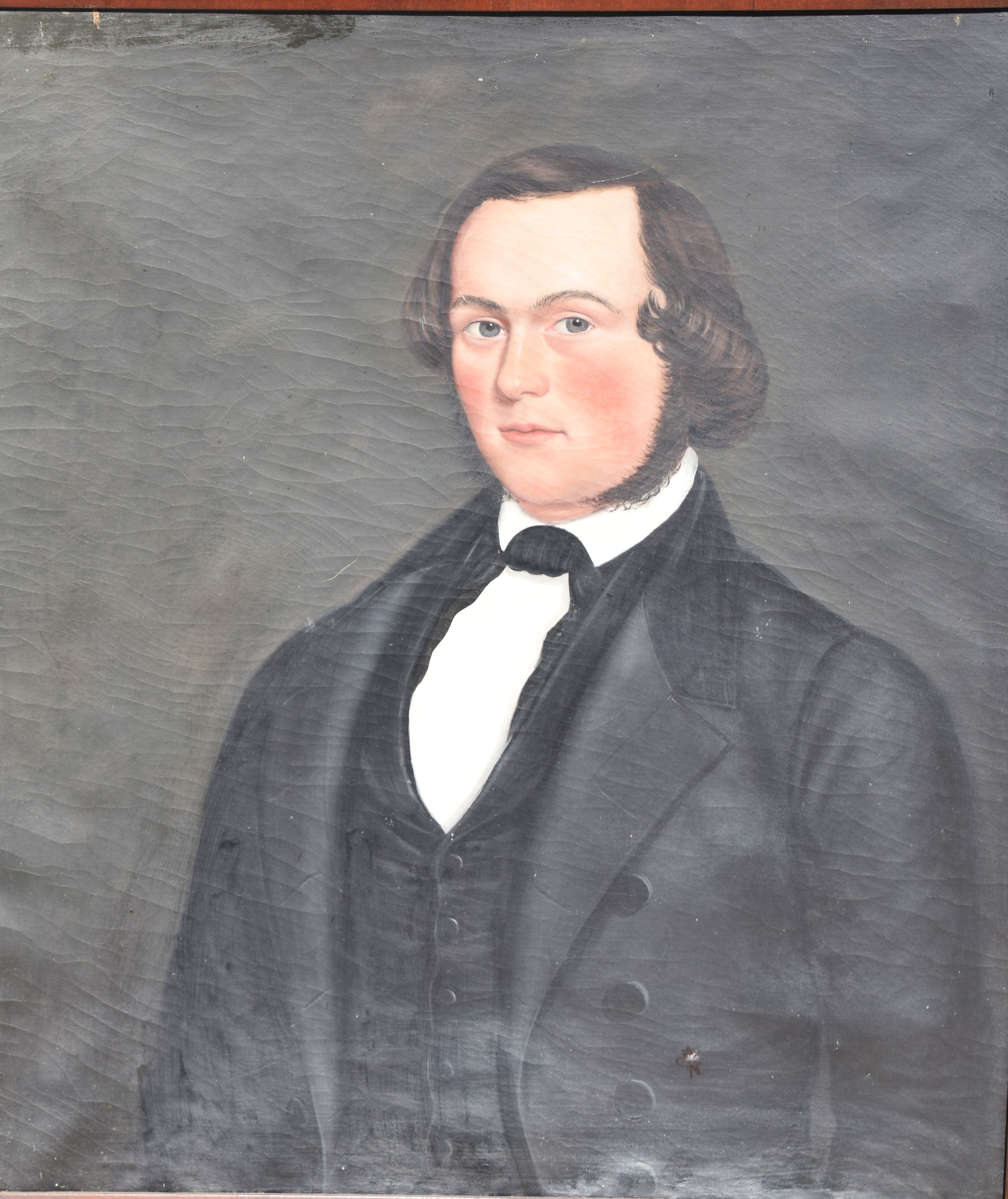 Circa 1840-60 portrait, oil on canvas of a gentleman in a period frame in the style of the Prior-Hamblin School. Label affixed to frame marked “Elam Dole, Cabinet and Chair Maker, Methuen Village. Warranted.” Dimensions: 2.5″ x 23.5″