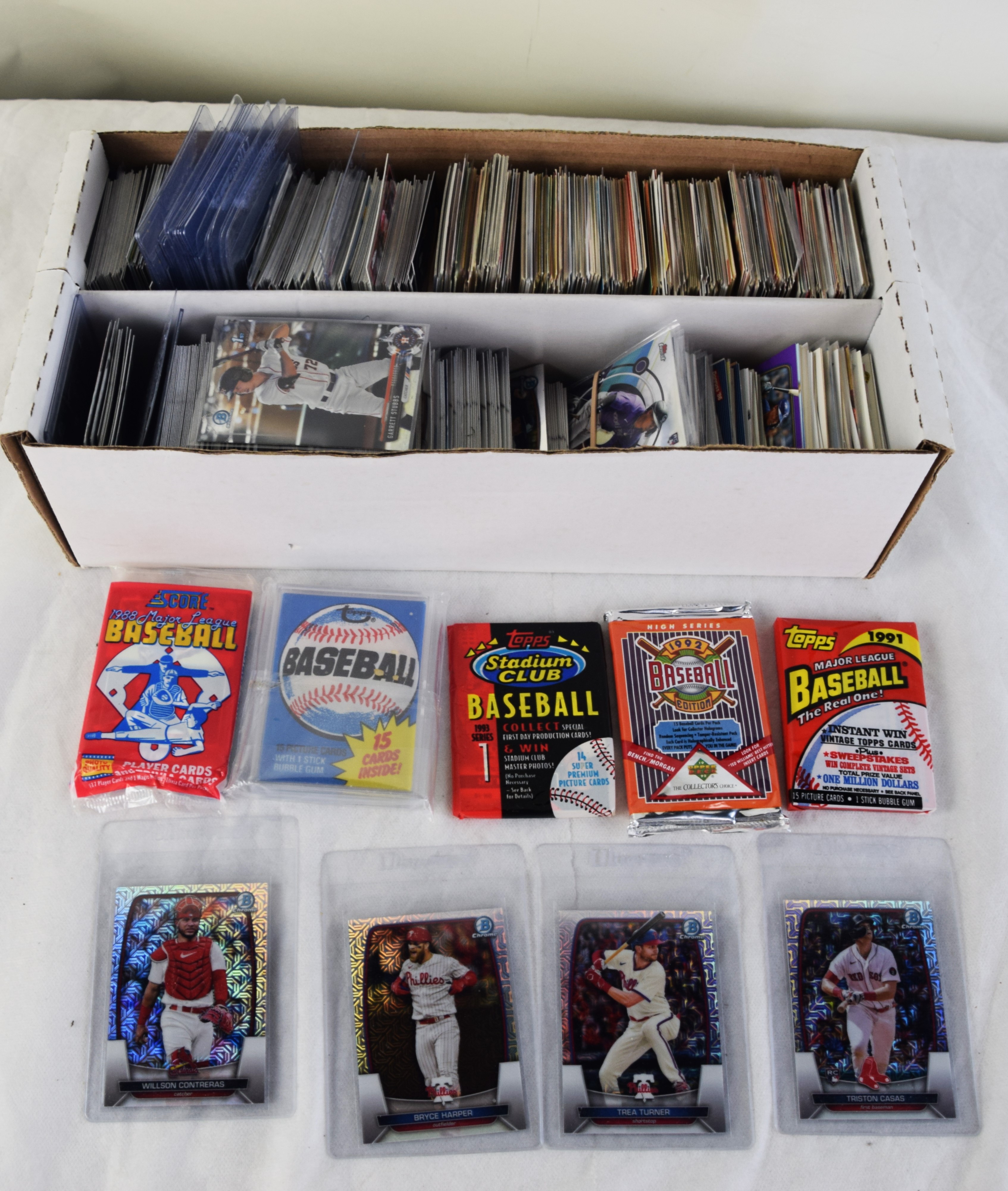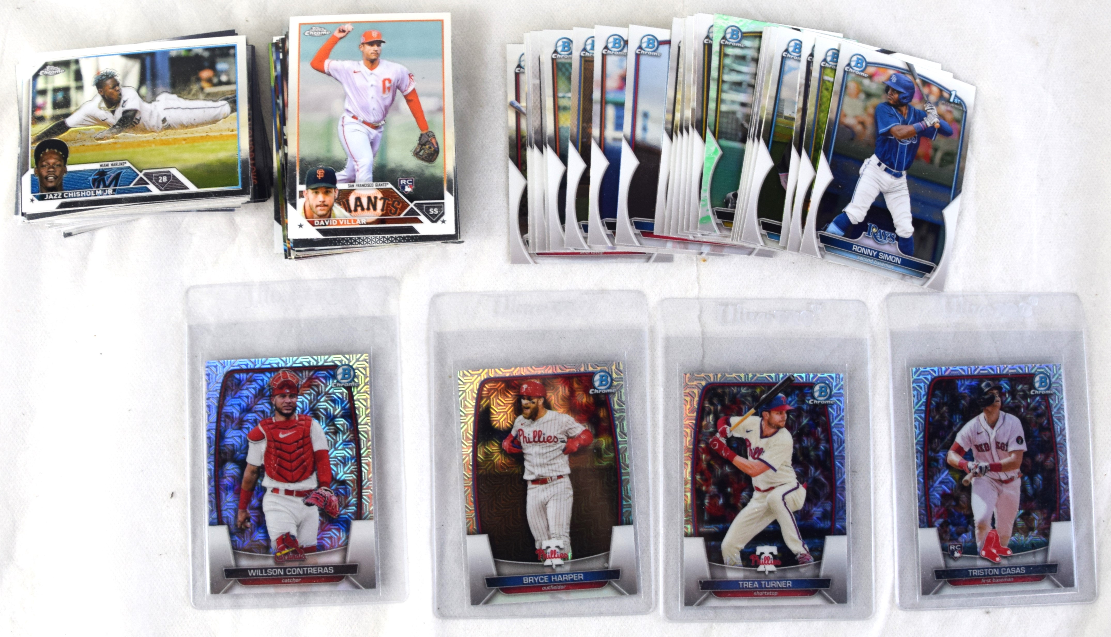 Over a thousand cards to include the Topps Chrome collection and the Bowman Chrome collection as well as unopen card decks. Included is a set of Topps 1989 cards