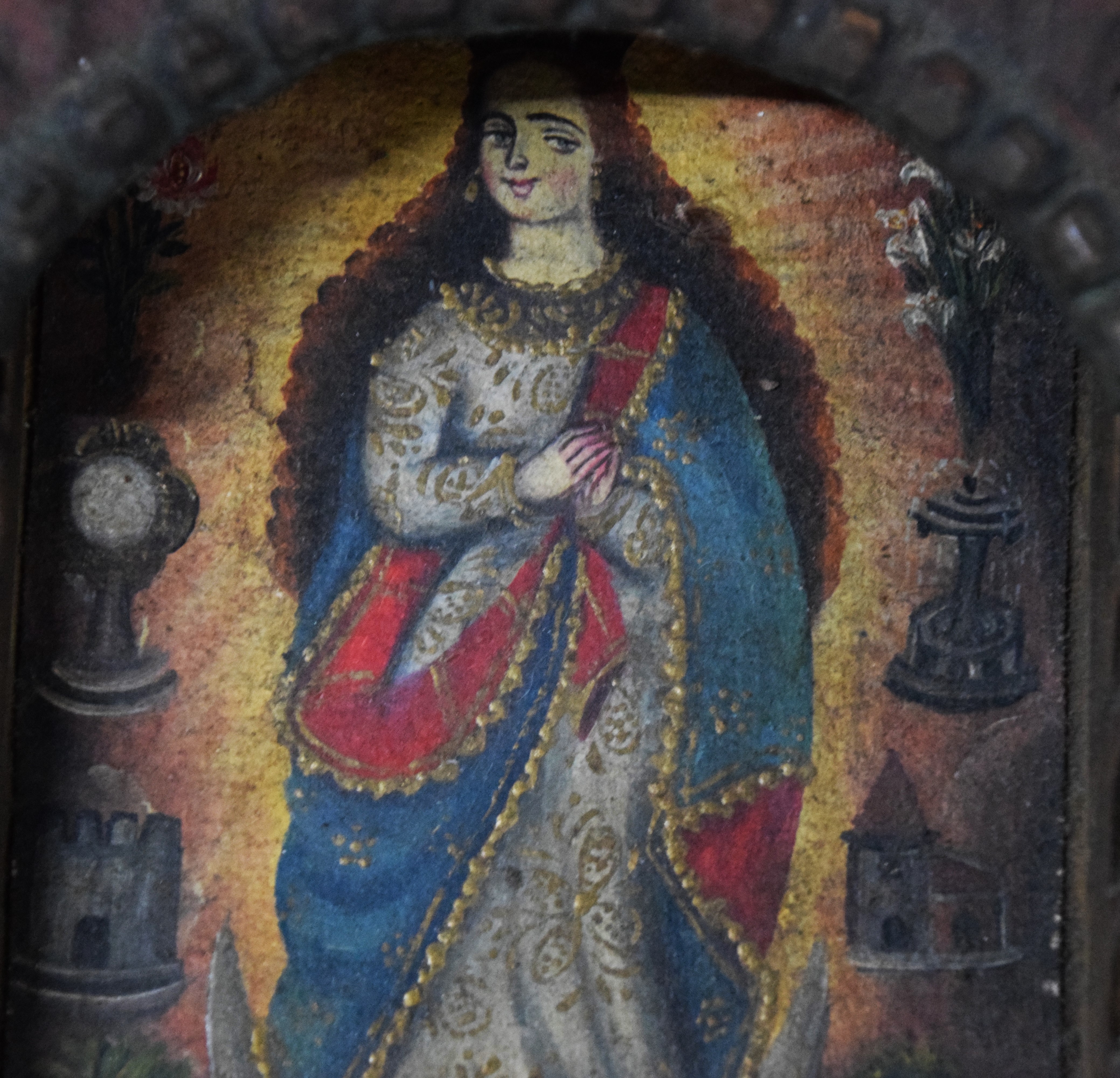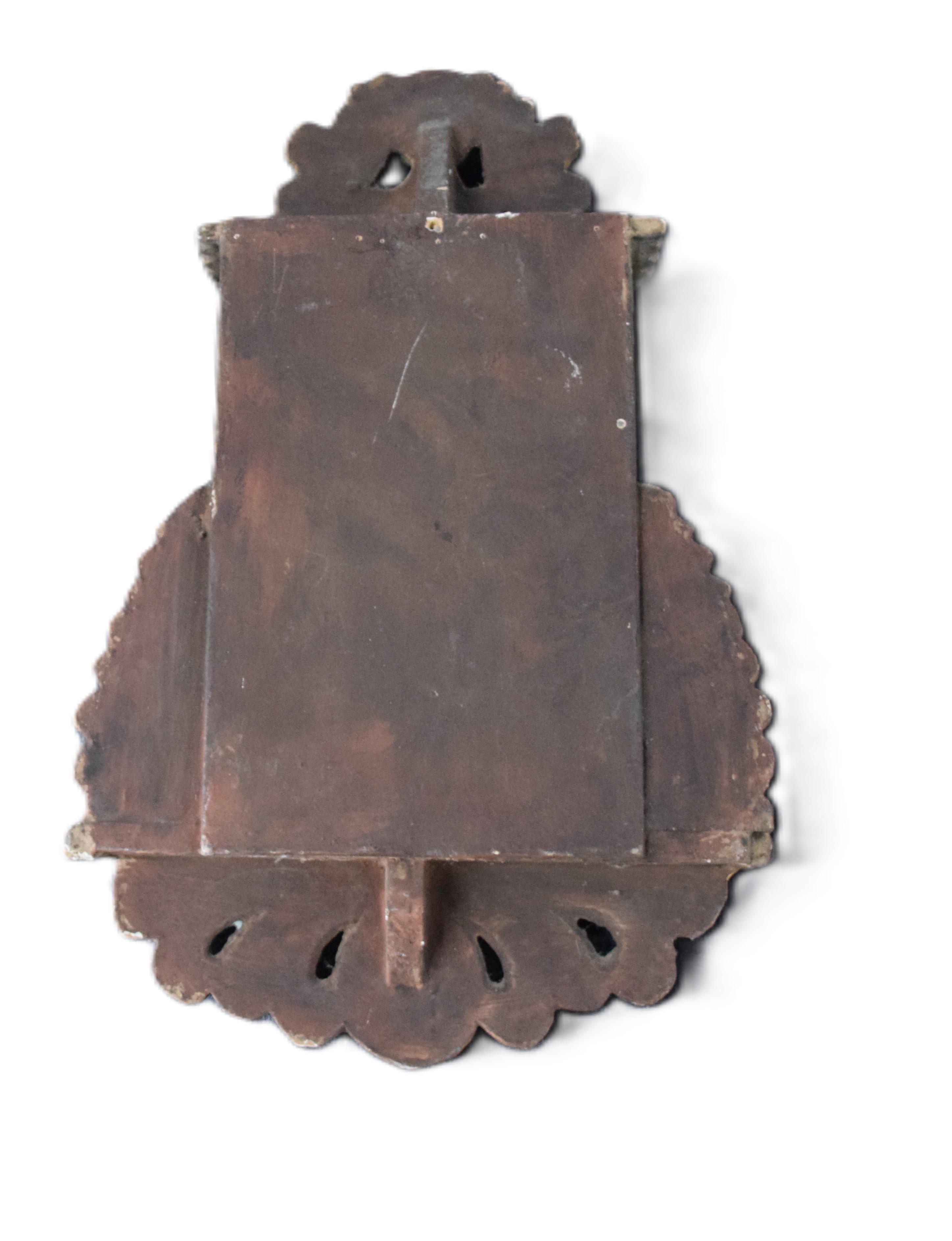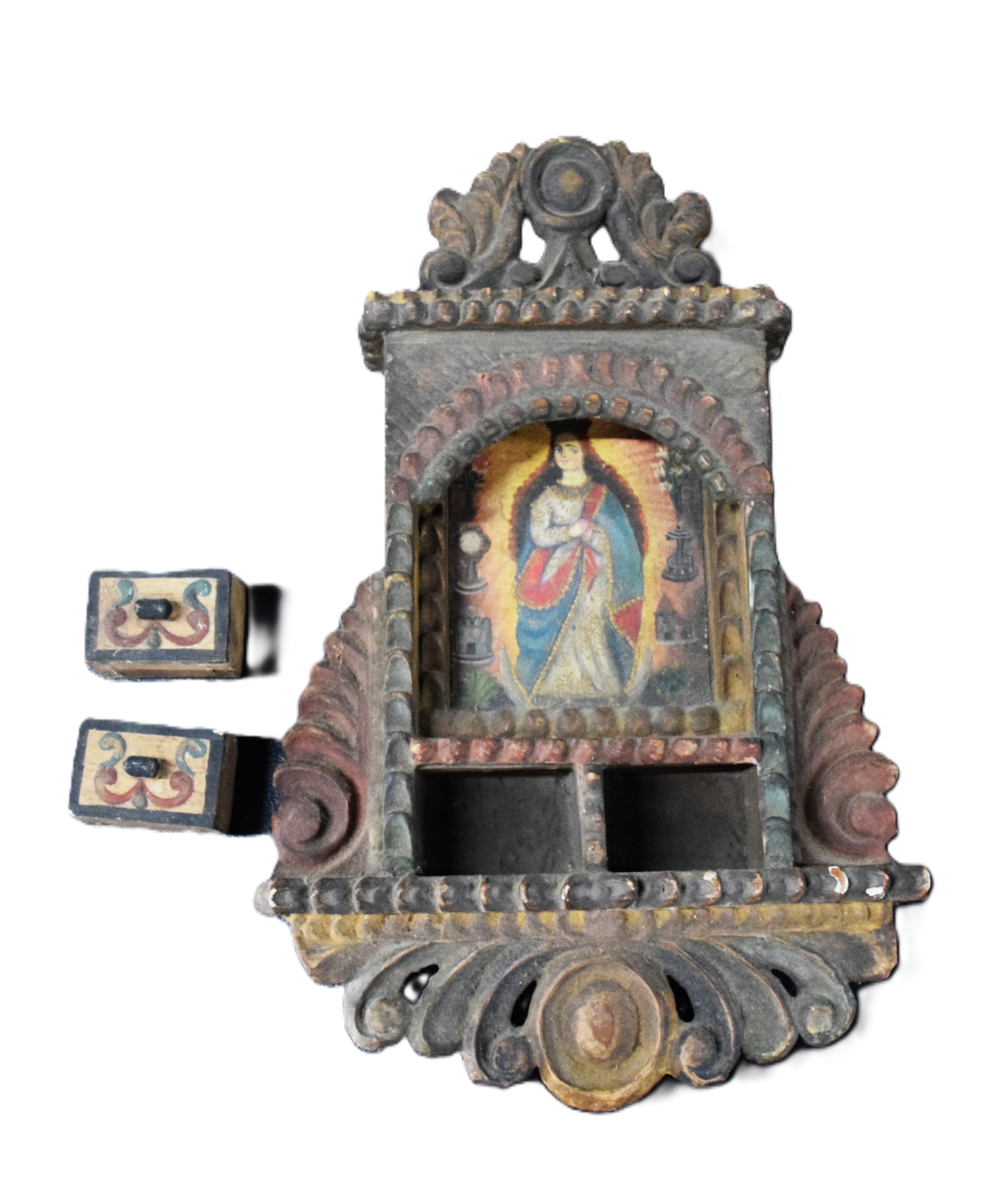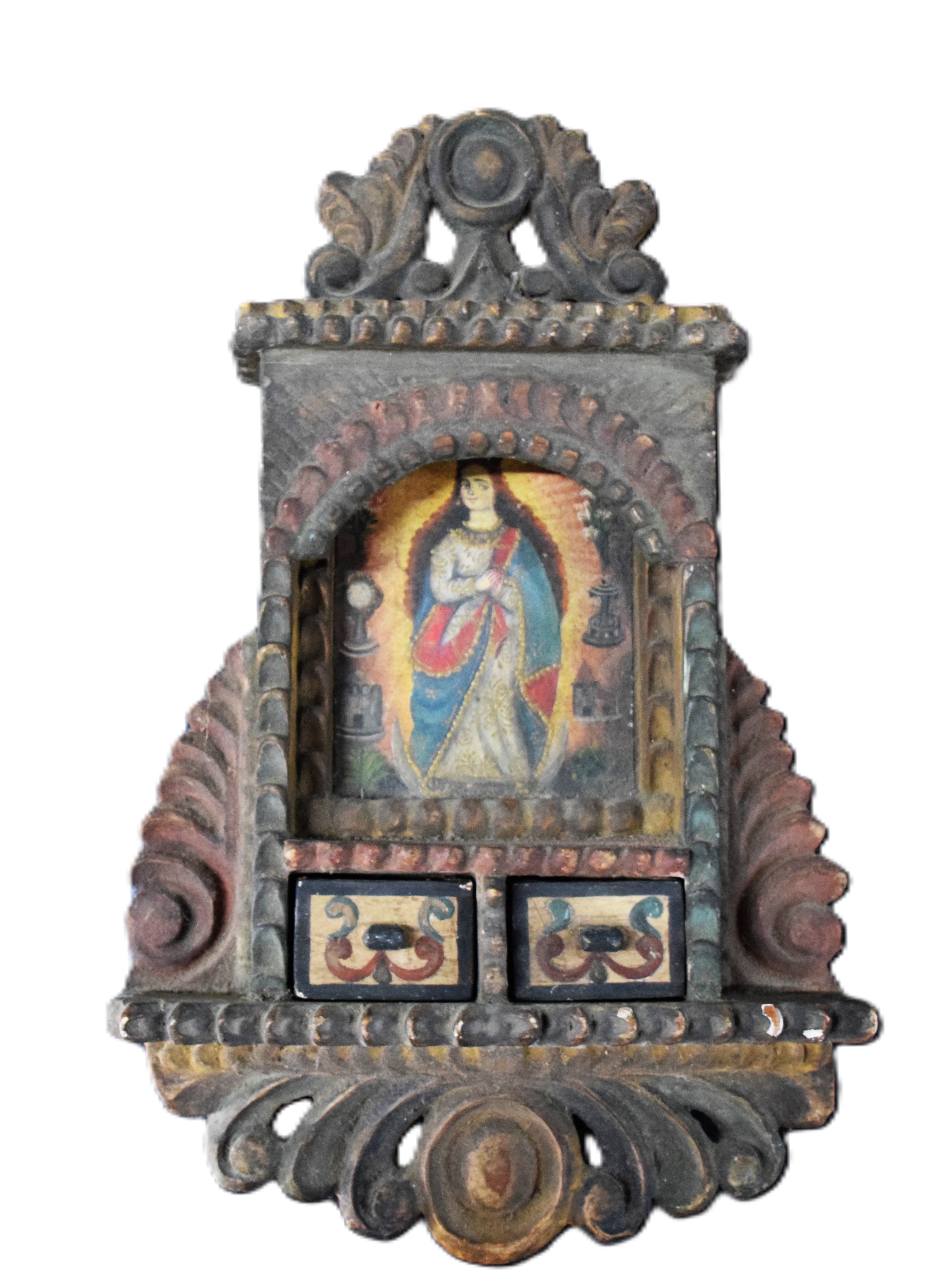 Queen Virgin Mary in an elegant clothing in a wooden, carved wall hanging box with two small drawers to hold rosaries. Probably made in Peru, early 20th Century or late 19th. Dimensions: 14″ H