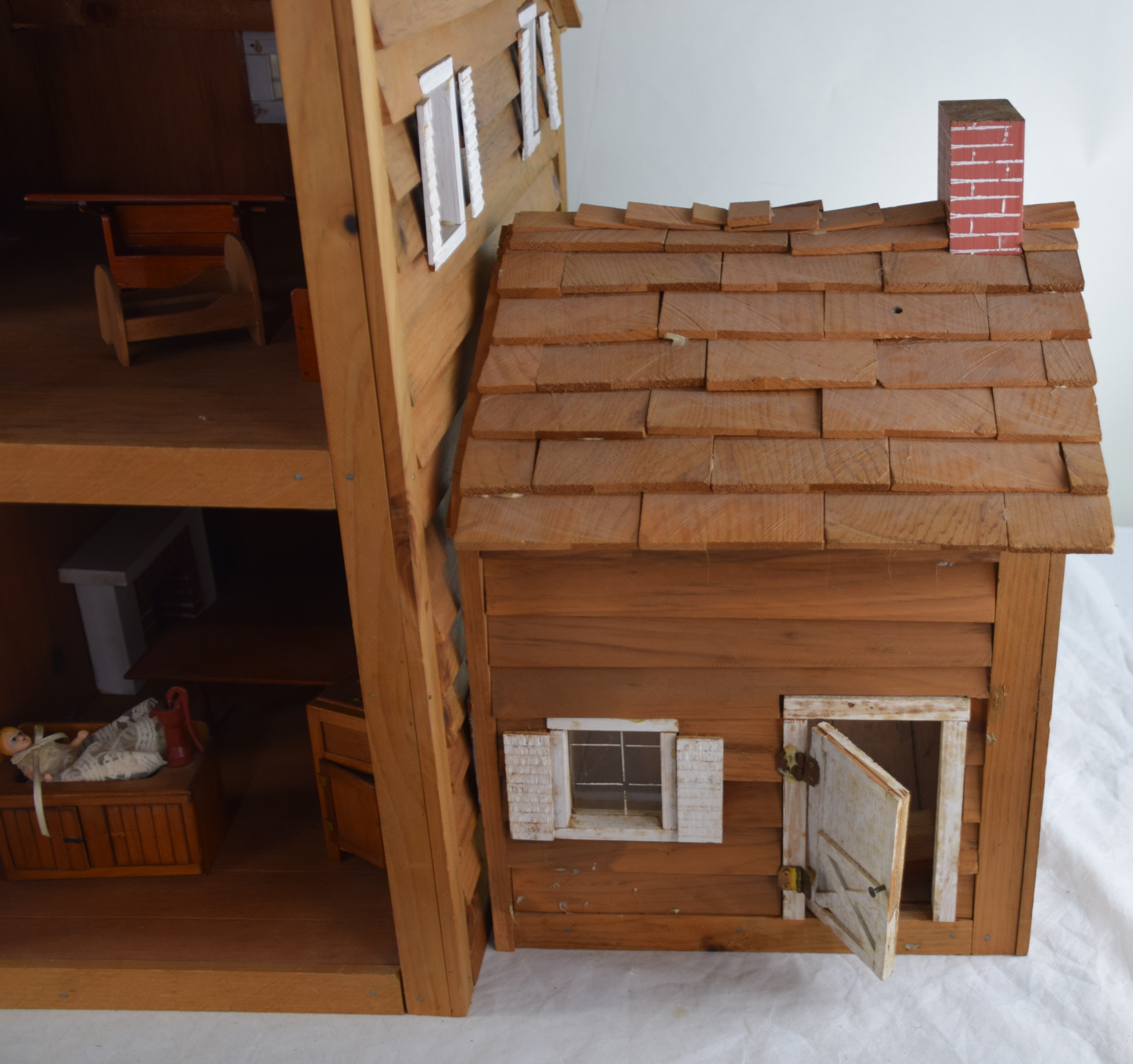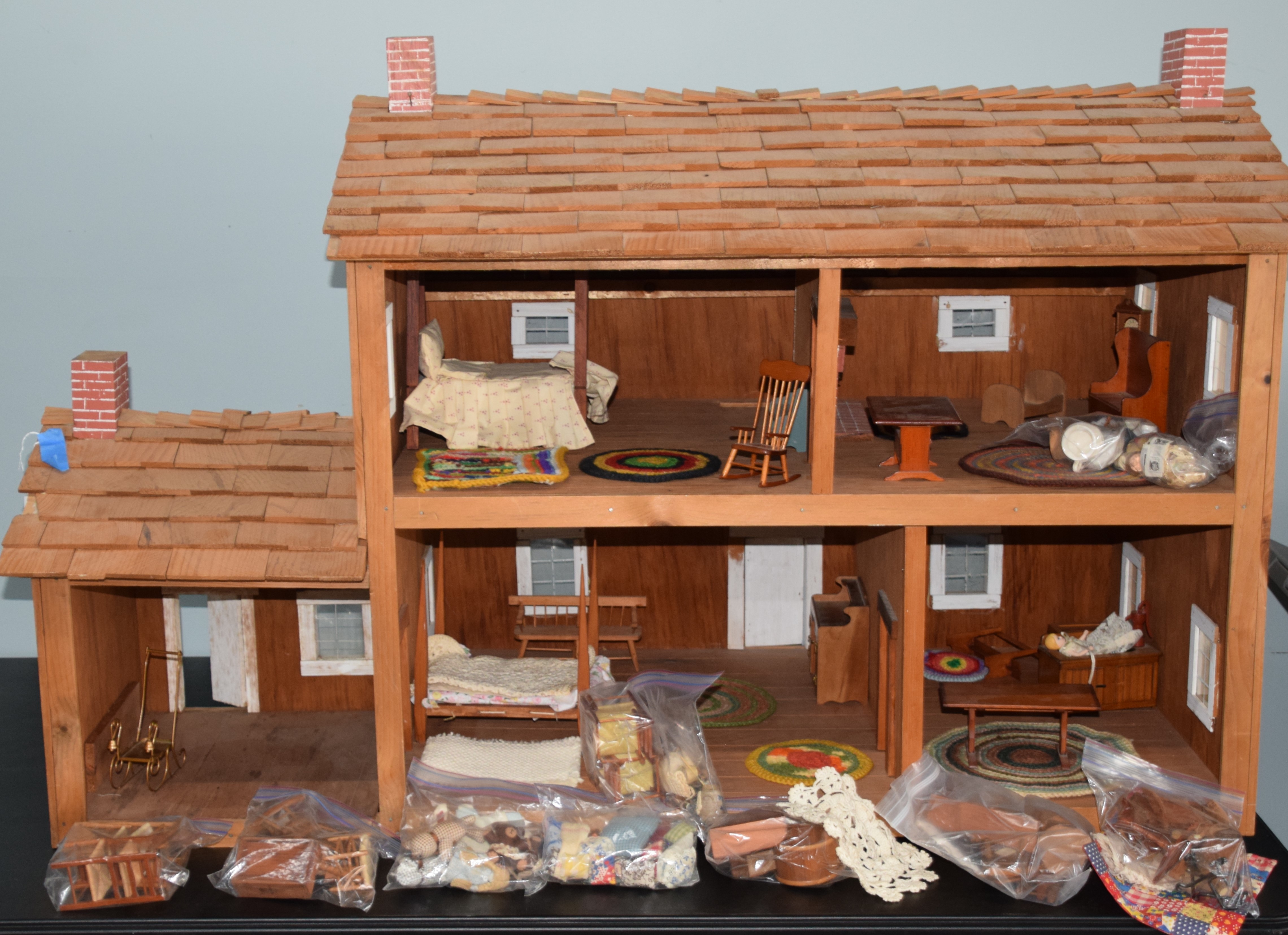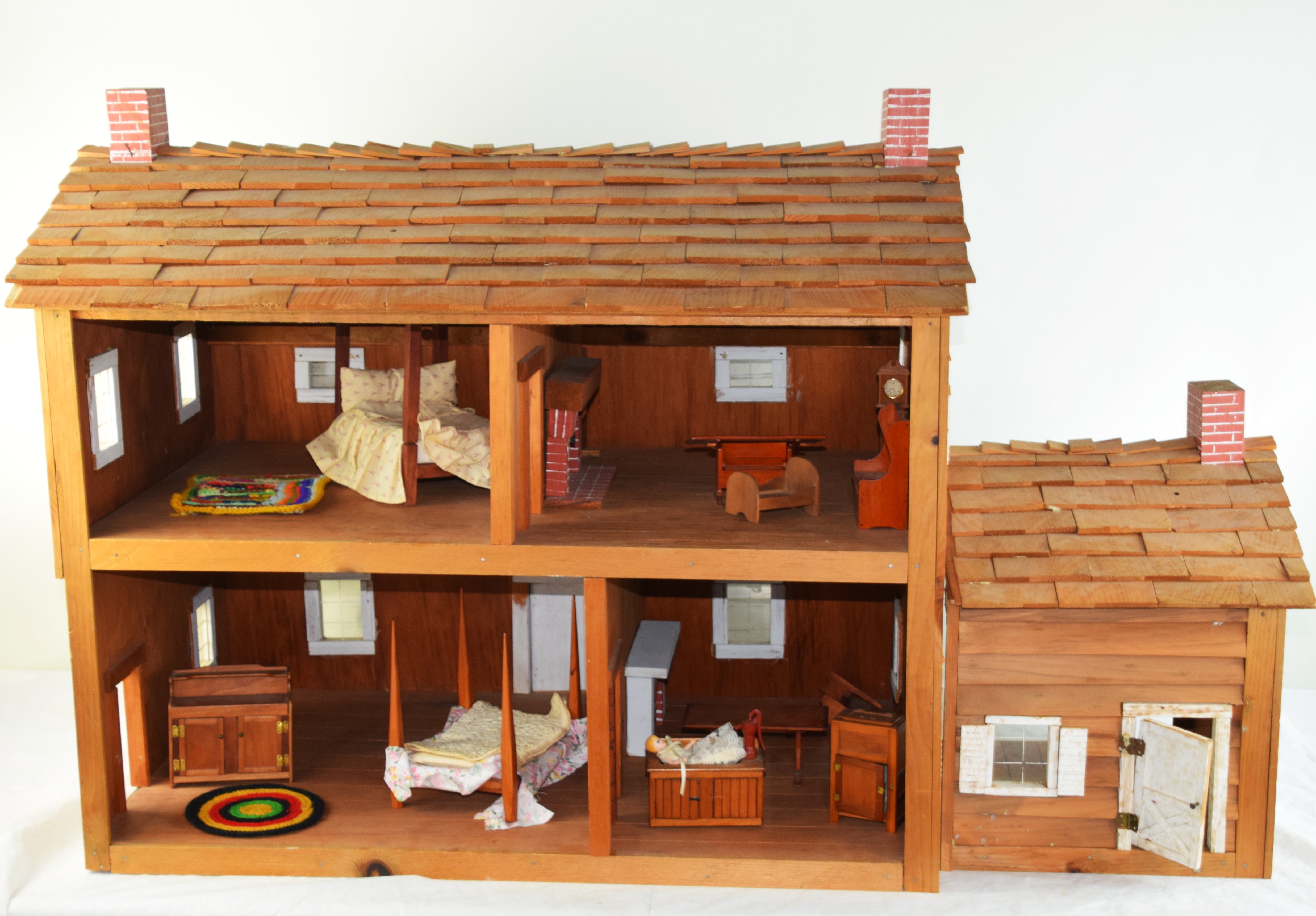 Fine large carved wooden doll house with shingle roof, 4 large rooms, attached garage with loads of doll house accessories to include Windsor back chairs, hutch table, grandfather clock canopy bed and much more. Dimensions: 30″ H x 48″ L x 25″D
