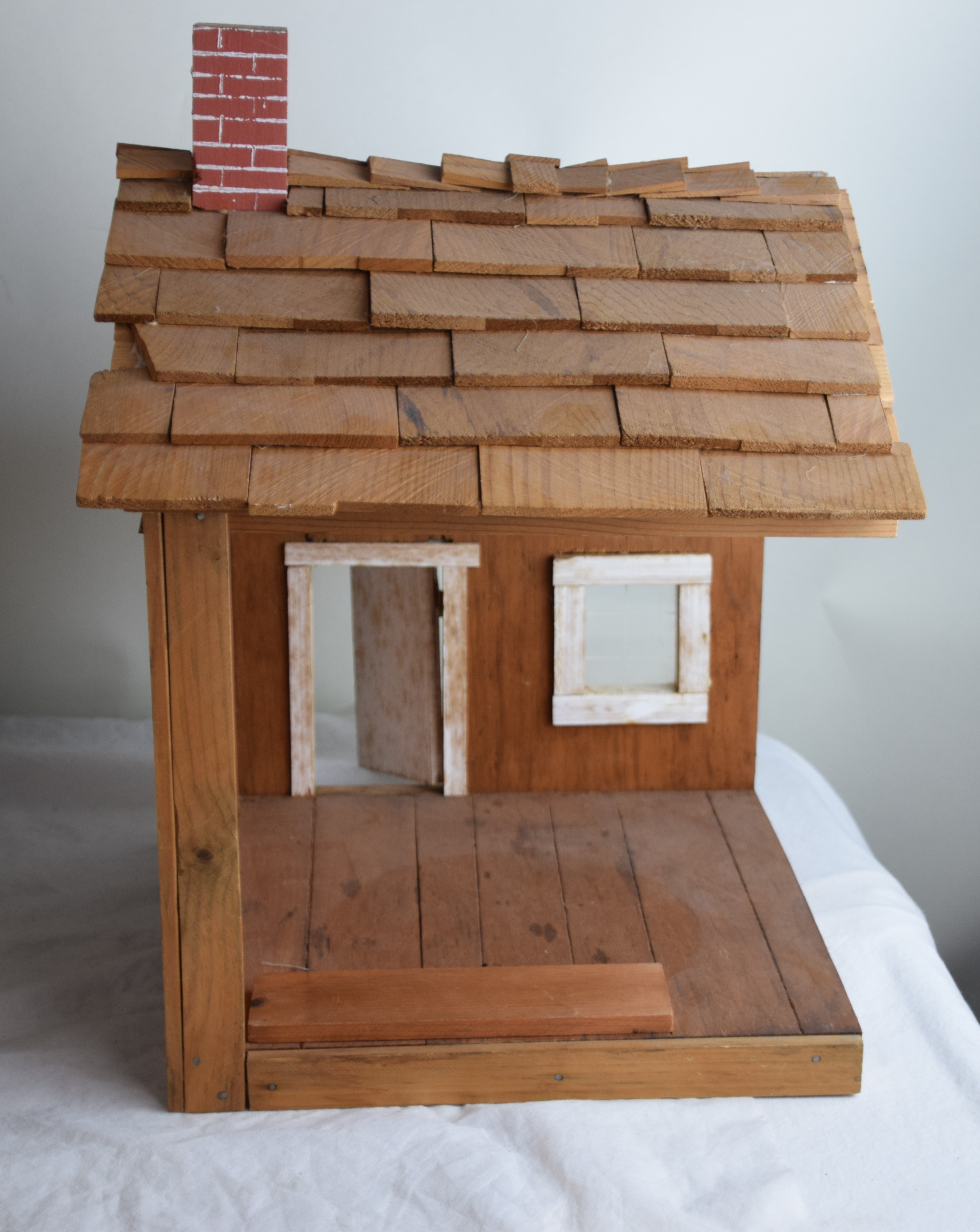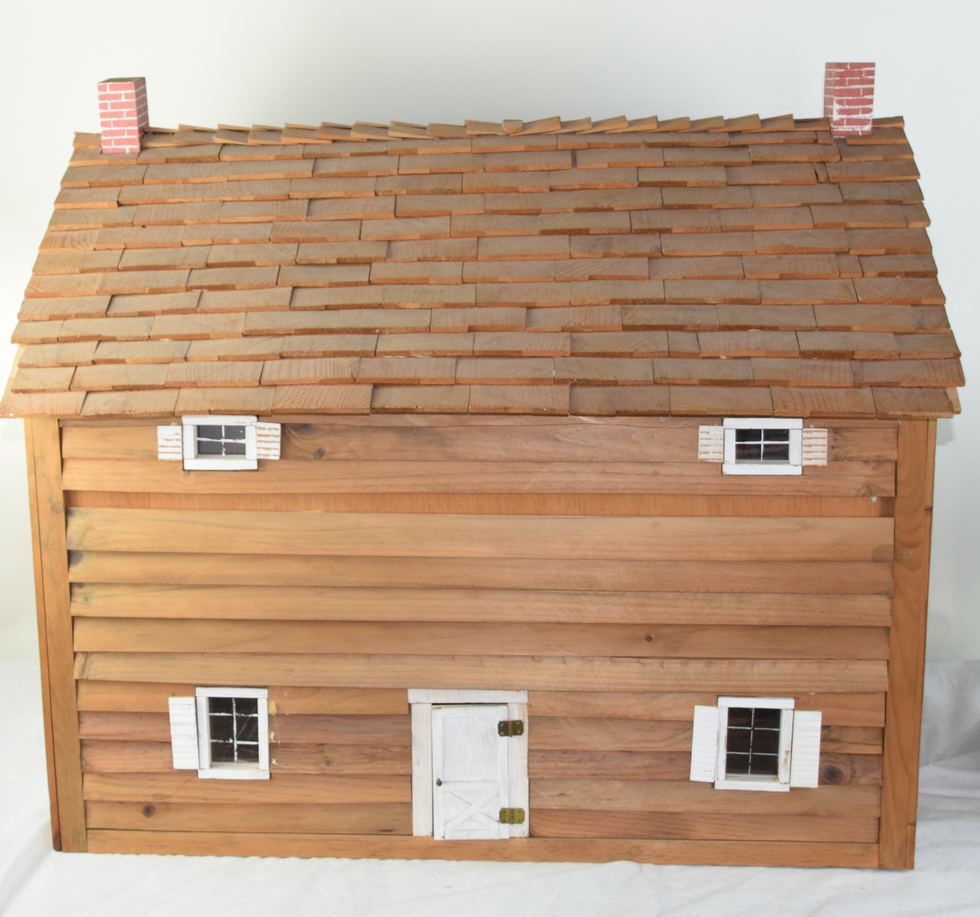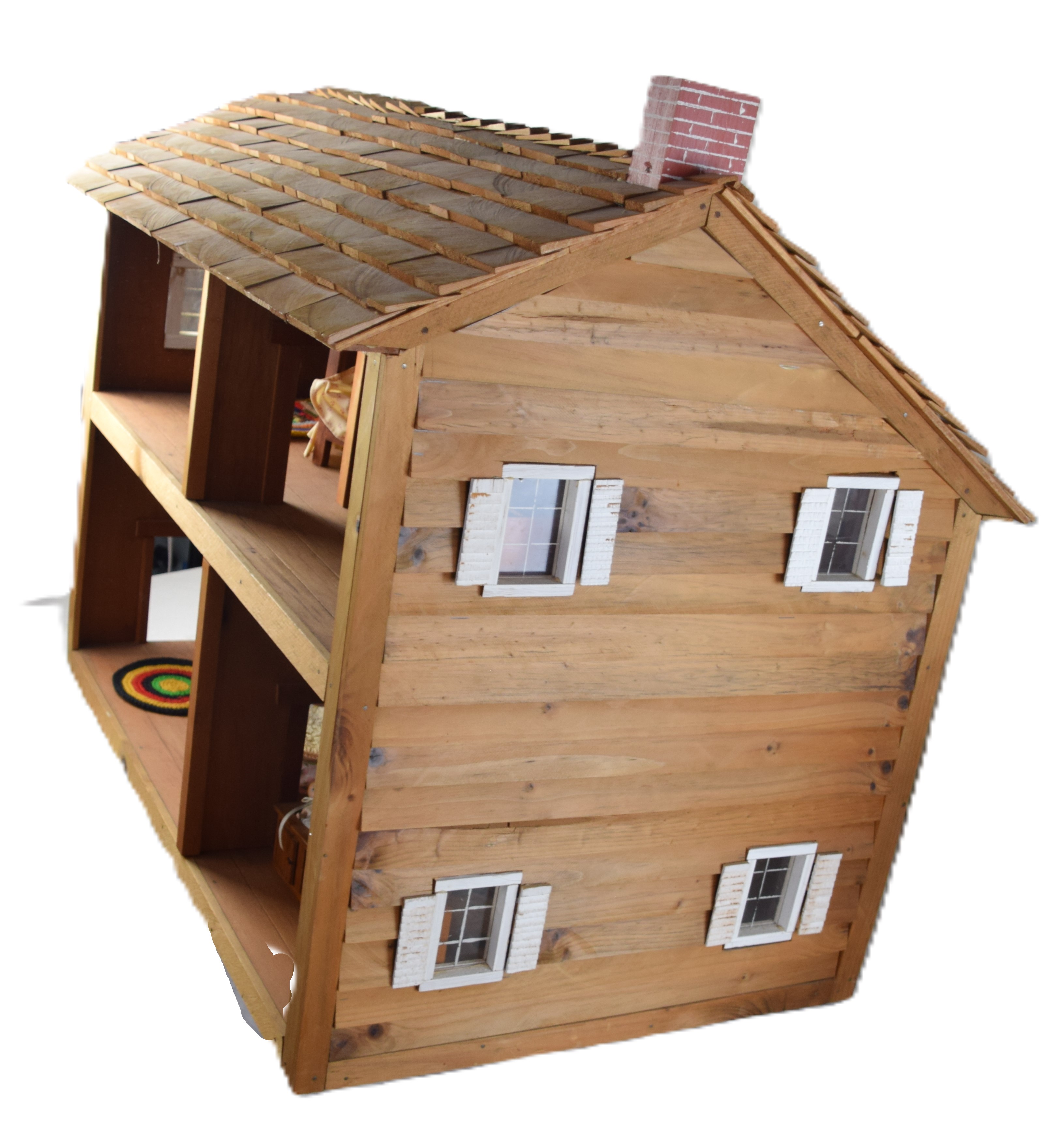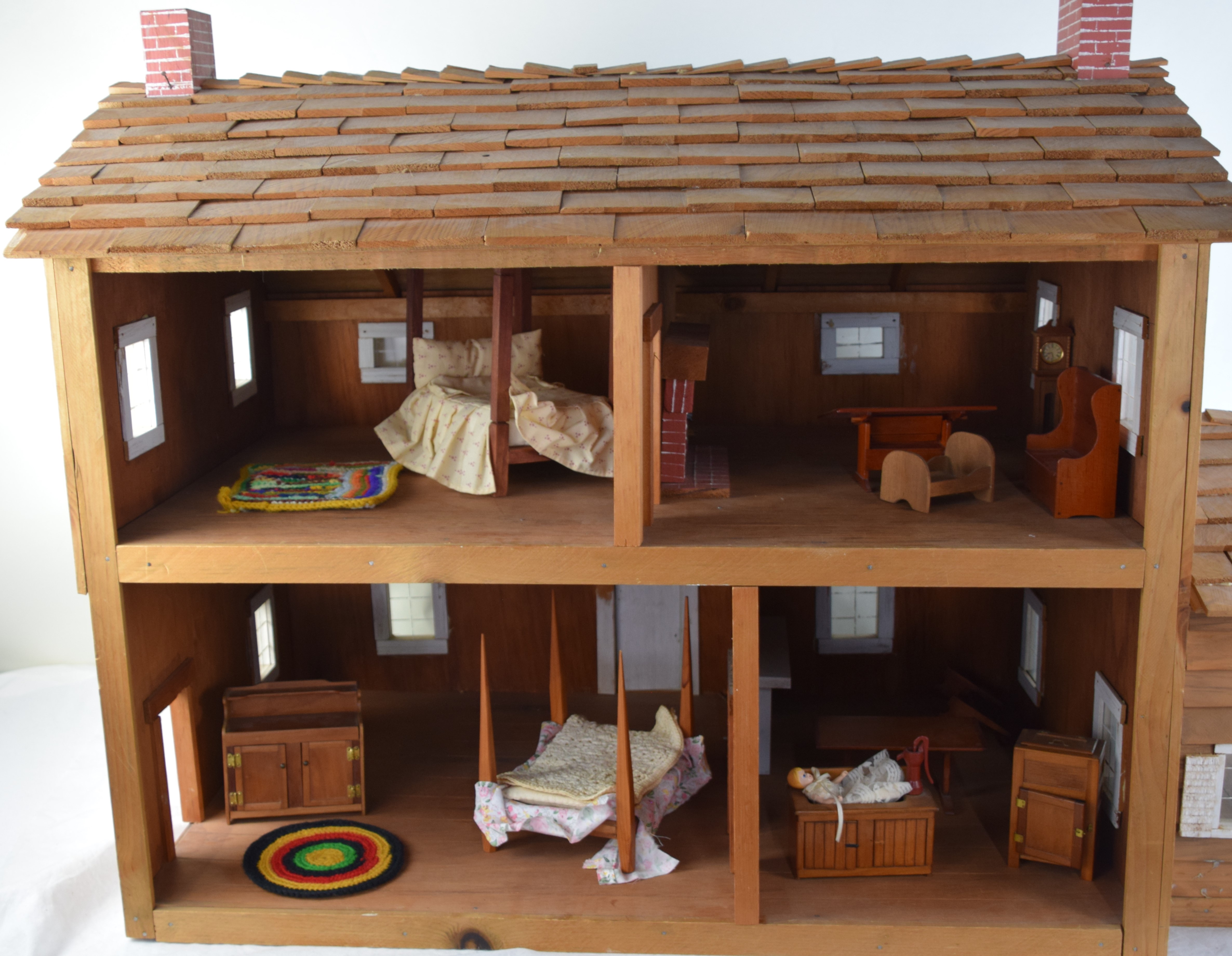 Fine large carved wooden doll house with shingle roof, 4 large rooms, attached garage with loads of doll house accessories to include Windsor back chairs, hutch table, grandfather clock canopy bed and much more. Dimensions: 30″ H x 48″ L x 25″D