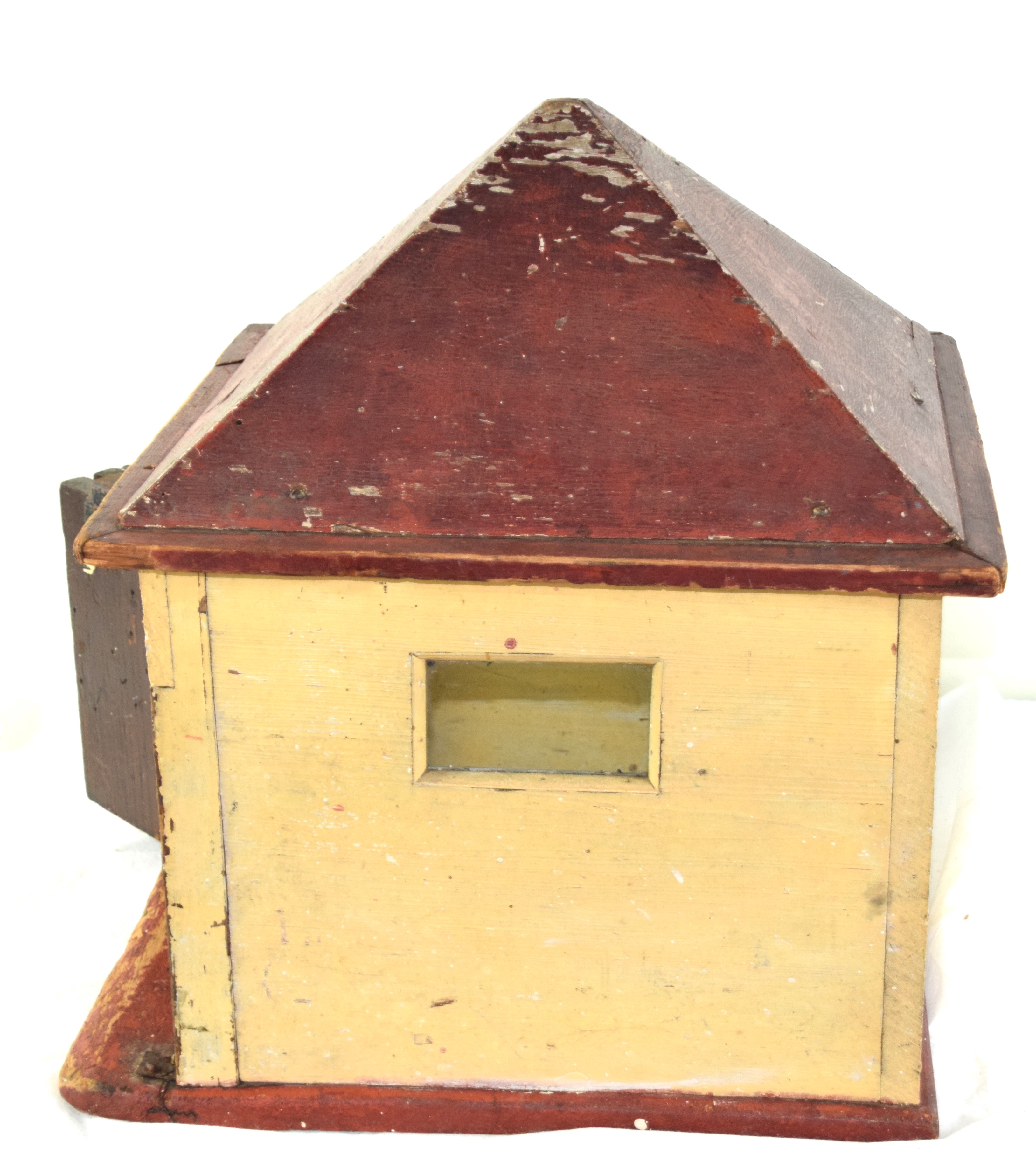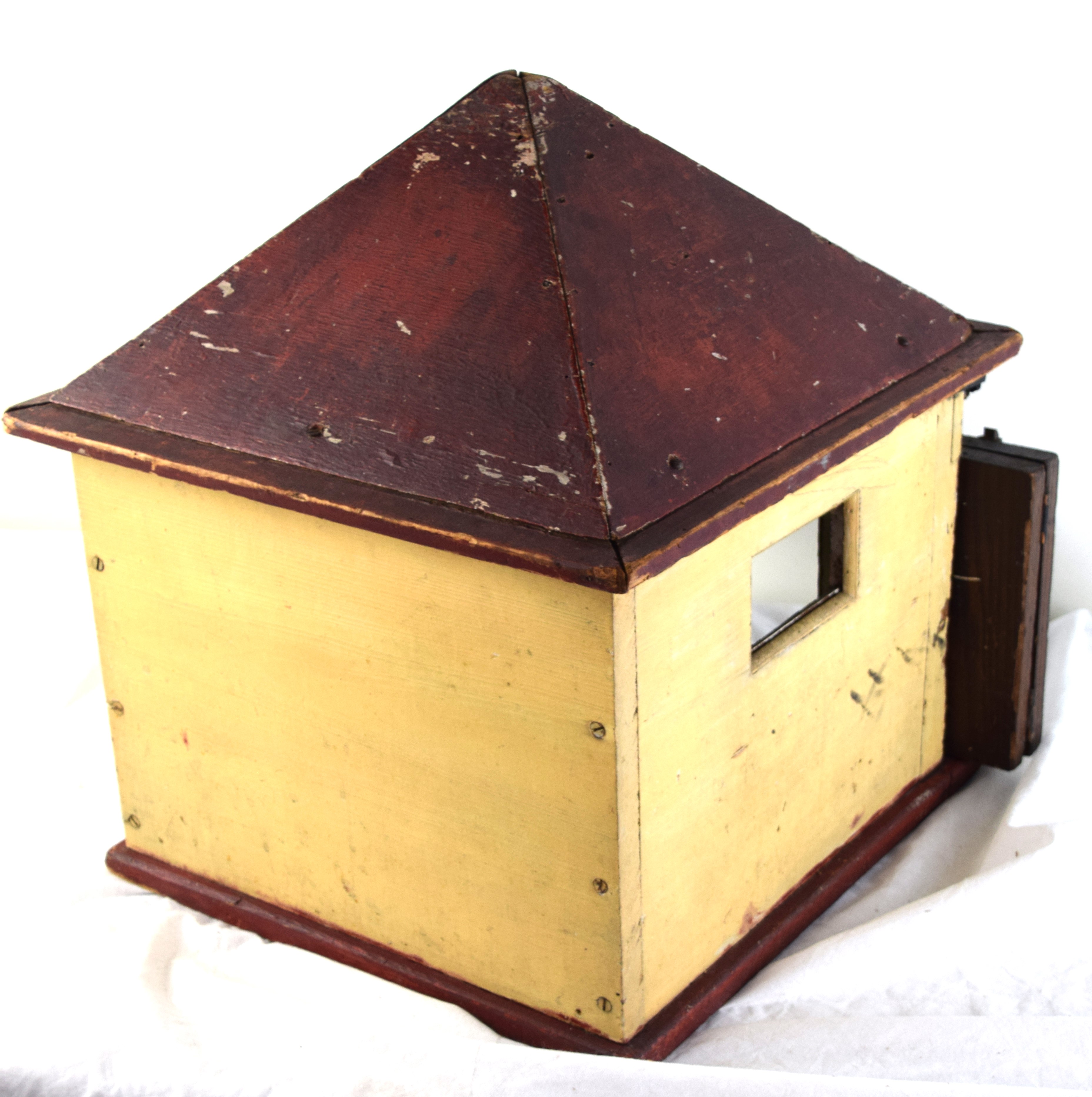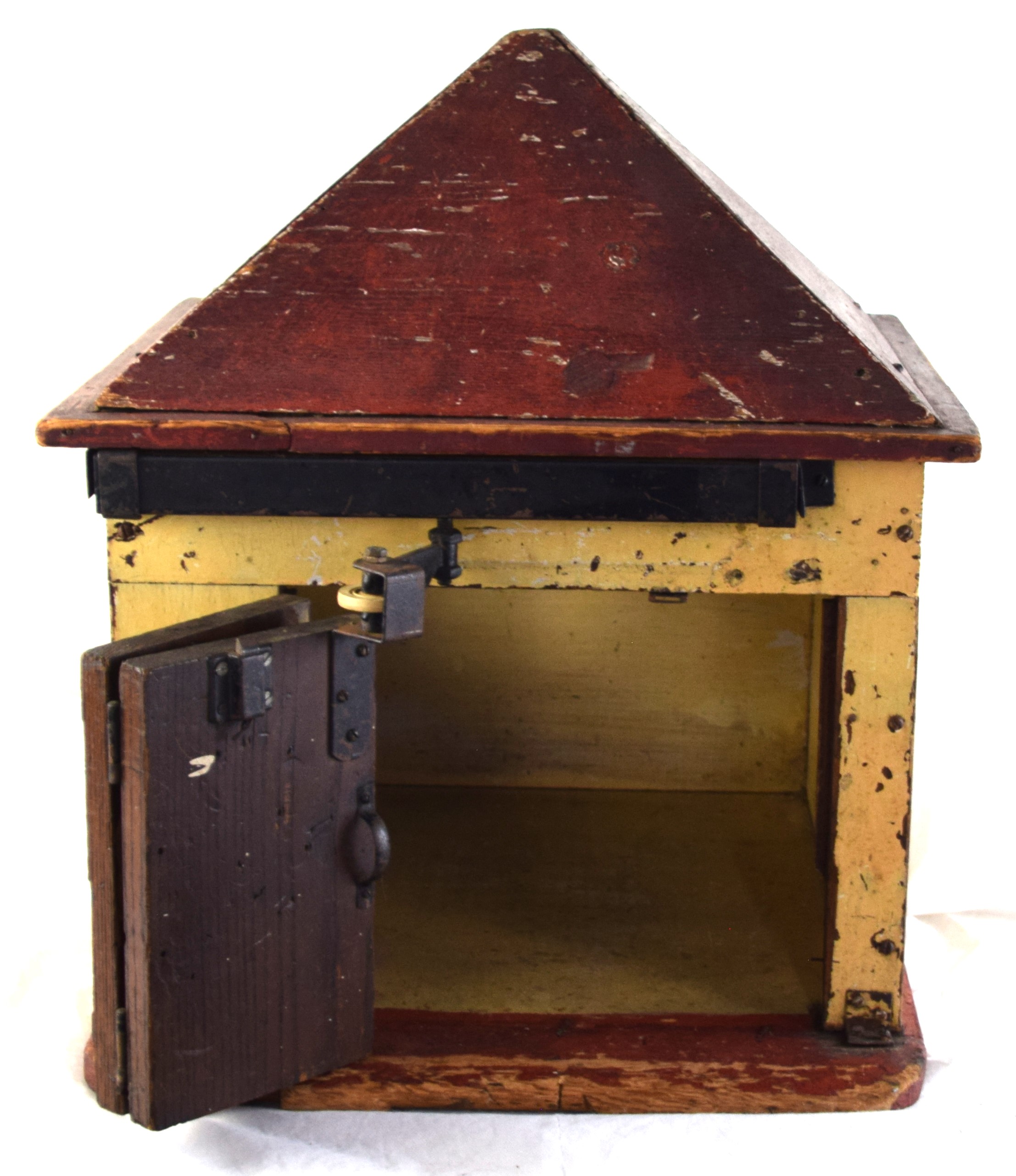 Carved wooden dolls garage with a swinging mechanized door. Dimensions: 25″ H x 17″ W x 19″D