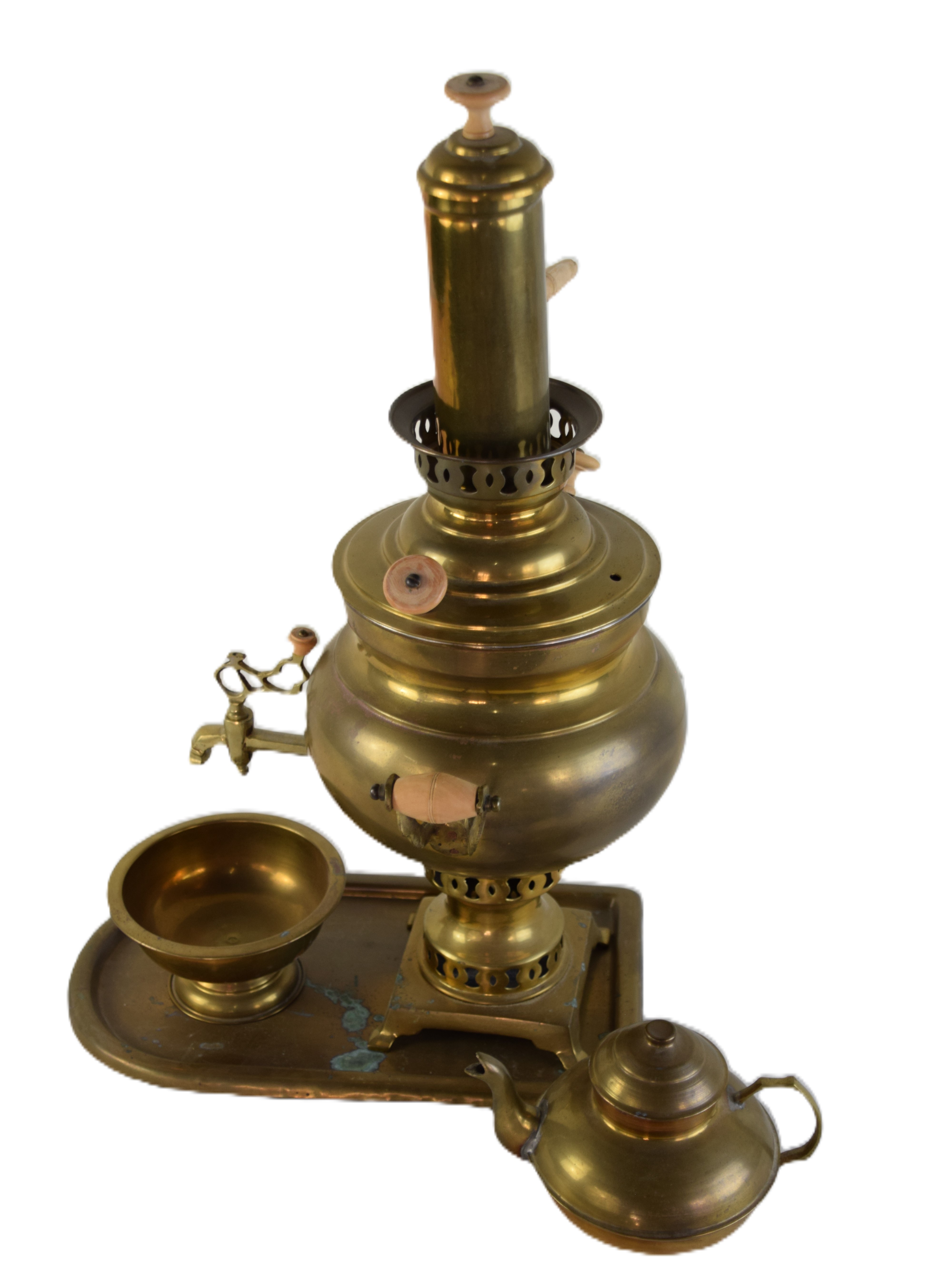 Brass Russian samovar early 20th century with teapot, urn bowl, cannister and under tray. Dimensions: 19″ H