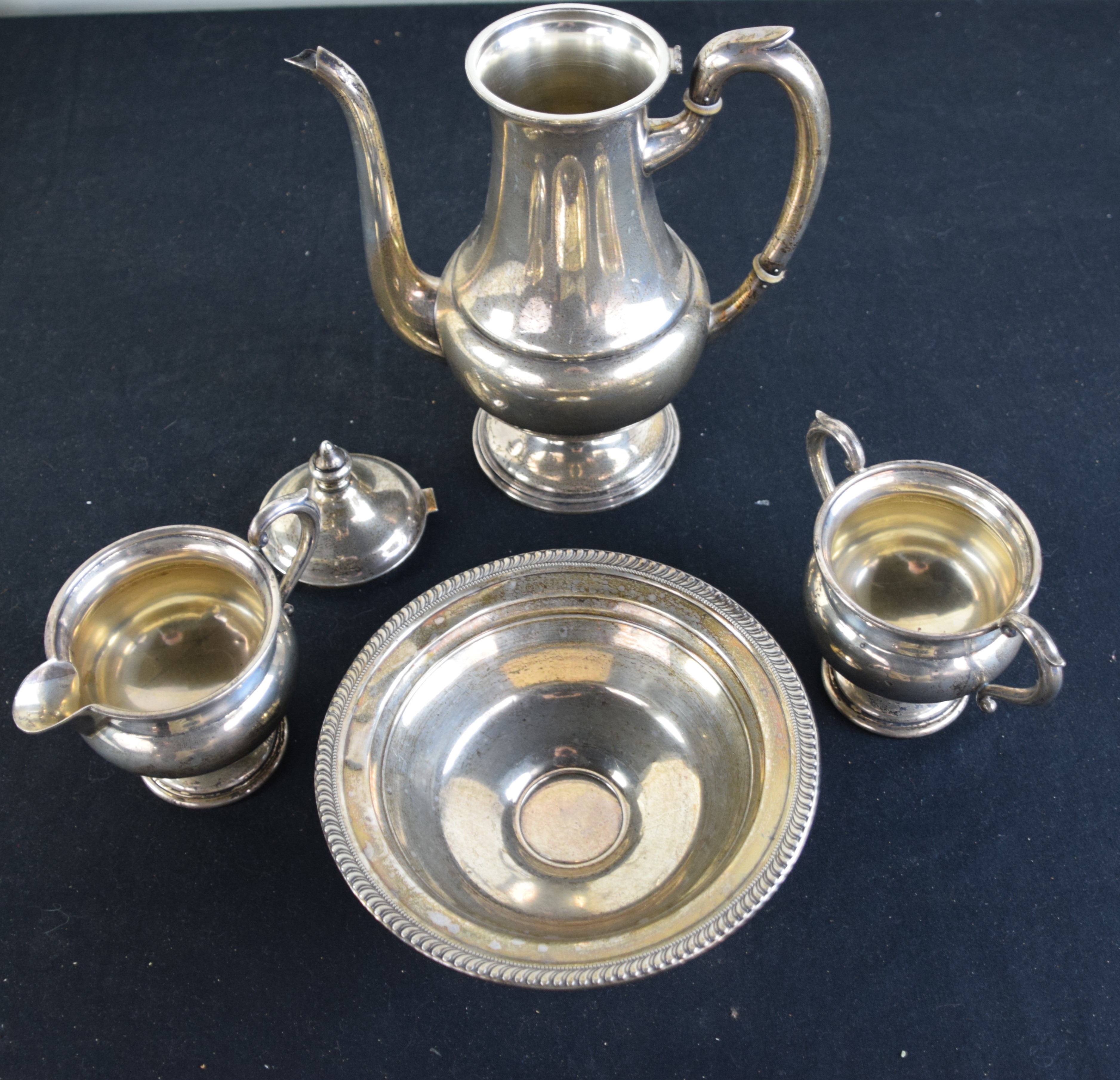 Three piece Sterling silver tea set to include: tea pot (10.5″ H), creamer and sugar (Each 4″ H). Also included is a Sterling silver weighted compote (7″ Diameter). 24 Troy Oz. of weighable silver