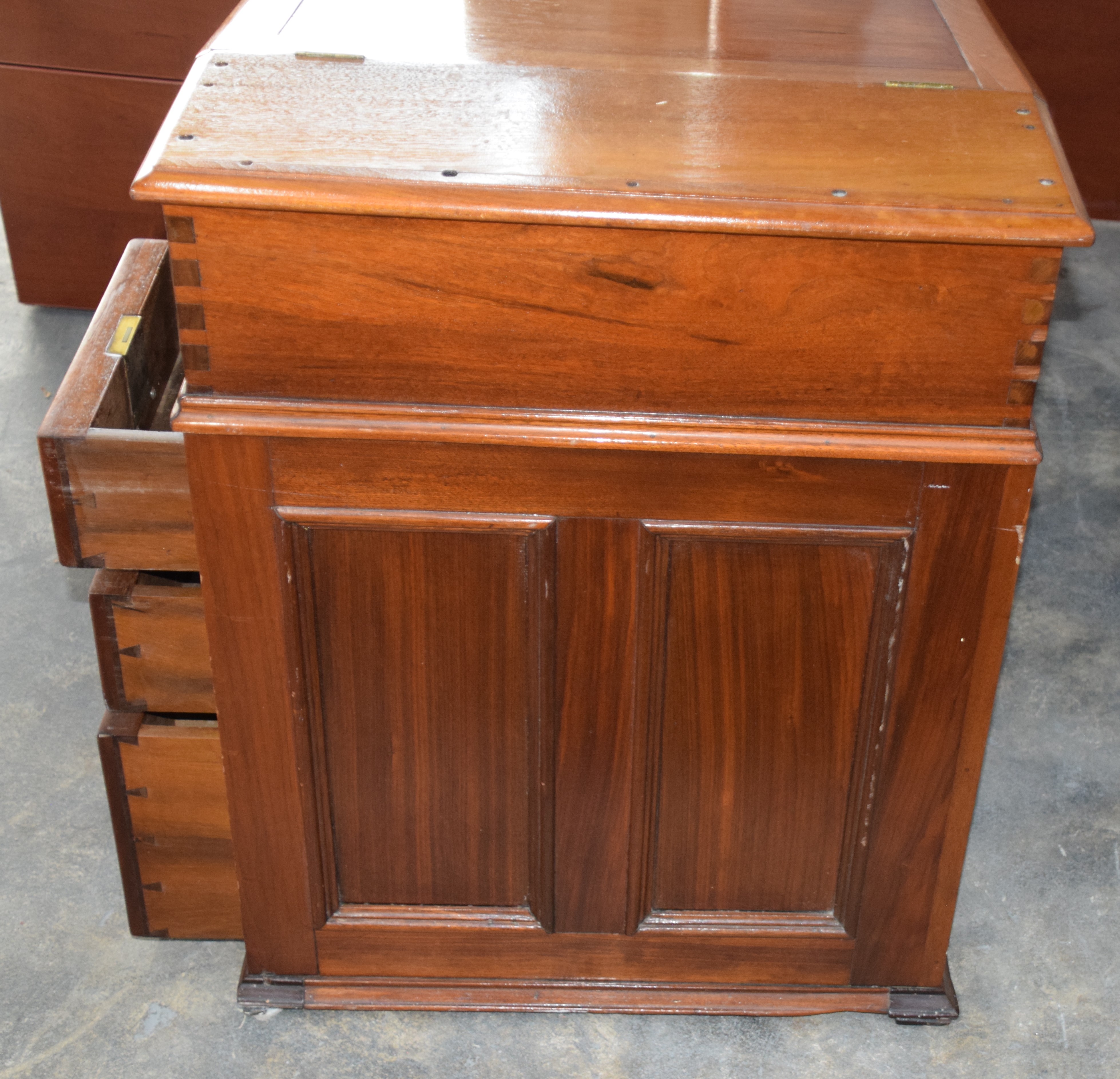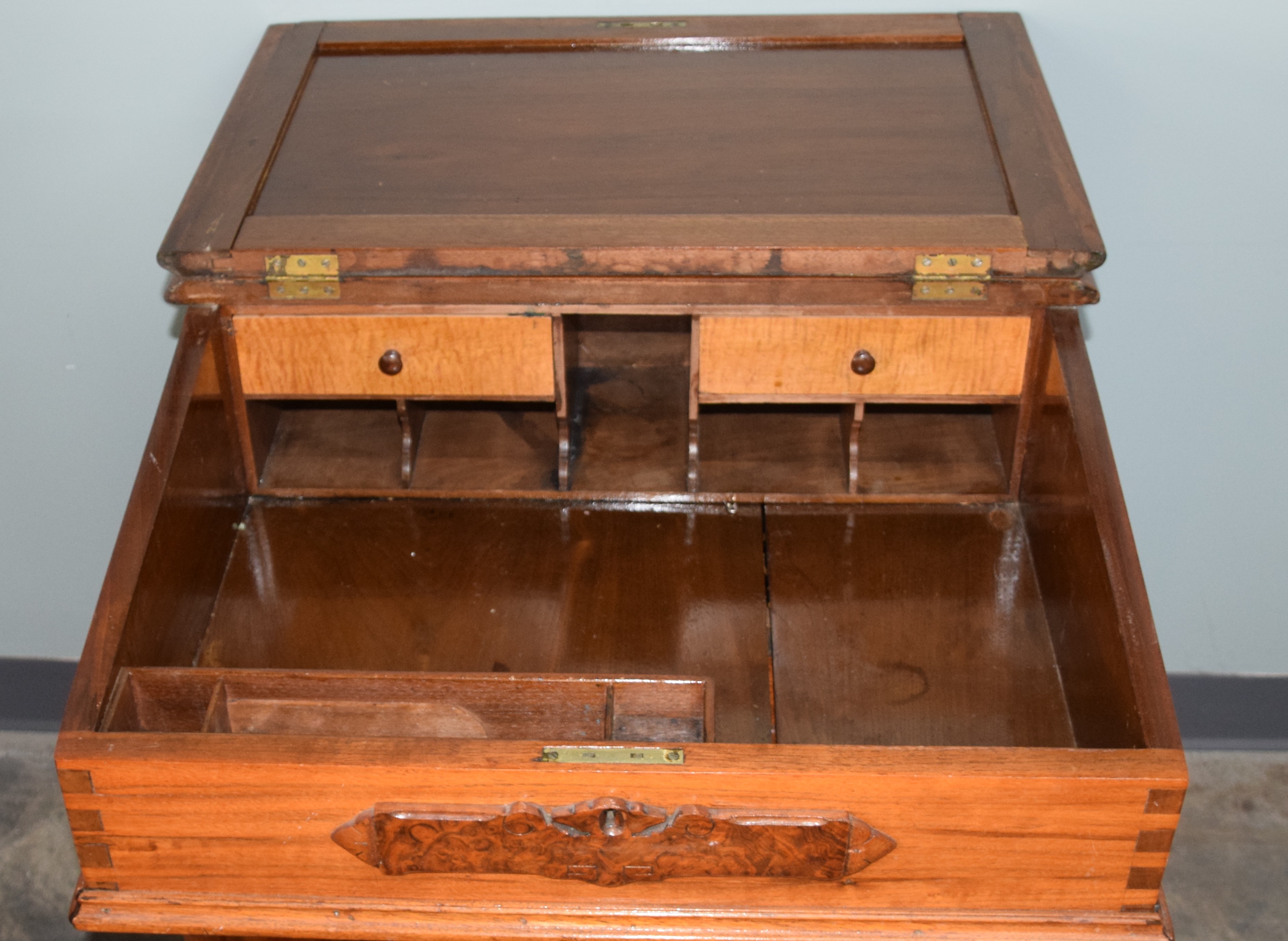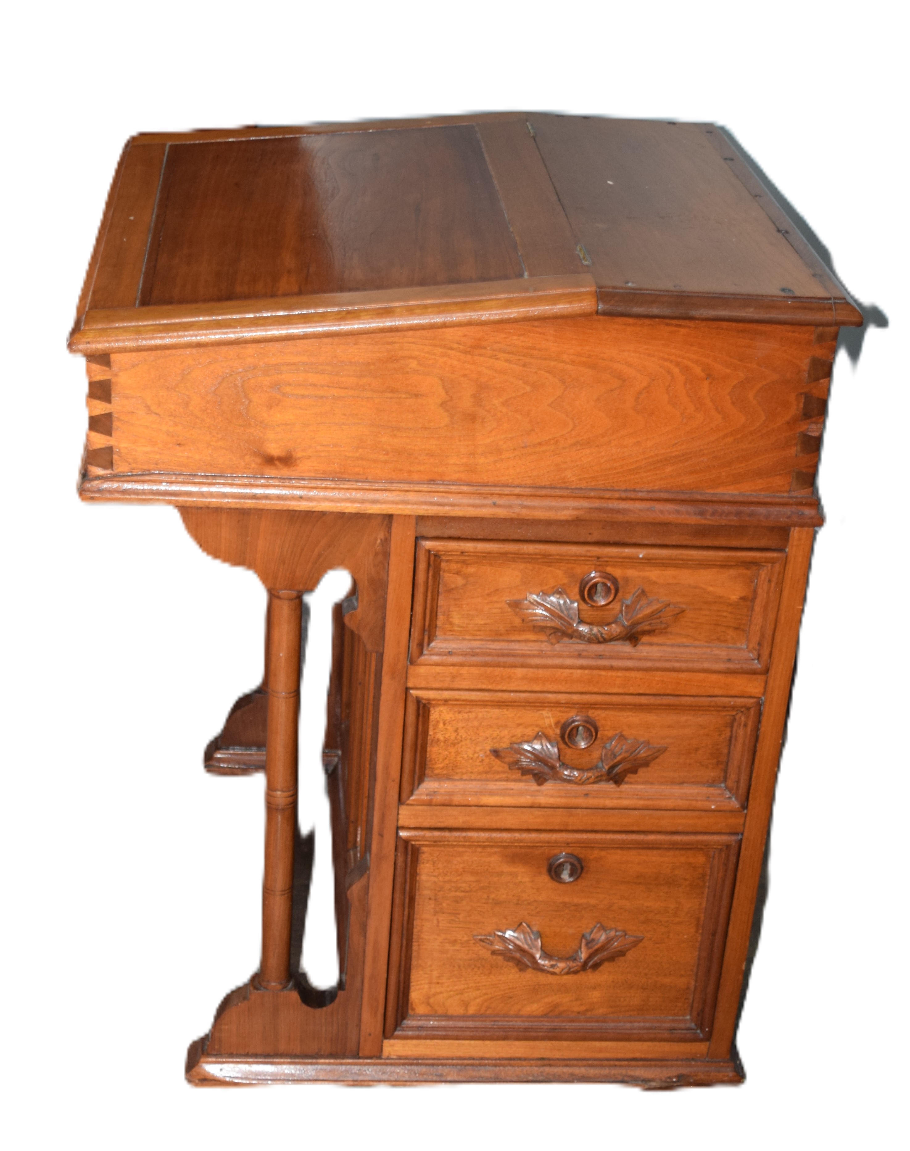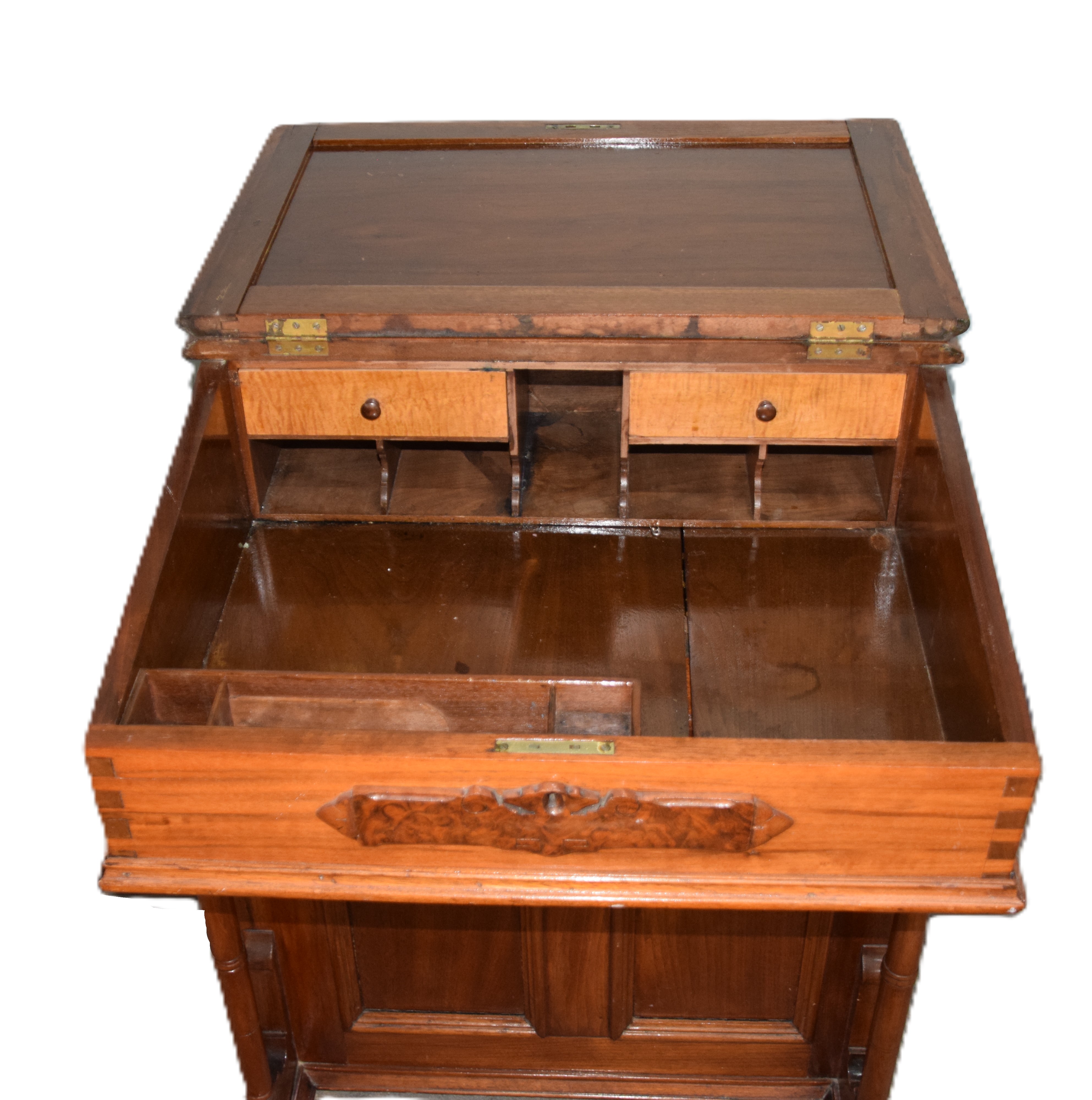 Mid 19th century walnut Davenport desk with lift top lid, interior with two tiger maple drawers, pigeon holes, and pen and ink slot, carved front escutcheon, 3 side drawers with carved pulls, dovetail case, carved support columns on carved feet, paneled front and side. Dimensions: 32″ H x 25″ L x 24″ D