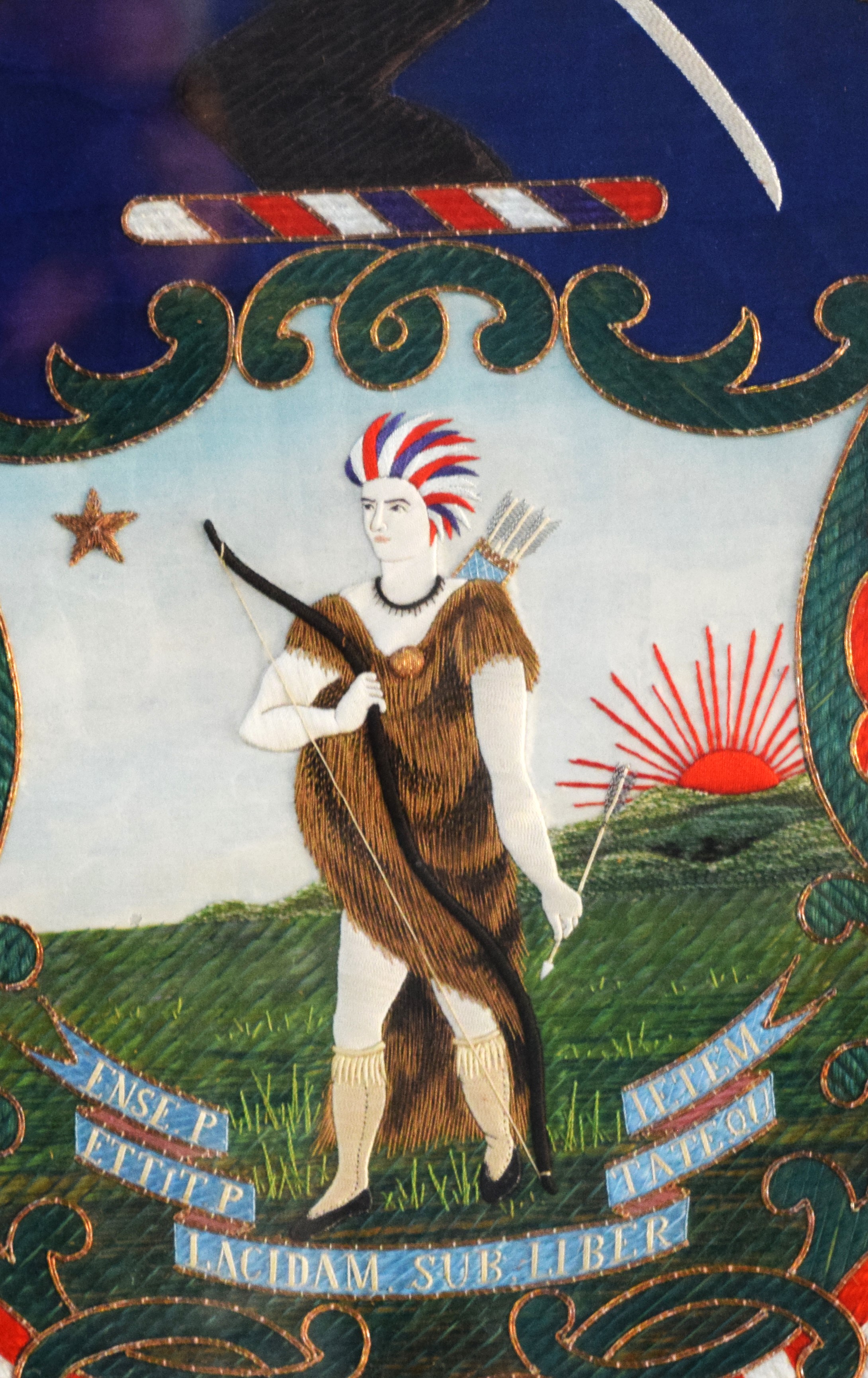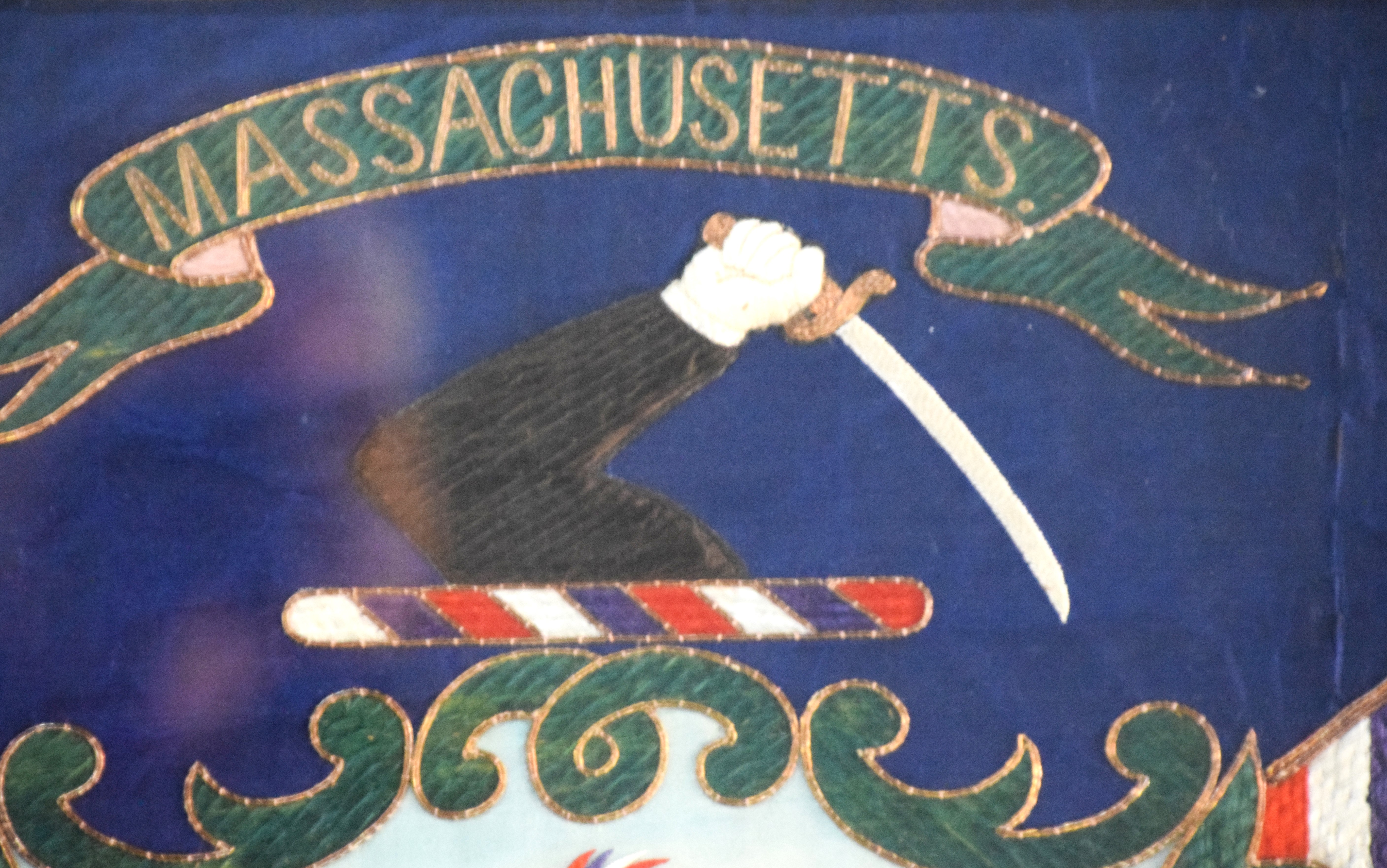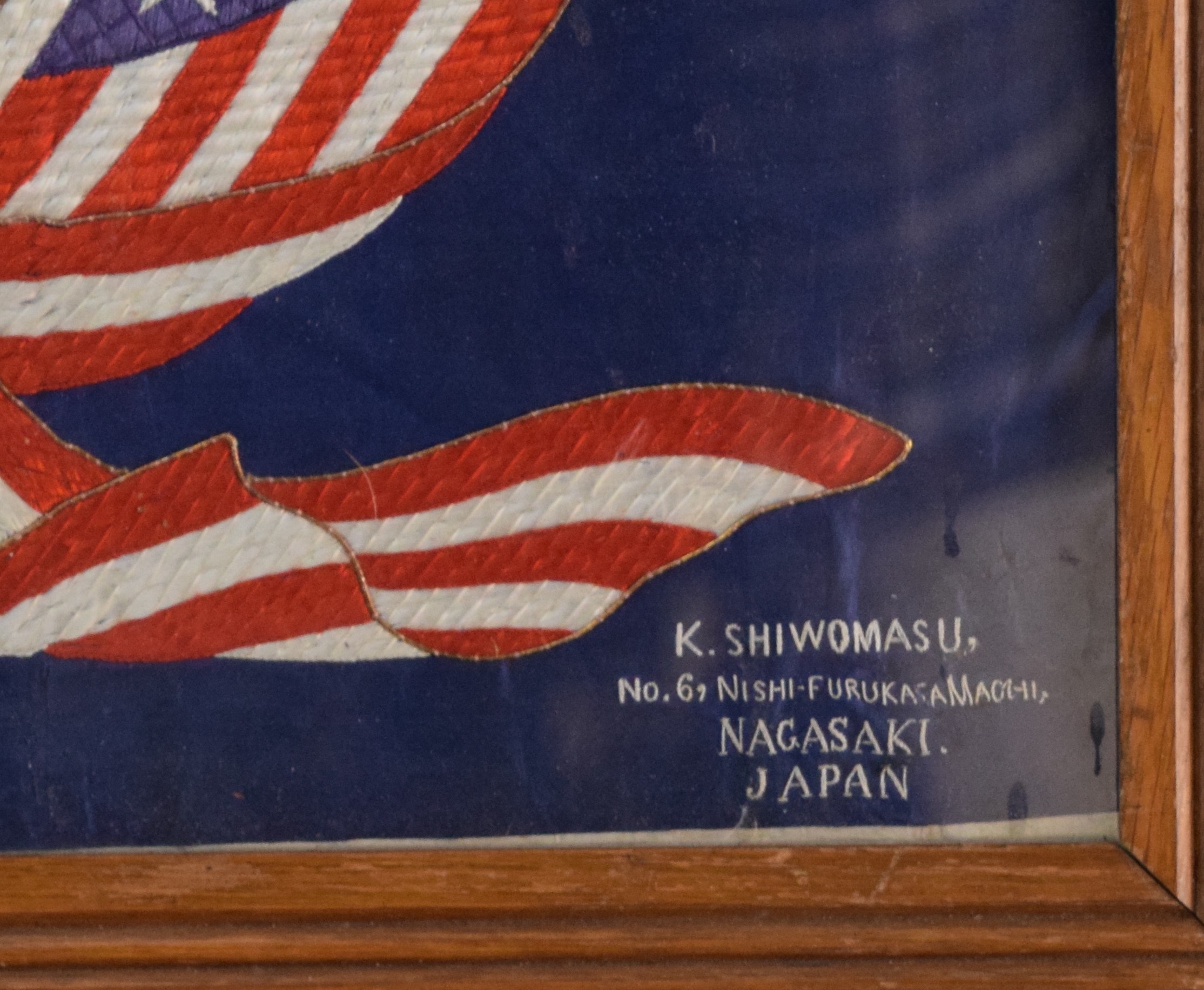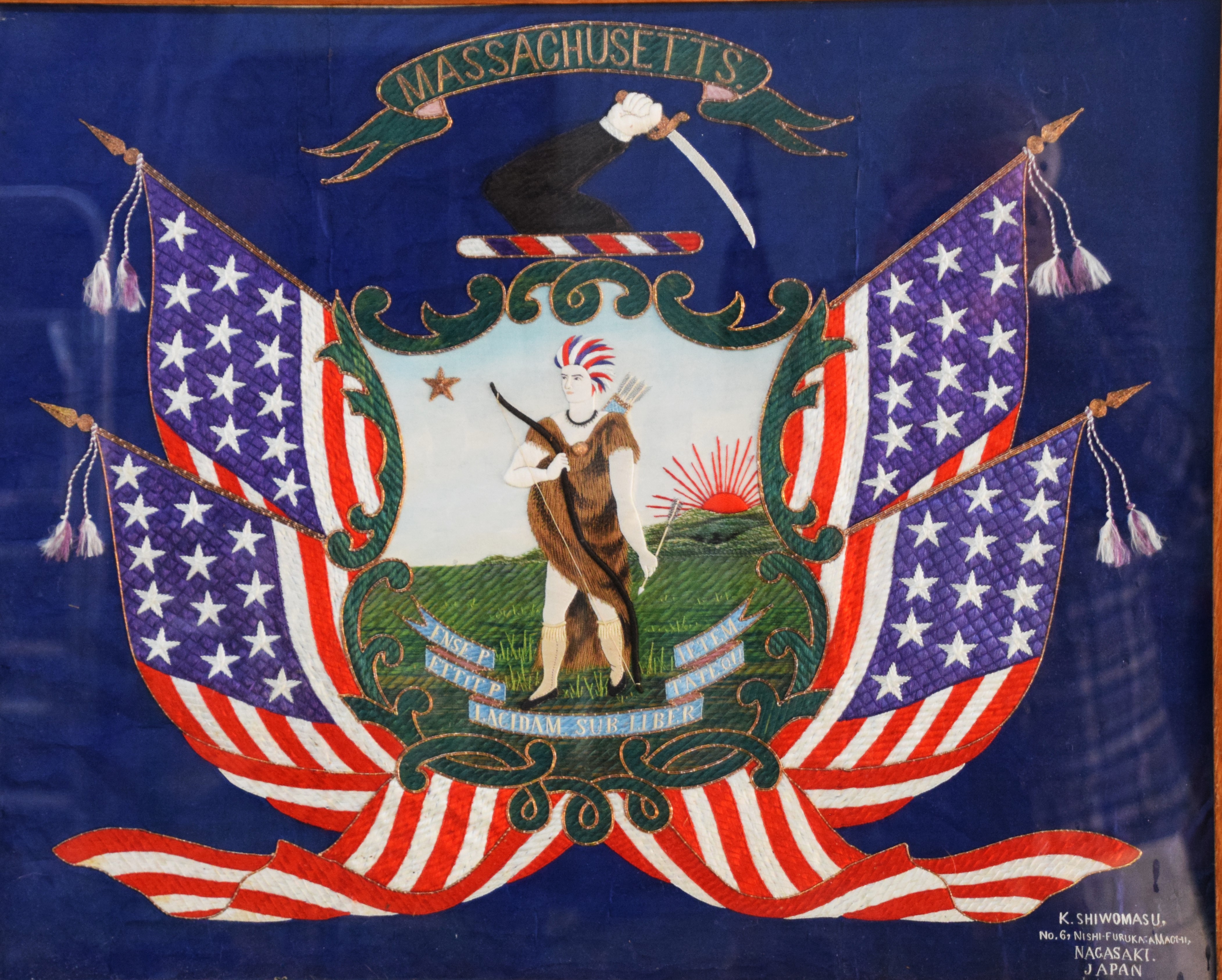 Framed Japanese embroidery circa 1900-1920, of the Great Seal Of Massachusetts with motto “By The Sword We Seen Peace But Only Under Liberty”, made by K. Shiwomasu of Nagasaki Japan. Dimensions 20.5″ x 26″