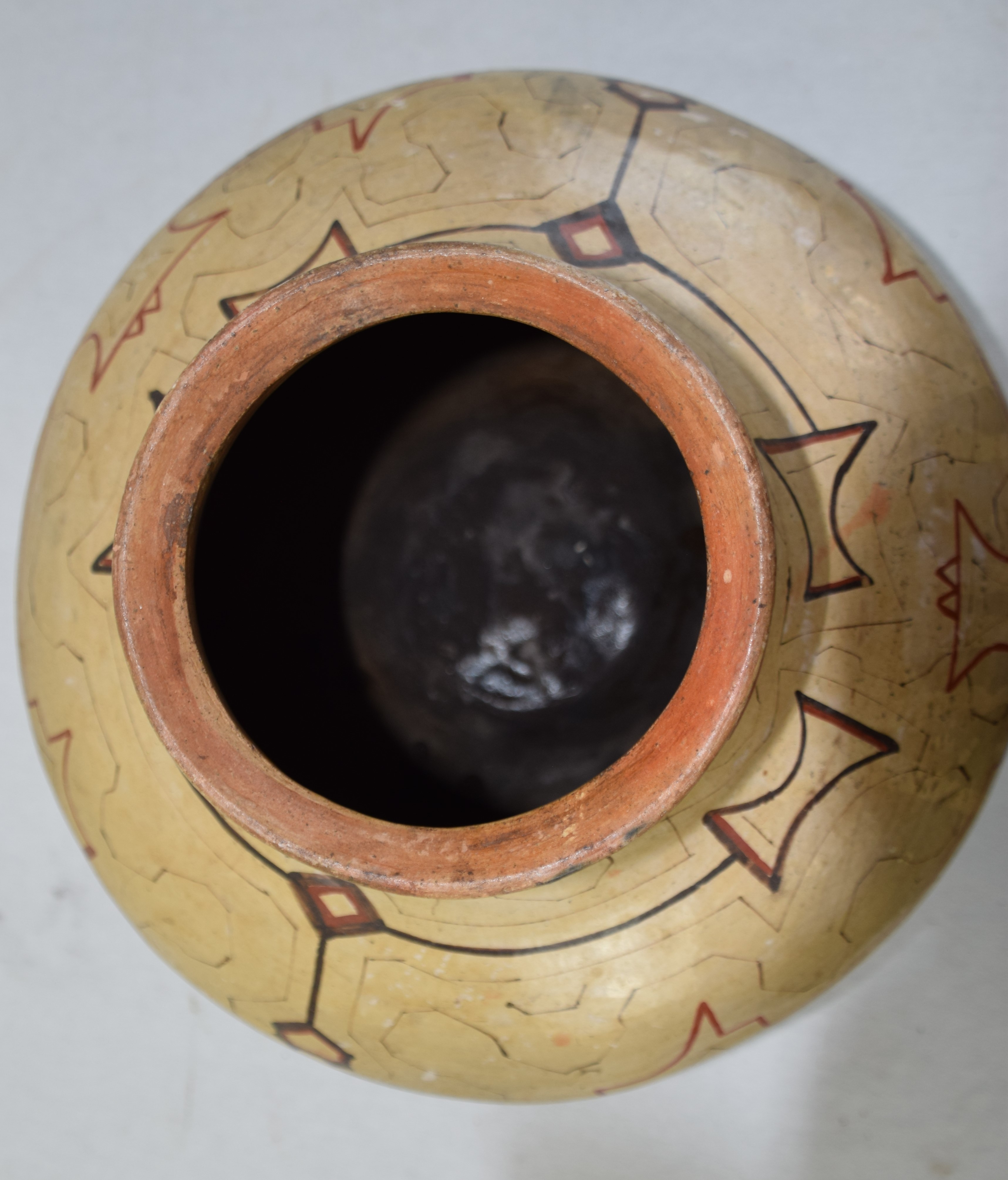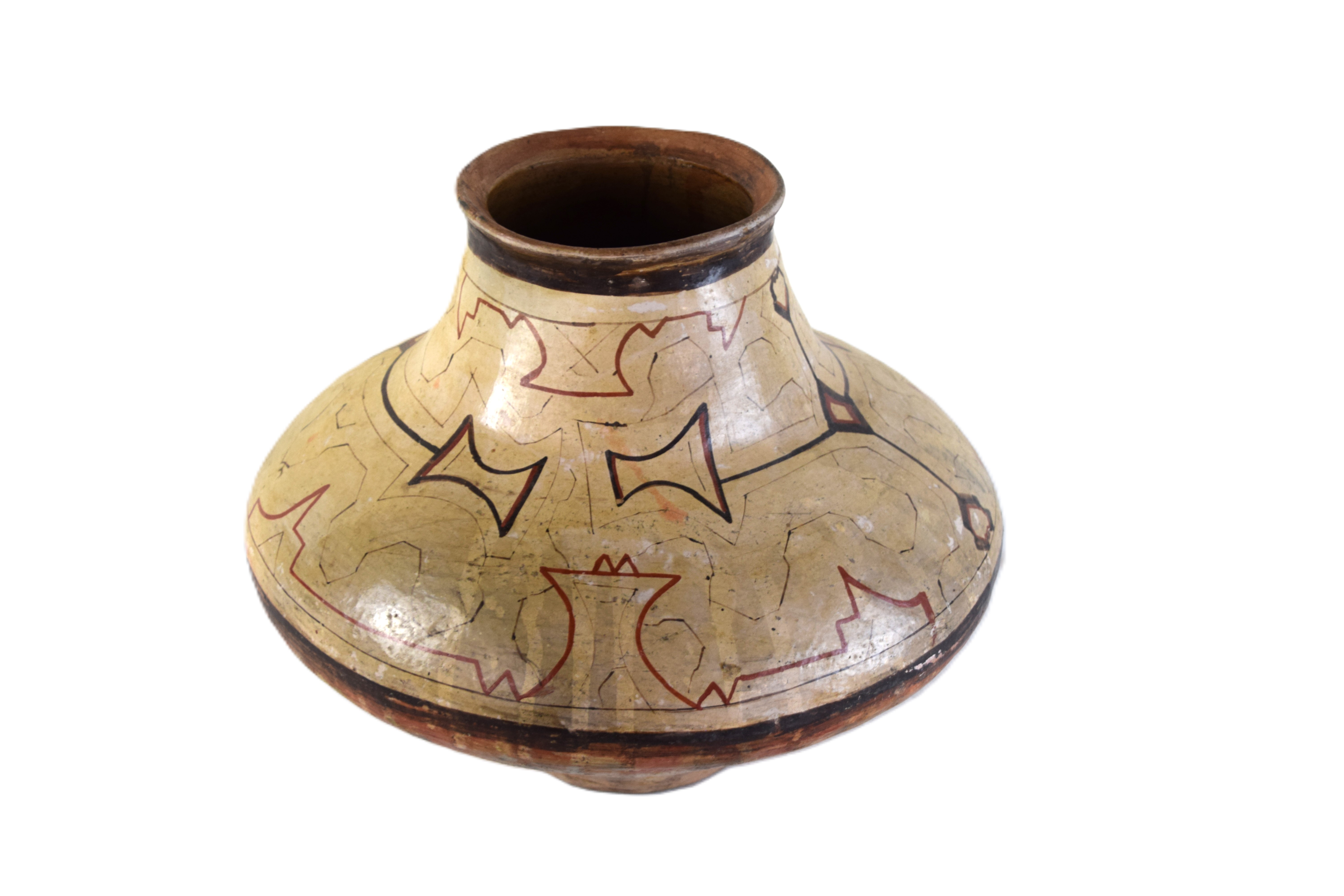 Peruvian Shipibo pottery vessel in a bulbous form with all over designs, all hand crafted by Shipibo-Conibo people. Dimensions: 12″ H x 15″ W