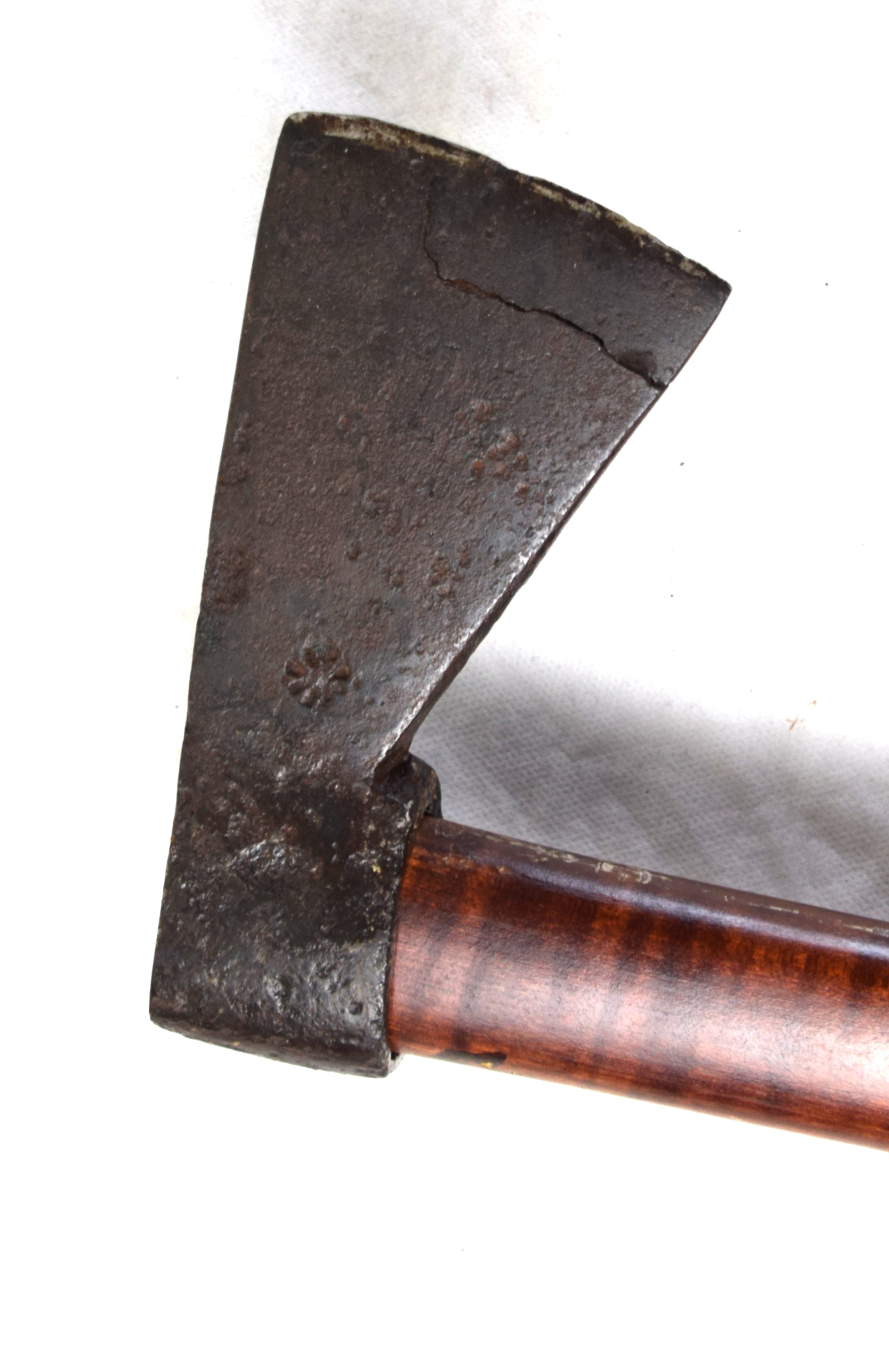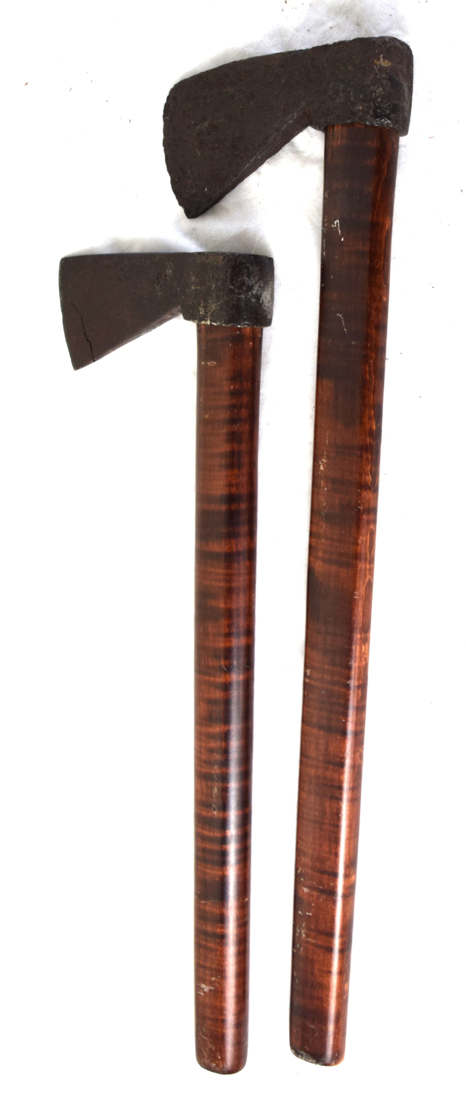 Two Revolutionary War belt axes with blacksmith marks and with replaced but attracted tiger maple handles. Dimensions: 6″ and 6.5″ Axe L
