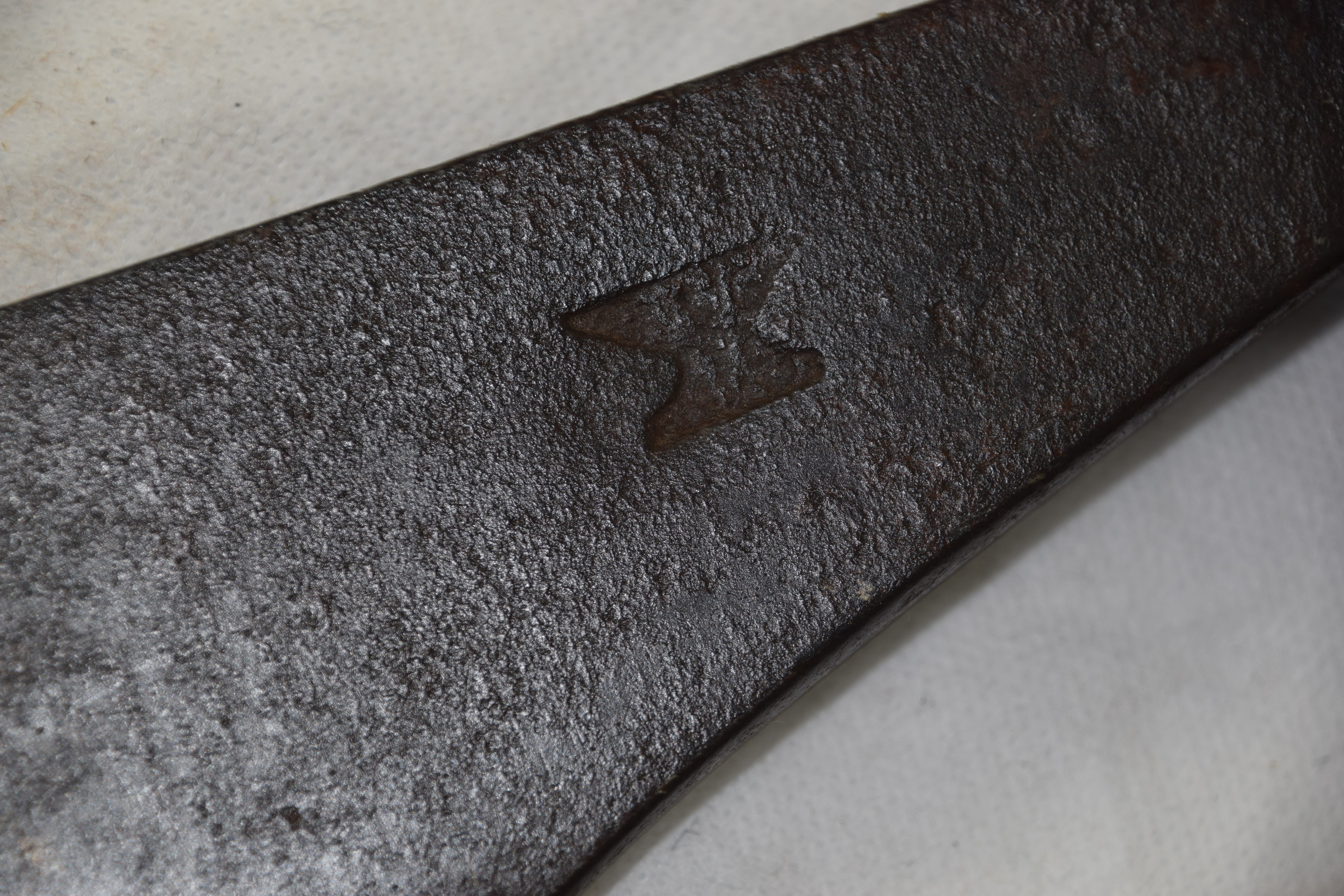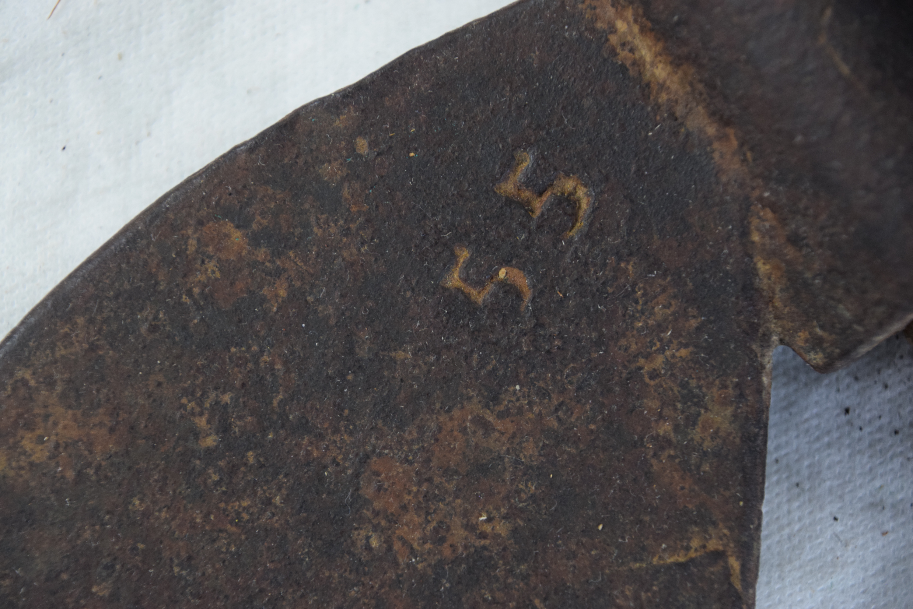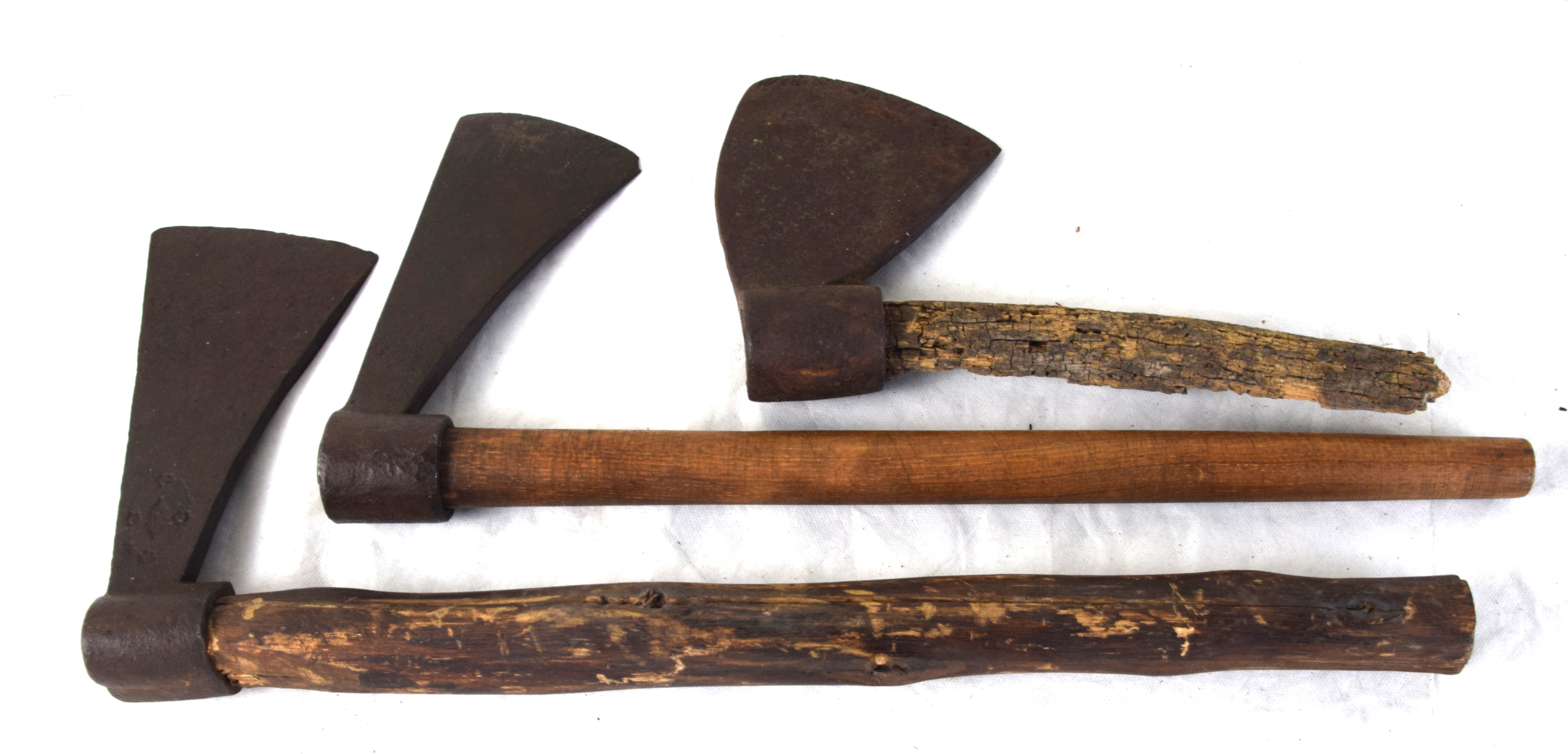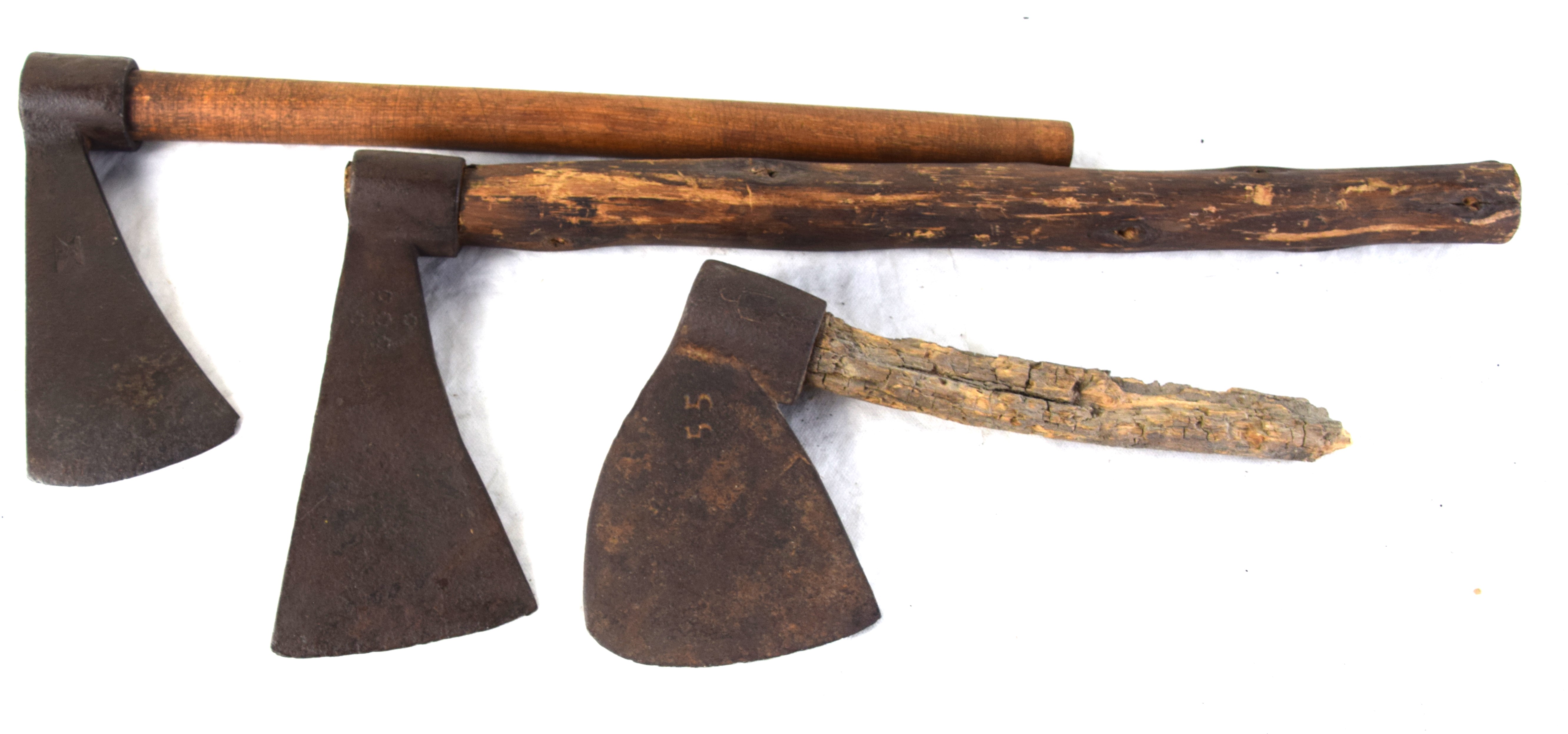Three early rifleman’s belt axes, one marked “55”, the other two have blacksmith marks. Dimensions: 6″ to 8″ Axe L