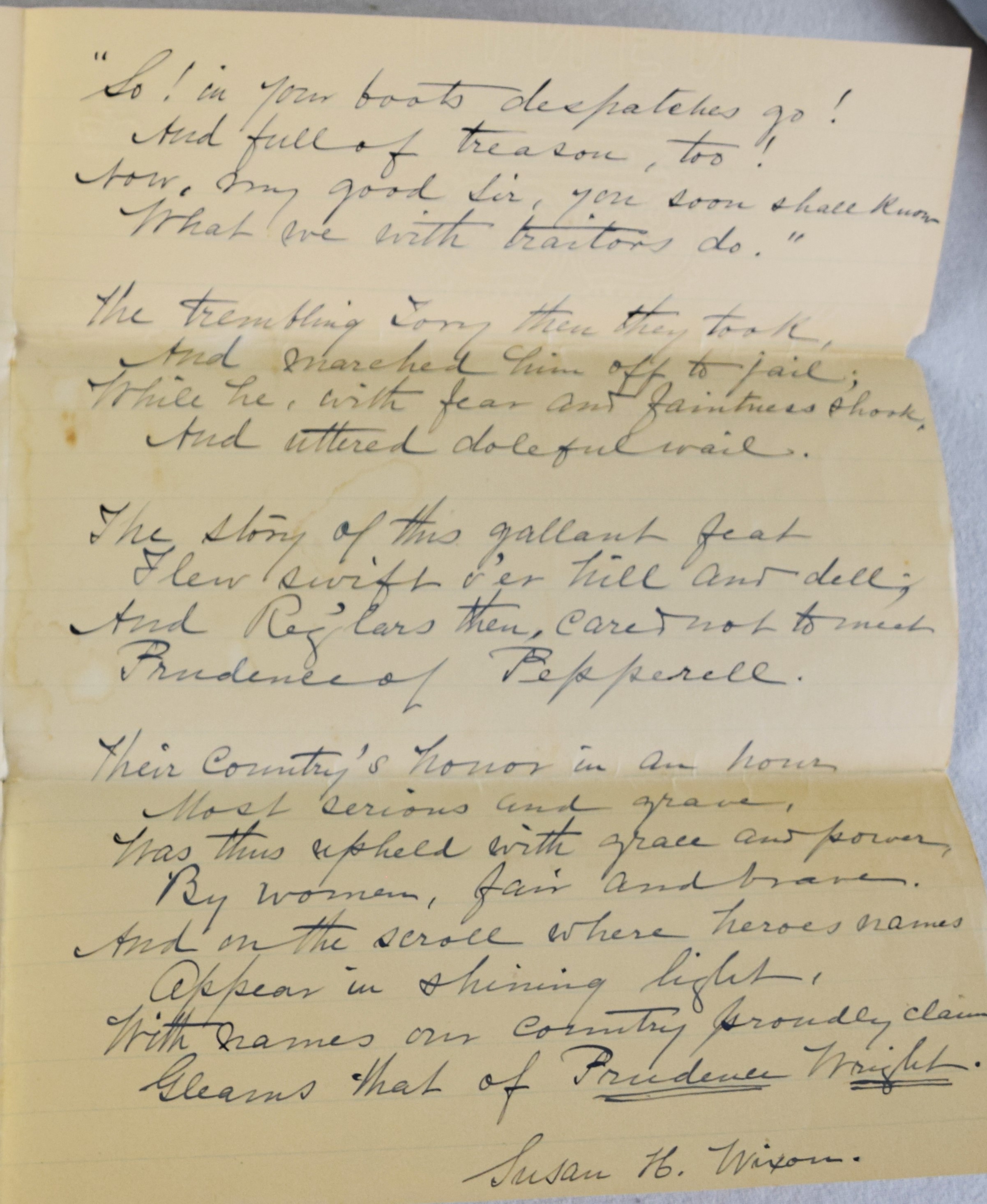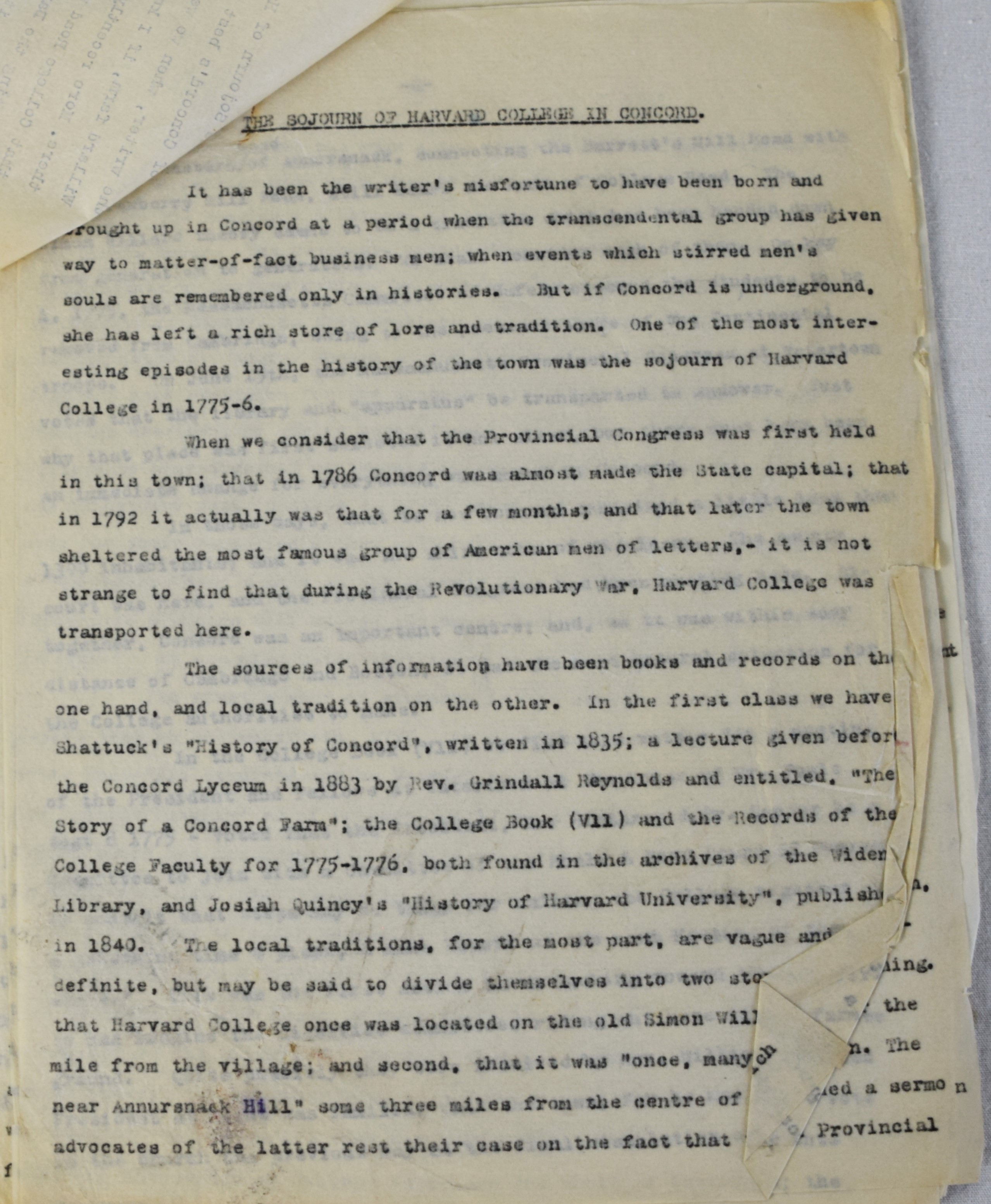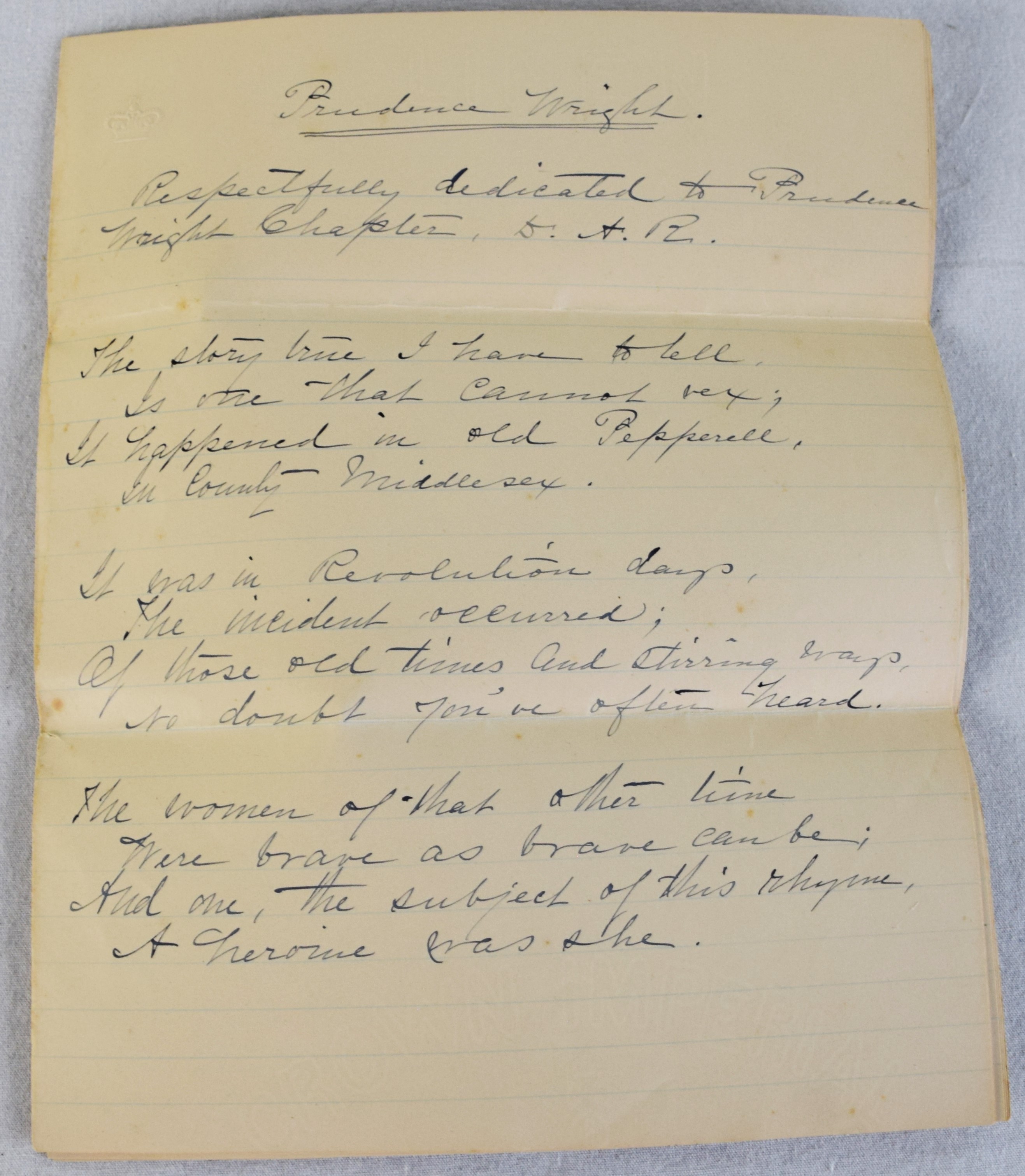 Three historical reports to include a DAR poem about Prudence Wright and her fellow women who defended a bridge against the Redcoats written by Susan H. Wixon from Fall River Ma. Also a report titled “The Sojourn Of Harvard College In Concord” (23 pages but missing pp15-18) discussing Harvard College redeployment to Concord during the Revolutionary War. Also included is an early report on “Relics of Indians” (17ppg).