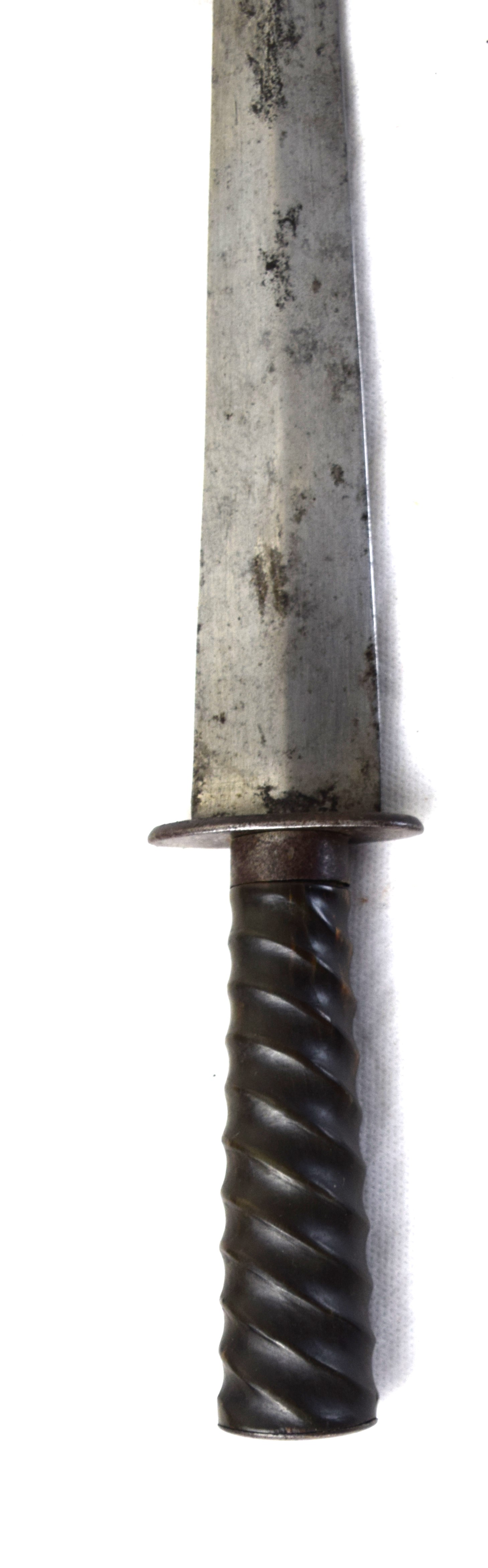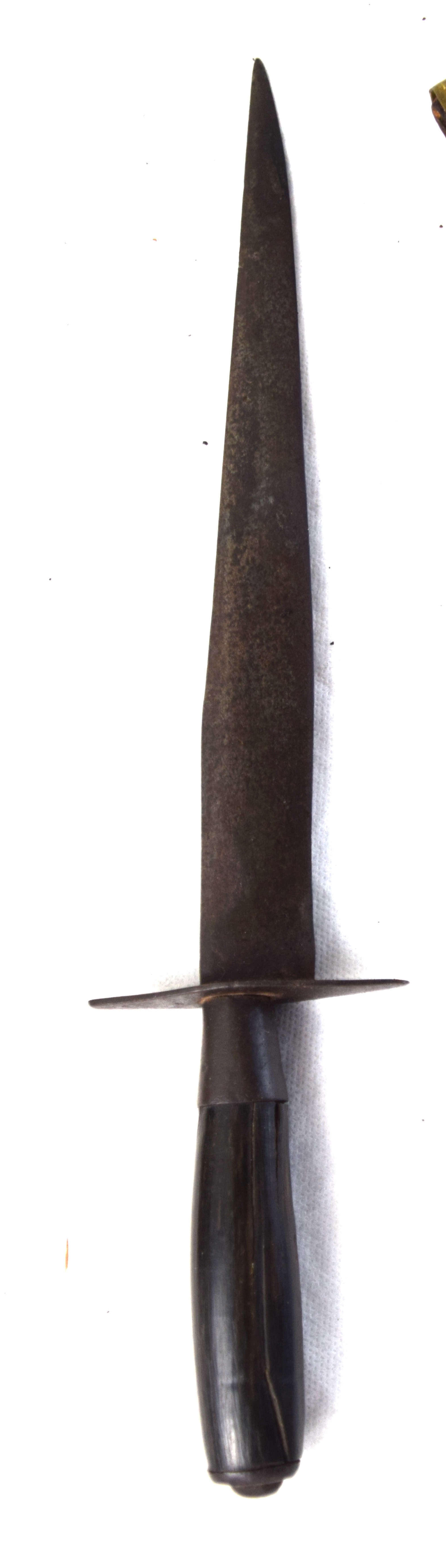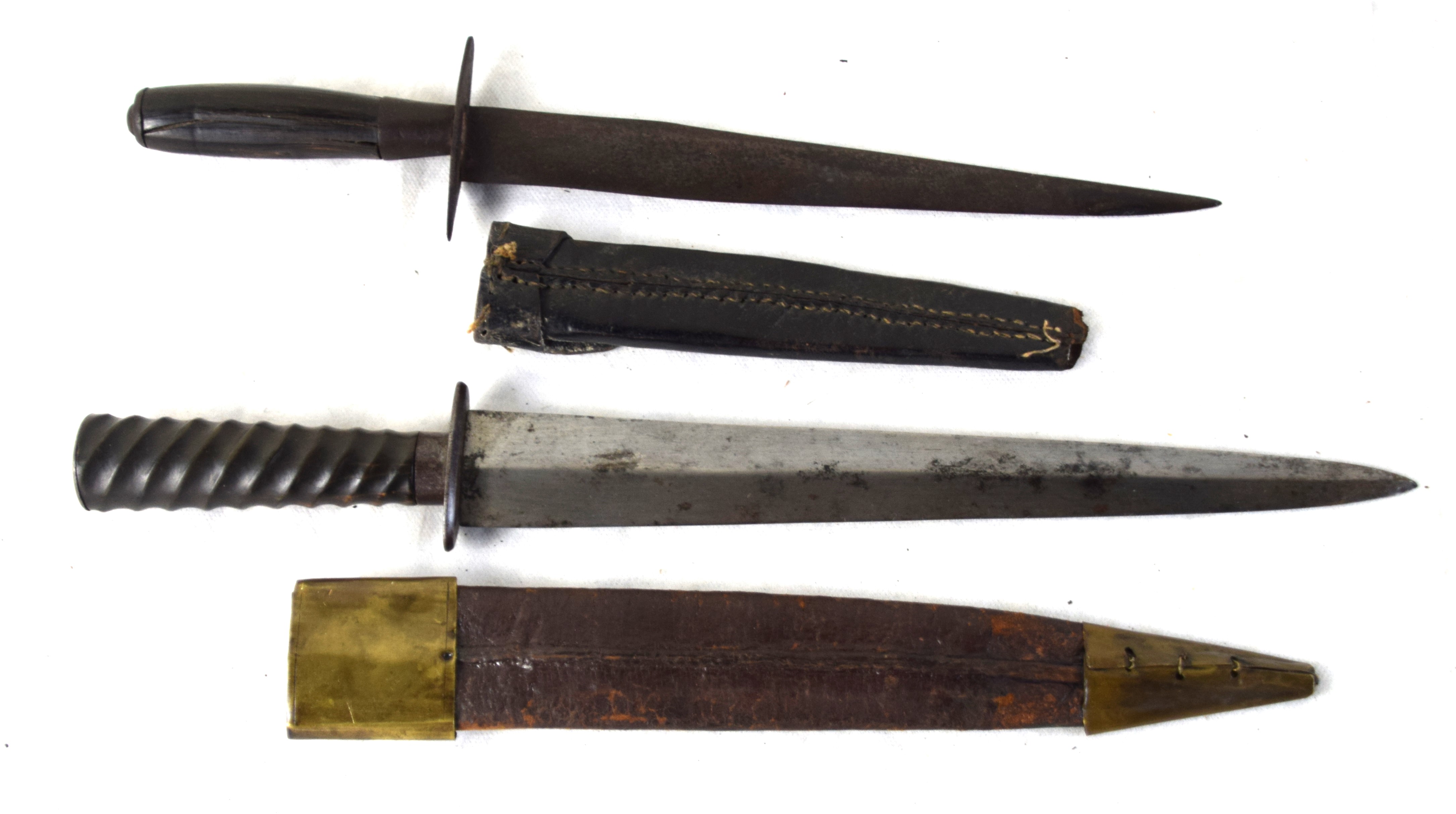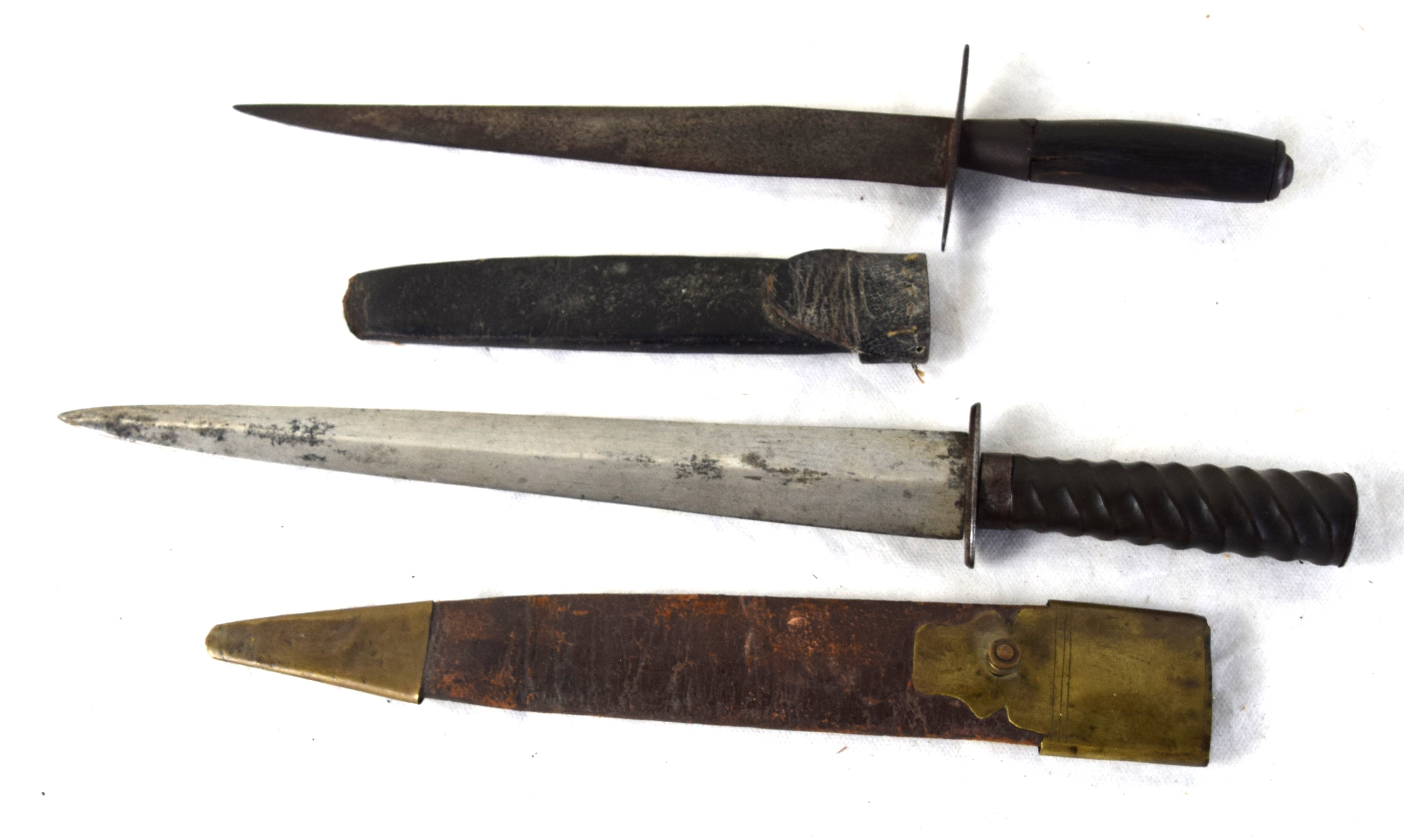 Two early American dirks one with civil war era scabbard. One with carved grip (10.5″ Blade, 15″ Overall) and the other a wood grip, crude knife, a product of an early colonial blacksmith (9″ Blade, 12.5″ Overall).