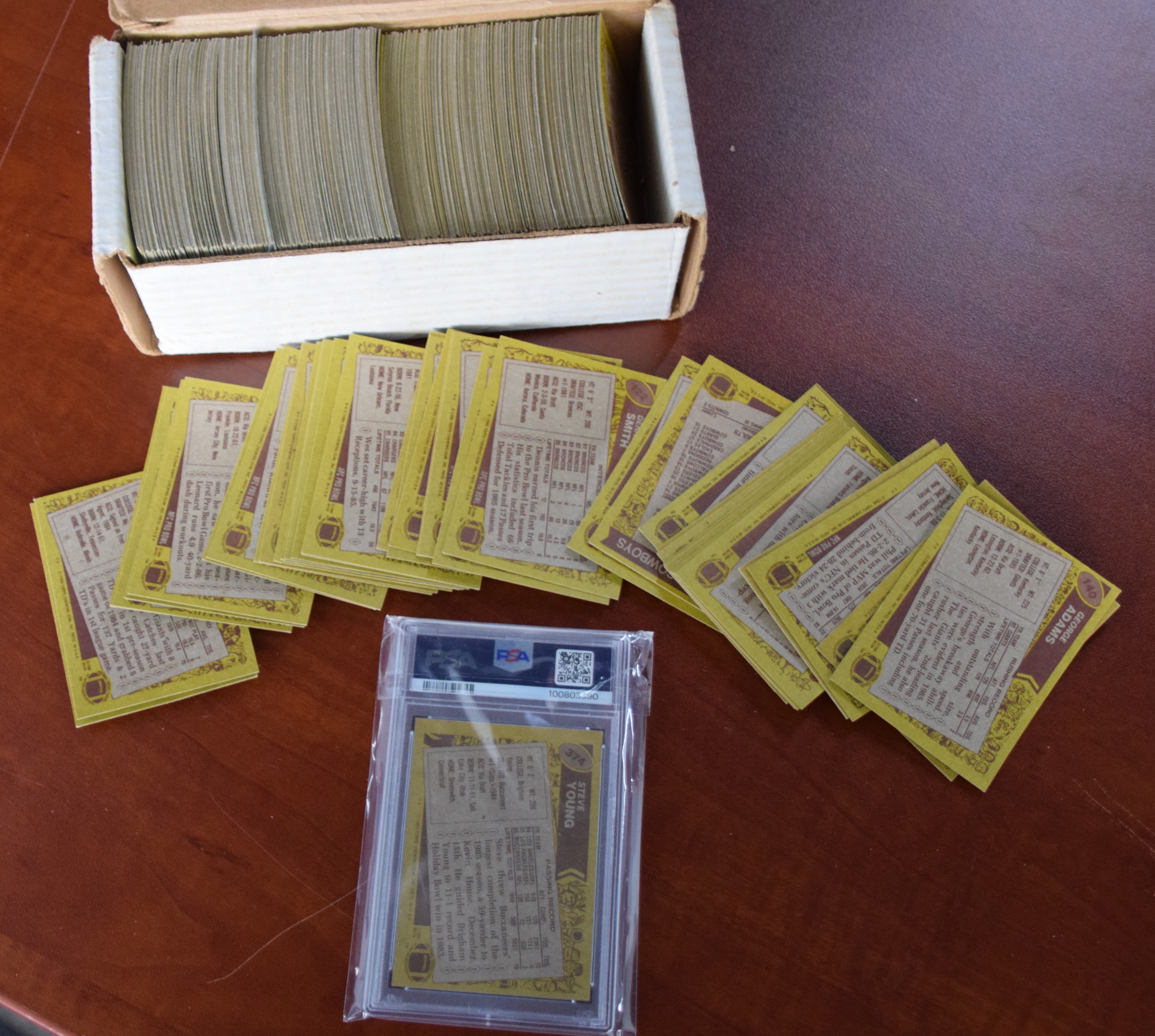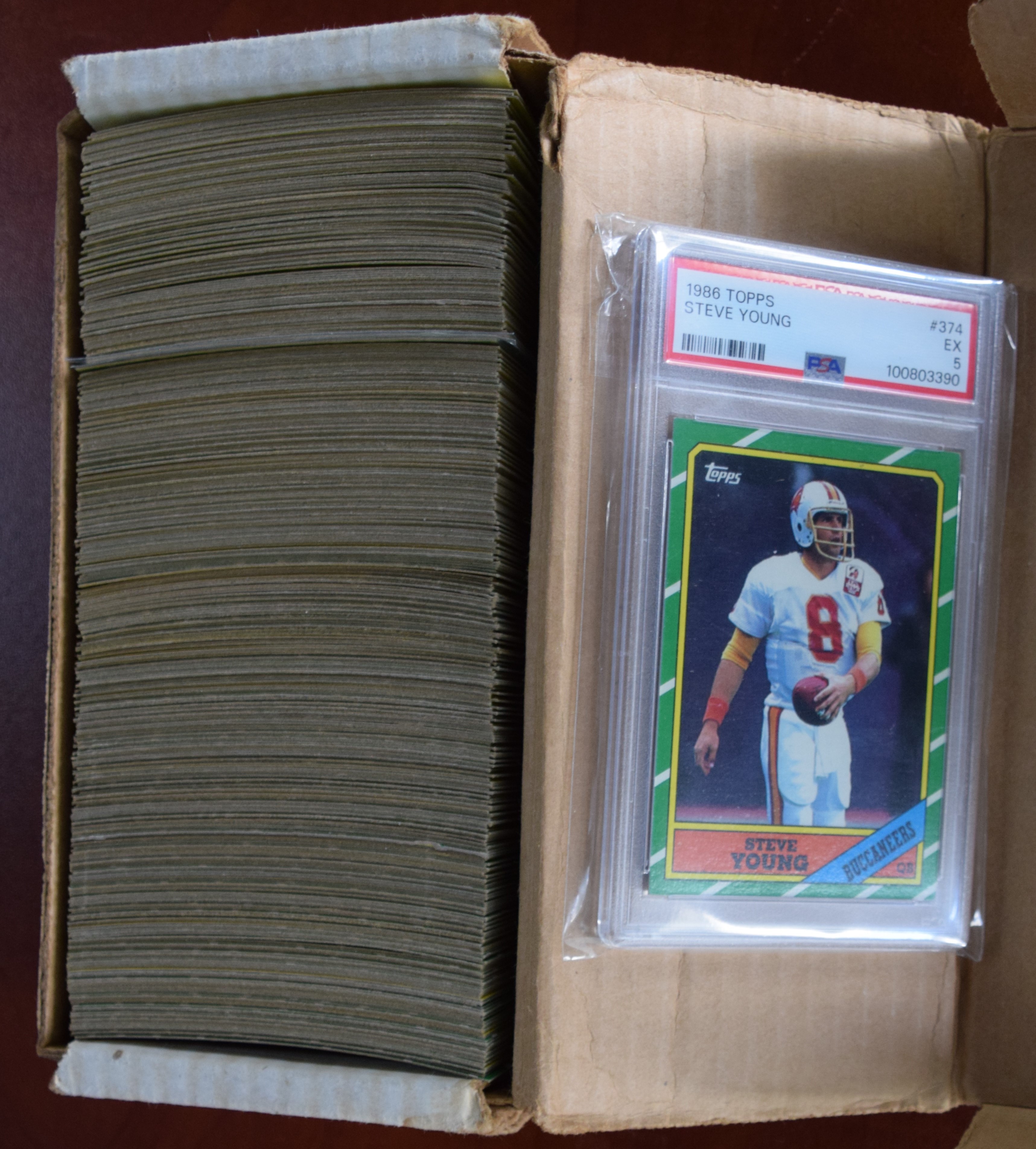 Complete set of 1986 Topps football cards of approximately 386 cards including Jery Rice, John Elway, Too Tall Jones, Steve Young (graded 5).