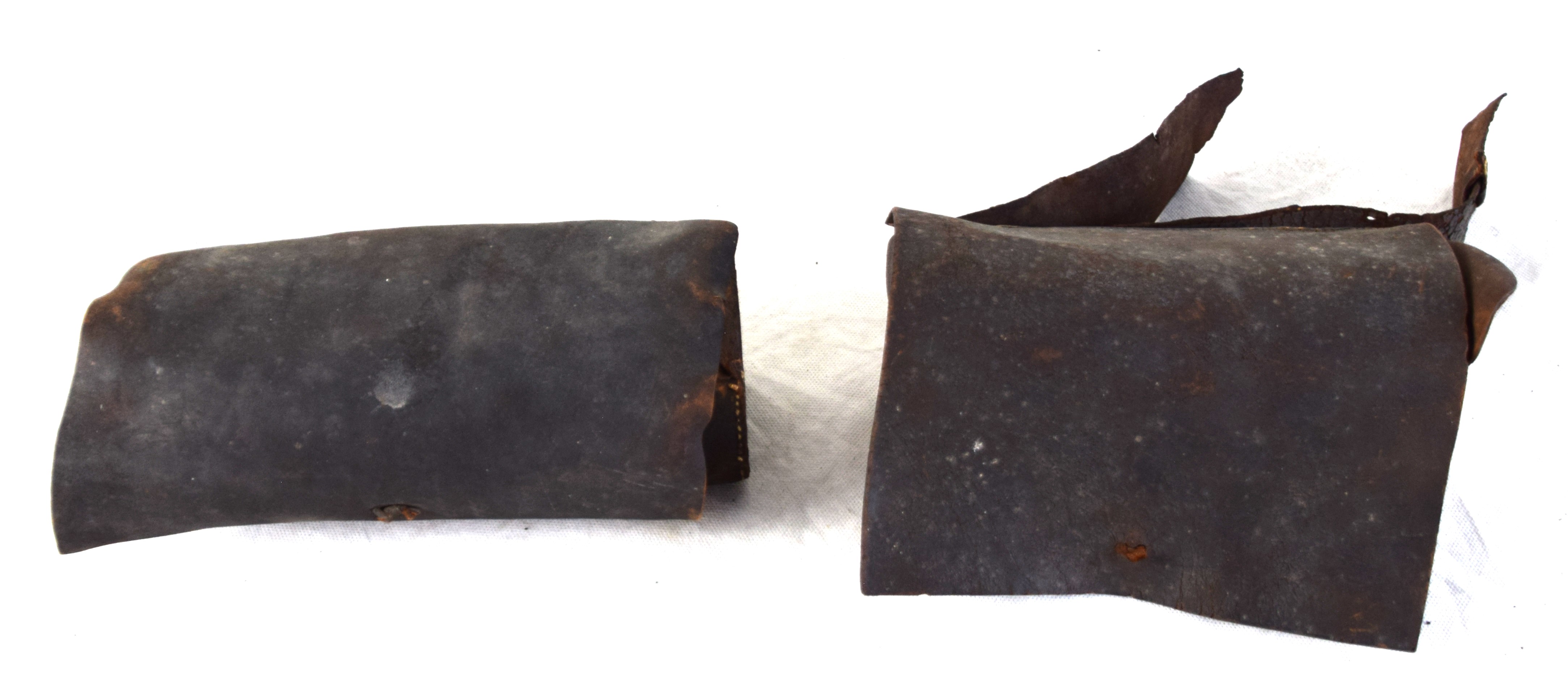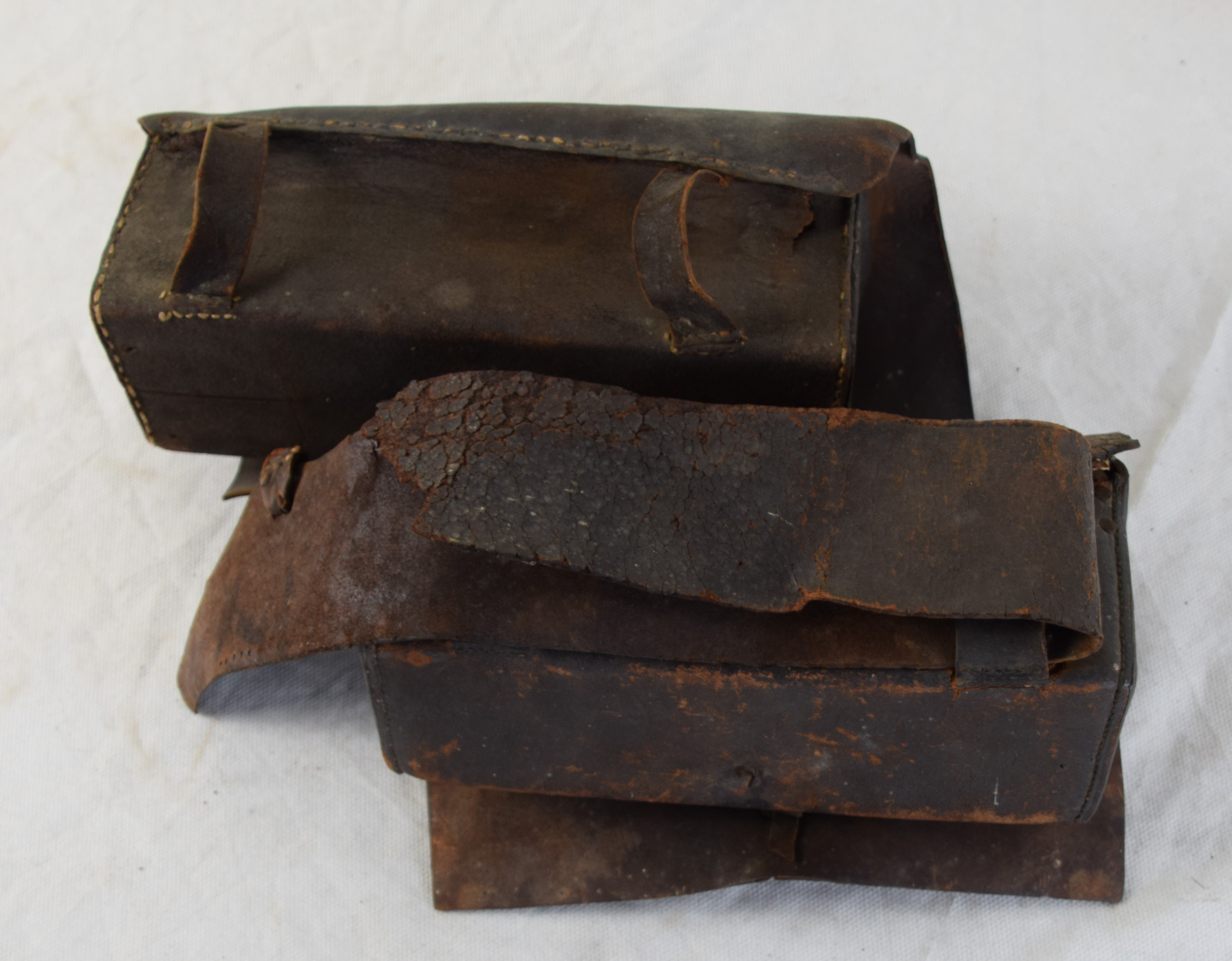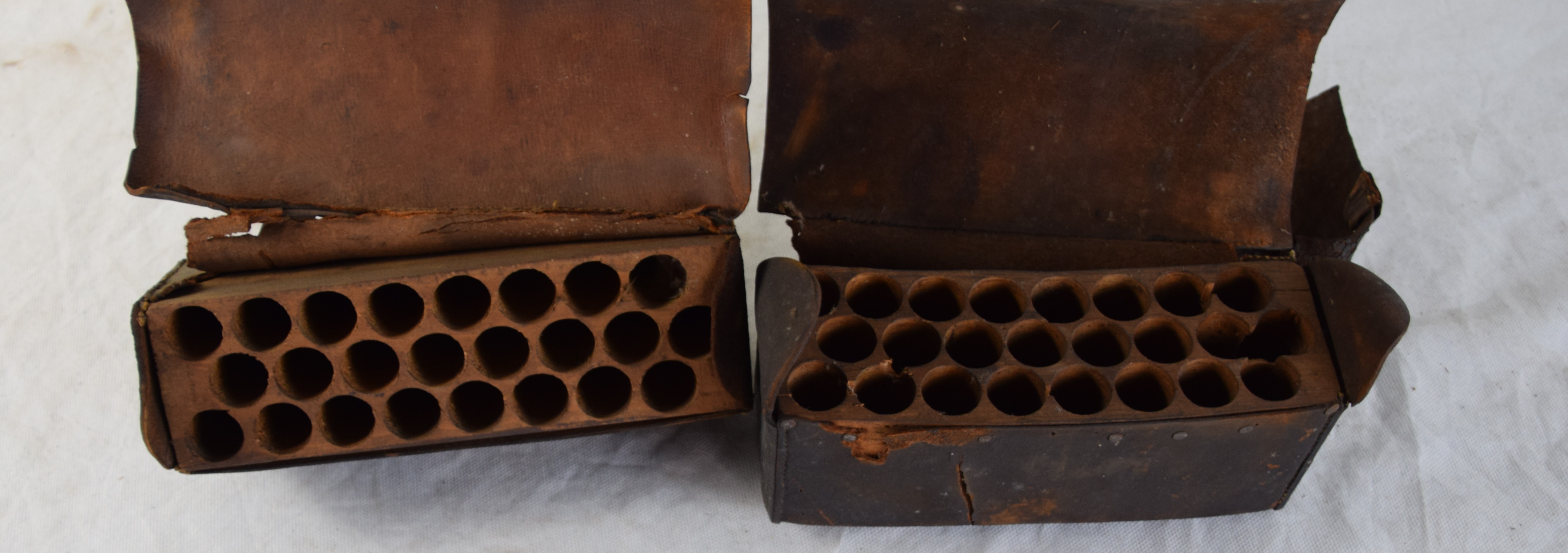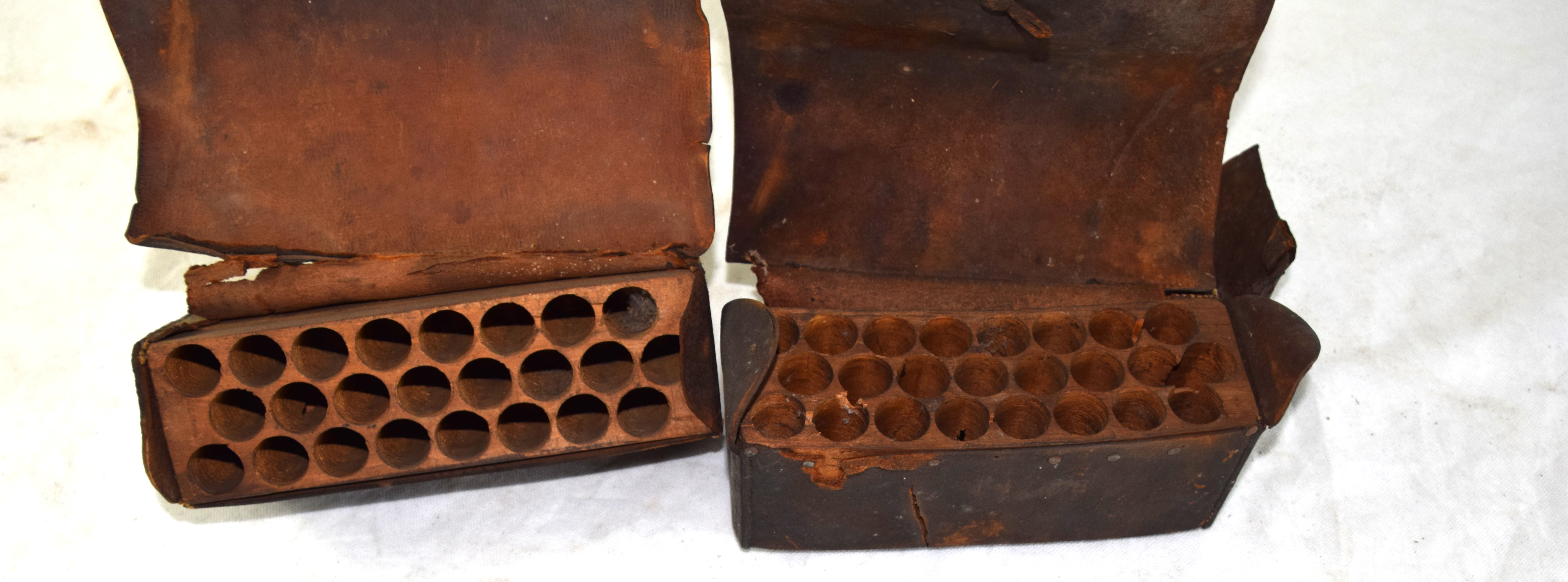 Pair Of War of 1812 Cartridge Boxes with belt loops and with wooden insert holding 24 slots for cartridges. Dimensions: 8.5″ L