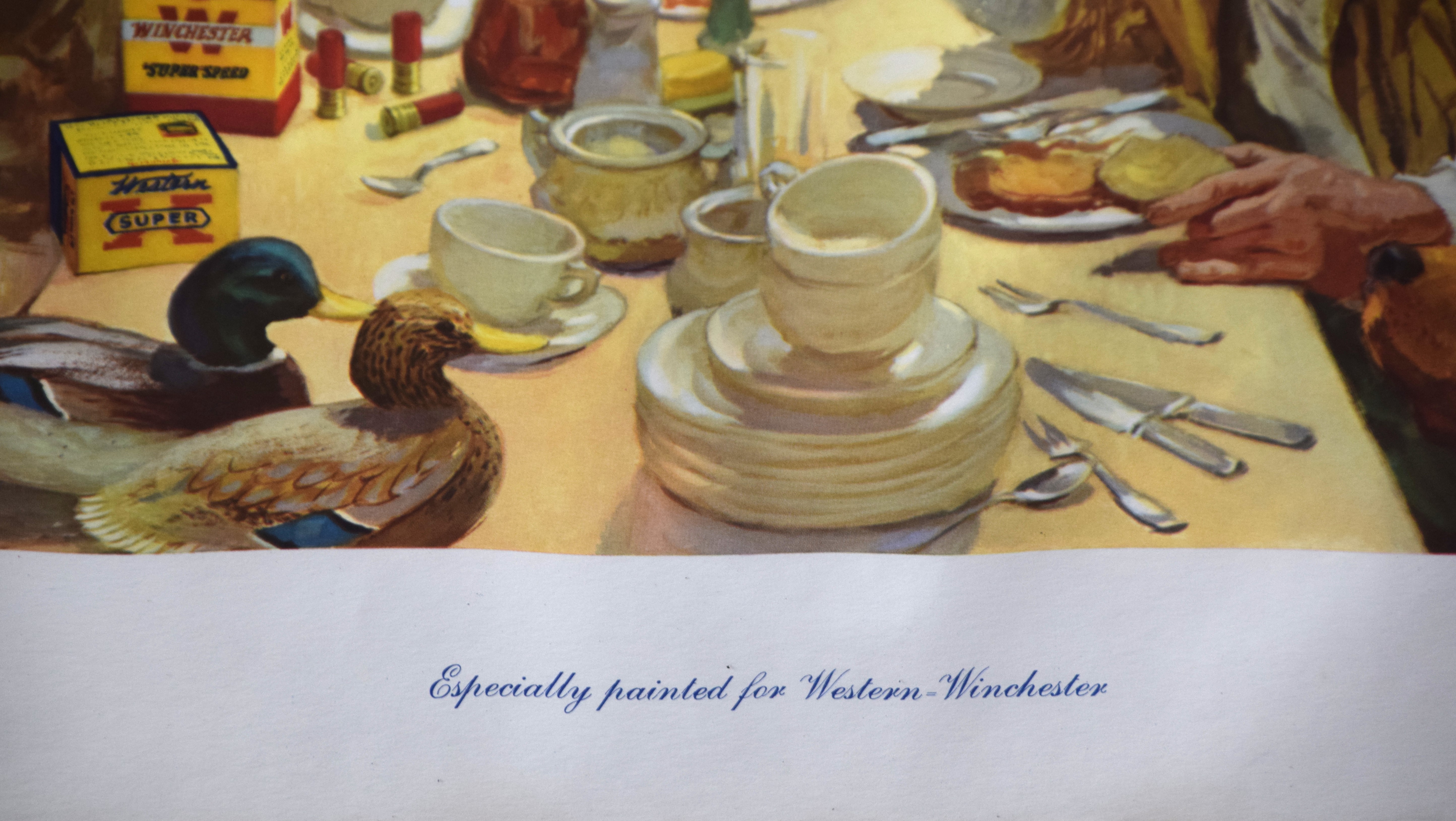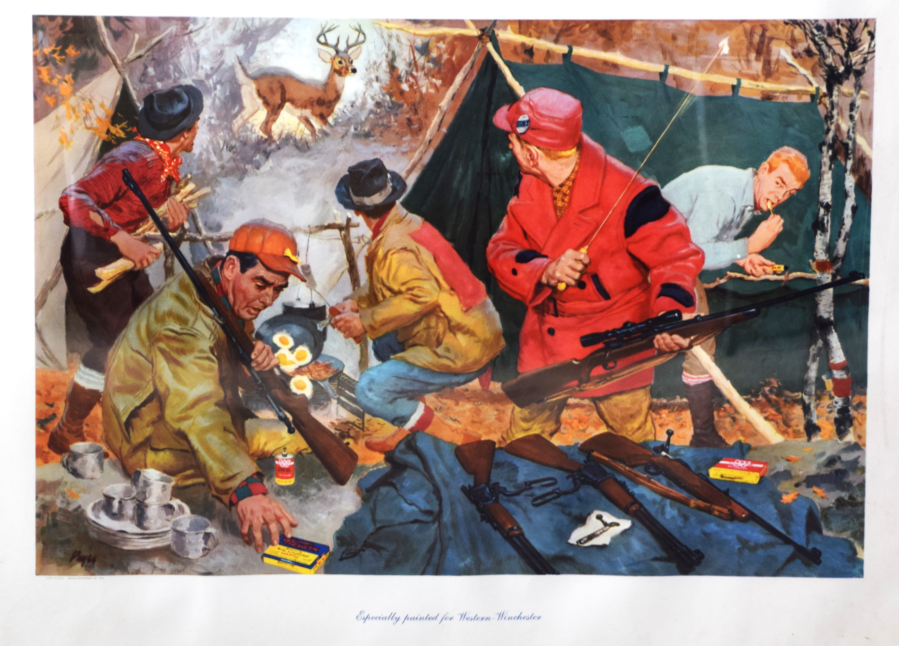 Two framed 1954 Western-Winchester lithographs by Olin Industries including hunters drinking coffee and hunters unprepared for the Buck. Dimensions: 21″ x 27″
