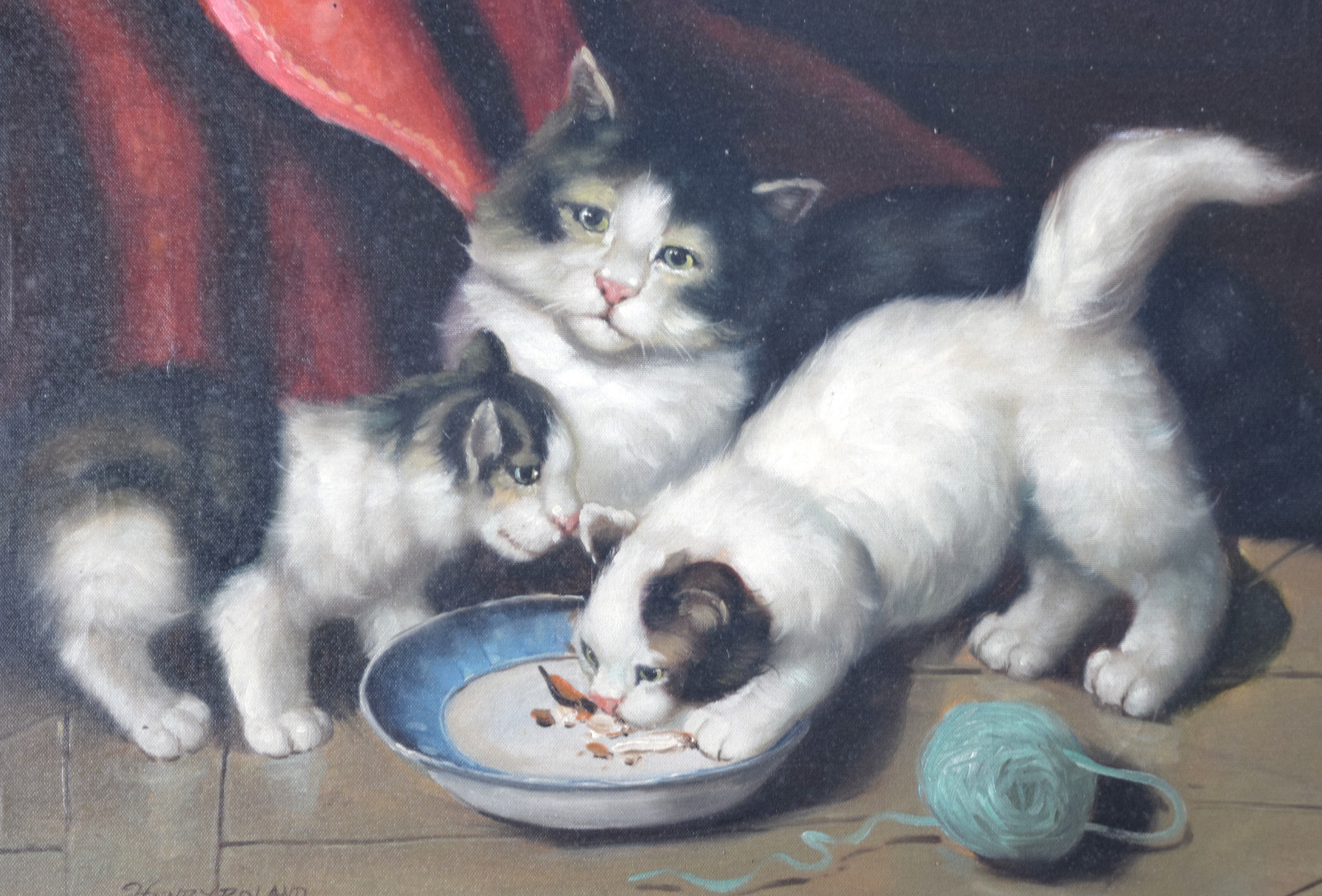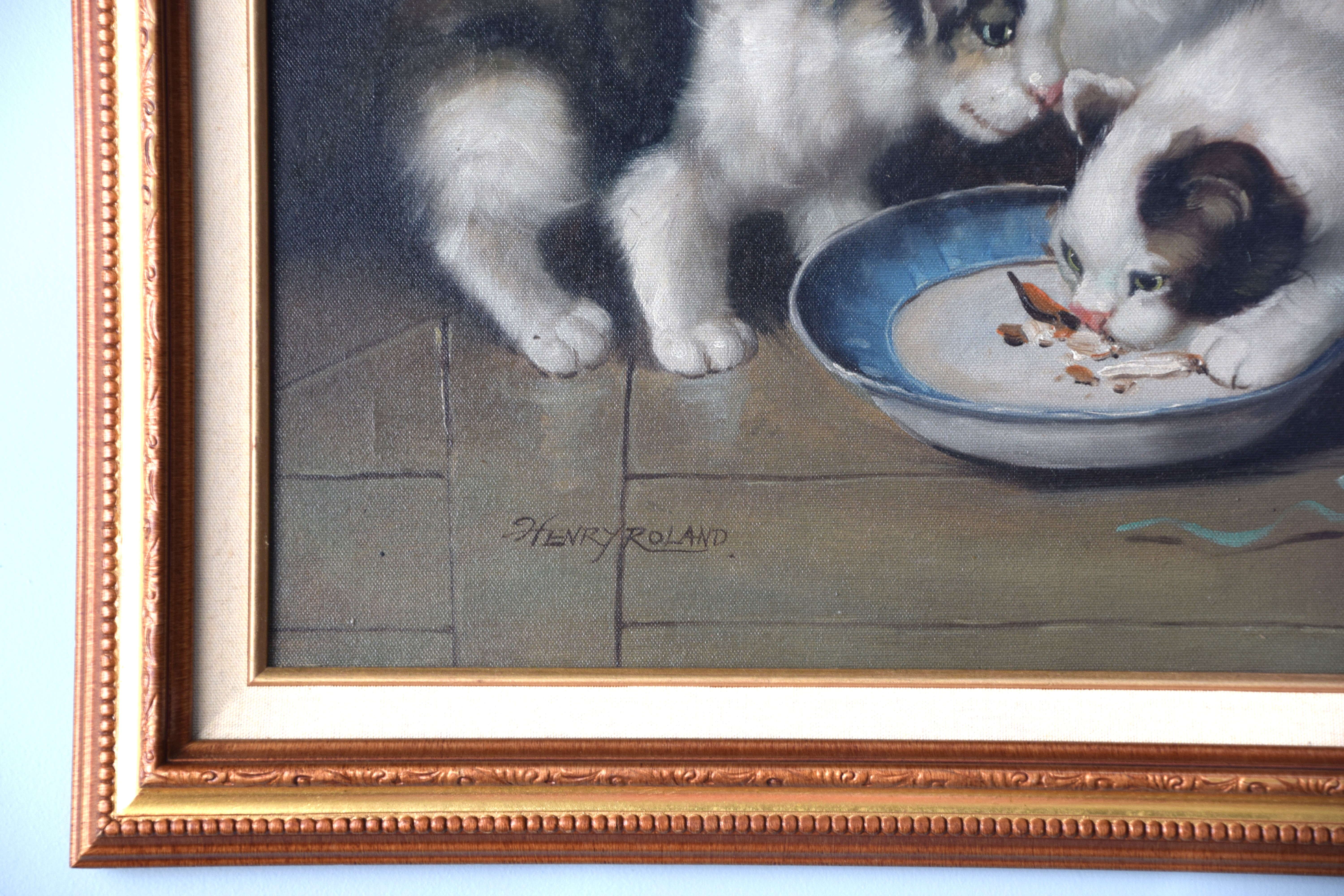 Framed oil on canvas painting of three cats, signed lower left, Henry Roland. Henry Roland (1920 – 2000) worked in Belgium and is known for animal and portrait paintings. Dimensions: 20″ x 24″