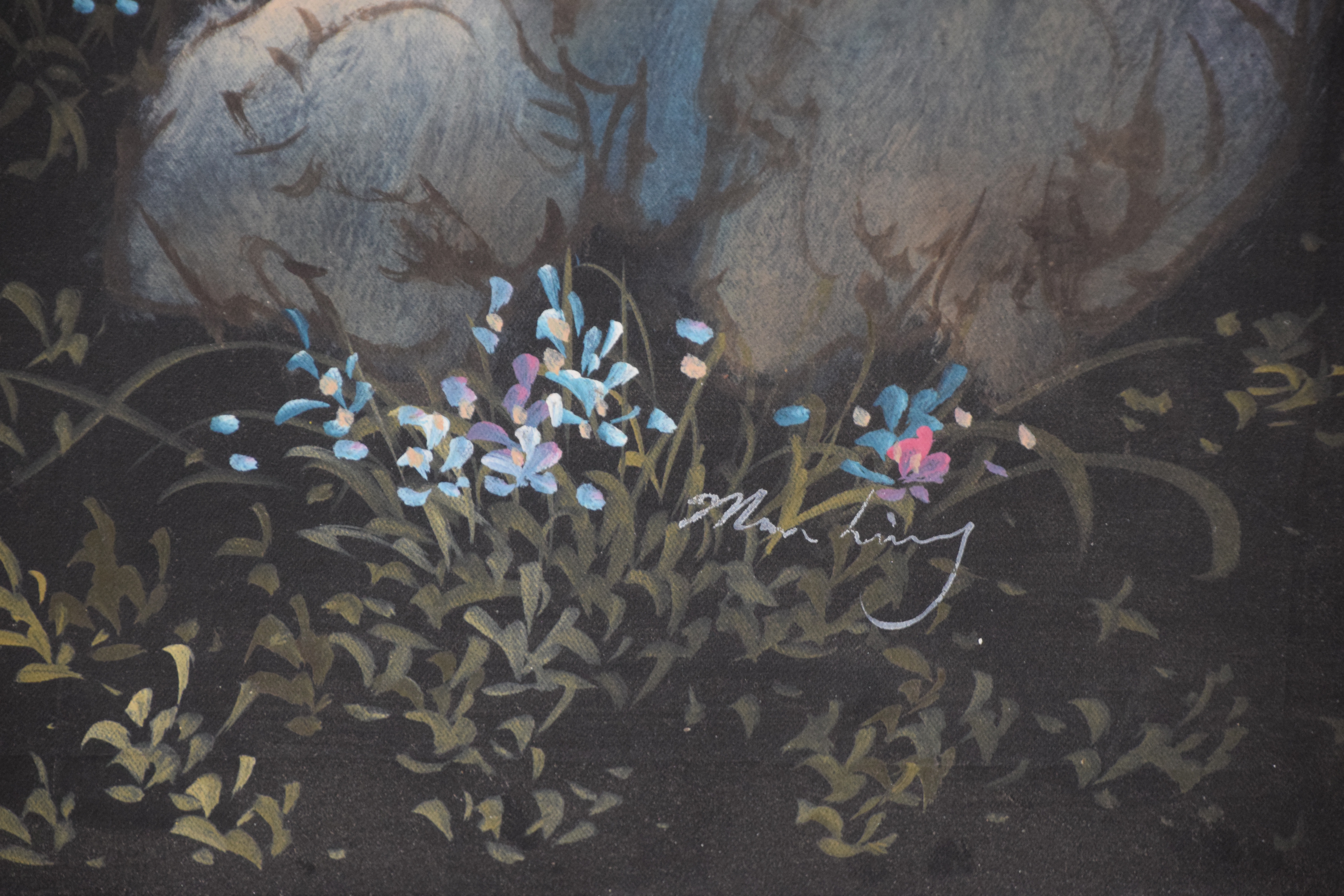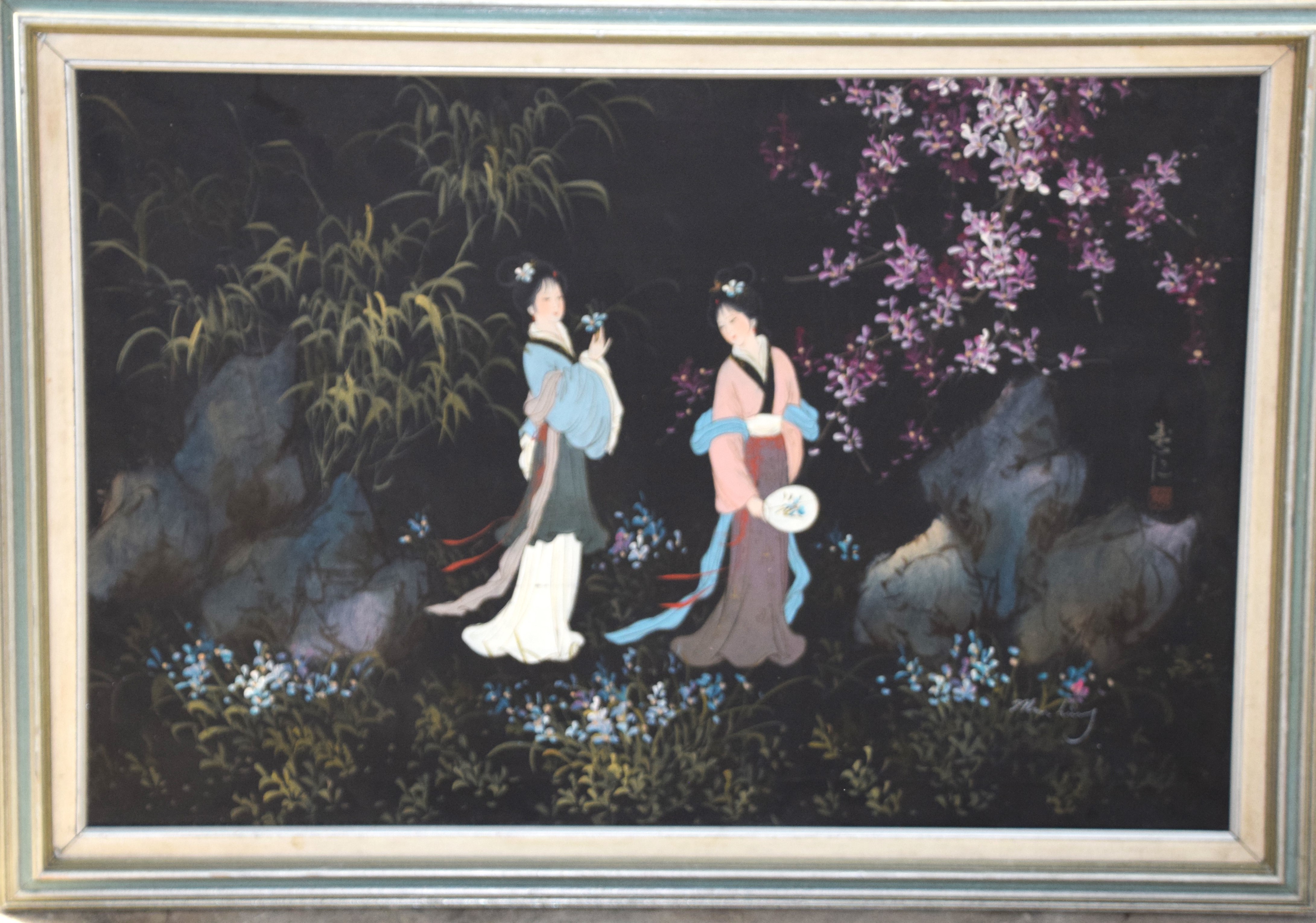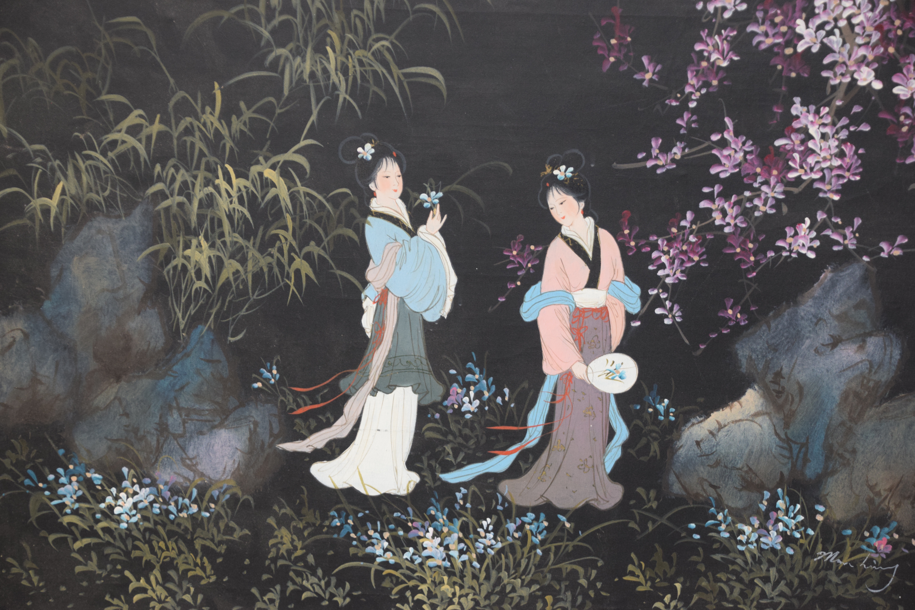 Framed oil on canvas of two Geishas in a garden with flowering trees. Signed lower right, Man Ling with red seal. Dimensions: 24″ x 35″ Image size