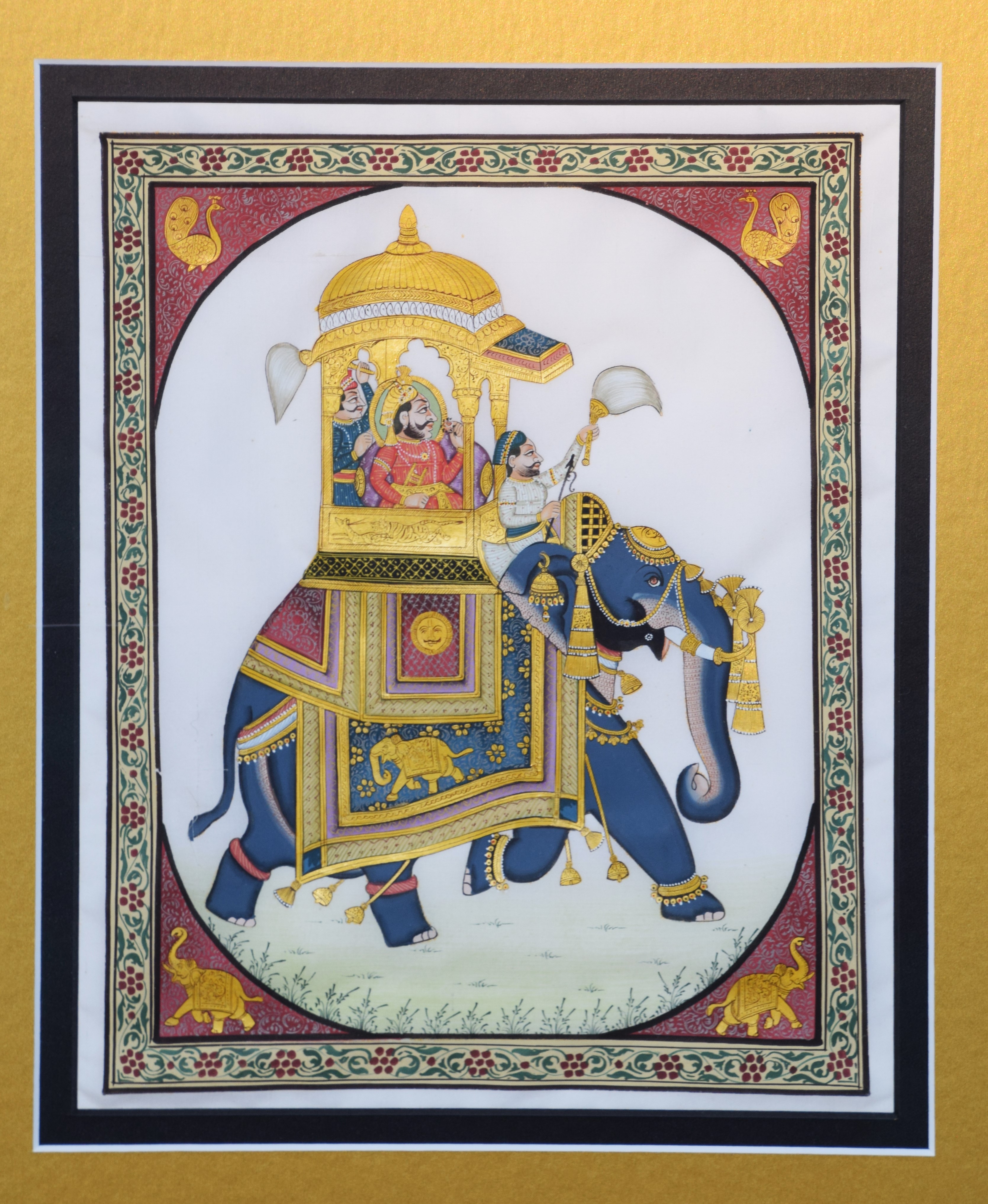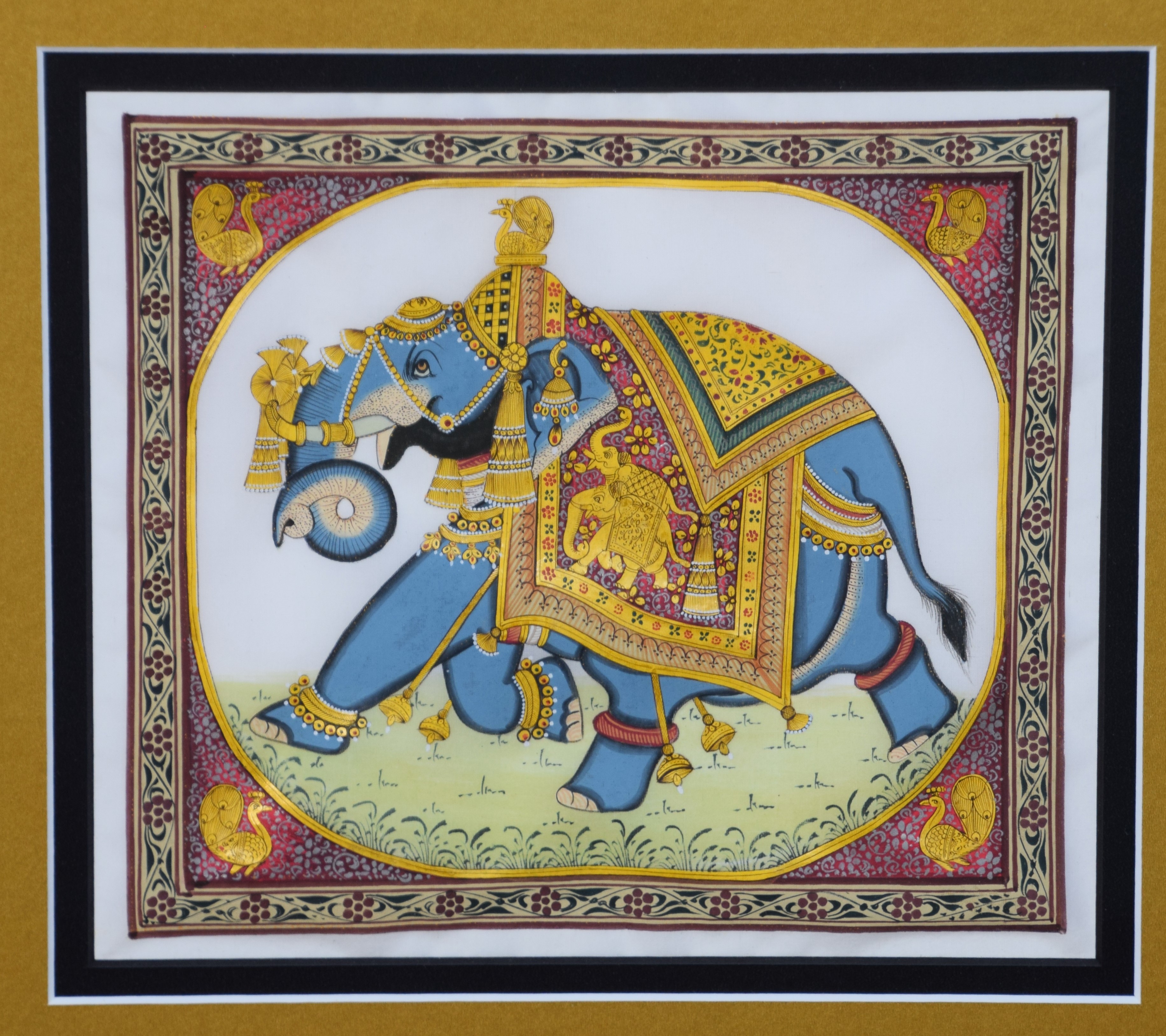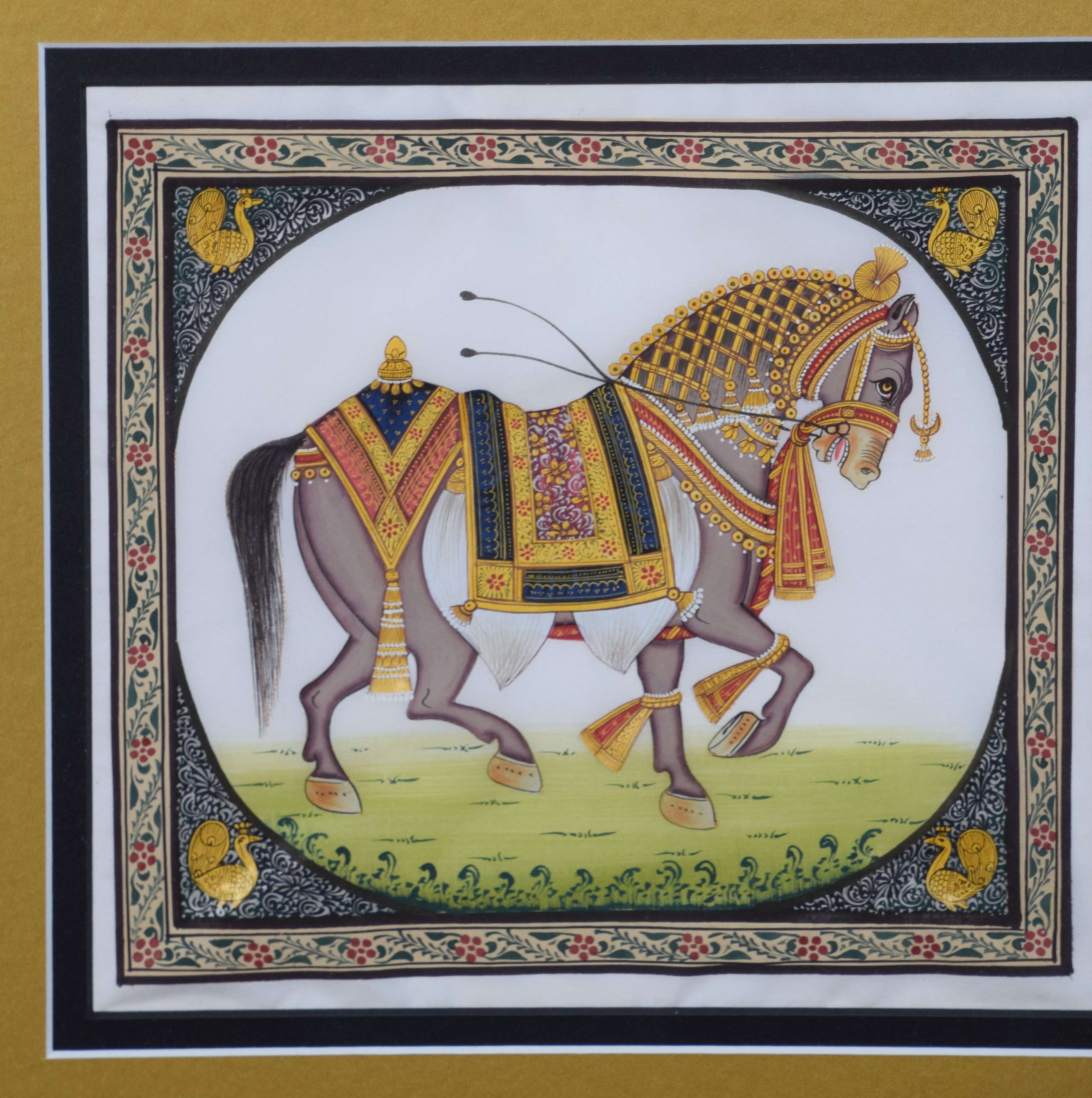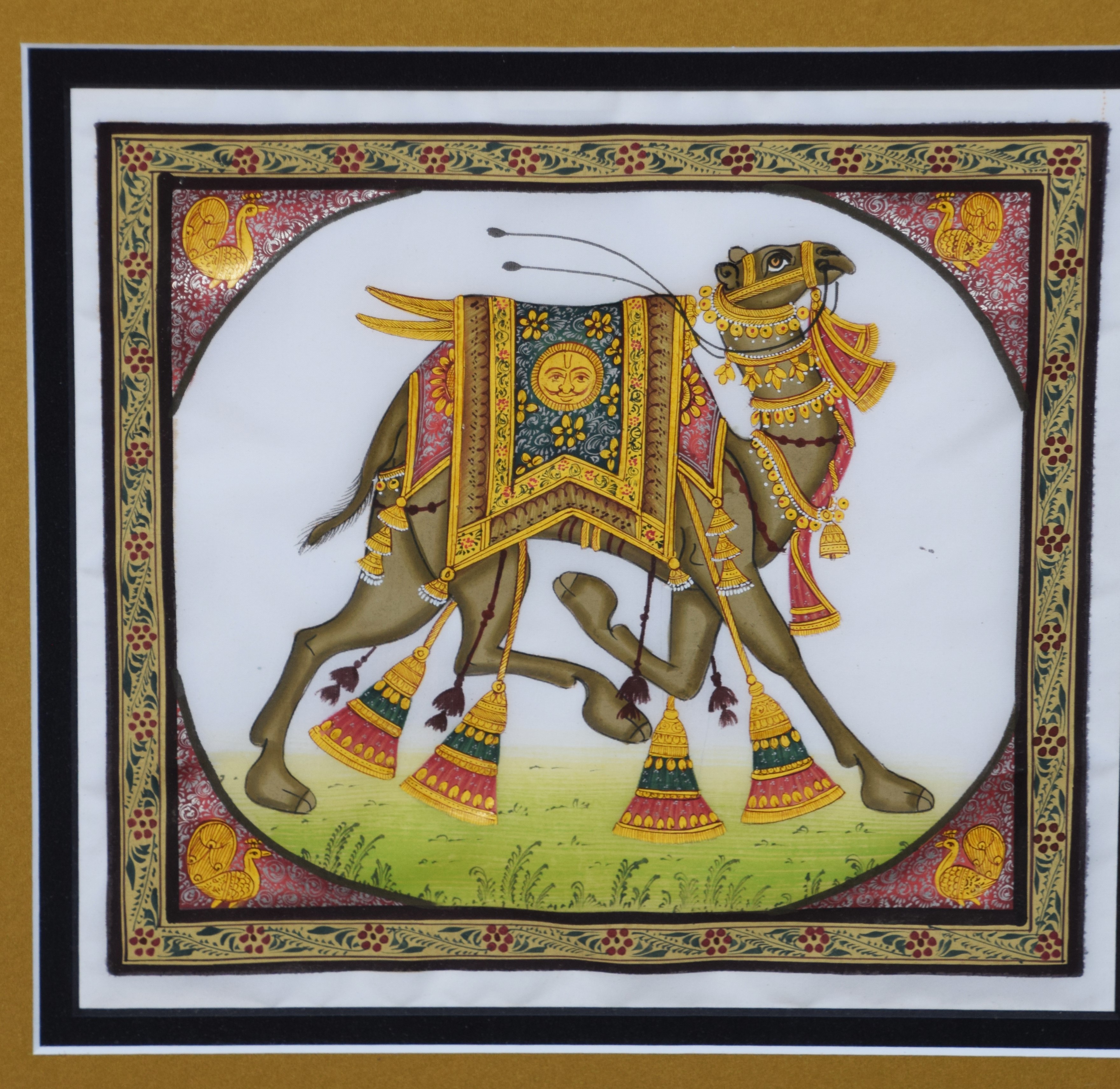 Framed set of four watercolors including two elephants, a camel and horse, fully decorated. Dimensions: 9″ x 8.25″ Each Image, 51.5″ x 19″ Overall
