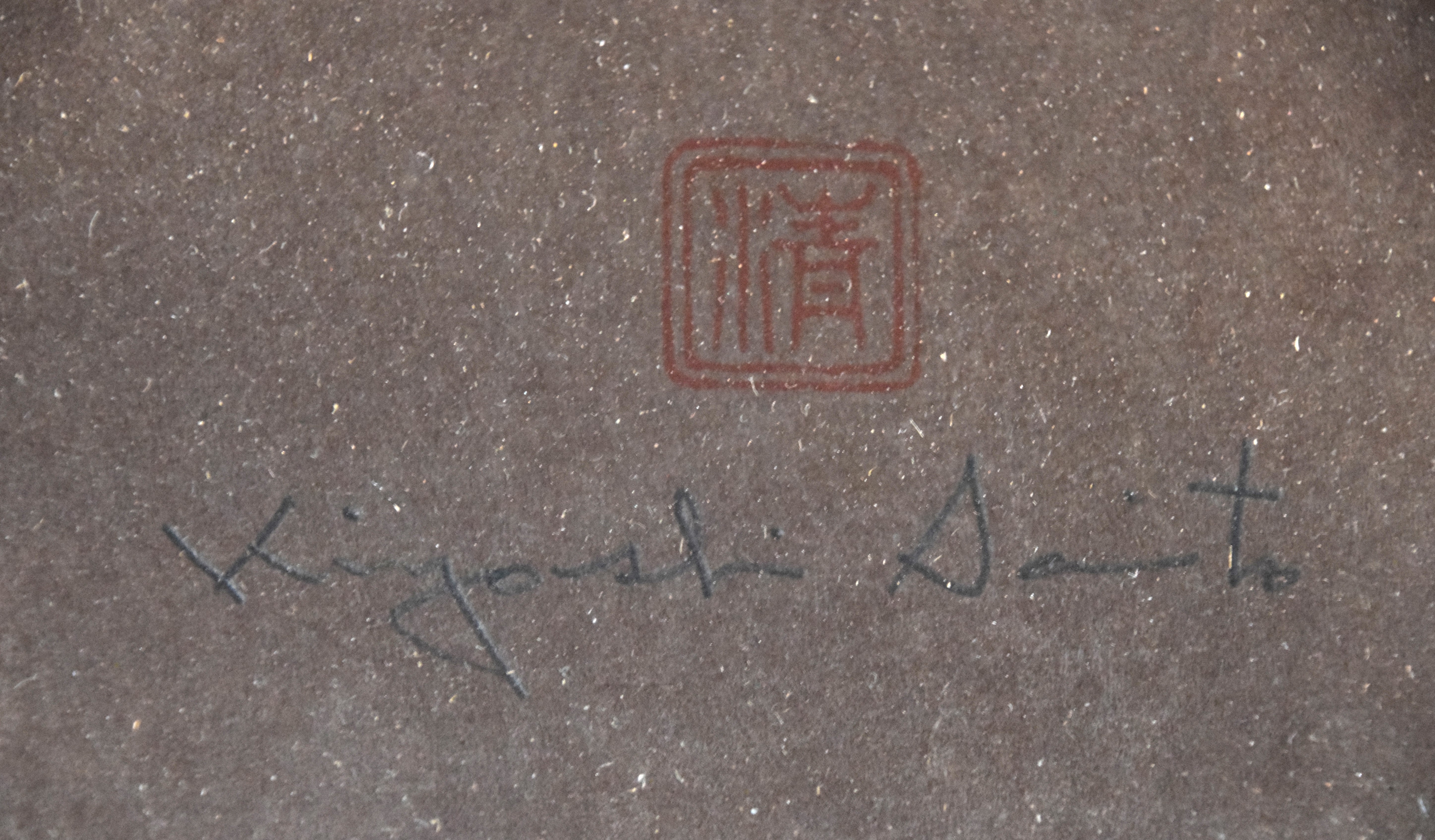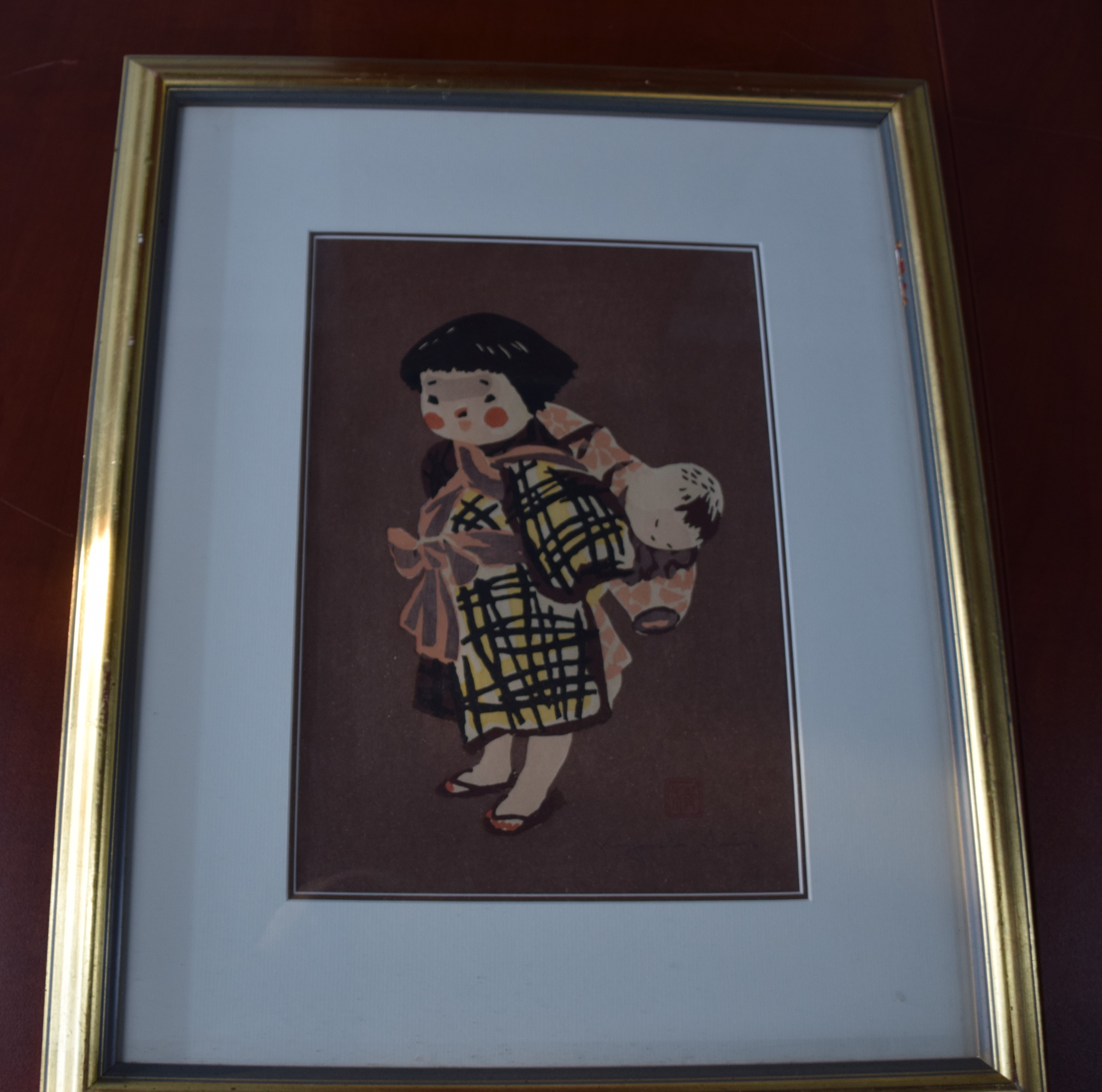 Framed watercolor of a child carrying a doll (or brother). Signed lower right Saito. Dimensions: 13″ x 9.5″ Image size