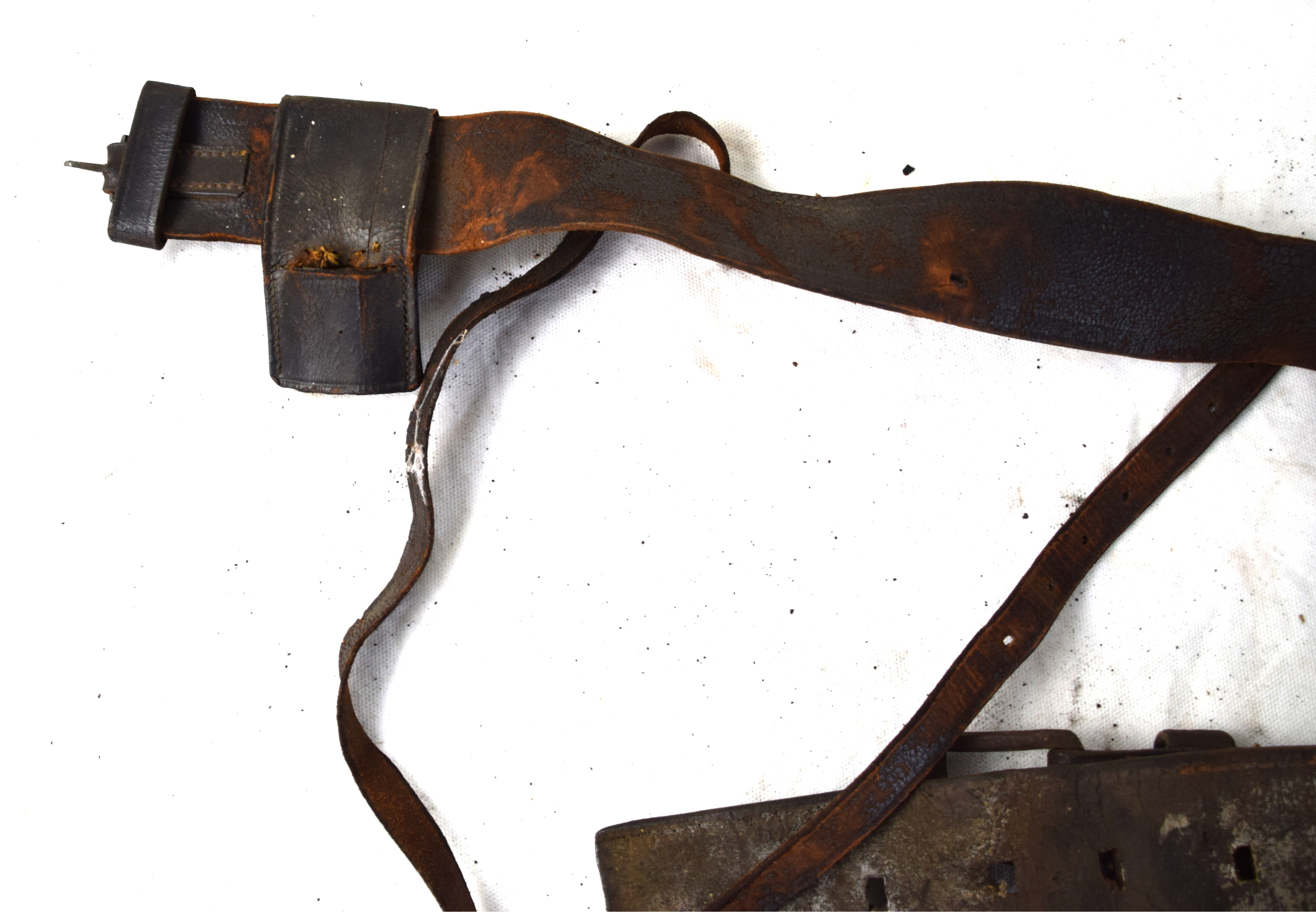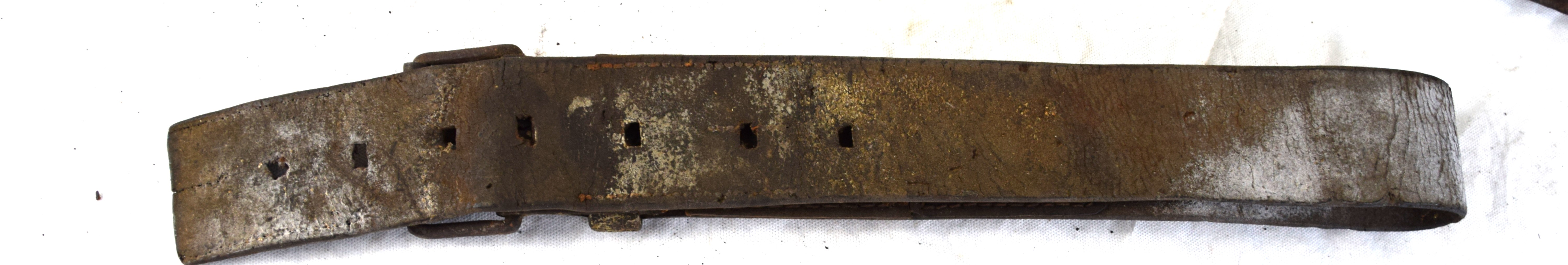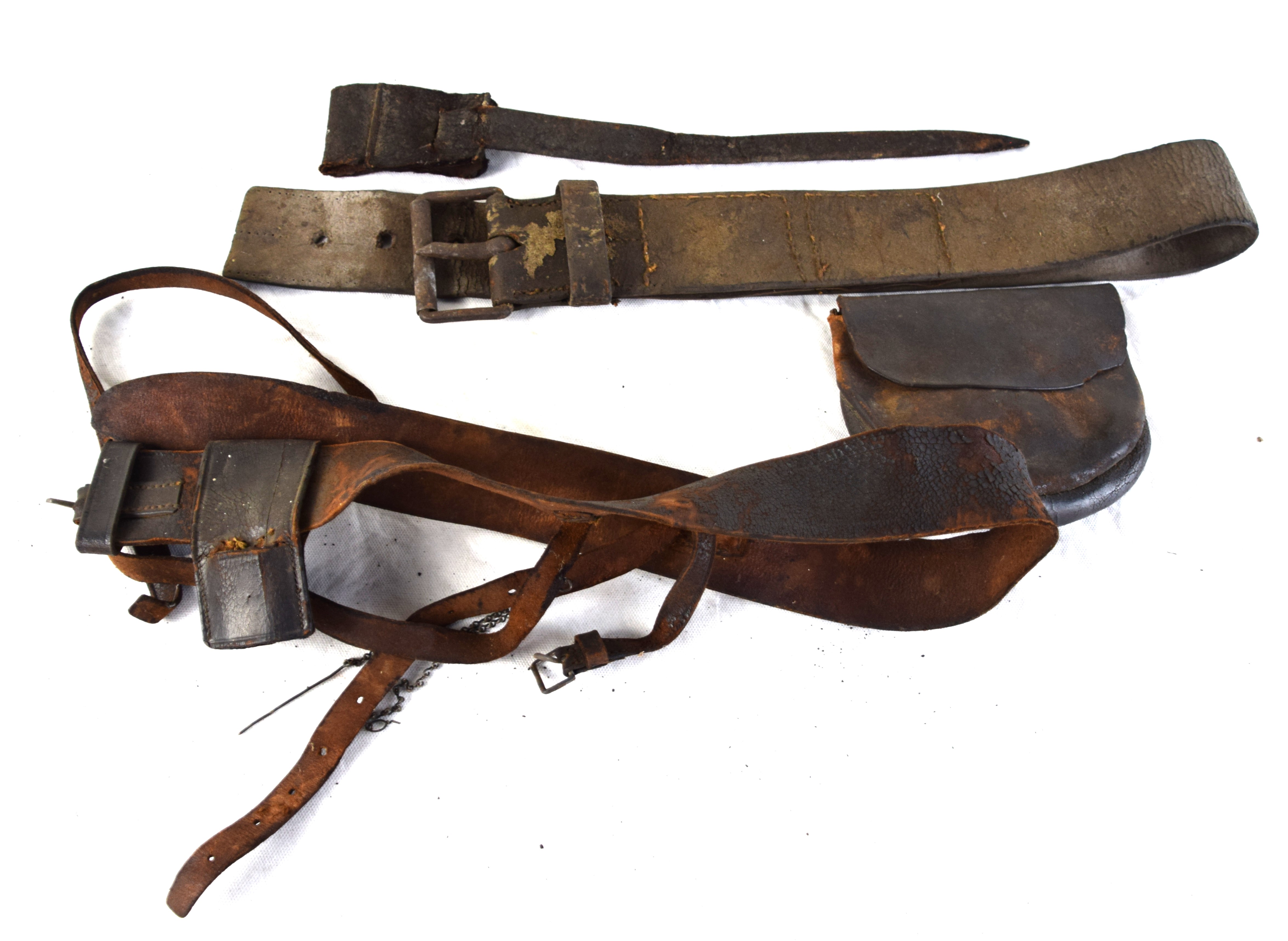 Early leather lot to include a wide handmade belt with early blacksmith buckle, Leather hunter’s pouch, early belt with bayonet frog, another bayonet frog