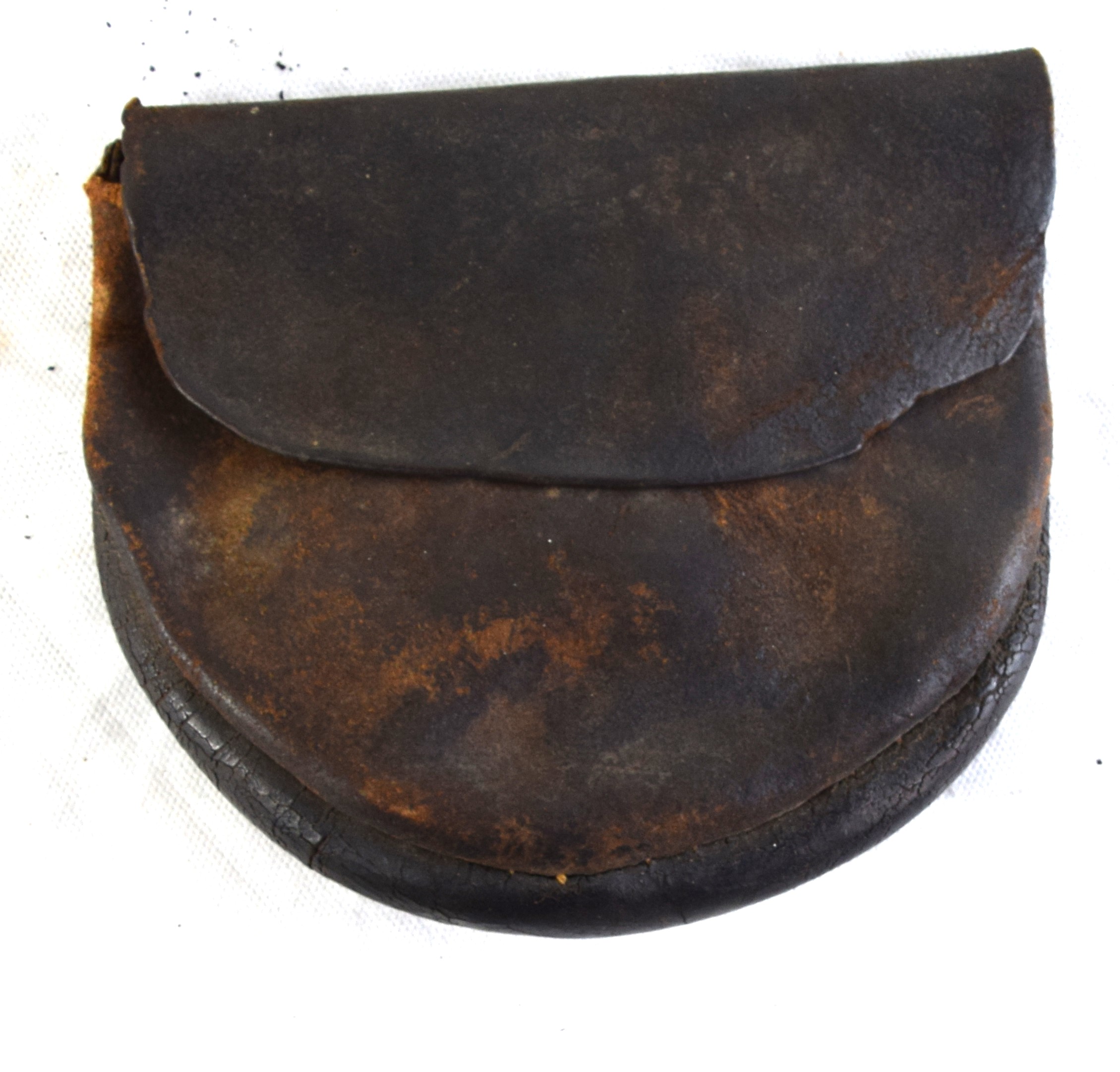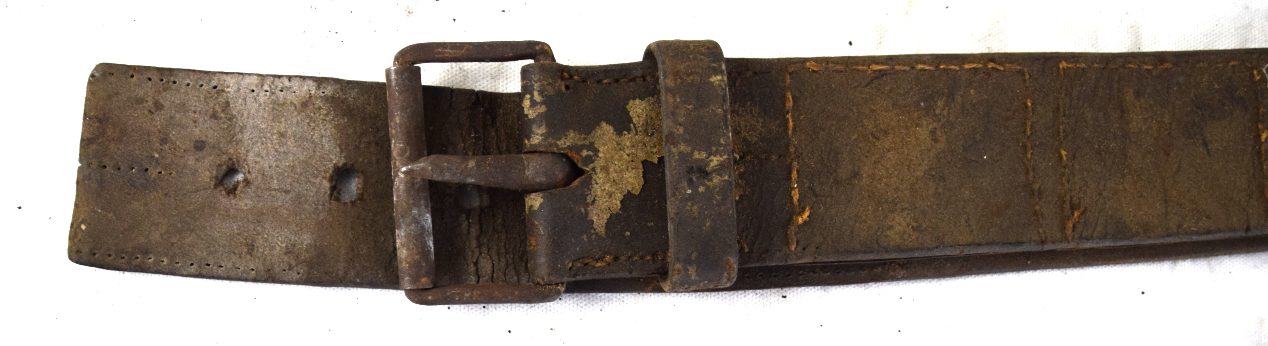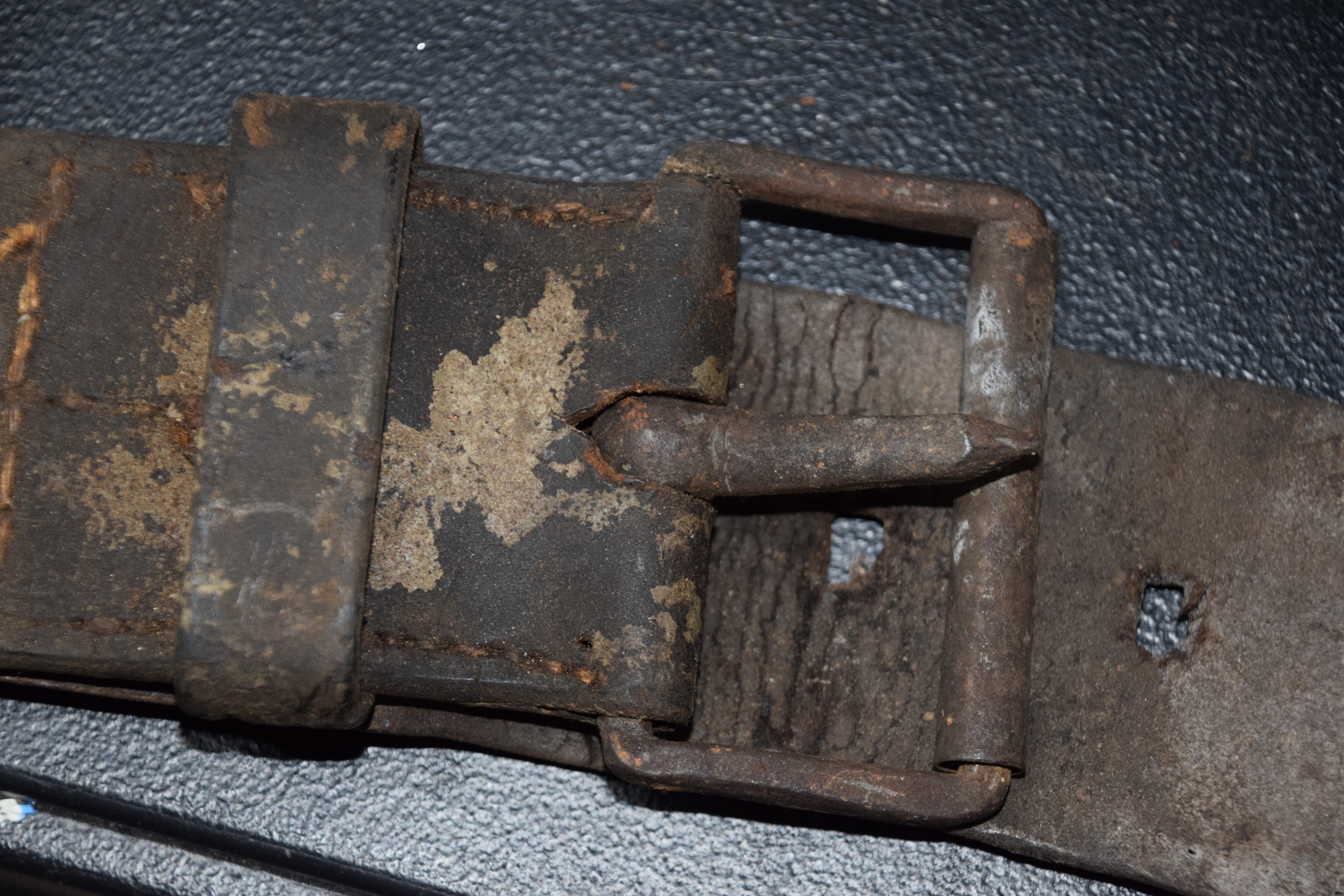 Early leather lot to include a wide handmade belt with early blacksmith buckle, Leather hunter’s pouch, early belt with bayonet frog, another bayonet frog