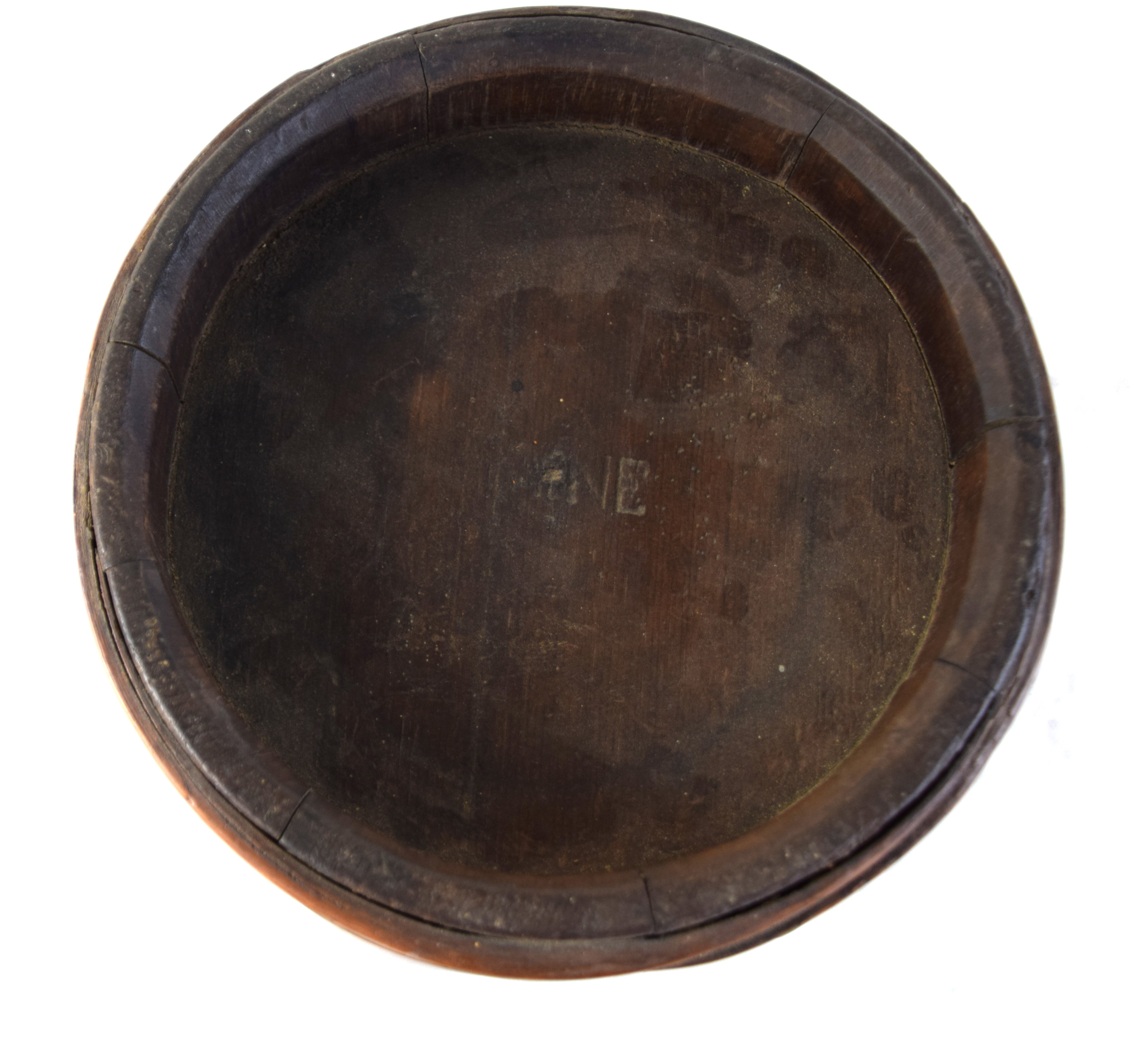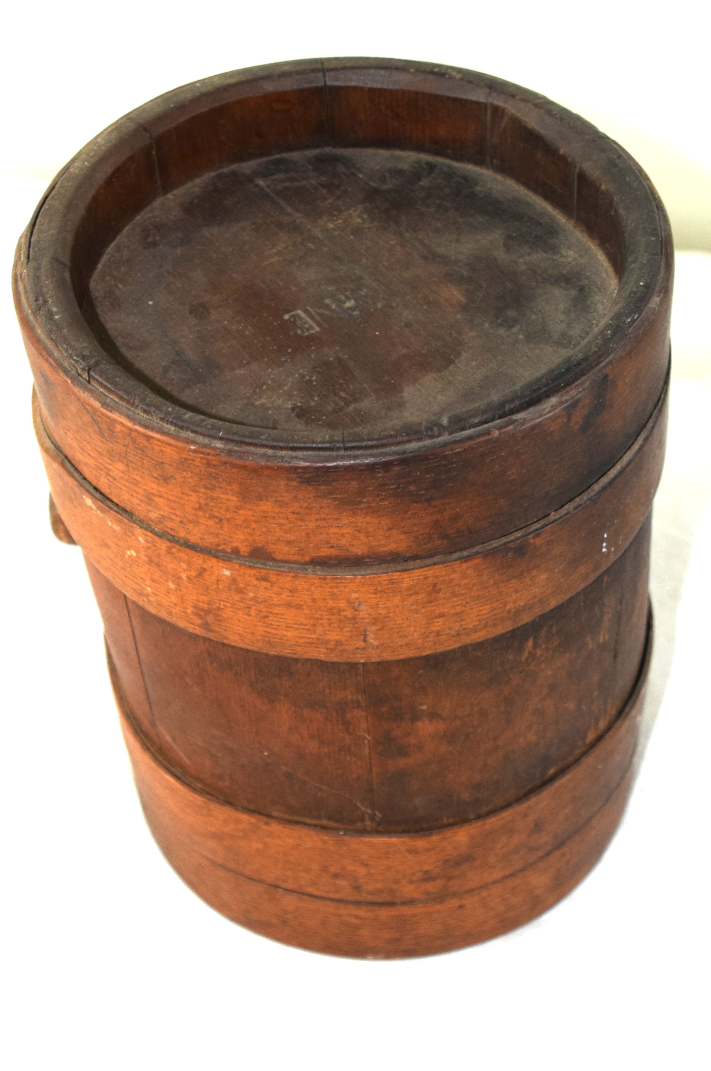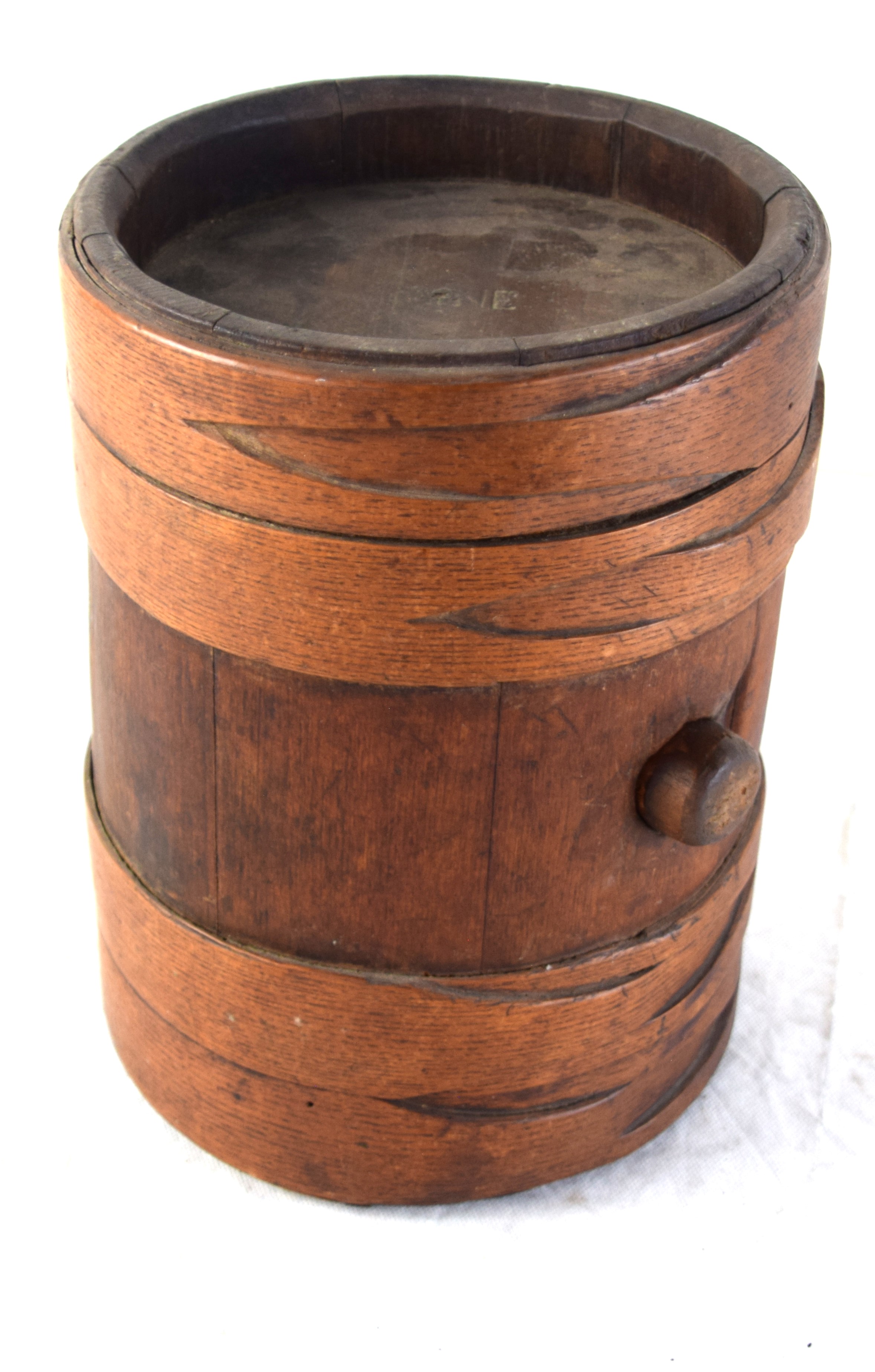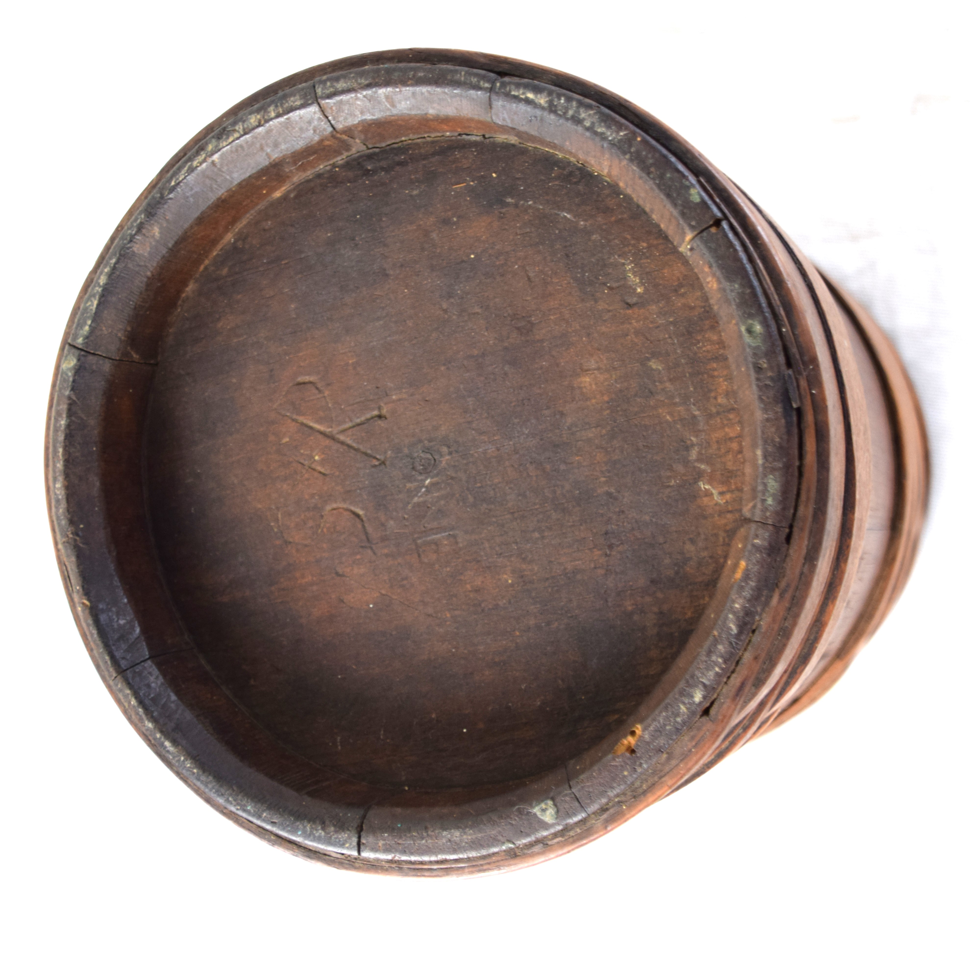 Revolutionary War American powder keg with four bands and center plug. Dimensions: 10.5″ H, 8″ Diameter