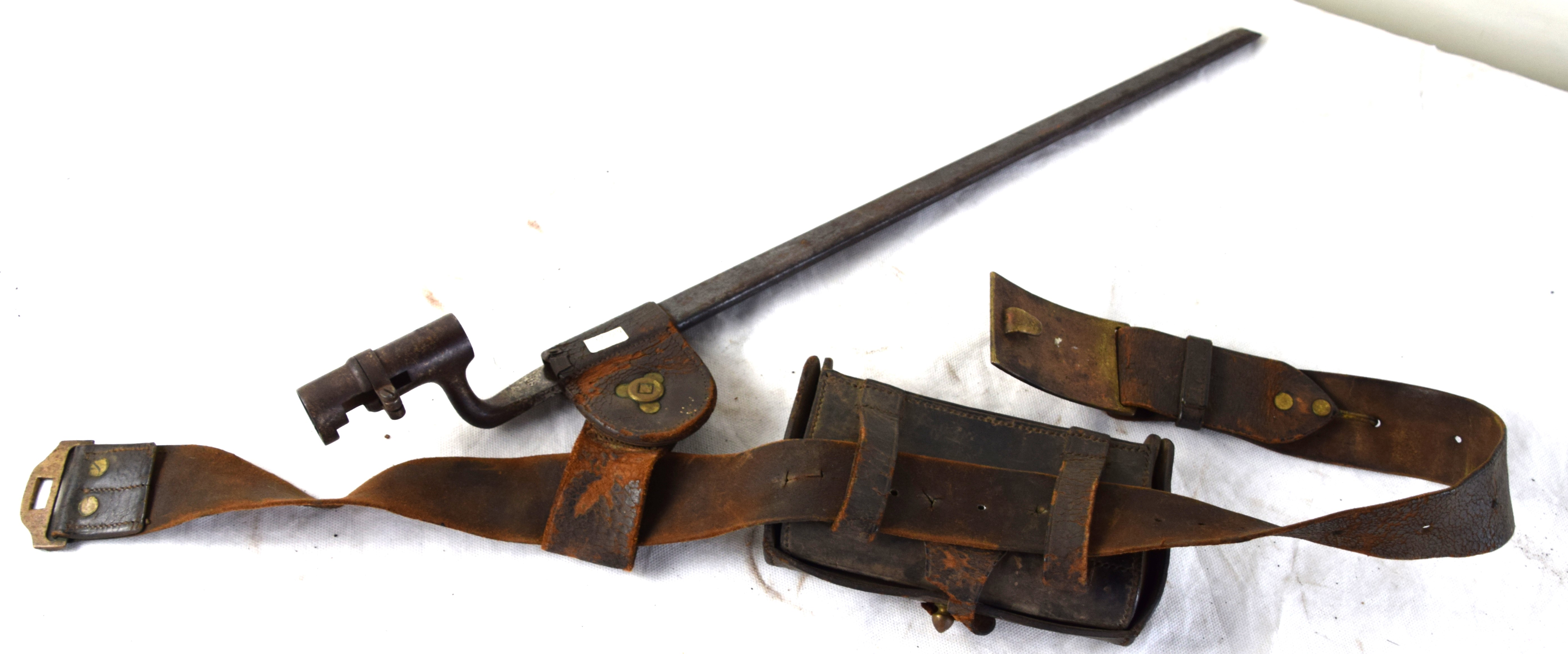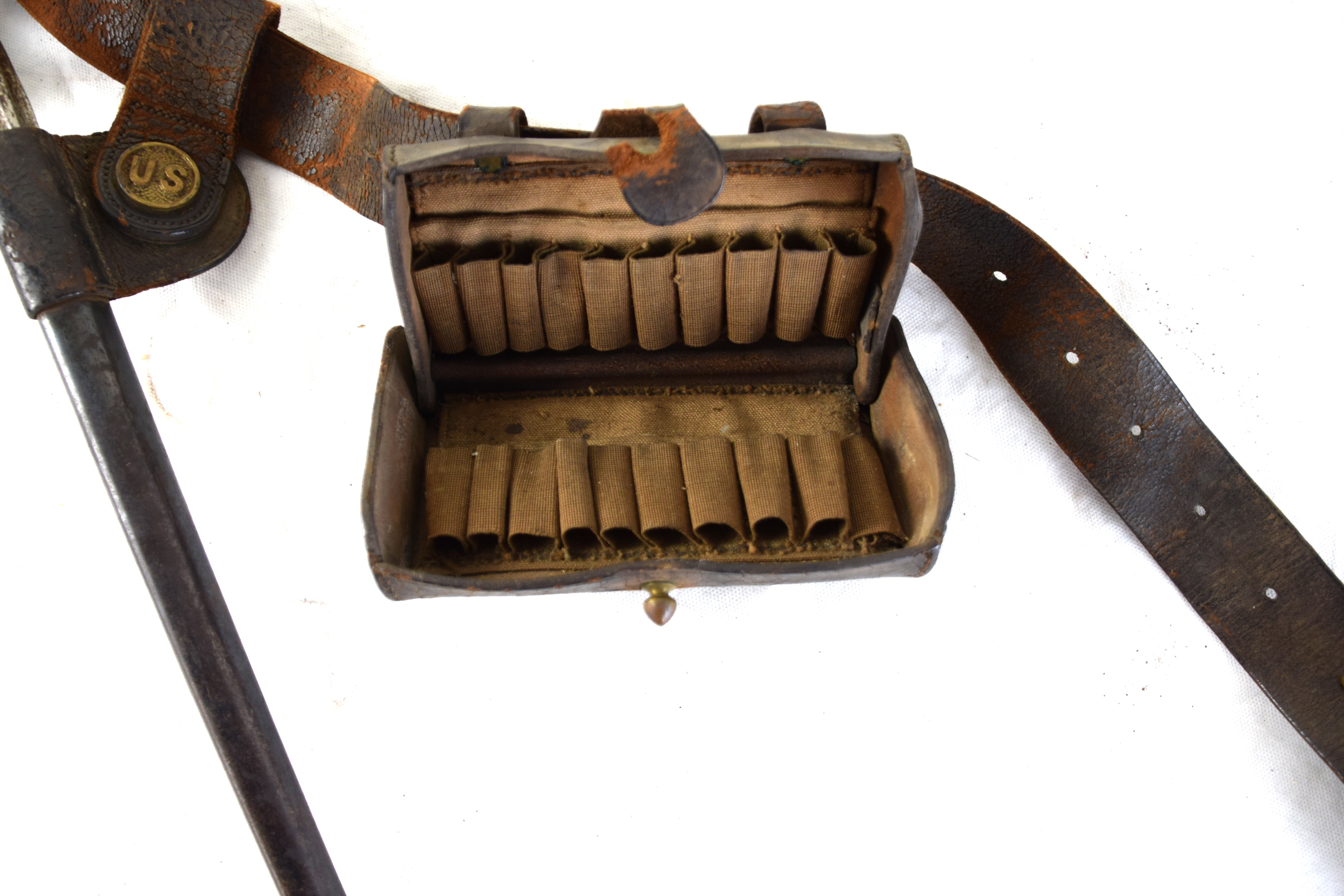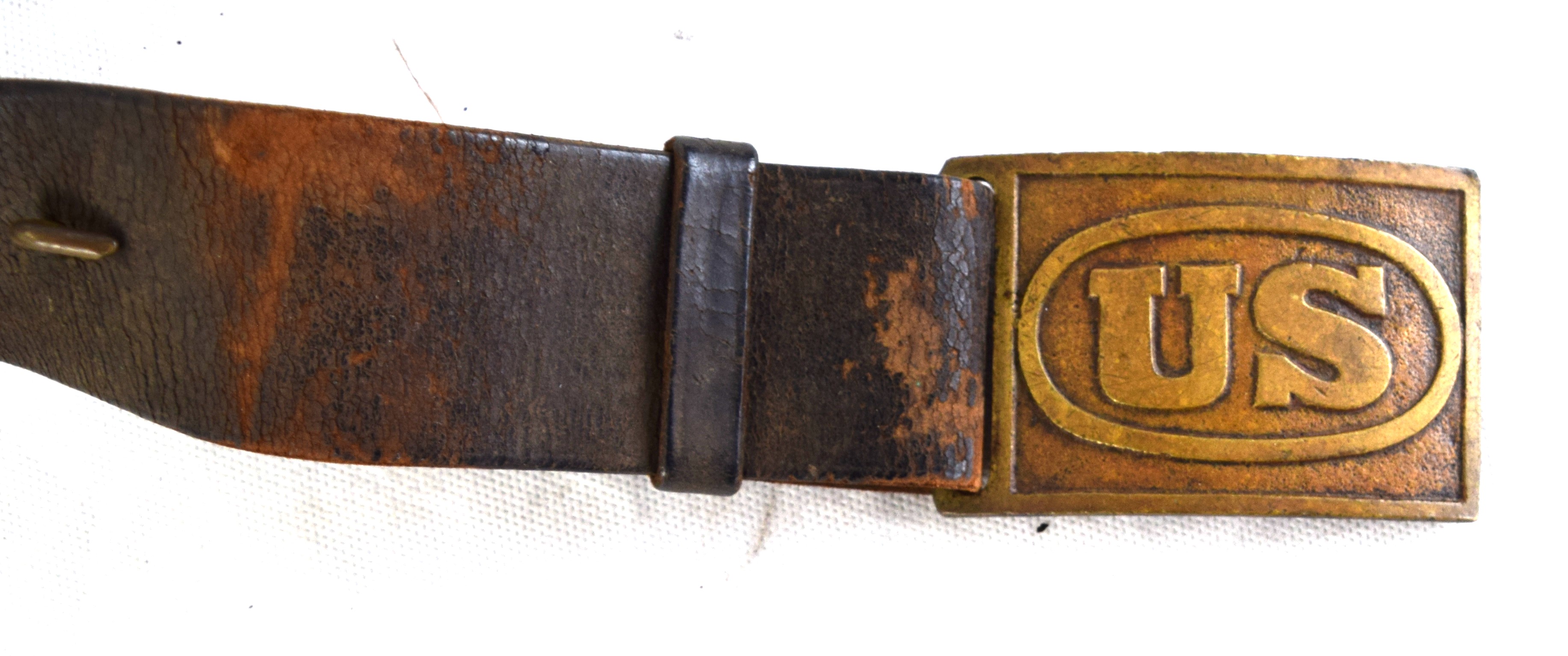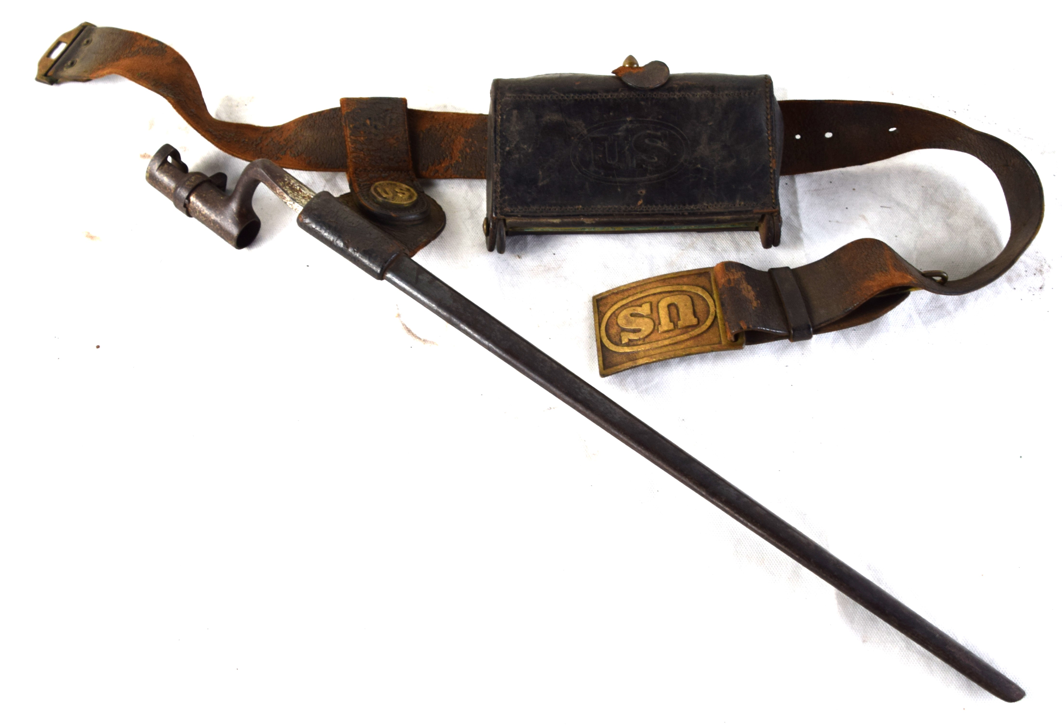 Civil War Union infantry belt and buckle with a frog and bayonet belonging to Cobb White of Ludlow Massachusetts. Provenance: Smith Auctions