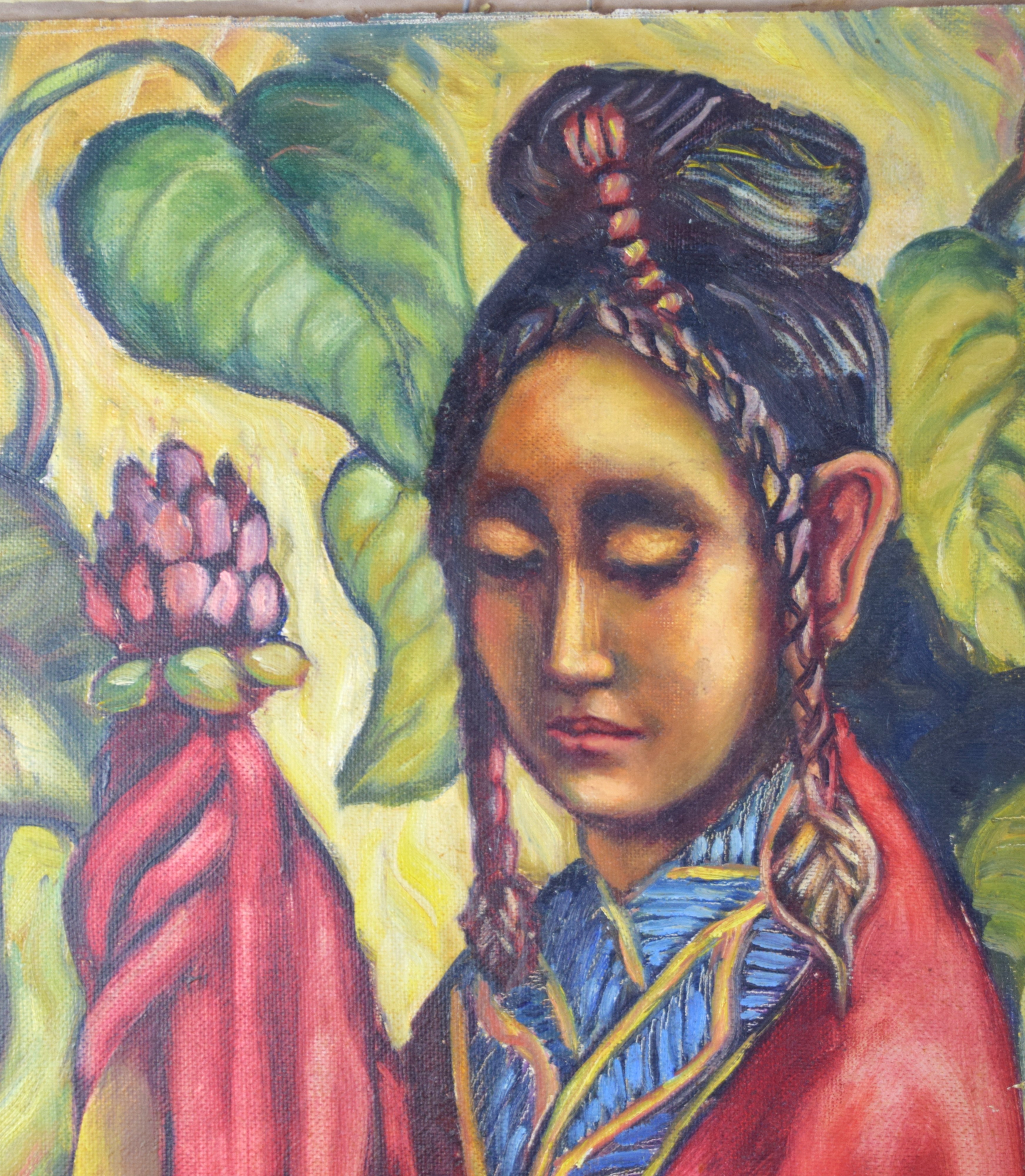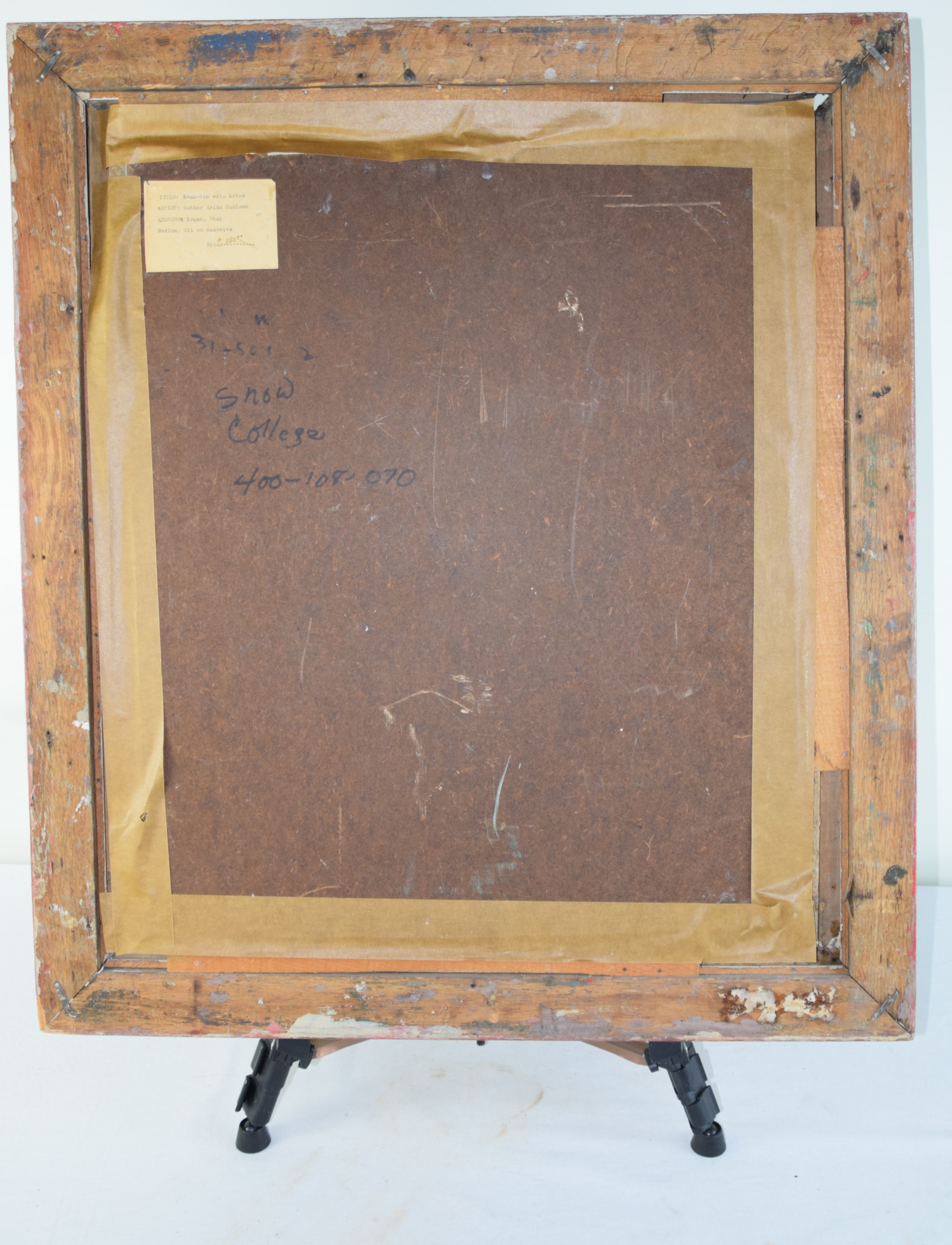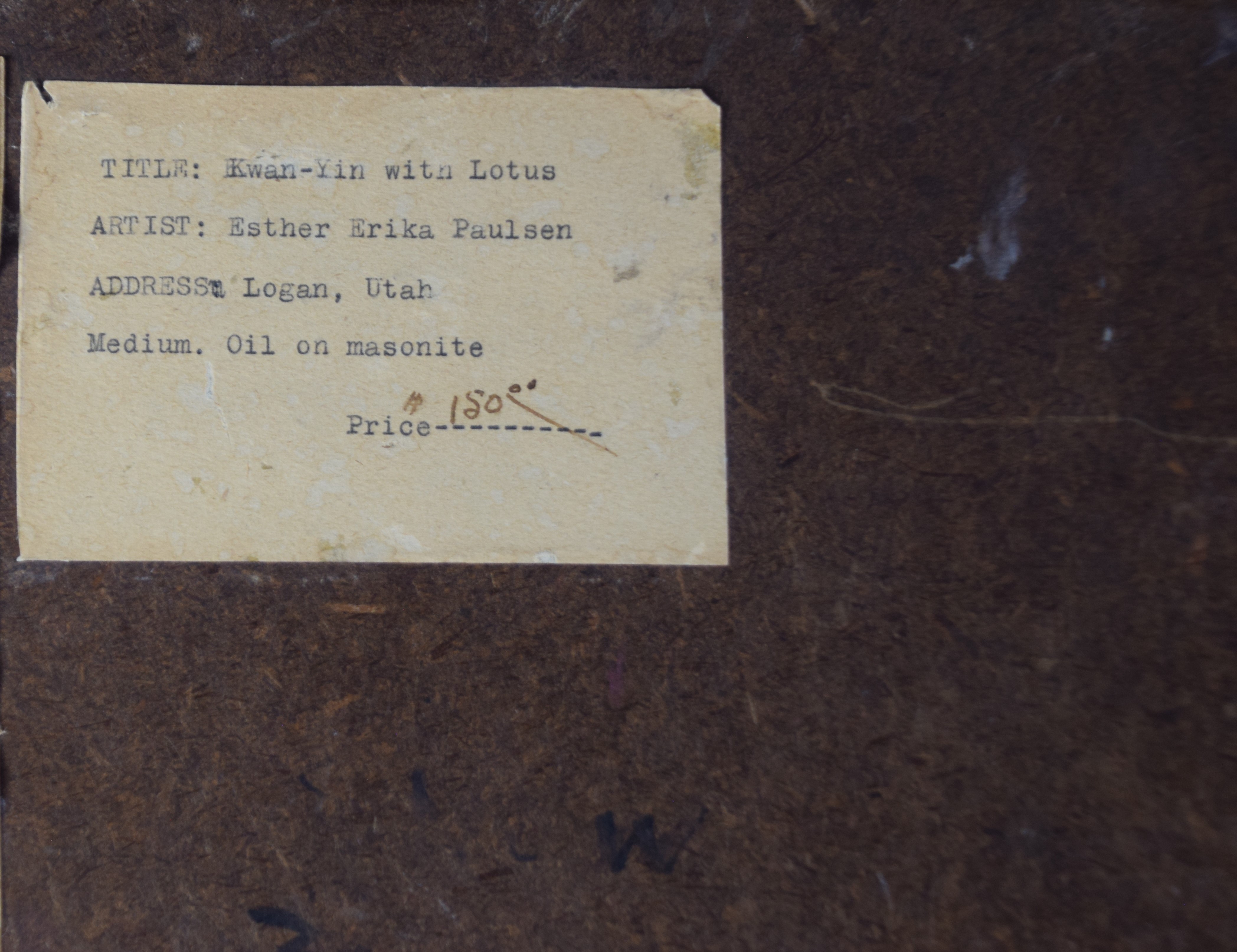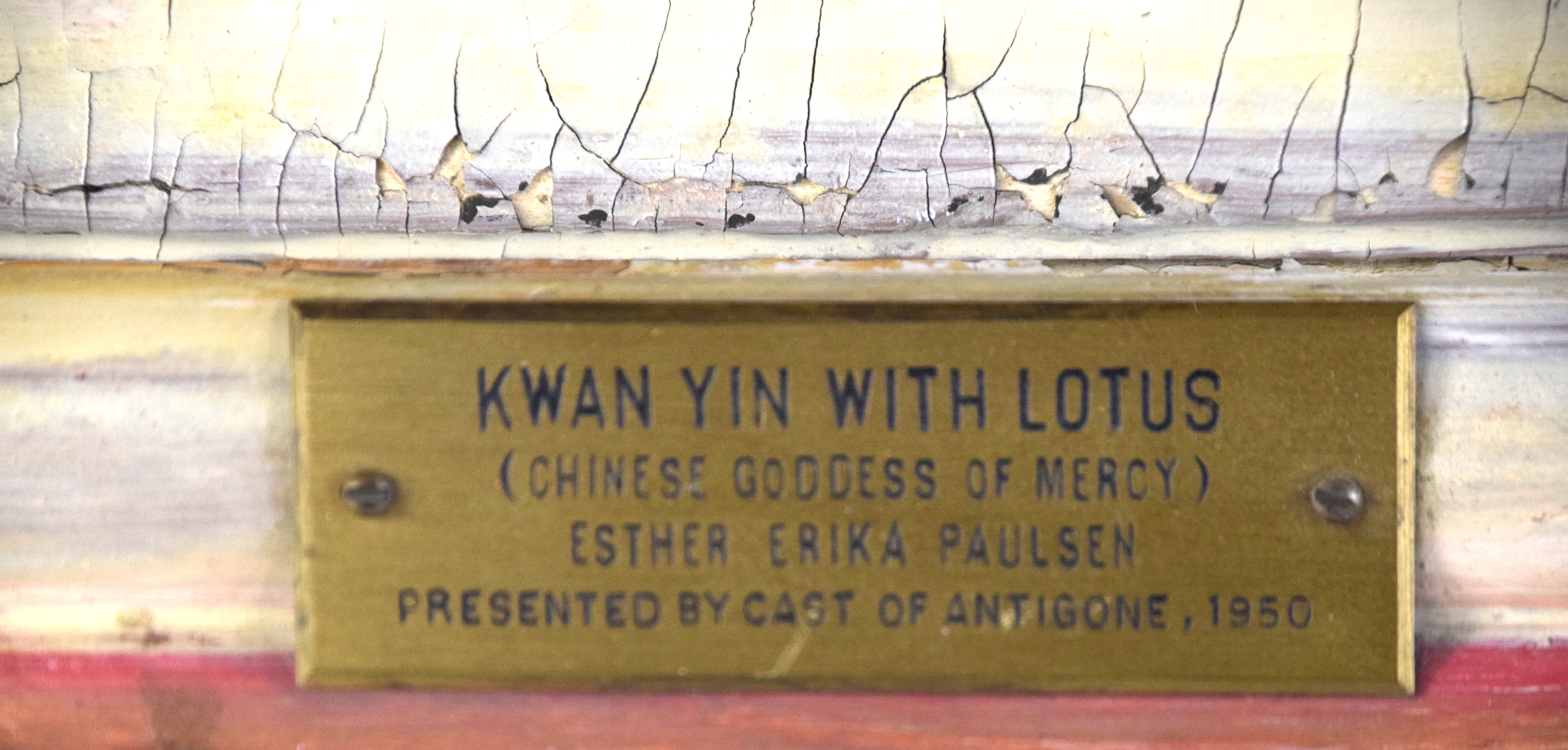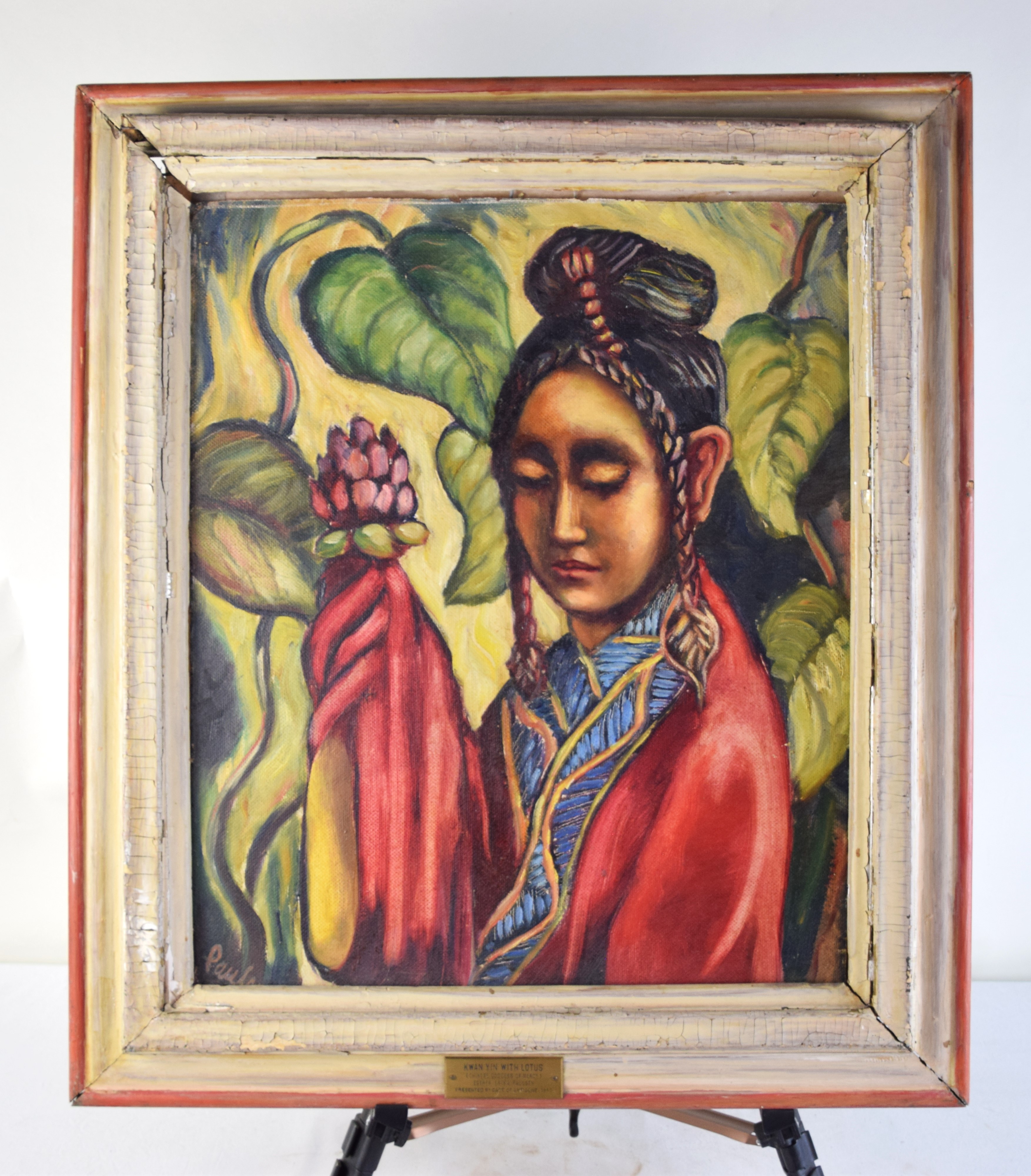 Oil painting on Masonite/board titled on plaque “Kwan-Yin with Lotus (Chinese Goddess Of Mercy) by Artist Esther Erika Paulsen, Presented by Curt of Antigone, 1950″ . Dimensions: 23″ x 20” Image size.